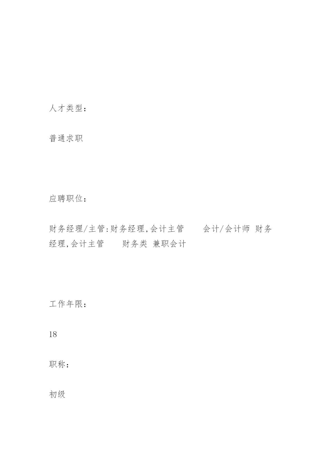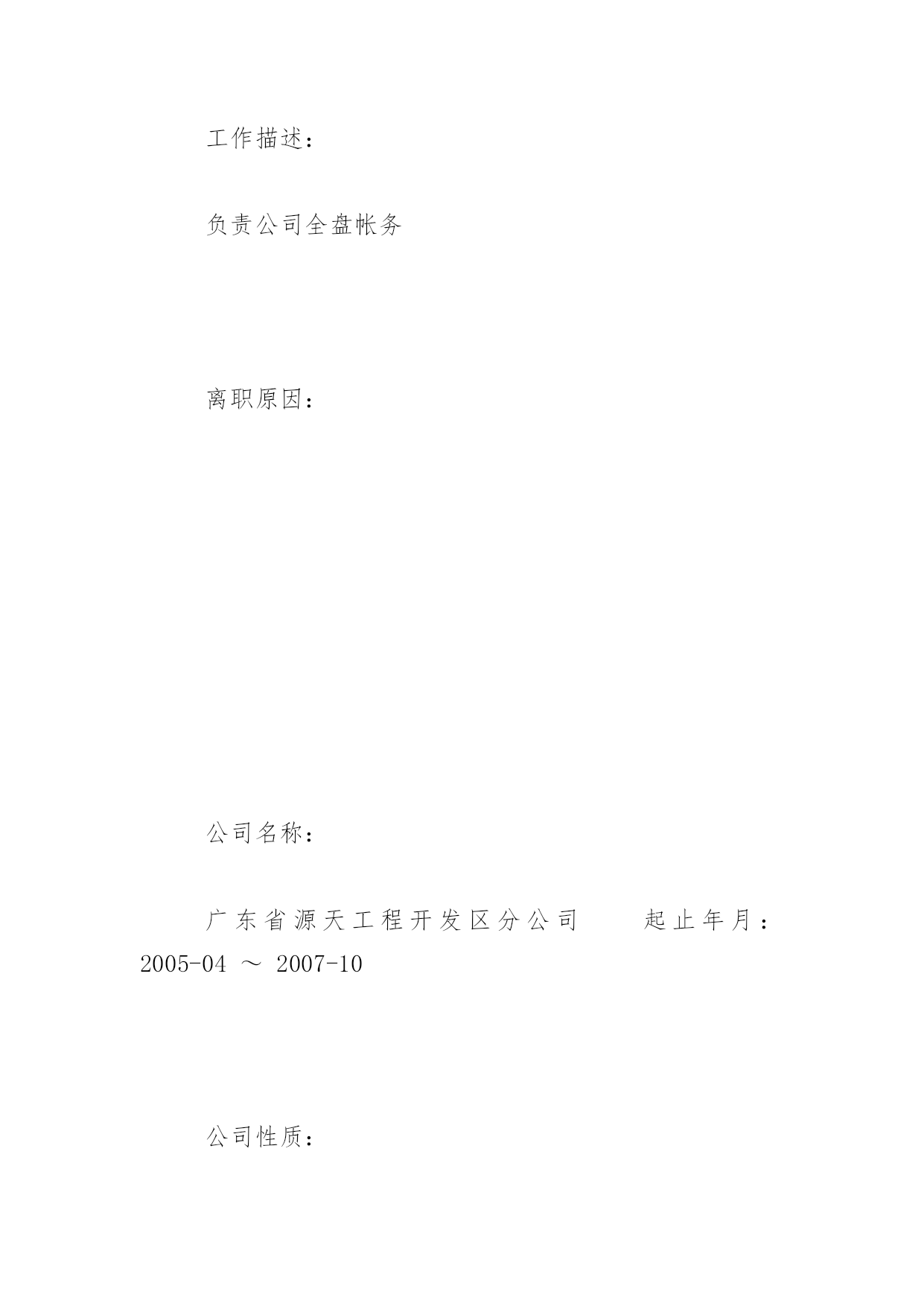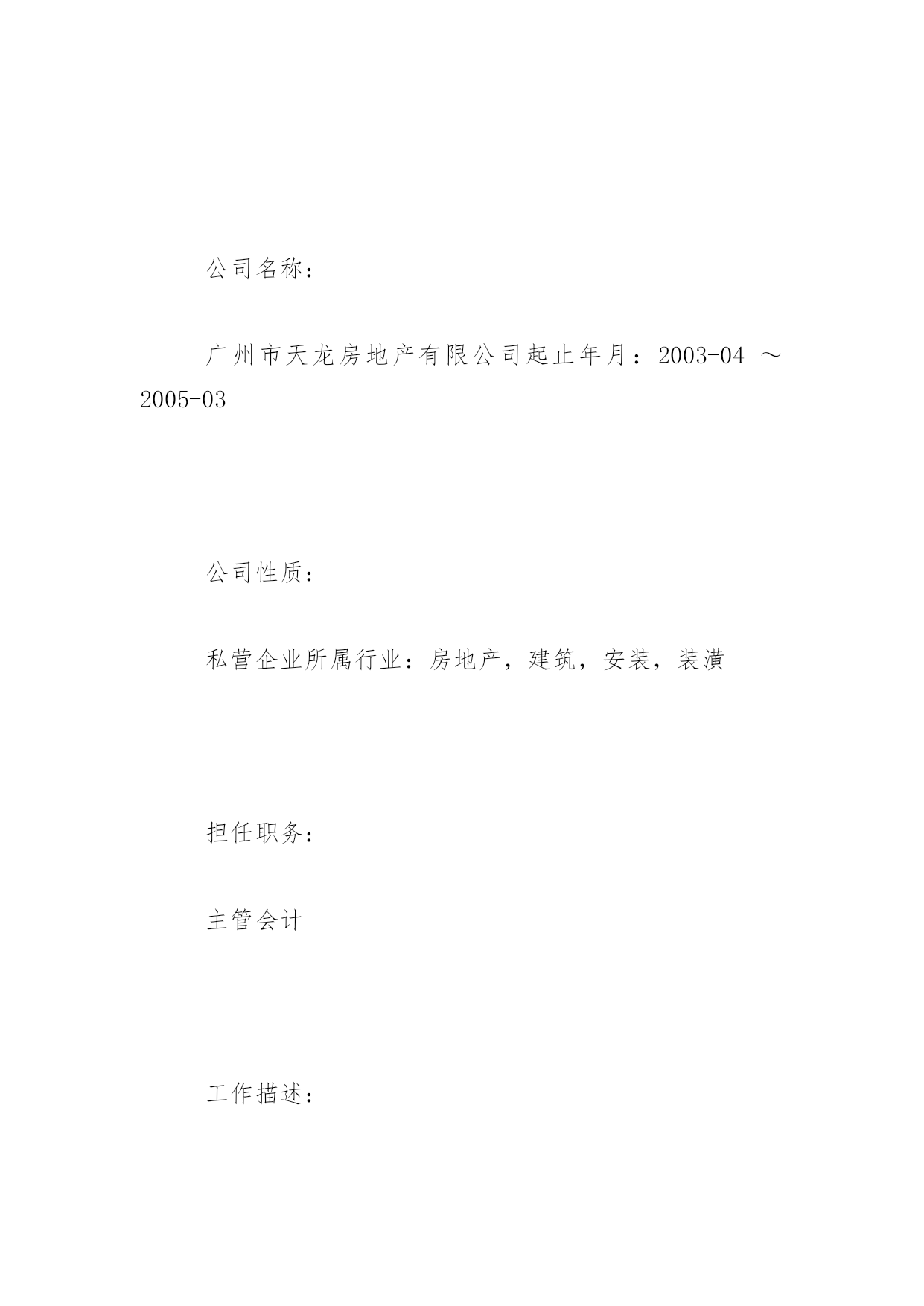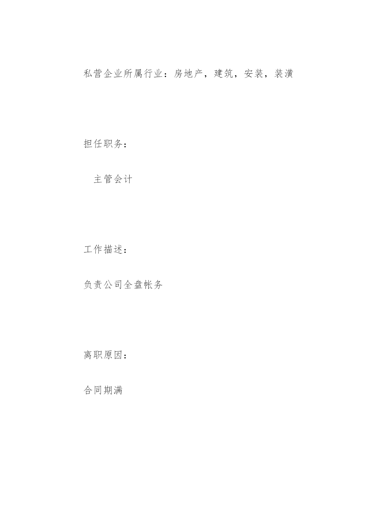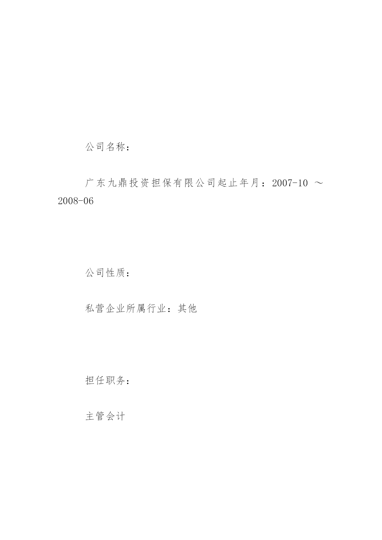 经济管理专业个人简历参考《经济管理专业》是一门科学课程,专业主要面向在职从业人员,培养能胜任各级政府经济管理部门工作和企事业单位实际管理工作的应用型人才。毕业生要热爱社会主义祖国,拥护党的基本路线,懂得马克思列宁主义、毛泽东思想和建设有中国特色社会主义理论的基本原理,具有事业心、责任感和良好的社会公共道德与职业道德,具有为社会主义现代化建设而奋斗的精神。毕业生应比较全面地、系统地掌握管理科学和经济科学方面的基本理论;掌握经济管理的专业知识、基本技能;具备良好的计算机应用能力和经济应用文写作能力;具有一定的外语水平;熟悉国家有关方针政策和法规;具备社会经济调查和组织协调的基本能力;能深刻地分析、有效地解决经济管理中的各种问题。个人基本简历姓名:-国籍:中国无照片目前所在地:广州民族:户口所在地:广东省身材:160cm50kg婚姻状况:未婚年龄:39岁培训认证:诚信徽章:求职意向及工作经历人才类型:普通求职应聘职位:财务经理/主管:财务经理,会计主管会计/会计师财务经理,会计主管财务类兼职会计工作年限:18职称:初级求职类型:均可可到职-随时月薪要求:2000--3500希望工作地区:广州广州个人工作经历:公司名称:广东九鼎投资担保有限公司起止年月:2007-10~2008-06公司性质:私营企业所属行业:其他担任职务:主管会计工作描述:负责公司全盘帐务离职原因:公司名称:广东省源天工程开发区分公司起止年月:2005-04~2007-10公司性质:私营企业所属行业:房地产,建筑,安装,装潢担任职务:主管会计工作描述:负责公司全盘帐务离职原因:合同期满公司名称:广州市天龙房地产有限公司起止年月:2003-04~2005-03公司性质:私营企业所属行业:房地产,建筑,安装,装潢担任职务:主管会计工作描述:负责公司全盘帐务离职原因:公司名称:广州市思进财税顾问有限公司起止年月:1998-01~2003-03公司性质:私营企业所属行业:其他担任职务:会计工作描述:代理多家公司记帐、报税等税务事项 离职原因:公司名称:阳江某酒楼起止年月:1996-01~1997-12公司性质:私营企业所属行业:饮食,旅游业,宾馆担任职务:财务经理工作描述:负责公司全盘帐务离职原因:公司名称:阳江某国有企业起止年月:1990-07~1995-12公司性质:国有企业所属行业:其他担任职务:出纳、会计、主办会计工作描述:离职原因:教育背景毕业院校:广东省委党校最高学历:本科毕业-1997-12-01所学专业一:经济管理所学专业二:受教育培训经历:起始年月终止年月学校(机构)专业获得证书证书编号1987-071990-07阳江市电大商业企业管理大专1995-071997-12广东省委党校经济管理本科语言能力外语:英语一般国语水平:良好粤语水平:优秀工作能力及其他专长(1)本人有十几年多行业会计工作经验(如工业、商业、建筑行业、房地产、餐饮业、物业管理及非营利医疗行业等)。(2)能独立处理各行业全盘帐务(包括一般纳税人)。(3)熟悉广州市的工商、银行、税务业务流程,有对外报税、报帐的能力。(4)能熟练操作办公软件及相关财务软件(如用友、金蝶、速达)。详细个人自传本人为人诚实本份,工作细心、勤奋,责任心强,有良好的职业道德