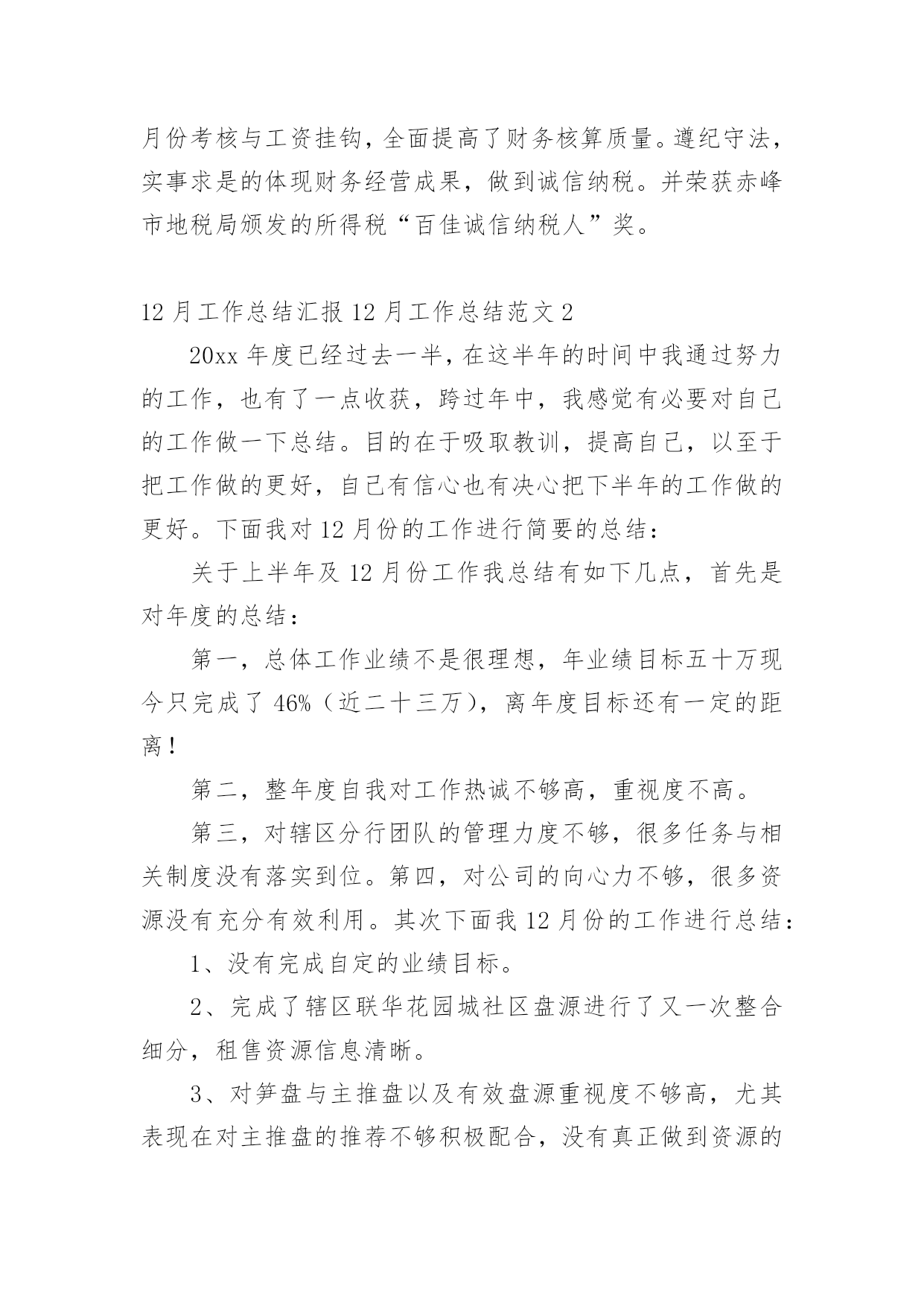 12月工作总结汇报12月工作总结12月工作总结汇报12月工作总结范文无论是在学习还是在工作中,需要用到汇报的地方越来越多,汇报可以是工作开始前的规划安排,也可以是工作完成后的分析总结,每次提笔要写汇报的时候都毫无头绪?以下是小编帮大家整理的12月工作总结汇报12月工作总结范文,仅供参考,大家一起来看看吧。12月工作总结汇报12月工作总结范文1以下是本人12月份的工作总结:一、出具各项财务报表及时报送各项对外会计报表,及时完成各项统计报表。根据各单位的经济指标完成情况,对各单位的预算的执行与完成情况进行月度与季度分析,配合绩效考核出具准确无误的财务信息。二、债权债务的清理清理了财务账上长期挂帐的应收款项和应付款项,对于年度支付的款项未收回发票入帐的业务,财务人员与经办人员沟通协商追回大部分发票,并完善了入账手续,对于中油坚盛极个别长期追缴而未完善手续的发票,财务部发出了追缴通知,并要求经办人员将所欠发票限期交于财务部,否则追究相关责任。三、成本费用控制,堵塞漏洞对xx的财务核算进行了内部稽核,发现x的会计科目使用有个别科目不符合财务标准规范,有个别费用报销不符合费用报销规定,没有经过公司董事长审批,财务对仓库的监控不是很到位。而xx财务处理都较规范,暂时没有发现特殊问题。加强单据的审核,对于各项费用支出建立支出数据库,对超出预算的支出及时提醒各单位办理预算调整申请,发现不合理的支出则必须经过审计程序,及时纠正不符合财务手续的事项,规避财务风险。四、做好税务筹划和财务规划在集团各单位之间根据配比和权责发生制合理分配各项发票,并根据油品行业的特点建立了税负平衡表,通过电子表格的分析手法,平衡税负指标;完善发票入账手续,按照规定开具发票,合理规避税务风险。根据医院的减免税政策,组织准备三年免税期的减免税材料,申办地税减免;准备x的减免税资料,补齐各项基建合同、工程竣工结算资料,通过和实力雄厚的税务师事务所沟通与协作,对公司的股权架构、资产结构作了初步规划。五、配合相关部门处理相关的事务配合资产部做好每月盘点计划,安排好财务人员进行实地盘点工作。配合资金部合理安排各项资金的收付。配合审计部每月的审计例行检查,对于出具的审计报告及时出具审计整改意见对于合理的建议作出对应的财务处理。财务部肩负着监督和服务的'重要职能。所谓监督就是维护集团公司的利益,监督集团公司的财务运作,调控各项费用的合理支出,保证财务物资的安全;服务就是服务于集团与下属各公司、服务于员工、服务于客户;以促进各公司开拓市尝增收节支,从而谋取利润化。监督与服务是统一的,监督促进服务,服务为了更好的监督。六、培训提高人员的业务水平随着我公司业务量的增大,工作的侧重点和基本点也在改变,因此财务工作不能停留在简单的算账、报账等会计核算上,应不断更新知识,不断提高理论水平。结合本行业财务工作的特点,认真总结经验、查找不足,保证财务基础工作的准确、及时、完整,为领导及时、准确、完整的提供财务信息。通过学习,职称考试,进一步了解财务各项管理制度,懂得了企业财会人员的工作要求,进一步激发了干好财务工作的主动性与积极性七、以考核为手段,促财务基础管理水平的提高随着企业管理的进一步深入,财务的管理职能逐渐增强。今年,公司为加大责任制考核力度,保证责任制的贯彻落实,制定了责任状考核办法,细化了各项指标和日常工作的考核。在此基础上,我们也加大了财务基础工作建设,从粘贴票据、装订凭证、签字齐全、印章保管等最基础的工作抓起,认真审核原始票据,细化财务报账流程。详细制定了《货币资金管理办法》等,将内控与内审相结合。在今年的财务管理工作中,最重要的一点就是借助公司的考核体系,将管理的要求与重点,纳入工作质量与方针目标考核。将费用预算通过月份考核与工资挂钩,全面提高了财务核算质量。遵纪守法,实事求是的体现财务经营成果,做到诚信纳税。并荣获赤峰市地税局颁发的所得税“百佳诚信纳税人”奖。12月工作总结汇报12月工作总结范文220xx年度已经过去一半,在这半年的时间中我通过努力的工作,也有了一点收获,跨过年中,我感觉有必要对自己的工作做一下总结。目的在于吸取教训,提高自己,以至于把工作做的更好,自己有信心也有决心把下半年的工作做的更好。下面我对12月份的工作进行简要的总结:关于上半年及12月份工作我总结有如下几点,首先是对年度的总结:第一,总体工作业绩不是很理想,年业绩目标五十万现今只完成了46%(近二十三万),离年度目标还有一定的距离!第二,整年度自我对工作热诚不够高,重视度不高。第三,对辖区分行团队的管理力度不够,很多任务与相关制度没有落实到位。第四,对公司的向心力不够,很多资源没有充分有效利用。其次下面我12月份的工作进行总结:1、没有完成自定的业绩目标。2、完成了辖区联华花园城社区盘源进行了又一次整