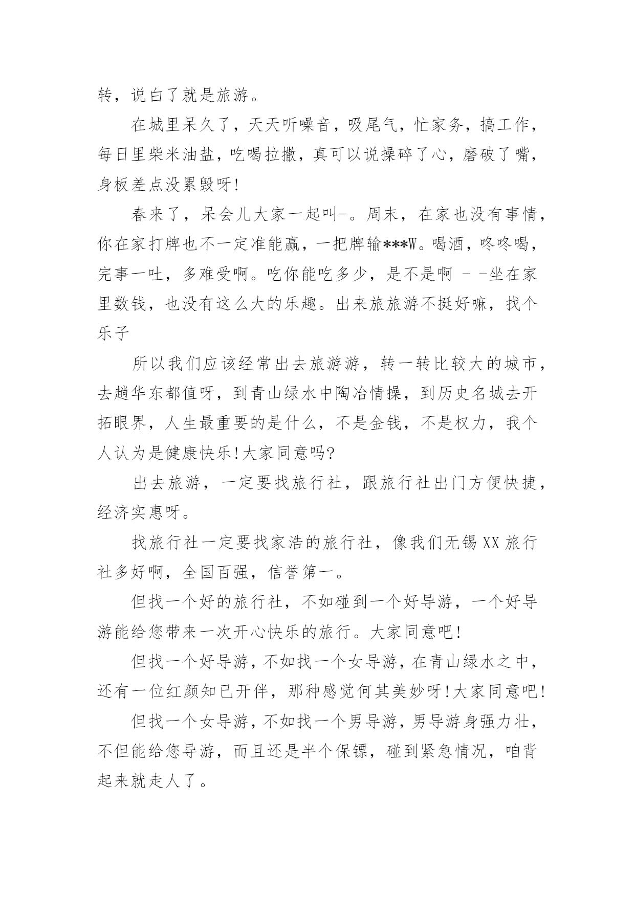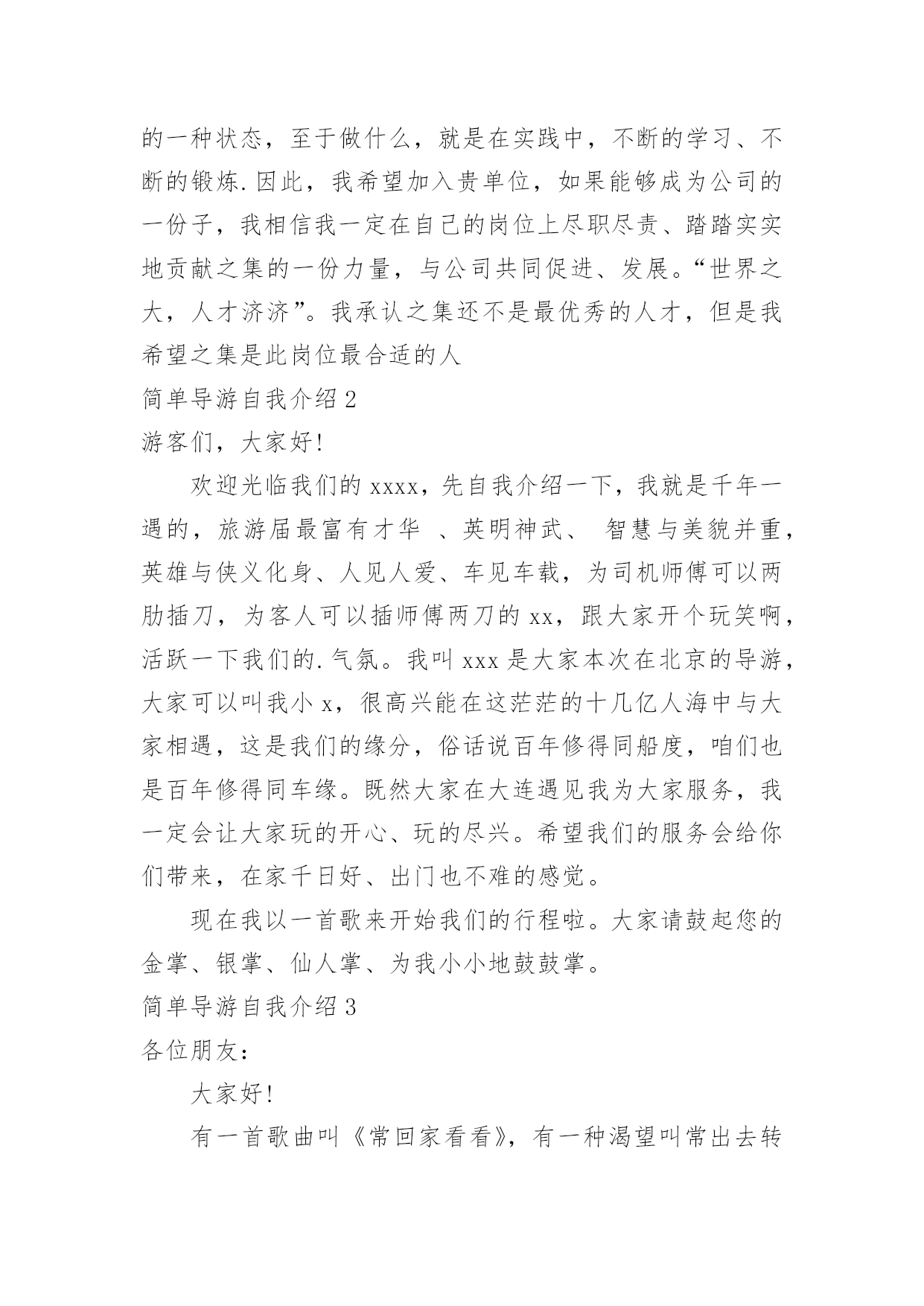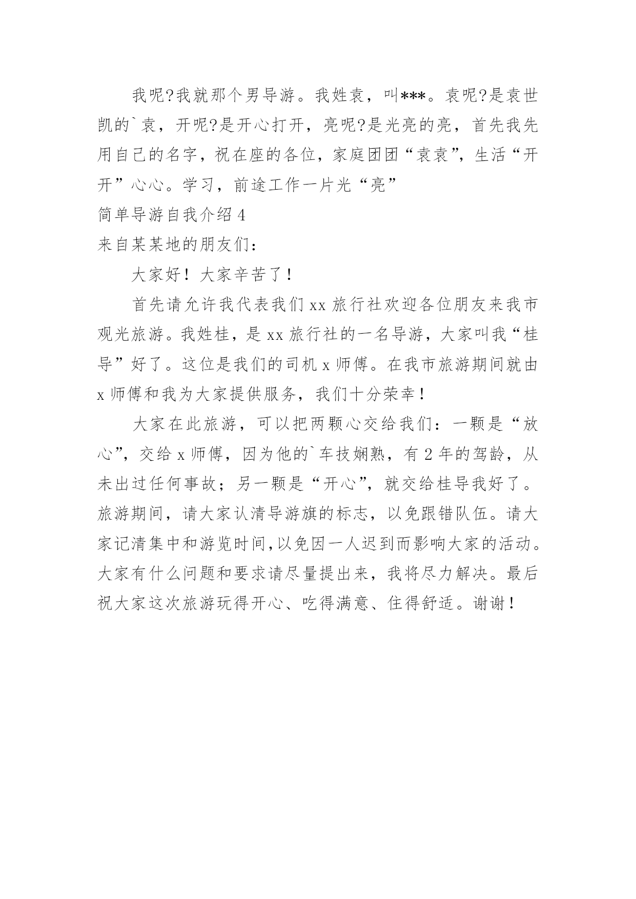 简单导游自我介绍简单导游自我介绍当换了一个新环境后,进行自我介绍是必不可少的,自我介绍有助于自我宣传、自我展示。如何编写一段个性的自我介绍?以下是小编精心整理的简单导游自我介绍,仅供参考,希望能够帮助到大家。简单导游自我介绍1各位尊敬的考官:大家下午好!很荣幸能在这里面试,让我有向各位考官学习与交流的机会,现将自己的情况简要介绍一下:我叫xxx,出身xxxxxxxx。性格比较温和、谦虚、认真细致、踏实、吃苦耐劳、有较强的责任心和社会适应能力。即将于20xx年6月毕业于xxxxx学院,作为一名软件专业的大学生,我更喜欢旅游管理,在大学三年的学习生活中,我对导游这一领域的相关知识有了一定的掌握,同时具有实际的操作能力与技术。为了使在校所学的知识更好地应用到实际生活中,于20xx年12月有幸来xxxxxx博物馆,通过三个月的'实践训练,全面系统地学习了讲解员方面的专业知识与技能,能够将所学知识真正应用到实际生活中。在投身于社会之际,为了找到符合自己专业和兴趣的工作,更好地适应社会,我希望自己能够做到一种被别人需要的一种状态,至于做什么,就是在实践中,不断的学习、不断的锻炼.因此,我希望加入贵单位,如果能够成为公司的一份子,我相信我一定在自己的岗位上尽职尽责、踏踏实实地贡献之集的一份力量,与公司共同促进、发展。“世界之大,人才济济”。我承认之集还不是最优秀的人才,但是我希望之集是此岗位最合适的人简单导游自我介绍2游客们,大家好!欢迎光临我们的xxxx,先自我介绍一下,我就是千年一遇的,旅游届最富有才华、英明神武、智慧与美貌并重,英雄与侠义化身、人见人爱、车见车载,为司机师傅可以两肋插刀,为客人可以插师傅两刀的xx,跟大家开个玩笑啊,活跃一下我们的.气氛。我叫xxx是大家本次在北京的导游,大家可以叫我小x,很高兴能在这茫茫的十几亿人海中与大家相遇,这是我们的缘分,俗话说百年修得同船度,咱们也是百年修得同车缘。既然大家在大连遇见我为大家服务,我一定会让大家玩的开心、玩的尽兴。希望我们的服务会给你们带来,在家千日好、出门也不难的感觉。现在我以一首歌来开始我们的行程啦。大家请鼓起您的金掌、银掌、仙人掌、为我小小地鼓鼓掌。简单导游自我介绍3各位朋友:大家好!有一首歌曲叫《常回家看看》,有一种渴望叫常出去转转,说白了就是旅游。在城里呆久了,天天听噪音,吸尾气,忙家务,搞工作,每日里柴米油盐,吃喝拉撒,真可以说操碎了心,磨破了嘴,身板差点没累毁呀!春来了,呆会儿大家一起叫-。周末,在家也没有事情,你在家打牌也不一定准能赢,一把牌输***W。喝酒,咚咚喝,完事一吐,多难受啊。吃你能吃多少,是不是啊--坐在家里数钱,也没有这么大的乐趣。出来旅旅游不挺好嘛,找个乐子所以我们应该经常出去旅游游,转一转比较大的城市,去趟华东都值呀,到青山绿水中陶冶情操,到历史名城去开拓眼界,人生最重要的是什么,不是金钱,不是权力,我个人认为是健康快乐!大家同意吗?出去旅游,一定要找旅行社,跟旅行社出门方便快捷,经济实惠呀。找旅行社一定要找家浩的旅行社,像我们无锡XX旅行社多好啊,全国百强,信誉第一。但找一个好的旅行社,不如碰到一个好导游,一个好导游能给您带来一次开心快乐的旅行。大家同意吧!但找一个好导游,不如找一个女导游,在青山绿水之中,还有一位红颜知已开伴,那种感觉何其美妙呀!大家同意吧!但找一个女导游,不如找一个男导游,男导游身强力壮,不但能给您导游,而且还是半个保镖,碰到紧急情况,咱背起来就走人了。我呢?我就那个男导游。我姓袁,叫***。袁呢?是袁世凯的`袁,开呢?是开心打开,亮呢?是光亮的亮,首先我先用自己的名字,祝在座的各位,家庭团团“袁袁”,生活“开开”心心。学习,前途工作一片光“亮”简单导游自我介绍4来自某某地的朋友们:大家好!大家辛苦了!首先请允许我代表我们xx旅行社欢迎各位朋友来我市观光旅游。我姓桂,是xx旅行社的一名导游,大家叫我“桂导”好了。这位是我们的司机x师傅。在我市旅游期间就由x师傅和我为大家提供服务,我们十分荣幸!大家在此旅游,可以把两颗心交给我们:一颗是“放心”,交给x师傅,因为他的`车技娴熟,有2年的驾龄,从未出过任何事故;另一颗是“开心”,就交给桂导我好了。旅游期间,请大家认清导游旗的标志,以免跟错队伍。请大家记清集中和游览时间,以免因一人迟到而影响大家的活动。大家有什么问题和要求请尽量提出来,我将尽力解决。最后祝大家这次旅游玩得开心、吃得满意、住得舒适。谢谢!