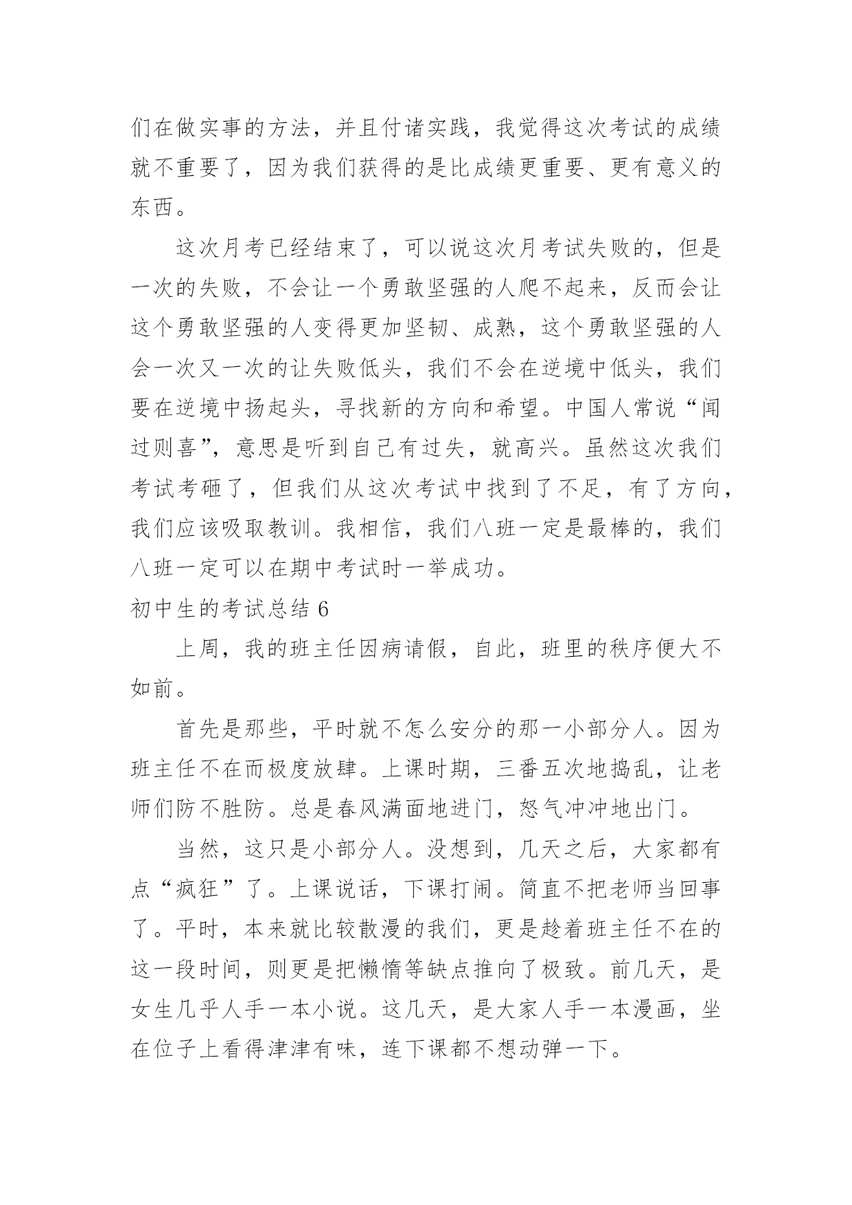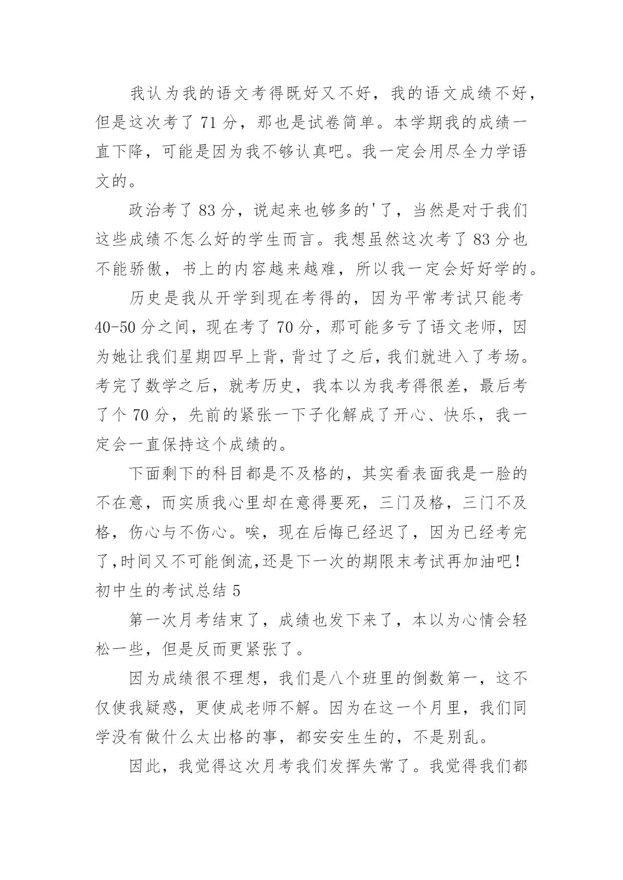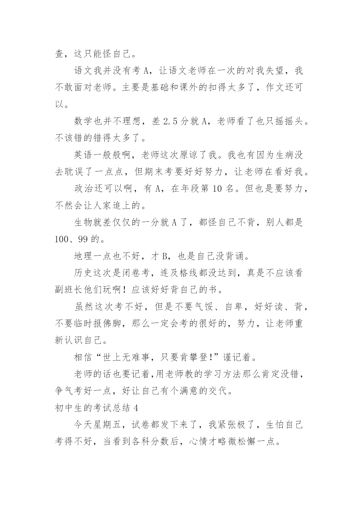 初中生的考试总结初中生的考试总结总结是事后对某一时期、某一项目或某些工作进行回顾和分析,从而做出带有规律性的结论,通过它可以全面地、系统地了解以往的学习和工作情况,因此,让我们写一份总结吧。那么总结要注意有什么内容呢?以下是小编整理的初中生的考试总结,仅供参考,希望能够帮助到大家。初中生的考试总结1在考试前老师就已经提前通知我们要准备好考试,但是我总觉得时间还长,并不着急,课我没有考虑到我需要复习的课程并不是只有一个,所以最终复习的时候非常仓促,很多知识点也只是过来一遍,并没有记下来,导致自己忘记了很多,在考试的时候返现很多考试题目都是自己熟悉的题目,但是就是忘记证明解题或者忘记了复习内容,自己都感到非常懊恼。在考试的时候我也返现我做题不够细心有几个题目原本不该犯错的,却因为自己没有重视,粗心大意之下忘记了修改,这是自己犯的错,考试时内心过于紧张,让自己的大脑有些急促原本已经掌握的知识到了考试的时候完全忘记改怎样做了非常的后悔。虽然这知识考试过程汇总出现的问题,但同样也证明了我自己的一些不足之处。我学习还不够认真,在平时学习的时候对于课程的温习也没有做到位,经常是学完就抛到一边,不闻不问,除非做题需要时才会在把题目找出来温习一遍,这样的学习方式就本来存在了很大问题,对我自己也并没有多少好处,这是我自己的`问题也是我自己做的不够好。很多时候开始考的不理想究其原因还是因为自己付出的努力不够,做的不够,成绩比我好的同学他们的学习比我更刻苦,花的时间更多,我对于学习没有太重视,更多的是被老师推着走,不主动学习学习的提升虽然也有但是相比那些愿意自学的我的提升还是差了不少。对于学习的态度上来说,我属于那种老师严厉我就学习认真,老师不够严厉我学习就稀松平常学习的成绩也就没有多好,这是自己做的不够,是我没有好好学习,把学习的任务当成了压力。没有对比就不知道自己原来与其他同学的差距,经过了这次考试让我知道了一点,那就是学习不是一个享受的过程,而是一个需要付出的过程。今后的学习我需要改正自己的学习态度,主动去学习,而不是被动学习,积极的把自己存在的问题结局,遇到不懂的事情要及时向领导请假询问这些问题的处处而不是置之不理,学习提升需要解决学习中的困难,以后在学习中我遇到自己不会的知识点和不会的题目会积极主动去向老师寻求解决方法而不是等待。初中生的考试总结2星期五,我们进行了期中考试。期中考试中,在我们紧张而又忙碌的复习中结束了,好也罢,坏也罢,成也罢,败也罢,喜也罢,愁也罢,都已经过去了,我们现在要做的就是认真总结,积极反思,调适心态,再决将来。这次期中考试不仅给我们查找自己不足的机会,还让我们知道自己的真实水平。给我们指明了努力的方向!考试就像捕鱼,每一次考试你都会发现鱼网上的漏洞,经过一次次的修补,一次次的捕捞,这次期中考试,我们每一位同学都经受了失败、痛苦和成功的洗礼,得到了磨练、反省的自我的机会,这正是我们的收获。期中考试取得了高分,固然可喜,因为它是过去一个阶段汗水的结晶。但这个成绩不能代表全部,不能代表将来。成功自有成功的喜悦,以此为动力,一路向前,将成功串联,才能铸就更大的成功。但是,失败也有失败的力量,因为暂时未能成功,我们便有了期待,在努力中期待,在期待中努力,终究会迎来希望的阳光。成功是谦虚的资本,失败却是成功的理由。我们不应该只是作文时举例论证的'材料。战之能胜是好汉,屡败屡战亦英雄。勤奋着,就是快乐的。期中考试,不管取得怎样的成绩,都要引起我们足够的思考。初中生的考试总结3月考已经过了,我的成绩一直往后退,我拿着考卷失望的对待老师、父母。当我走到成绩表前,看到和我同班考的同学都在往前进,我由此变的好自卑。其实在考试中,我很早就做完了,但并没有认真的.检查,这只能怪自己。语文我并没有考A,让语文老师在一次的对我失望,我不敢面对老师。主要是基础和课外的扣得太多了,作文还可以。数学也并不理想,差2.5分就A,老师看了也只摇摇头。不该错的错得太多了。英语一般般啊,老师这次原谅了我。我也有因为生病没去耽误了一点点,但期末考要好好努力,让老师在看好我。政治还可以啊,有A,在年段第10名。但也是要努力,不然会让人家追上的。生物就差仅仅的一分就A了,都怪自己不背,别人都是100、99的。地理一点也不好,才B,也是自己没背诵。历史这次是闭卷考,连及格线都没达到,真是不应该看副班长他们玩啊!应该好好背自己的书。虽然这次考不好,但是不要气馁、自卑,好好读、背,不要临时报佛脚,那么一定会考的很好的,努力,让老师重新认识自己。相信“世上无难事,只要肯攀登!”谨记着。老师的话也要记着,用老师教的学习方法那么肯定没错,争气考好一点,好让自己有个满意的交代。初中生的考试总结4今天星期五,试卷都发下来了,我紧张极了,生怕自己考得不好,当看到各科分数后,心