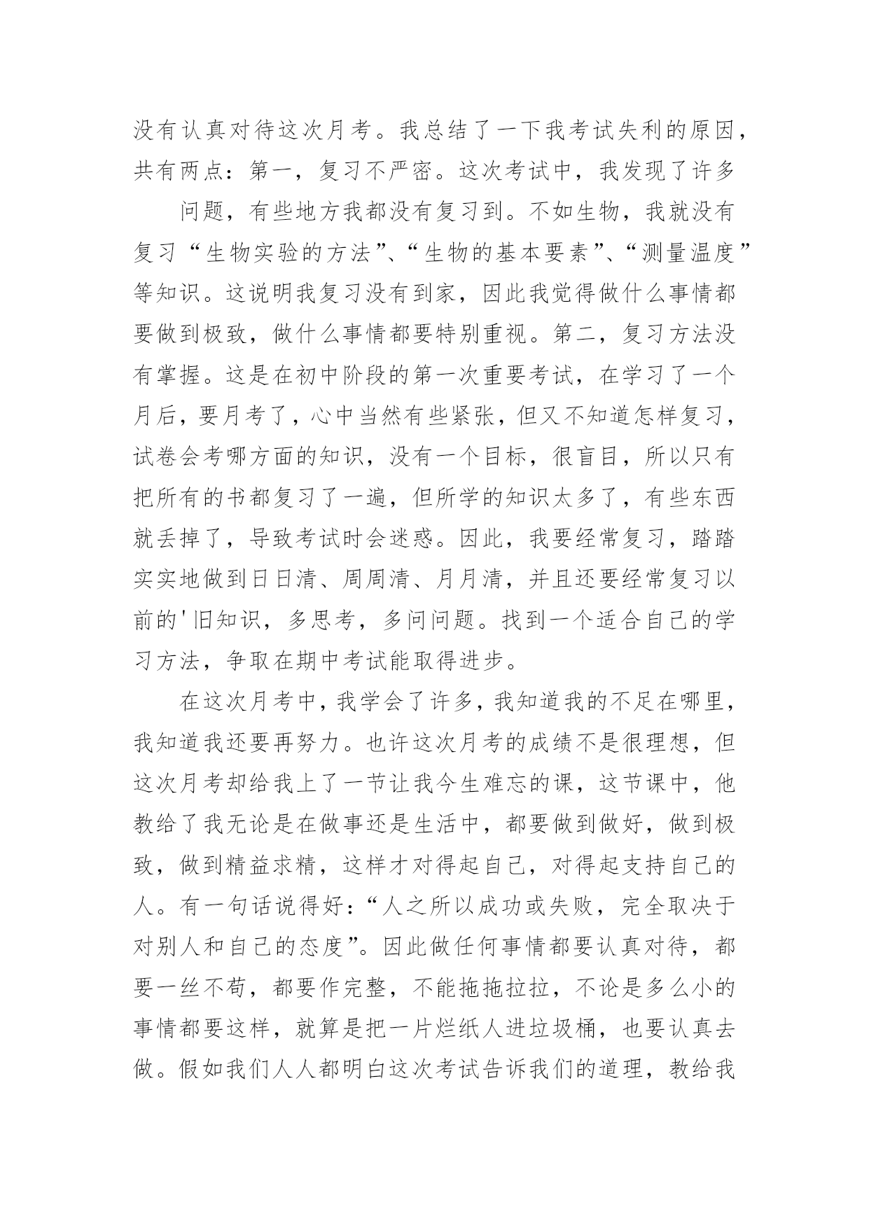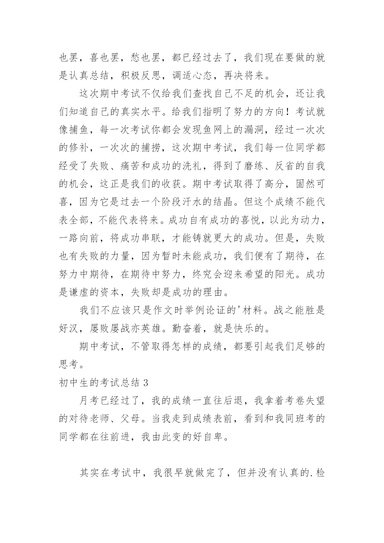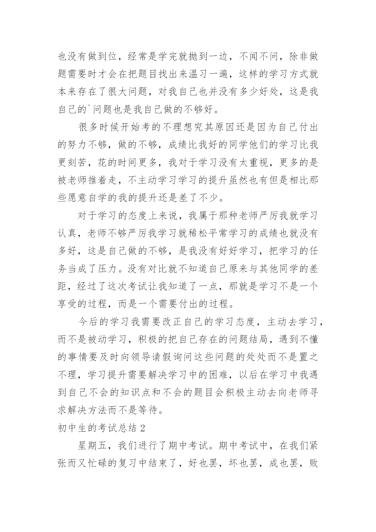 初中生的考试总结初中生的考试总结总结是事后对某一时期、某一项目或某些工作进行回顾和分析,从而做出带有规律性的结论,通过它可以全面地、系统地了解以往的学习和工作情况,因此,让我们写一份总结吧。那么总结要注意有什么内容呢?以下是小编整理的初中生的考试总结,仅供参考,希望能够帮助到大家。初中生的考试总结1在考试前老师就已经提前通知我们要准备好考试,但是我总觉得时间还长,并不着急,课我没有考虑到我需要复习的课程并不是只有一个,所以最终复习的时候非常仓促,很多知识点也只是过来一遍,并没有记下来,导致自己忘记了很多,在考试的时候返现很多考试题目都是自己熟悉的题目,但是就是忘记证明解题或者忘记了复习内容,自己都感到非常懊恼。在考试的时候我也返现我做题不够细心有几个题目原本不该犯错的,却因为自己没有重视,粗心大意之下忘记了修改,这是自己犯的错,考试时内心过于紧张,让自己的大脑有些急促原本已经掌握的知识到了考试的时候完全忘记改怎样做了非常的后悔。虽然这知识考试过程汇总出现的问题,但同样也证明了我自己的一些不足之处。我学习还不够认真,在平时学习的时候对于课程的温习也没有做到位,经常是学完就抛到一边,不闻不问,除非做题需要时才会在把题目找出来温习一遍,这样的学习方式就本来存在了很大问题,对我自己也并没有多少好处,这是我自己的`问题也是我自己做的不够好。很多时候开始考的不理想究其原因还是因为自己付出的努力不够,做的不够,成绩比我好的同学他们的学习比我更刻苦,花的时间更多,我对于学习没有太重视,更多的是被老师推着走,不主动学习学习的提升虽然也有但是相比那些愿意自学的我的提升还是差了不少。对于学习的态度上来说,我属于那种老师严厉我就学习认真,老师不够严厉我学习就稀松平常学习的成绩也就没有多好,这是自己做的不够,是我没有好好学习,把学习的任务当成了压力。没有对比就不知道自己原来与其他同学的差距,经过了这次考试让我知道了一点,那就是学习不是一个享受的过程,而是一个需要付出的过程。今后的学习我需要改正自己的学习态度,主动去学习,而不是被动学习,积极的把自己存在的问题结局,遇到不懂的事情要及时向领导请假询问这些问题的处处而不是置之不理,学习提升需要解决学习中的困难,以后在学习中我遇到自己不会的知识点和不会的题目会积极主动去向老师寻求解决方法而不是等待。初中生的考试总结2星期五,我们进行了期中考试。期中考试中,在我们紧张而又忙碌的复习中结束了,好也罢,坏也罢,成也罢,败也罢,喜也罢,愁也罢,都已经过去了,我们现在要做的就是认真总结,积极反思,调适心态,再决将来。这次期中考试不仅给我们查找自己不足的机会,还让我们知道自己的真实水平。给我们指明了努力的方向!考试就像捕鱼,每一次考试你都会发现鱼网上的漏洞,经过一次次的修补,一次次的捕捞,这次期中考试,我们每一位同学都经受了失败、痛苦和成功的洗礼,得到了磨练、反省的自我的机会,这正是我们的收获。期中考试取得了高分,固然可喜,因为它是过去一个阶段汗水的结晶。但这个成绩不能代表全部,不能代表将来。成功自有成功的喜悦,以此为动力,一路向前,将成功串联,才能铸就更大的成功。但是,失败也有失败的力量,因为暂时未能成功,我们便有了期待,在努力中期待,在期待中努力,终究会迎来希望的阳光。成功是谦虚的资本,失败却是成功的理由。我们不应该只是作文时举例论证的'材料。战之能胜是好汉,屡败屡战亦英雄。勤奋着,就是快乐的。期中考试,不管取得怎样的成绩,都要引起我们足够的思考。初中生的考试总结3月考已经过了,我的成绩一直往后退,我拿着考卷失望的对待老师、父母。当我走到成绩表前,看到和我同班考的同学都在往前进,我由此变的好自卑。其实在考试中,我很早就做完了,但并没有认真的.检查,这只能怪自己。语文我并没有考A,让语文老师在一次的对我失望,我不敢面对老师。主要是基础和课外的扣得太多了,作文还可以。数学也并不理想,差2.5分就A,老师看了也只摇摇头。不该错的错得太多了。英语一般般啊,老师这次原谅了我。我也有因为生病没去耽误了一点点,但期末考要好好努力,让老师在看好我。政治还可以啊,有A,在年段第10名。但也是要努力,不然会让人家追上的。生物就差仅仅的一分就A了,都怪自己不背,别人都是100、99的。地理一点也不好,才B,也是自己没背诵。历史这次是闭卷考,连及格线都没达到,真是不应该看副班长他们玩啊!应该好好背自己的书。虽然这次考不好,但是不要气馁、自卑,好好读、背,不要临时报佛脚,那么一定会考的很好的,努力,让老师重新认识自己。相信“世上无难事,只要肯攀登!”谨记着。老师的话也要记着,用老师教的学习方法那么肯定没错,争气考好一点,好让自己有个满意的交代。初中生的考试总结4今天星期五,试卷都发下来了,我紧张极了,生怕自己考得不好,当看到各科分数后,心