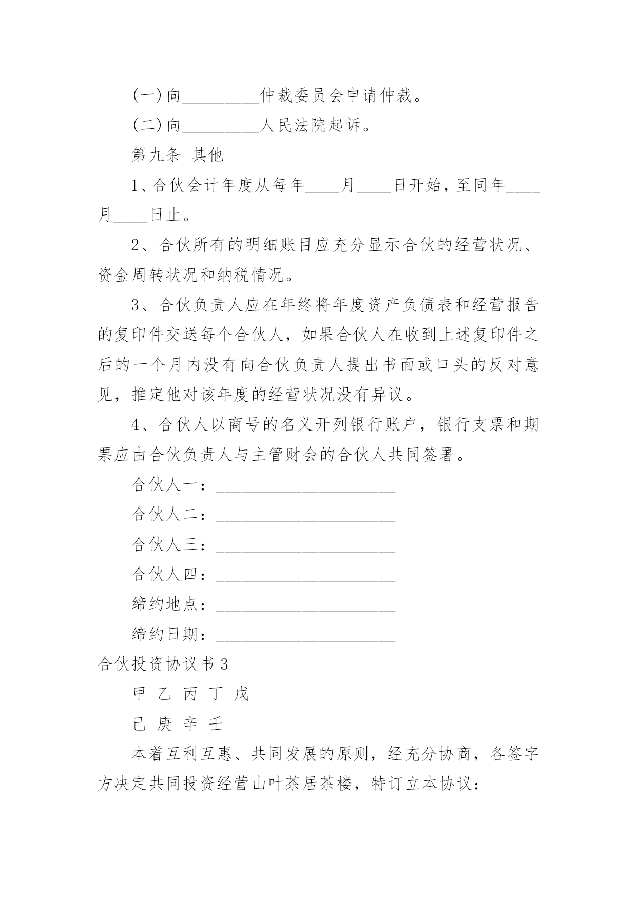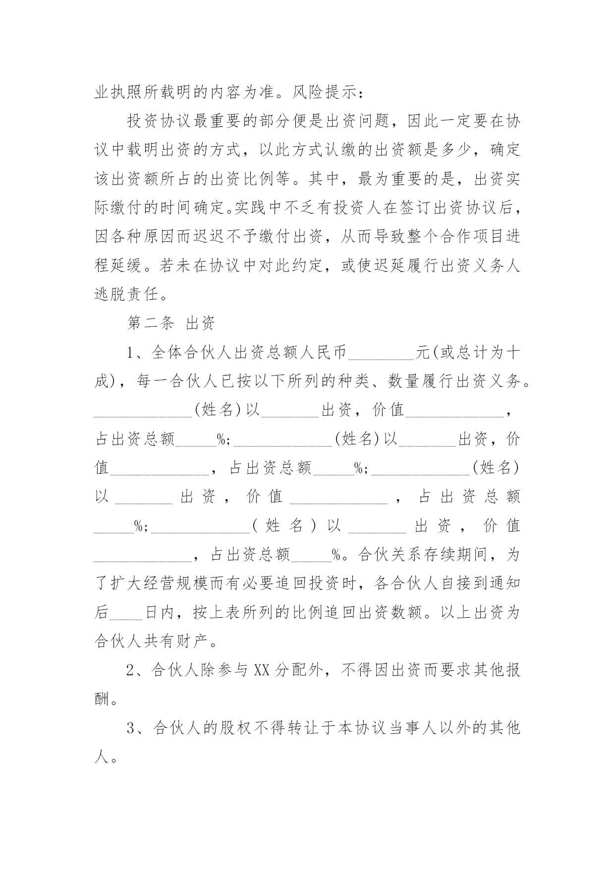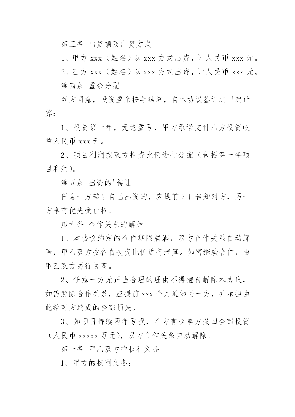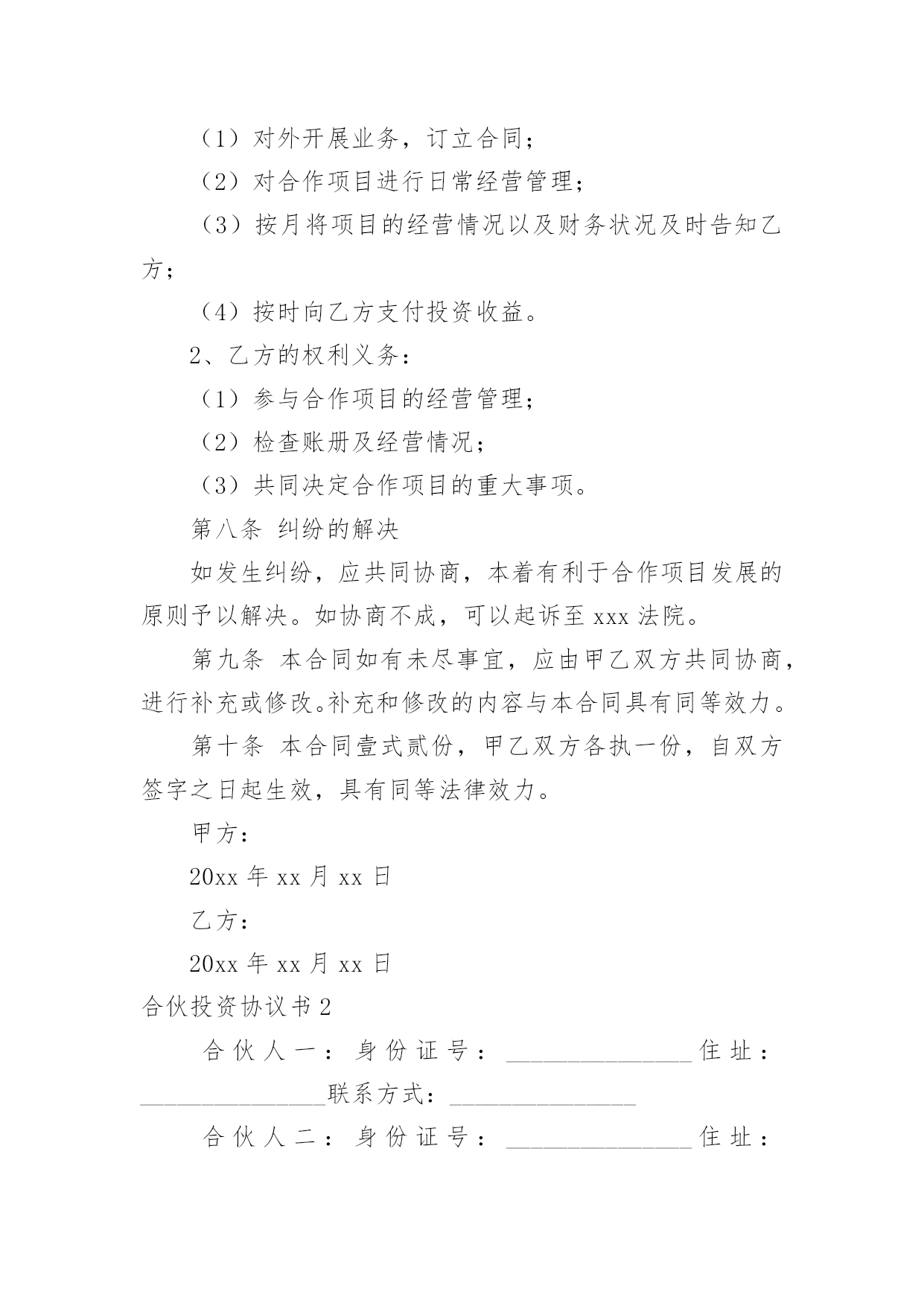 合伙投资协议书合伙投资协议书15篇在快速变化和不断变革的今天,协议的使用成为日常生活的常态,签订协议可以保障自身的权益不被侵害。那么写协议真的很难吗?下面是小编为大家收集的合伙投资协议书,仅供参考,大家一起来看看吧。合伙投资协议书1甲方:身份证号:乙方:身份证号:为了繁荣市场,搞活经济,增加收入,甲乙双方在诚实守信、平等互利的基础上就合作投资有关事宜协商一致,达成协议如下:第一条合作内容及方式甲乙双方共同出资,投资经营xxxxxx,共担风险,共享收益。乙方全权委托甲方负责该项目的经营管理,乙方对经营情况有知晓以及监督的权利。第二条合作期限双方合作期限为xxx年,自20xx年xx月xx日起,至20xx年xx月xx日。第三条出资额及出资方式1、甲方xxx(姓名)以xxx方式出资,计人民币xxx元。2、乙方xxx(姓名)以xxx方式出资,计人民币xxx元。第四条盈余分配双方同意,投资盈余按年结算,自本协议签订之日起计算:1、投资第一年,无论盈亏,甲方承诺支付乙方投资收益人民币xxx元。2、项目利润按双方投资比例进行分配(包括第一年项目利润)。第五条出资的'转让任意一方转让自己出资的,应提前7日告知对方,另一方享有优先受让权。第六条合作关系的解除1、本协议约定的合作期限届满,双方合作关系自动解除,甲乙双方按各自投资比例进行清算。如需继续合作,由甲乙双方另行协商。2、任意一方无正当合理的理由不得擅自解除本协议,如需解除合作关系,应提前xxx个月通知另一方,并承担由此给对方造成的全部损失。3、如项目持续两年亏损,乙方有权单方撤回全部投资(人民币xxxxx万元),双方合作关系自动解除。第七条甲乙双方的权利义务1、甲方的权利义务:(1)对外开展业务,订立合同;(2)对合作项目进行日常经营管理;(3)按月将项目的经营情况以及财务状况及时告知乙方;(4)按时向乙方支付投资收益。2、乙方的权利义务:(1)参与合作项目的经营管理;(2)检查账册及经营情况;(3)共同决定合作项目的重大事项。第八条纠纷的解决如发生纠纷,应共同协商,本着有利于合作项目发展的原则予以解决。如协商不成,可以起诉至xxx法院。第九条本合同如有未尽事宜,应由甲乙双方共同协商,进行补充或修改。补充和修改的内容与本合同具有同等效力。第十条本合同壹式贰份,甲乙双方各执一份,自双方签字之日起生效,具有同等法律效力。甲方:20xx年xx月xx日乙方:20xx年xx月xx日合伙投资协议书2合伙人一:身份证号:_______________住址:_______________联系方式:_______________合伙人二:身份证号:_______________住址:_______________联系方式:_______________合伙人三:身份证号:_______________住址:_______________联系方式:_______________合伙人四:身份证号:_______________住址:_______________联系方式:_______________兹有_____、_____、_____、_____等人,为经营_______________而缔结本协议,当事人一致同意根据下列条款组建合伙企业。第一条组织形式、企业名称、经营场所、合伙期限、经营范围1、组织形式:合伙人根据《合伙企业法》及其相关规定组建合伙企业。2、企业名称:全体合伙人以__________名义从事经营。3、经营场所:全体合伙人的主要经营场所位于______________________________。4、合伙期限:合伙关系从本协议签订之时发生,至________年____月____日终止。非因下列原因,不得提前终止:(1)提前达到本协议预期的目的;(2)某一合伙人死亡、精神错乱、破产之后,其他合伙人不愿维持合伙关系;(3)全体合伙人一致同意提前终止。5、经营范围:全体合伙人共同从事_________、________等项经营活动,经营范围以工商行政管理局核准同意并由营业执照所载明的内容为准。风险提示:投资协议最重要的部分便是出资问题,因此一定要在协议中载明出资的方式,以此方式认缴的出资额是多少,确定该出资额所占的出资比例等。其中,最为重要的是,出资实际缴付的时间确定。实践中不乏有投资人在签订出资协议后,因各种原因而迟迟不予缴付出资,从而导致整个合作项目进程延缓。若未在协议中对此约定,或使迟延履行出资义务人逃脱责任。第二条出资1、全体合伙人出资总额人民币________元(或总计为十成),每一合伙人已按以下所列的种类、数量履行出资义务。____________(姓名)以_______出资,价值____________,占出资总额_____%;____________(姓名)以______