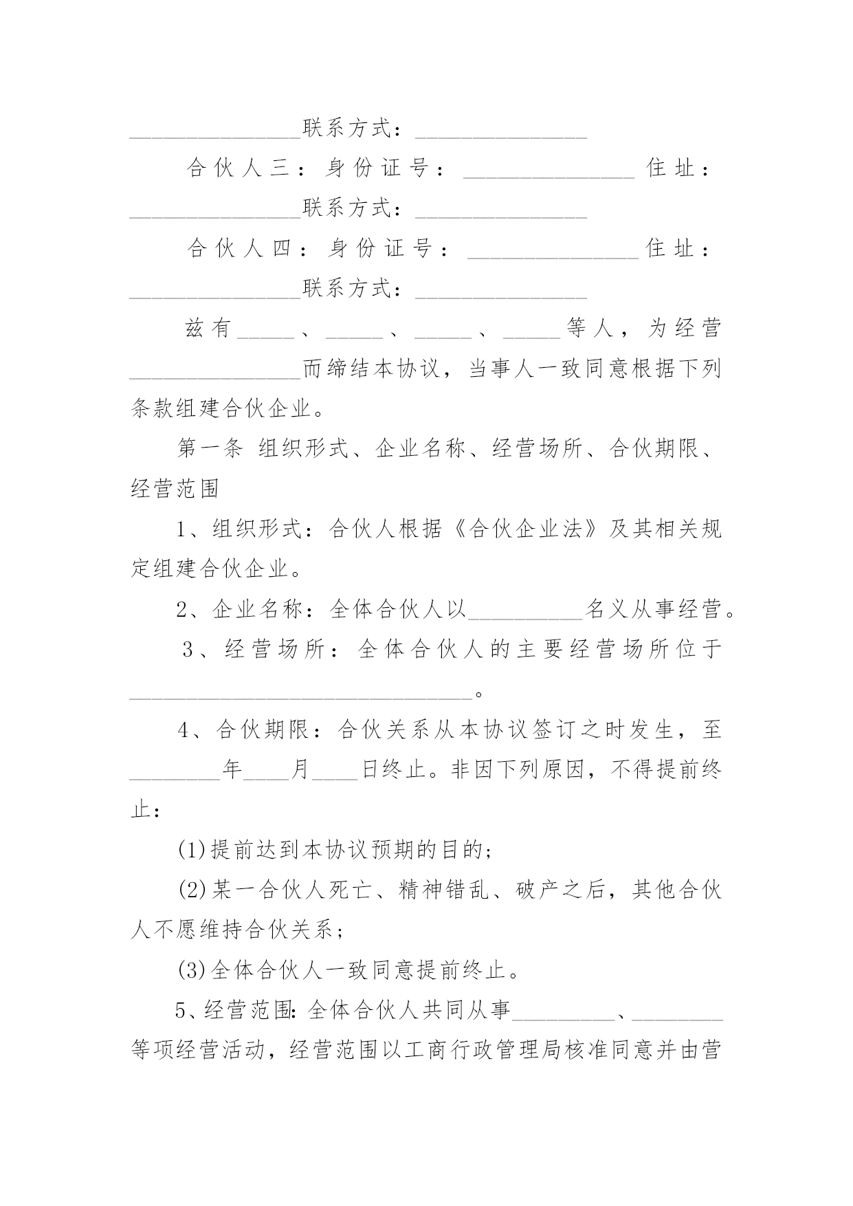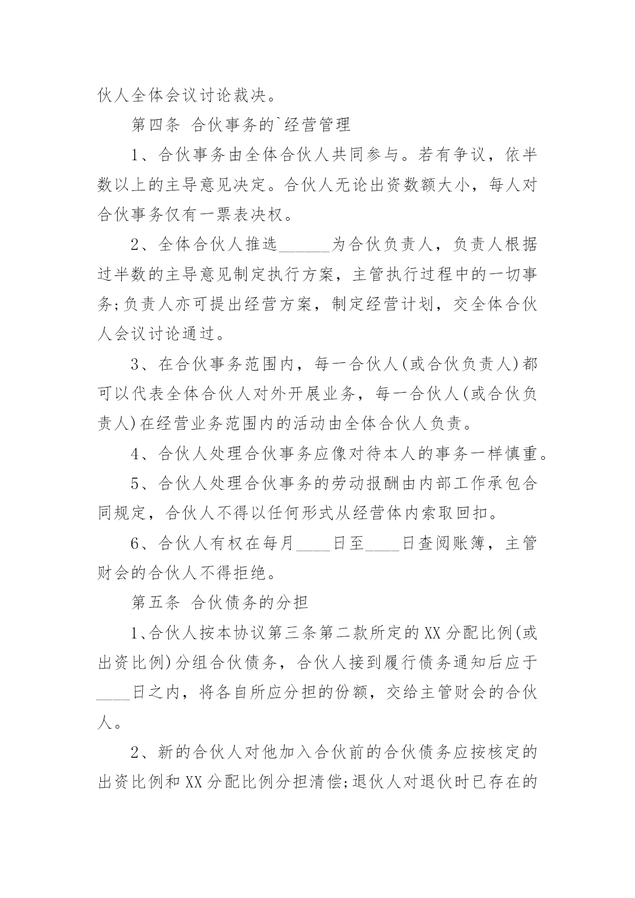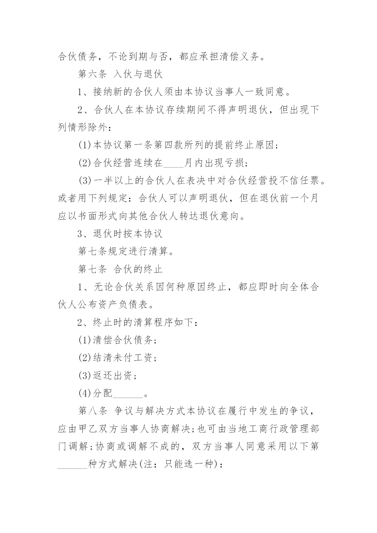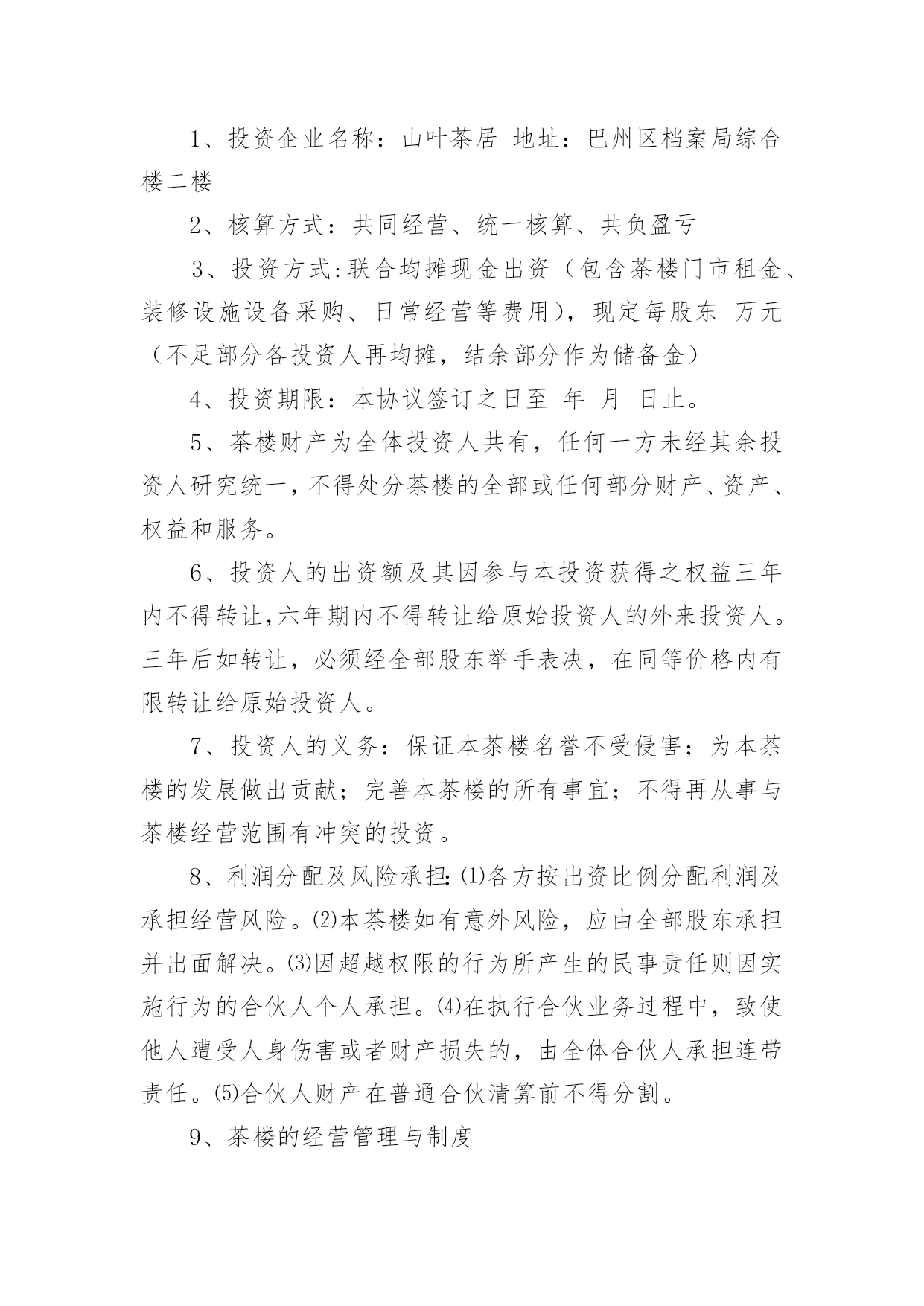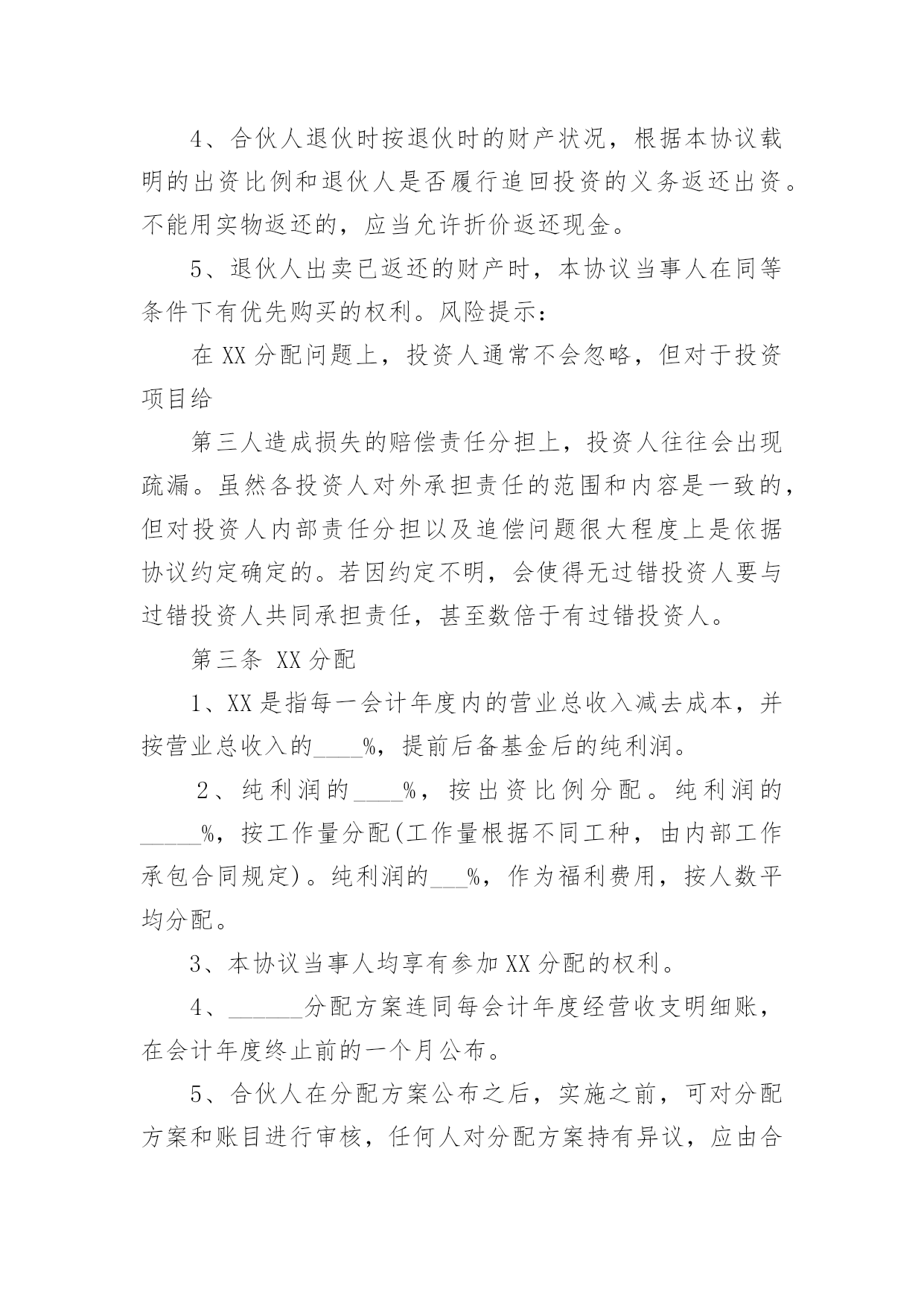 合伙投资协议书合伙投资协议书15篇在快速变化和不断变革的今天,协议的使用成为日常生活的常态,签订协议可以保障自身的权益不被侵害。那么写协议真的很难吗?下面是小编为大家收集的合伙投资协议书,仅供参考,大家一起来看看吧。合伙投资协议书1甲方:身份证号:乙方:身份证号:为了繁荣市场,搞活经济,增加收入,甲乙双方在诚实守信、平等互利的基础上就合作投资有关事宜协商一致,达成协议如下:第一条合作内容及方式甲乙双方共同出资,投资经营xxxxxx,共担风险,共享收益。乙方全权委托甲方负责该项目的经营管理,乙方对经营情况有知晓以及监督的权利。第二条合作期限双方合作期限为xxx年,自20xx年xx月xx日起,至20xx年xx月xx日。第三条出资额及出资方式1、甲方xxx(姓名)以xxx方式出资,计人民币xxx元。2、乙方xxx(姓名)以xxx方式出资,计人民币xxx元。第四条盈余分配双方同意,投资盈余按年结算,自本协议签订之日起计算:1、投资第一年,无论盈亏,甲方承诺支付乙方投资收益人民币xxx元。2、项目利润按双方投资比例进行分配(包括第一年项目利润)。第五条出资的'转让任意一方转让自己出资的,应提前7日告知对方,另一方享有优先受让权。第六条合作关系的解除1、本协议约定的合作期限届满,双方合作关系自动解除,甲乙双方按各自投资比例进行清算。如需继续合作,由甲乙双方另行协商。2、任意一方无正当合理的理由不得擅自解除本协议,如需解除合作关系,应提前xxx个月通知另一方,并承担由此给对方造成的全部损失。3、如项目持续两年亏损,乙方有权单方撤回全部投资(人民币xxxxx万元),双方合作关系自动解除。第七条甲乙双方的权利义务1、甲方的权利义务:(1)对外开展业务,订立合同;(2)对合作项目进行日常经营管理;(3)按月将项目的经营情况以及财务状况及时告知乙方;(4)按时向乙方支付投资收益。2、乙方的权利义务:(1)参与合作项目的经营管理;(2)检查账册及经营情况;(3)共同决定合作项目的重大事项。第八条纠纷的解决如发生纠纷,应共同协商,本着有利于合作项目发展的原则予以解决。如协商不成,可以起诉至xxx法院。第九条本合同如有未尽事宜,应由甲乙双方共同协商,进行补充或修改。补充和修改的内容与本合同具有同等效力。第十条本合同壹式贰份,甲乙双方各执一份,自双方签字之日起生效,具有同等法律效力。甲方:20xx年xx月xx日乙方:20xx年xx月xx日合伙投资协议书2合伙人一:身份证号:_______________住址:_______________联系方式:_______________合伙人二:身份证号:_______________住址:_______________联系方式:_______________合伙人三:身份证号:_______________住址:_______________联系方式:_______________合伙人四:身份证号:_______________住址:_______________联系方式:_______________兹有_____、_____、_____、_____等人,为经营_______________而缔结本协议,当事人一致同意根据下列条款组建合伙企业。第一条组织形式、企业名称、经营场所、合伙期限、经营范围1、组织形式:合伙人根据《合伙企业法》及其相关规定组建合伙企业。2、企业名称:全体合伙人以__________名义从事经营。3、经营场所:全体合伙人的主要经营场所位于______________________________。4、合伙期限:合伙关系从本协议签订之时发生,至________年____月____日终止。非因下列原因,不得提前终止:(1)提前达到本协议预期的目的;(2)某一合伙人死亡、精神错乱、破产之后,其他合伙人不愿维持合伙关系;(3)全体合伙人一致同意提前终止。5、经营范围:全体合伙人共同从事_________、________等项经营活动,经营范围以工商行政管理局核准同意并由营业执照所载明的内容为准。风险提示:投资协议最重要的部分便是出资问题,因此一定要在协议中载明出资的方式,以此方式认缴的出资额是多少,确定该出资额所占的出资比例等。其中,最为重要的是,出资实际缴付的时间确定。实践中不乏有投资人在签订出资协议后,因各种原因而迟迟不予缴付出资,从而导致整个合作项目进程延缓。若未在协议中对此约定,或使迟延履行出资义务人逃脱责任。第二条出资1、全体合伙人出资总额人民币________元(或总计为十成),每一合伙人已按以下所列的种类、数量履行出资义务。____________(姓名)以_______出资,价值____________,占出资总额_____%;____________(姓名)以______