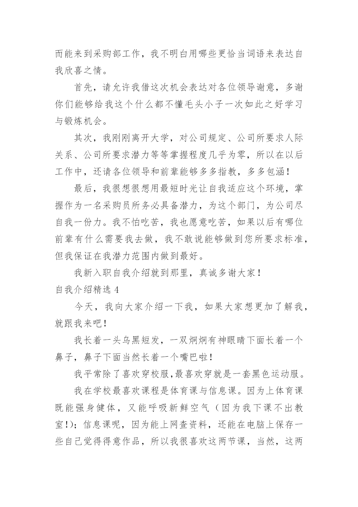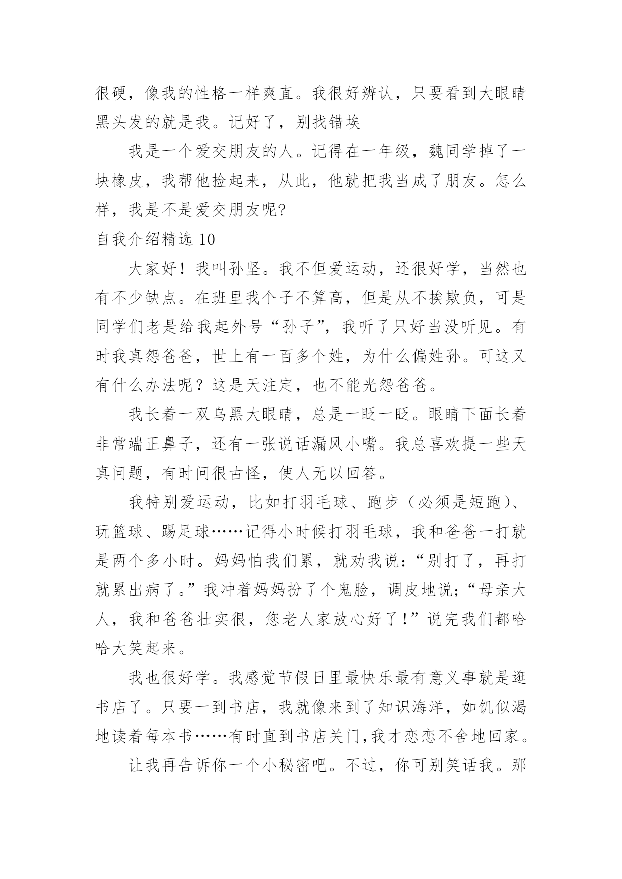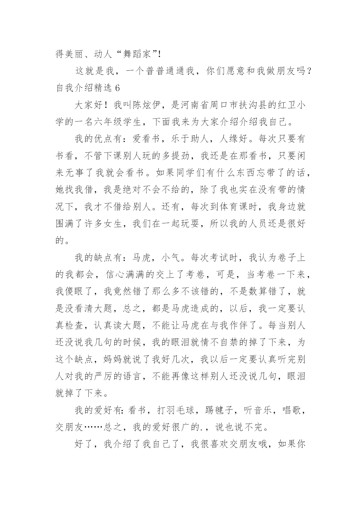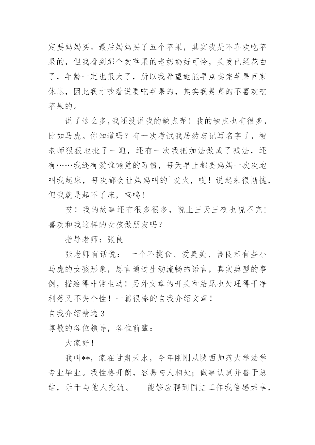自我介绍自我介绍精选当来到一个陌生的地方时,常常要进行自我介绍,自我介绍可以拉近我们与陌生人的关系。你所见过的自我介绍是什么样的呢?以下是小编为大家整理的自我介绍精选,欢迎大家分享。自我介绍精选1新学期新气象,又是开学日子,又可以认识很多新同学,当然自我介绍是最好让同学认识您最佳方式,以下是高中开学幽默型自我介绍。大家好,高中将要和大家一起学习。我感到很兴奋。大家听完我自我介绍,一定会喜欢跟我交朋友。我叫**,我是个17岁男孩,为什么叫男孩呢,因为我心还是很弱小,没有经过岁月磨练。我也快是个要成年男人了,因为我有男人所有东西,呵呵。要向大家自我介绍,其实我也很为难。因为我自己都不是很了解自己。在别人严重我可能永远是快乐,乐观,可是我内心深处却经常为一些事伤心,焦虑,烦恼,甚至死心!我认为正式因为有痛苦才会有快乐,人生好比两杯酒,一杯苦酒,一杯甜酒。只是看你先喝哪一杯。人生可以分为七个阶段吧,幼年、童年少年、青年、成年、中年、老年。我们处于青年,是塑造我们人生价值关和目标时候,我们以后将要成为一个怎样人,主要决定因素都会在接下来高中三年中发生,所以我很期待以后高中生活。我喜欢回忆我少年,回忆我少年带给我无数快乐;而我更向往早点变成一个成年人,因为成年了就能做自己喜欢事,不再受别人牵制和约束。我自我介绍比较简短,大家是否想和我叫朋友呢?那就来认识认识我吧,我也很希望能和大家交朋友。自我介绍精选2我的名字叫陈思言,妈妈告诉我名字的意思是,希望我做一个有思想有主见,言行举止落落大方的女孩。我是个不挑食的女孩,妈妈做什么菜我就吃什么菜,所以营养很均衡,个子长得挺高的,体质也很好,妈妈说我是个最好养的女孩,从来不用操心吃的,让妈妈省心不少,其实说白了我就是个吃货,不过我是不承认的,嘿嘿!我也是一个爱臭美的女孩,每天出门都要把自己打扮得漂漂亮亮的,还经常要妈妈帮我梳各种漂亮的辫子,就连鞋子也不放过,非得弄得干干净净才肯出门,还特别爱穿裙子,每当夏天我衣柜里最多的就是裙子,什么短裙长裙花裙应有尽有。我还是一个善良的女孩,记得有一次我和妈妈出门逛街,在一个服装店门口有好几个人在买水果,妈妈买了我最喜欢吃的桃子和香蕉,刚要走的时候,我对妈妈说我还要吃苹果,妈妈说你不是不喜欢吃苹果吗?我说现在想吃了,还撒娇一定要妈妈买。最后妈妈买了五个苹果,其实我是不喜欢吃苹果的,但我看到那个卖苹果的老奶奶好可怜,头发已经花白了,年龄一定也很大了,所以我希望她能早点卖完苹果回家休息,因此我才吵着说要吃苹果的,其实我是真的不喜欢吃苹果的。说了这么多,我还没说我的缺点呢!我的缺点也有很多,比如马虎。你知道吗?有一次考试我居然忘记写名字了,被老师狠狠地批了一通,还有一次我把加法做成了减法,还有……我还有爱谁懒觉的习惯,每天早上都要妈妈一次次地叫我起床,每次都会让妈妈叫的`发火,哎!说起来很惭愧,但我就是起不了床,呜呜!哎!我的故事还有很多很多,说上三天三夜也说不完!喜欢和我这样的女孩做朋友吗?指导老师:张良张老师有话说:一个不挑食、爱臭美、善良却有些小马虎的女孩形象,思言通过生动流畅的语言,真实典型的事例,描绘得非常生动!另外文章的开头和结尾也处理得干净利落又不失个性!一篇很棒的自我介绍文章!自我介绍精选3尊敬的各位领导,各位前辈:大家好!我叫**,家在甘肃天水,今年刚刚从陕西师范大学法学专业毕业。我性格开朗,容易与人相处;做事认真并善于总结,乐于与他人交流。能够应聘到国虹工作我倍感荣幸,而能来到采购部工作,我不明白用哪些更恰当词语来表达自我欣喜之情。首先,请允许我借这次机会表达对各位领导谢意,多谢你们能够给我这个什么都不懂毛头小子一次如此之好学习与锻炼机会。其次,我刚刚离开大学,对公司规定、公司所要求人际关系、公司所要求潜力等等掌握程度几乎为零,所以在以后工作中,还请各位领导和前辈能够多多指教,多多包涵!最后,我很想很想用最短时光让自我适应这个环境,掌握作为一名采购员所务必具备潜力,为这个部门,为公司尽自我一份力。我不怕吃苦,我也愿意吃苦,如果以后有哪位前辈有什么需要我去做,我不敢说能够做到您所要求标准,但我保证在我潜力范围内做到最好。我新入职自我介绍就到那里,真诚多谢大家!自我介绍精选4今天,我向大家介绍一下我,如果大家想更加了解我,就跟我来吧!我长着一头乌黑短发,一双炯炯有神眼睛下面长着一个鼻子,鼻子下面当然长着一个嘴巴啦!我平常除了喜欢穿校服,最喜欢穿就是一套黑色运动服。我在学校最喜欢课程是体育课与信息课。因为上体育课既能强身健体,又能呼吸新鲜空气(因为我下课不出教室!);信息课呢,因为能上网查资料,还能在电脑上保存一些自己觉得得意作品,所以我很喜欢这两节课,当然,这两节课是大家最爱。另外,我还喜欢语文课、数学课与英语课。我最喜欢在体育课时候踢足球,当我在操