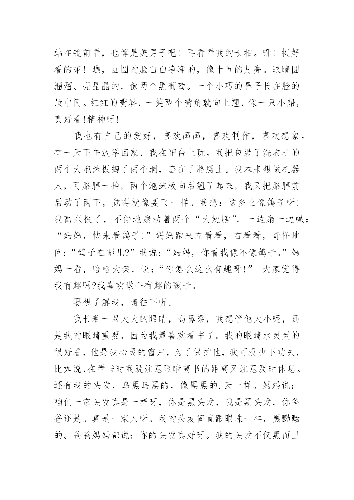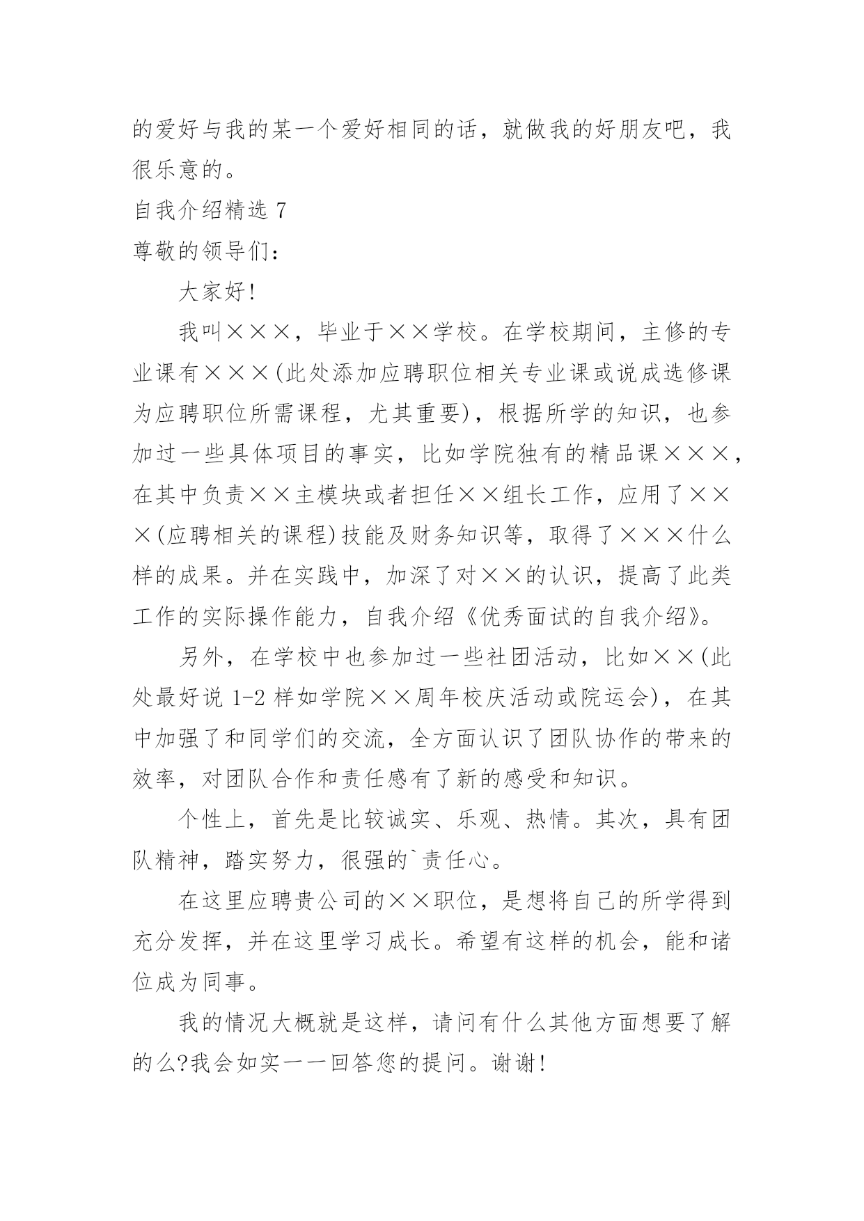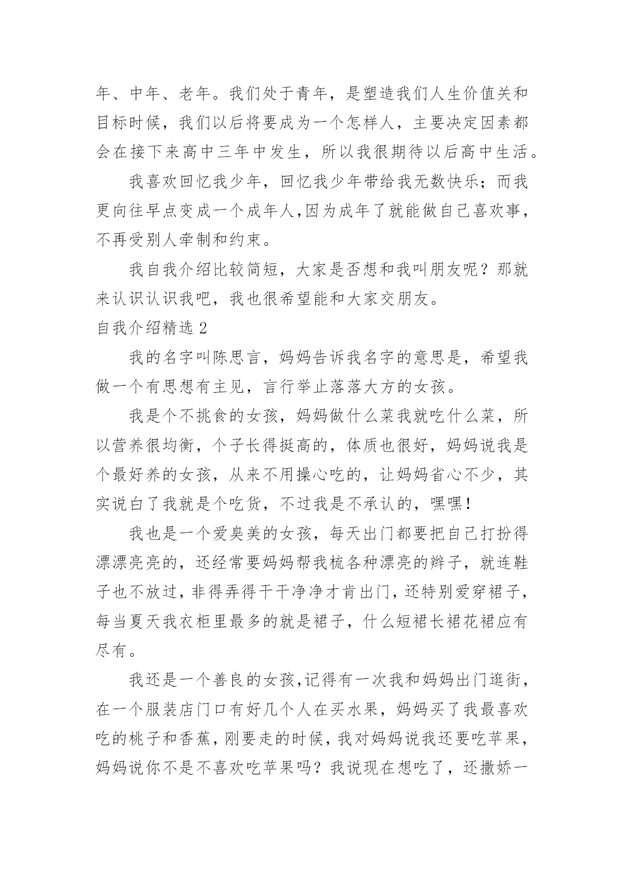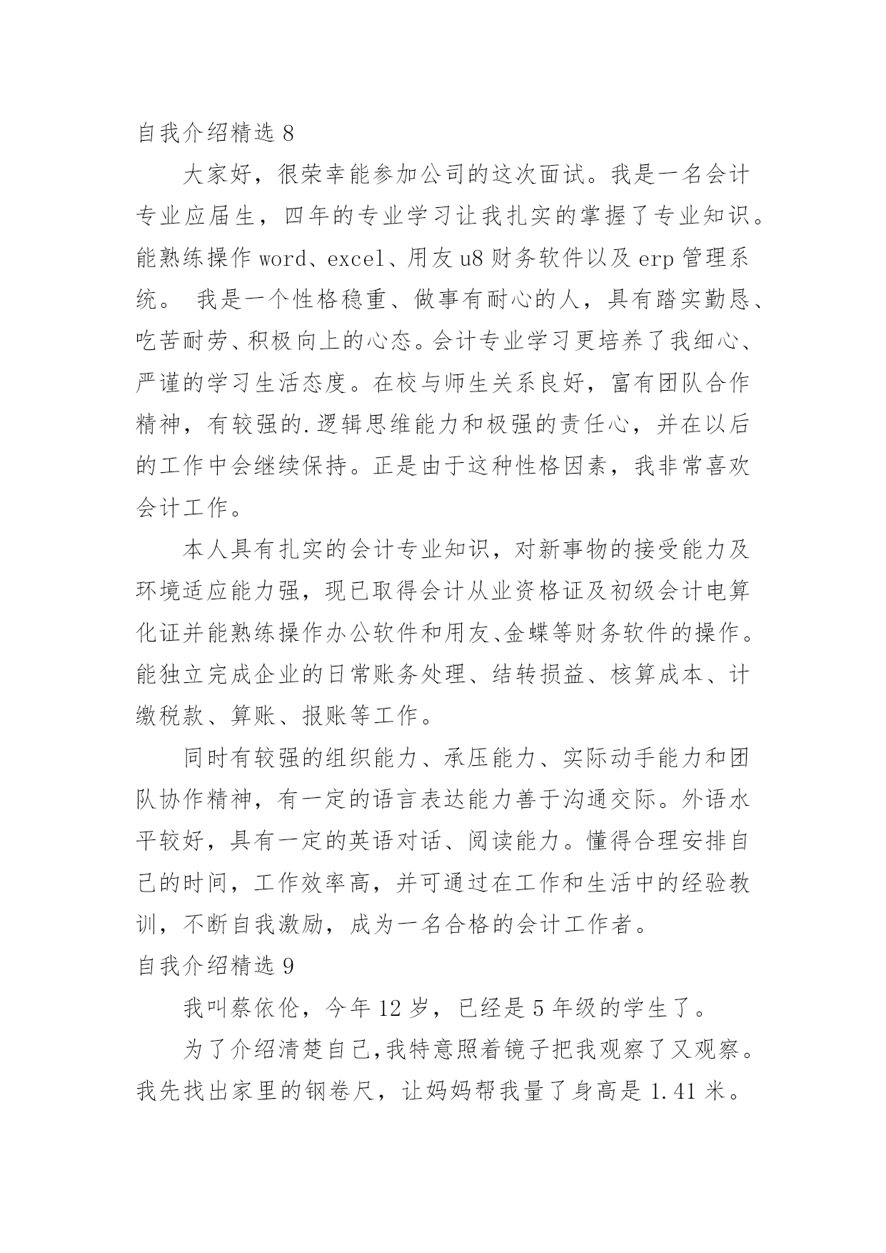 自我介绍自我介绍精选当来到一个陌生的地方时,常常要进行自我介绍,自我介绍可以拉近我们与陌生人的关系。你所见过的自我介绍是什么样的呢?以下是小编为大家整理的自我介绍精选,欢迎大家分享。自我介绍精选1新学期新气象,又是开学日子,又可以认识很多新同学,当然自我介绍是最好让同学认识您最佳方式,以下是高中开学幽默型自我介绍。大家好,高中将要和大家一起学习。我感到很兴奋。大家听完我自我介绍,一定会喜欢跟我交朋友。我叫**,我是个17岁男孩,为什么叫男孩呢,因为我心还是很弱小,没有经过岁月磨练。我也快是个要成年男人了,因为我有男人所有东西,呵呵。要向大家自我介绍,其实我也很为难。因为我自己都不是很了解自己。在别人严重我可能永远是快乐,乐观,可是我内心深处却经常为一些事伤心,焦虑,烦恼,甚至死心!我认为正式因为有痛苦才会有快乐,人生好比两杯酒,一杯苦酒,一杯甜酒。只是看你先喝哪一杯。人生可以分为七个阶段吧,幼年、童年少年、青年、成年、中年、老年。我们处于青年,是塑造我们人生价值关和目标时候,我们以后将要成为一个怎样人,主要决定因素都会在接下来高中三年中发生,所以我很期待以后高中生活。我喜欢回忆我少年,回忆我少年带给我无数快乐;而我更向往早点变成一个成年人,因为成年了就能做自己喜欢事,不再受别人牵制和约束。我自我介绍比较简短,大家是否想和我叫朋友呢?那就来认识认识我吧,我也很希望能和大家交朋友。自我介绍精选2我的名字叫陈思言,妈妈告诉我名字的意思是,希望我做一个有思想有主见,言行举止落落大方的女孩。我是个不挑食的女孩,妈妈做什么菜我就吃什么菜,所以营养很均衡,个子长得挺高的,体质也很好,妈妈说我是个最好养的女孩,从来不用操心吃的,让妈妈省心不少,其实说白了我就是个吃货,不过我是不承认的,嘿嘿!我也是一个爱臭美的女孩,每天出门都要把自己打扮得漂漂亮亮的,还经常要妈妈帮我梳各种漂亮的辫子,就连鞋子也不放过,非得弄得干干净净才肯出门,还特别爱穿裙子,每当夏天我衣柜里最多的就是裙子,什么短裙长裙花裙应有尽有。我还是一个善良的女孩,记得有一次我和妈妈出门逛街,在一个服装店门口有好几个人在买水果,妈妈买了我最喜欢吃的桃子和香蕉,刚要走的时候,我对妈妈说我还要吃苹果,妈妈说你不是不喜欢吃苹果吗?我说现在想吃了,还撒娇一定要妈妈买。最后妈妈买了五个苹果,其实我是不喜欢吃苹果的,但我看到那个卖苹果的老奶奶好可怜,头发已经花白了,年龄一定也很大了,所以我希望她能早点卖完苹果回家休息,因此我才吵着说要吃苹果的,其实我是真的不喜欢吃苹果的。说了这么多,我还没说我的缺点呢!我的缺点也有很多,比如马虎。你知道吗?有一次考试我居然忘记写名字了,被老师狠狠地批了一通,还有一次我把加法做成了减法,还有……我还有爱谁懒觉的习惯,每天早上都要妈妈一次次地叫我起床,每次都会让妈妈叫的`发火,哎!说起来很惭愧,但我就是起不了床,呜呜!哎!我的故事还有很多很多,说上三天三夜也说不完!喜欢和我这样的女孩做朋友吗?指导老师:张良张老师有话说:一个不挑食、爱臭美、善良却有些小马虎的女孩形象,思言通过生动流畅的语言,真实典型的事例,描绘得非常生动!另外文章的开头和结尾也处理得干净利落又不失个性!一篇很棒的自我介绍文章!自我介绍精选3尊敬的各位领导,各位前辈:大家好!我叫**,家在甘肃天水,今年刚刚从陕西师范大学法学专业毕业。我性格开朗,容易与人相处;做事认真并善于总结,乐于与他人交流。能够应聘到国虹工作我倍感荣幸,而能来到采购部工作,我不明白用哪些更恰当词语来表达自我欣喜之情。首先,请允许我借这次机会表达对各位领导谢意,多谢你们能够给我这个什么都不懂毛头小子一次如此之好学习与锻炼机会。其次,我刚刚离开大学,对公司规定、公司所要求人际关系、公司所要求潜力等等掌握程度几乎为零,所以在以后工作中,还请各位领导和前辈能够多多指教,多多包涵!最后,我很想很想用最短时光让自我适应这个环境,掌握作为一名采购员所务必具备潜力,为这个部门,为公司尽自我一份力。我不怕吃苦,我也愿意吃苦,如果以后有哪位前辈有什么需要我去做,我不敢说能够做到您所要求标准,但我保证在我潜力范围内做到最好。我新入职自我介绍就到那里,真诚多谢大家!自我介绍精选4今天,我向大家介绍一下我,如果大家想更加了解我,就跟我来吧!我长着一头乌黑短发,一双炯炯有神眼睛下面长着一个鼻子,鼻子下面当然长着一个嘴巴啦!我平常除了喜欢穿校服,最喜欢穿就是一套黑色运动服。我在学校最喜欢课程是体育课与信息课。因为上体育课既能强身健体,又能呼吸新鲜空气(因为我下课不出教室!);信息课呢,因为能上网查资料,还能在电脑上保存一些自己觉得得意作品,所以我很喜欢这两节课,当然,这两节课是大家最爱。另外,我还喜欢语文课、数学课与英语课。我最喜欢在体育课时候踢足球,当我在操