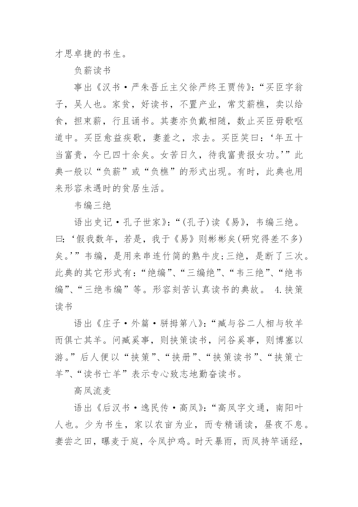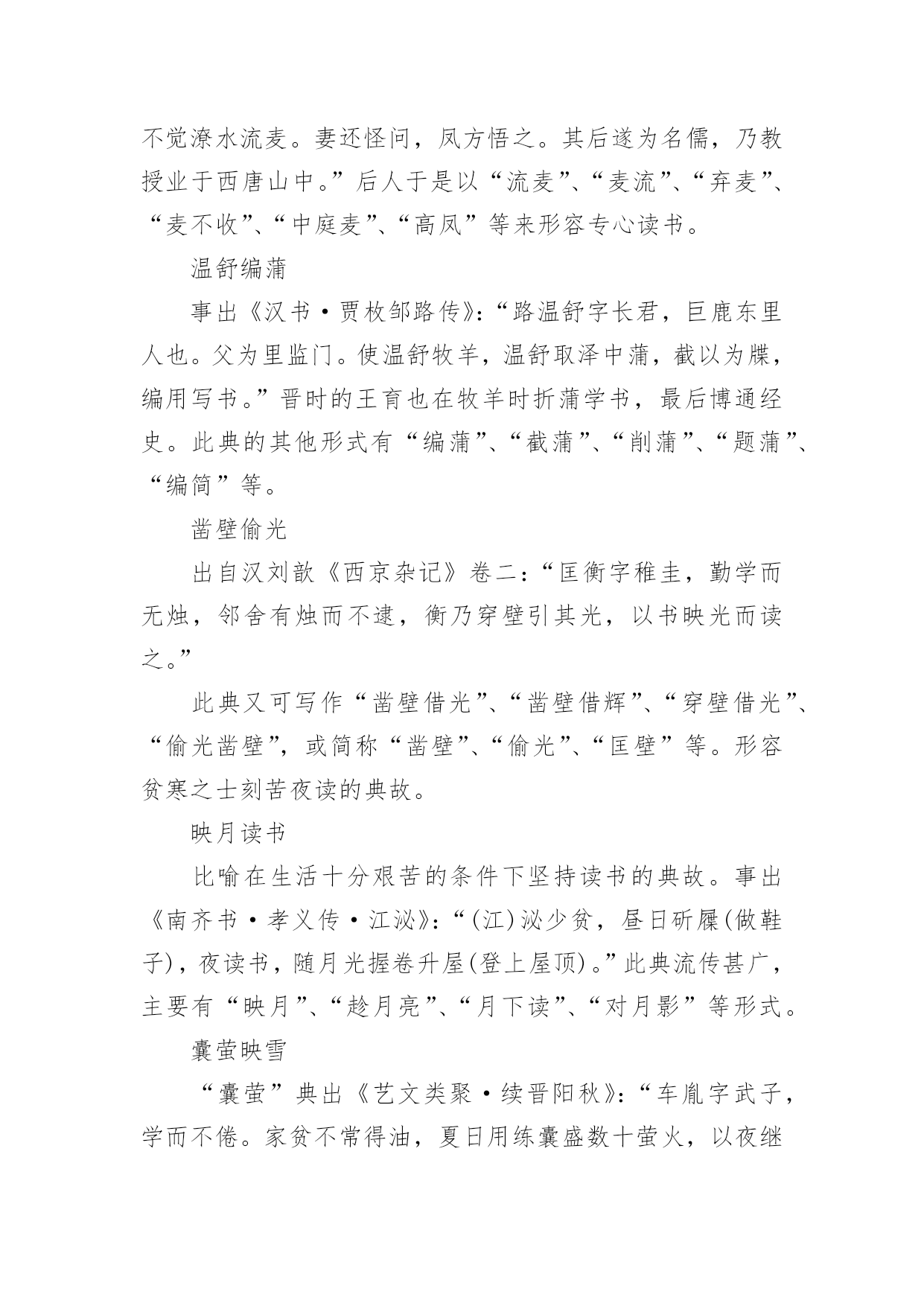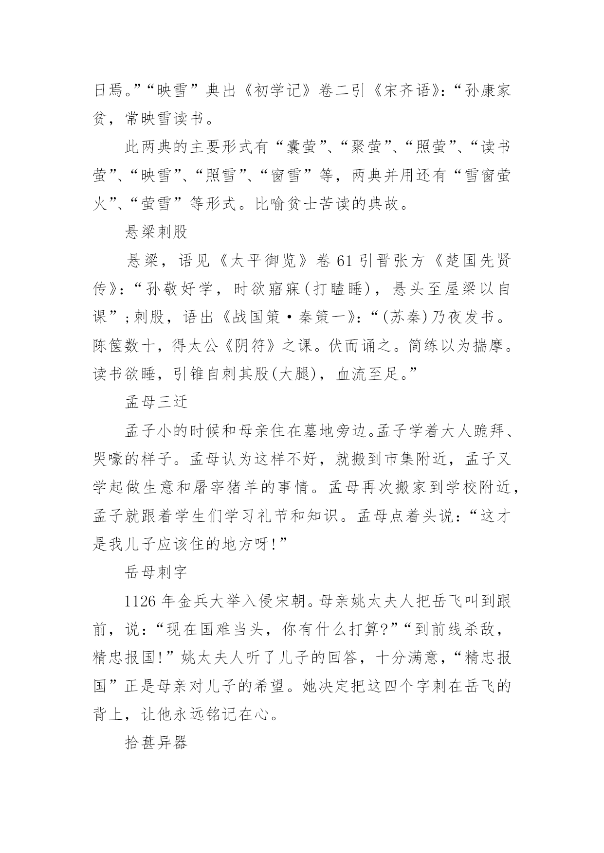 成语的历史典故关于成语的历史典故在平时的学习、工作或生活中,用到成语的地方还是很多的,成语在语句中是作为一个整体来应用的,承担主语、宾语、定语等成分。为了帮助大家积累更多经典成语,下面是小编为大家收集的关于成语的历史典故,仅供参考,希望能够帮助到大家。成语的历史典故牛角挂书《新唐书·李密传》:“(李密)闻包恺在缑山,往从之。以蒲鞯(jiān)乘牛,挂《汉书》一帙角上,行且读。越国公杨素适见于道,按辔蹑其后,曰:‘何书生勤如此?’密识素,下拜。问所读,曰:‘《项羽传》。’因与语,奇之。归谓子玄感曰:‘吾观密识度,非若等辈。’玄感遂倾心结纳。”李密用薄草做的鞍鞯骑牛,在牛角上挂一卷《汉书》,一边走一边看书。越国公杨素正巧在路上看见,慢慢地跟在他后面,问:“哪来的书生这般勤奋?”李密认识杨素,从牛背上下来参拜。杨素问他读的是什么,他回答说:“《项羽传》。”杨素于是和他交谈,觉得很惊奇。回家后对儿子杨玄感说:“我看李密的见识风度,不是你们能比的。”玄感因此就倾心结交李密。后人遂以“书横牛角”、“角挂经”、“茧栗挂汉书”、“束书牛角”、“书挂(牛)角”、“牛角之悬”来形容勤奋读书。或以“挂犊之才”、“牛角书生”来指勤奋学习而才思卓捷的书生。负薪读书事出《汉书·严朱吾丘主父徐严终王贾传》:“买臣字翁子,吴人也。家贫,好读书,不置产业,常艾薪樵,卖以给食,担束薪,行且诵书。其妻亦负戴相随,数止买臣毋歌呕道中。买臣愈益疾歌,妻羞之,求去。买臣笑曰:‘年五十当富贵,今已四十余矣。女苦日久,待我富贵报女功。’”此典一般以“负薪”或“负樵”的形式出现。有时,此典也用来形容未遇时的贫居生活。韦编三绝语出史记·孔子世家》:“(孔子)读《易》,韦编三绝。曰:‘假我数年,若是,我于《易》则彬彬矣(研究得差不多)矣。’”韦编,是用来串连竹简的熟牛皮;三绝,是断了三次。此典的其它形式有:“绝编”、“三编绝”、“韦三绝”、“绝韦编”、“三绝韦编”等。形容刻苦认真读书的典故。4.挟策读书语出《庄子·外篇·骈拇第八》:“臧与谷二人相与牧羊而俱亡其羊。问臧奚事,则挟策读书,问谷奚事,则博塞以游。”后人便以“挟策”、“挟册”、“挟策读书”、“挟策亡羊”、“读书亡羊”表示专心致志地勤奋读书。高凤流麦语出《后汉书·逸民传·高凤》:“高凤字文通,南阳叶人也。少为书生,家以农亩为业,而专精诵读,昼夜不息。妻尝之田,曝麦于庭,令凤护鸡。时天暴雨,而凤持竿诵经,不觉潦水流麦。妻还怪问,凤方悟之。其后遂为名儒,乃教授业于西唐山中。”后人于是以“流麦”、“麦流”、“弃麦”、“麦不收”、“中庭麦”、“高凤”等来形容专心读书。温舒编蒲事出《汉书·贾枚邹路传》:“路温舒字长君,巨鹿东里人也。父为里监门。使温舒牧羊,温舒取泽中蒲,截以为牒,编用写书。”晋时的王育也在牧羊时折蒲学书,最后博通经史。此典的其他形式有“编蒲”、“截蒲”、“削蒲”、“题蒲”、“编简”等。凿壁偷光出自汉刘歆《西京杂记》卷二:“匡衡字稚圭,勤学而无烛,邻舍有烛而不逮,衡乃穿壁引其光,以书映光而读之。”此典又可写作“凿壁借光”、“凿壁借辉”、“穿壁借光”、“偷光凿壁”,或简称“凿壁”、“偷光”、“匡壁”等。形容贫寒之士刻苦夜读的典故。映月读书比喻在生活十分艰苦的条件下坚持读书的典故。事出《南齐书·孝义传·江泌》:“(江)泌少贫,昼日斫屧(做鞋子),夜读书,随月光握卷升屋(登上屋顶)。”此典流传甚广,主要有“映月”、“趁月亮”、“月下读”、“对月影”等形式。囊萤映雪“囊萤”典出《艺文类聚·续晋阳秋》:“车胤字武子,学而不倦。家贫不常得油,夏日用练囊盛数十萤火,以夜继日焉。”“映雪”典出《初学记》卷二引《宋齐语》:“孙康家贫,常映雪读书。此两典的主要形式有“囊萤”、“聚萤”、“照萤”、“读书萤”、“映雪”、“照雪”、“窗雪”等,两典并用还有“雪窗萤火”、“萤雪”等形式。比喻贫士苦读的典故。悬梁刺股悬梁,语见《太平御览》卷61引晋张方《楚国先贤传》:“孙敬好学,时欲寤寐(打瞌睡),悬头至屋梁以自课”;刺股,语出《战国策·秦策一》:“(苏秦)乃夜发书。陈箧数十,得太公《阴符》之课。伏而诵之。简练以为揣摩。读书欲睡,引锥自刺其股(大腿),血流至足。”孟母三迁孟子小的时候和母亲住在墓地旁边。孟子学着大人跪拜、哭嚎的样子。孟母认为这样不好,就搬到市集附近,孟子又学起做生意和屠宰猪羊的事情。孟母再次搬家到学校附近,孟子就跟着学生们学习礼节和知识。孟母点着头说:“这才是我儿子应该住的地方呀!”岳母刺字1126年金兵大举入侵宋朝。母亲姚太夫人把岳飞叫到跟前,说:“现在国难当头,你有什么打算?”“到前线杀敌,精忠报国!”姚太夫人听了儿子的回答,十分满意,“精忠报国”正是母亲对儿子的希望。她决定把这四个字刺在岳飞的背上,让他永远铭记在心。拾葚异