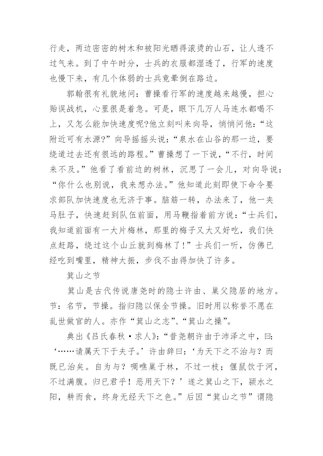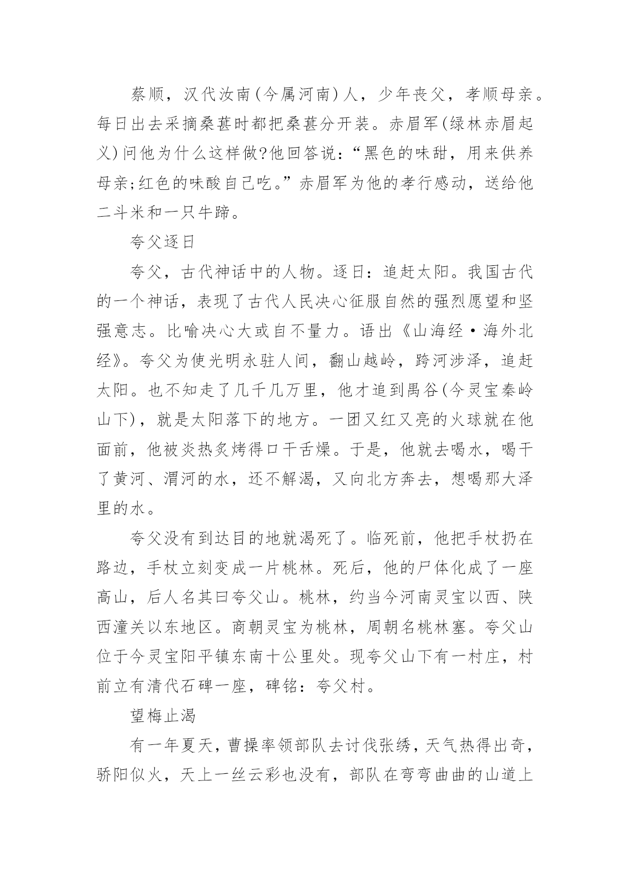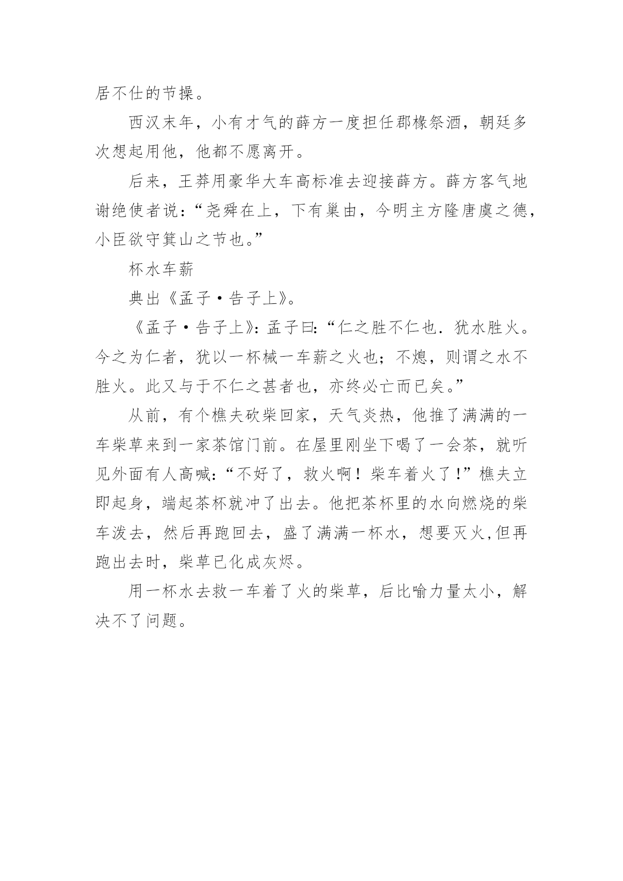 成语的历史典故关于成语的历史典故在平时的学习、工作或生活中,用到成语的地方还是很多的,成语在语句中是作为一个整体来应用的,承担主语、宾语、定语等成分。为了帮助大家积累更多经典成语,下面是小编为大家收集的关于成语的历史典故,仅供参考,希望能够帮助到大家。成语的历史典故牛角挂书《新唐书·李密传》:“(李密)闻包恺在缑山,往从之。以蒲鞯(jiān)乘牛,挂《汉书》一帙角上,行且读。越国公杨素适见于道,按辔蹑其后,曰:‘何书生勤如此?’密识素,下拜。问所读,曰:‘《项羽传》。’因与语,奇之。归谓子玄感曰:‘吾观密识度,非若等辈。’玄感遂倾心结纳。”李密用薄草做的鞍鞯骑牛,在牛角上挂一卷《汉书》,一边走一边看书。越国公杨素正巧在路上看见,慢慢地跟在他后面,问:“哪来的书生这般勤奋?”李密认识杨素,从牛背上下来参拜。杨素问他读的是什么,他回答说:“《项羽传》。”杨素于是和他交谈,觉得很惊奇。回家后对儿子杨玄感说:“我看李密的见识风度,不是你们能比的。”玄感因此就倾心结交李密。后人遂以“书横牛角”、“角挂经”、“茧栗挂汉书”、“束书牛角”、“书挂(牛)角”、“牛角之悬”来形容勤奋读书。或以“挂犊之才”、“牛角书生”来指勤奋学习而才思卓捷的书生。负薪读书事出《汉书·严朱吾丘主父徐严终王贾传》:“买臣字翁子,吴人也。家贫,好读书,不置产业,常艾薪樵,卖以给食,担束薪,行且诵书。其妻亦负戴相随,数止买臣毋歌呕道中。买臣愈益疾歌,妻羞之,求去。买臣笑曰:‘年五十当富贵,今已四十余矣。女苦日久,待我富贵报女功。’”此典一般以“负薪”或“负樵”的形式出现。有时,此典也用来形容未遇时的贫居生活。韦编三绝语出史记·孔子世家》:“(孔子)读《易》,韦编三绝。曰:‘假我数年,若是,我于《易》则彬彬矣(研究得差不多)矣。’”韦编,是用来串连竹简的熟牛皮;三绝,是断了三次。此典的其它形式有:“绝编”、“三编绝”、“韦三绝”、“绝韦编”、“三绝韦编”等。形容刻苦认真读书的典故。4.挟策读书语出《庄子·外篇·骈拇第八》:“臧与谷二人相与牧羊而俱亡其羊。问臧奚事,则挟策读书,问谷奚事,则博塞以游。”后人便以“挟策”、“挟册”、“挟策读书”、“挟策亡羊”、“读书亡羊”表示专心致志地勤奋读书。高凤流麦语出《后汉书·逸民传·高凤》:“高凤字文通,南阳叶人也。少为书生,家以农亩为业,而专精诵读,昼夜不息。妻尝之田,曝麦于庭,令凤护鸡。时天暴雨,而凤持竿诵经,不觉潦水流麦。妻还怪问,凤方悟之。其后遂为名儒,乃教授业于西唐山中。”后人于是以“流麦”、“麦流”、“弃麦”、“麦不收”、“中庭麦”、“高凤”等来形容专心读书。温舒编蒲事出《汉书·贾枚邹路传》:“路温舒字长君,巨鹿东里人也。父为里监门。使温舒牧羊,温舒取泽中蒲,截以为牒,编用写书。”晋时的王育也在牧羊时折蒲学书,最后博通经史。此典的其他形式有“编蒲”、“截蒲”、“削蒲”、“题蒲”、“编简”等。凿壁偷光出自汉刘歆《西京杂记》卷二:“匡衡字稚圭,勤学而无烛,邻舍有烛而不逮,衡乃穿壁引其光,以书映光而读之。”此典又可写作“凿壁借光”、“凿壁借辉”、“穿壁借光”、“偷光凿壁”,或简称“凿壁”、“偷光”、“匡壁”等。形容贫寒之士刻苦夜读的典故。映月读书比喻在生活十分艰苦的条件下坚持读书的典故。事出《南齐书·孝义传·江泌》:“(江)泌少贫,昼日斫屧(做鞋子),夜读书,随月光握卷升屋(登上屋顶)。”此典流传甚广,主要有“映月”、“趁月亮”、“月下读”、“对月影”等形式。囊萤映雪“囊萤”典出《艺文类聚·续晋阳秋》:“车胤字武子,学而不倦。家贫不常得油,夏日用练囊盛数十萤火,以夜继日焉。”“映雪”典出《初学记》卷二引《宋齐语》:“孙康家贫,常映雪读书。此两典的主要形式有“囊萤”、“聚萤”、“照萤”、“读书萤”、“映雪”、“照雪”、“窗雪”等,两典并用还有“雪窗萤火”、“萤雪”等形式。比喻贫士苦读的典故。悬梁刺股悬梁,语见《太平御览》卷61引晋张方《楚国先贤传》:“孙敬好学,时欲寤寐(打瞌睡),悬头至屋梁以自课”;刺股,语出《战国策·秦策一》:“(苏秦)乃夜发书。陈箧数十,得太公《阴符》之课。伏而诵之。简练以为揣摩。读书欲睡,引锥自刺其股(大腿),血流至足。”孟母三迁孟子小的时候和母亲住在墓地旁边。孟子学着大人跪拜、哭嚎的样子。孟母认为这样不好,就搬到市集附近,孟子又学起做生意和屠宰猪羊的事情。孟母再次搬家到学校附近,孟子就跟着学生们学习礼节和知识。孟母点着头说:“这才是我儿子应该住的地方呀!”岳母刺字1126年金兵大举入侵宋朝。母亲姚太夫人把岳飞叫到跟前,说:“现在国难当头,你有什么打算?”“到前线杀敌,精忠报国!”姚太夫人听了儿子的回答,十分满意,“精忠报国”正是母亲对儿子的希望。她决定把这四个字刺在岳飞的背上,让他永远铭记在心。拾葚异