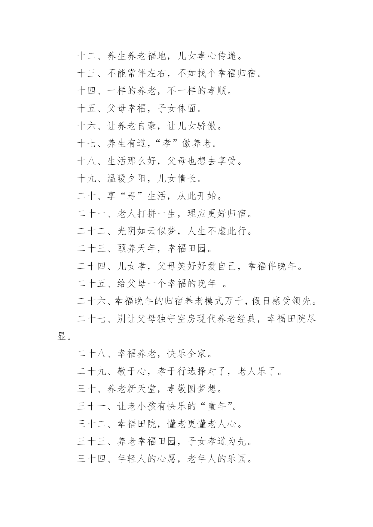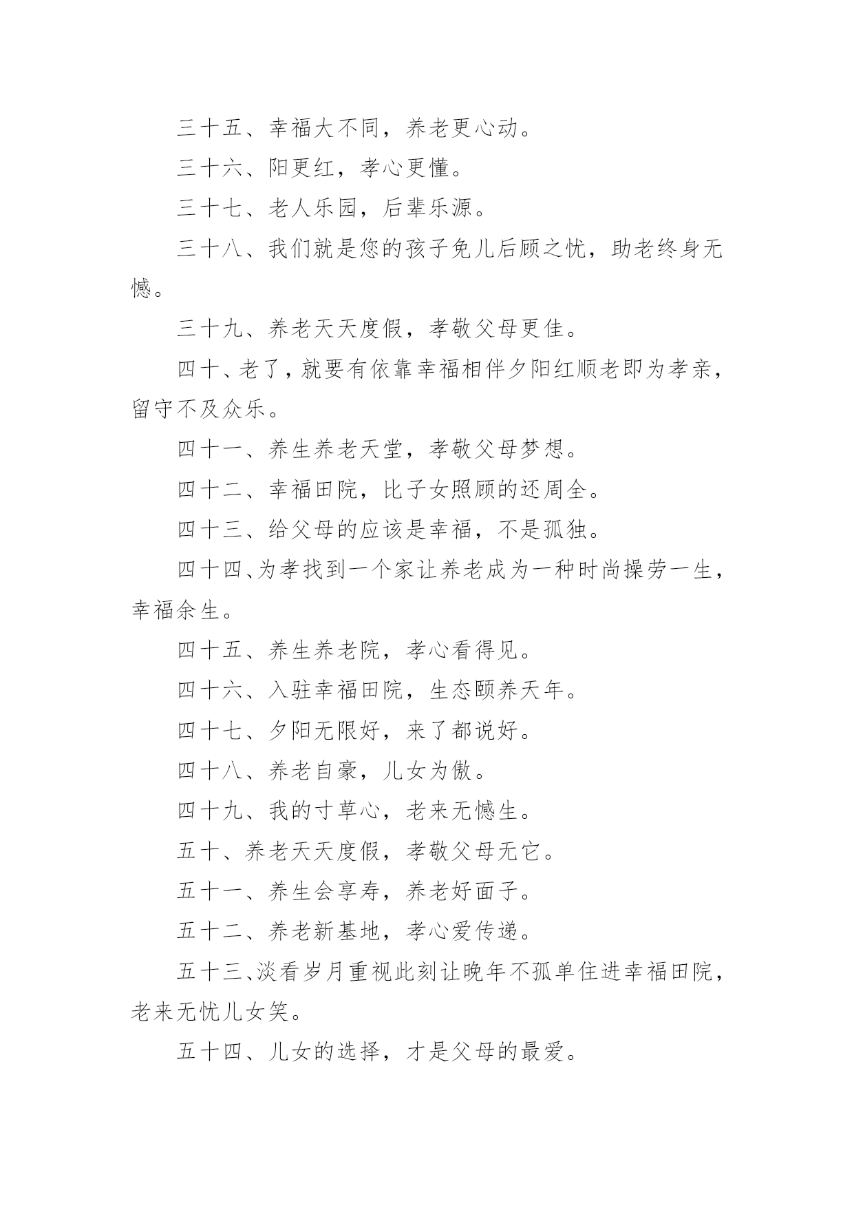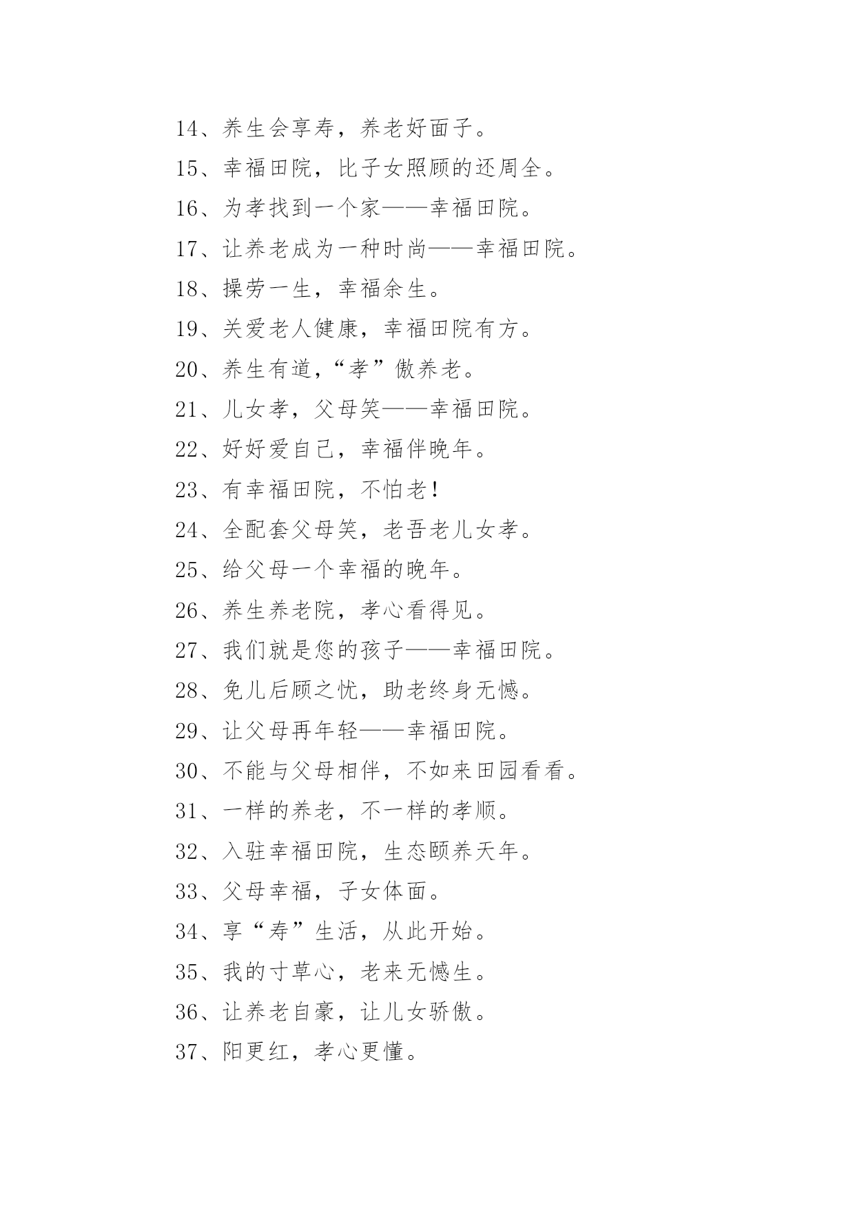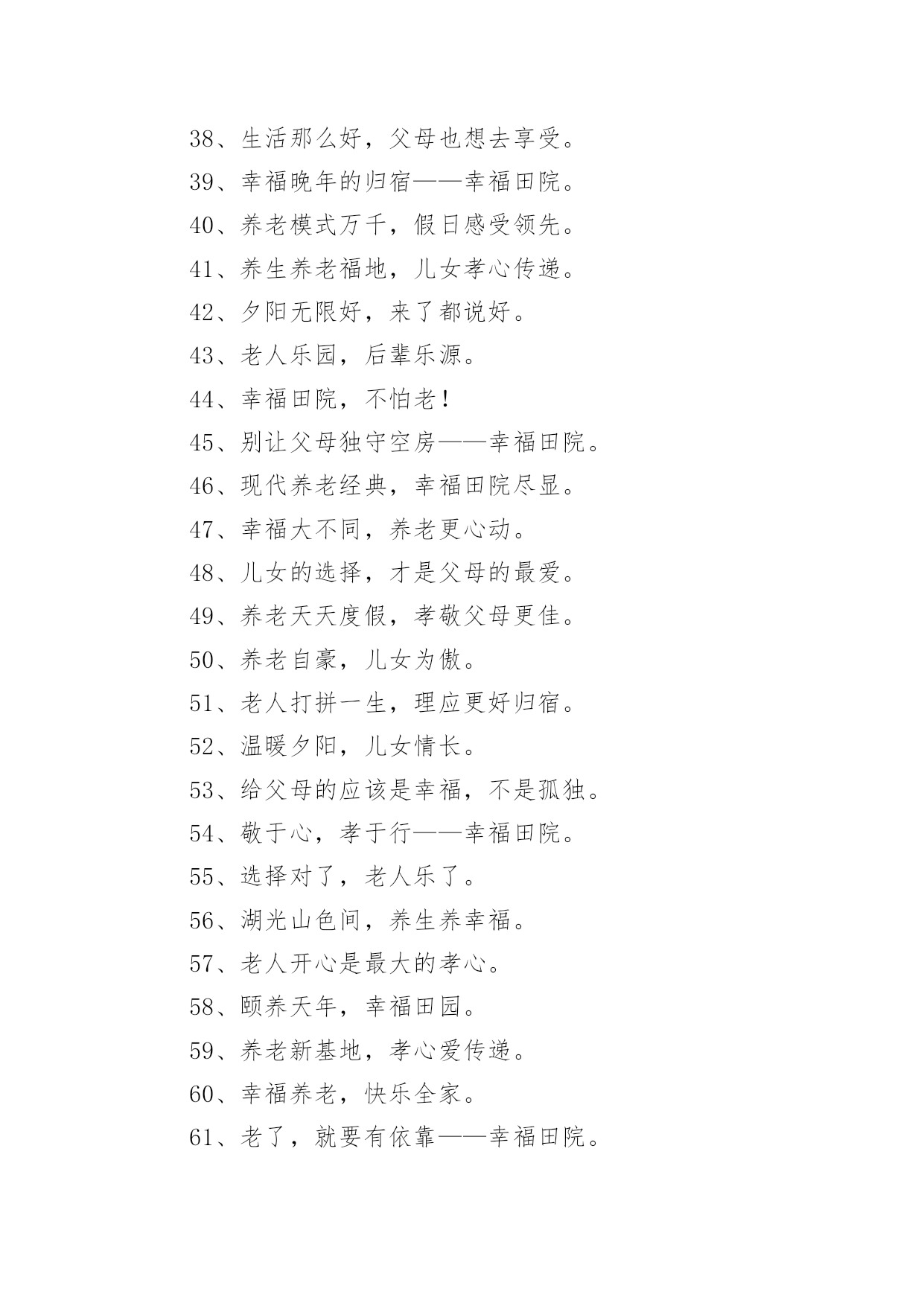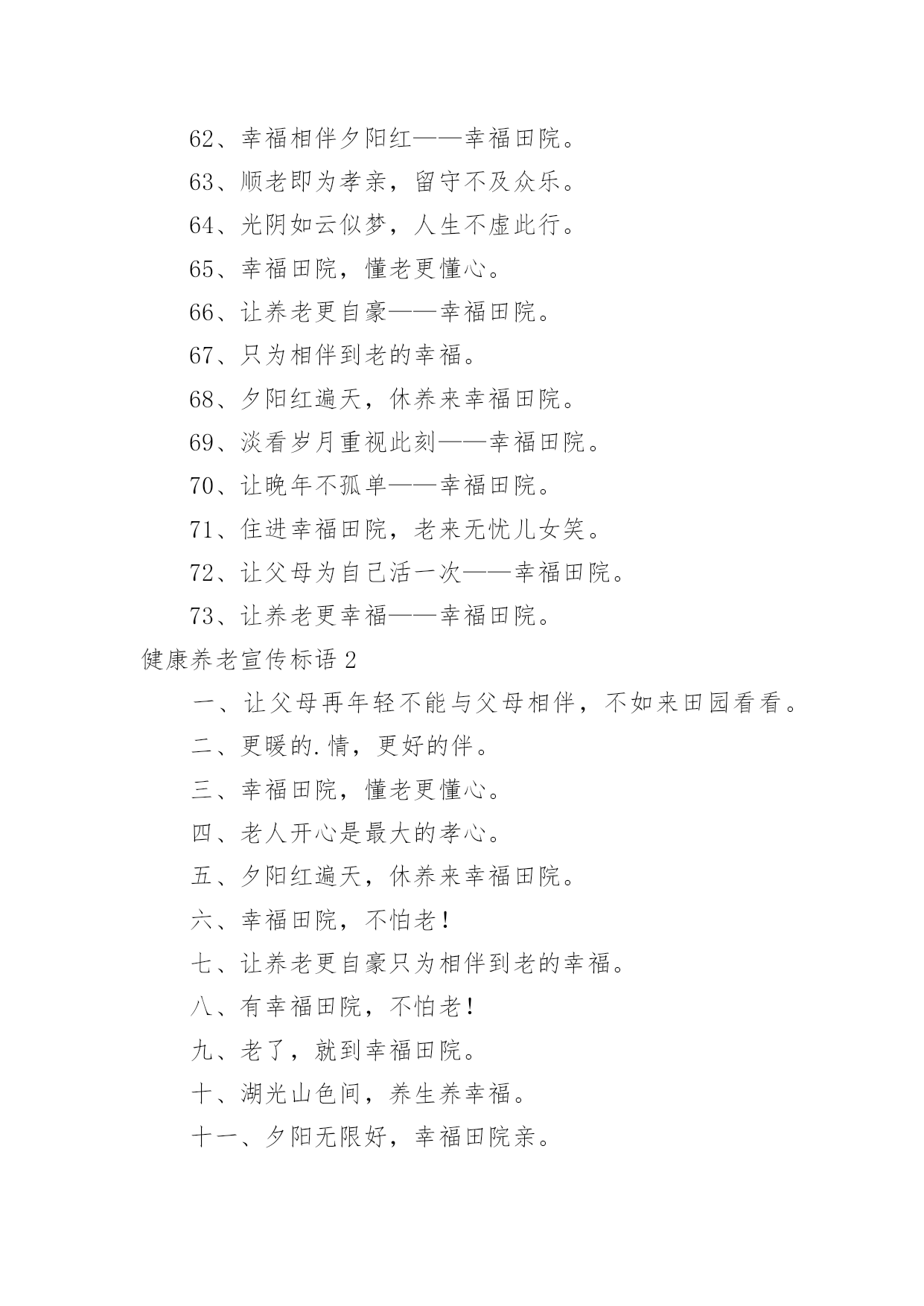 健康养老宣传标语健康养老宣传标语在平平淡淡的日常中,大家总少不了接触一些耳熟能详的标语吧,标语在一定程度上反映了社会经济制度的本质和社会的文明程度,它的意义十分重大。那么你有真正了解过标语吗?下面是小编收集整理的健康养老宣传标语,仅供参考,大家一起来看看吧。健康养老宣传标语11、让老小孩有快乐的“童年”。2、更暖的情,更好的伴。3、夕阳无限好,幸福田院亲。4、养生养老天堂,孝敬父母梦想。5、不能常伴左右,不如找个幸福归宿。6、养老天天度假,孝敬父母无它。7、养老幸福田园,子女孝道为先。8、养老新天堂,孝敬圆梦想。9、老了,就到幸福田院。10、幸福田院,懂老更懂老人心。11、尊享养老,荣德尽孝。12、度幸福晚年,享完美人生。13、年轻人的心愿,老年人的乐园。14、养生会享寿,养老好面子。15、幸福田院,比子女照顾的还周全。16、为孝找到一个家——幸福田院。17、让养老成为一种时尚——幸福田院。18、操劳一生,幸福余生。19、关爱老人健康,幸福田院有方。20、养生有道,“孝”傲养老。21、儿女孝,父母笑——幸福田院。22、好好爱自己,幸福伴晚年。23、有幸福田院,不怕老!24、全配套父母笑,老吾老儿女孝。25、给父母一个幸福的晚年。26、养生养老院,孝心看得见。27、我们就是您的孩子——幸福田院。28、免儿后顾之忧,助老终身无憾。29、让父母再年轻——幸福田院。30、不能与父母相伴,不如来田园看看。31、一样的养老,不一样的孝顺。32、入驻幸福田院,生态颐养天年。33、父母幸福,子女体面。34、享“寿”生活,从此开始。35、我的寸草心,老来无憾生。36、让养老自豪,让儿女骄傲。37、阳更红,孝心更懂。38、生活那么好,父母也想去享受。39、幸福晚年的归宿——幸福田院。40、养老模式万千,假日感受领先。41、养生养老福地,儿女孝心传递。42、夕阳无限好,来了都说好。43、老人乐园,后辈乐源。44、幸福田院,不怕老!45、别让父母独守空房——幸福田院。46、现代养老经典,幸福田院尽显。47、幸福大不同,养老更心动。48、儿女的选择,才是父母的最爱。49、养老天天度假,孝敬父母更佳。50、养老自豪,儿女为傲。51、老人打拼一生,理应更好归宿。52、温暖夕阳,儿女情长。53、给父母的应该是幸福,不是孤独。54、敬于心,孝于行——幸福田院。55、选择对了,老人乐了。56、湖光山色间,养生养幸福。57、老人开心是最大的孝心。58、颐养天年,幸福田园。59、养老新基地,孝心爱传递。60、幸福养老,快乐全家。61、老了,就要有依靠——幸福田院。62、幸福相伴夕阳红——幸福田院。63、顺老即为孝亲,留守不及众乐。64、光阴如云似梦,人生不虚此行。65、幸福田院,懂老更懂心。66、让养老更自豪——幸福田院。67、只为相伴到老的幸福。68、夕阳红遍天,休养来幸福田院。69、淡看岁月重视此刻——幸福田院。70、让晚年不孤单——幸福田院。71、住进幸福田院,老来无忧儿女笑。72、让父母为自己活一次——幸福田院。73、让养老更幸福——幸福田院。健康养老宣传标语2一、让父母再年轻不能与父母相伴,不如来田园看看。二、更暖的.情,更好的伴。三、幸福田院,懂老更懂心。四、老人开心是最大的孝心。五、夕阳红遍天,休养来幸福田院。六、幸福田院,不怕老!七、让养老更自豪只为相伴到老的幸福。八、有幸福田院,不怕老!九、老了,就到幸福田院。十、湖光山色间,养生养幸福。十一、夕阳无限好,幸福田院亲。十二、养生养老福地,儿女孝心传递。十三、不能常伴左右,不如找个幸福归宿。十四、一样的养老,不一样的孝顺。十五、父母幸福,子女体面。十六、让养老自豪,让儿女骄傲。十七、养生有道,“孝”傲养老。十八、生活那么好,父母也想去享受。十九、温暖夕阳,儿女情长。二十、享“寿”生活,从此开始。二十一、老人打拼一生,理应更好归宿。二十二、光阴如云似梦,人生不虚此行。二十三、颐养天年,幸福田园。二十四、儿女孝,父母笑好好爱自己,幸福伴晚年。二十五、给父母一个幸福的晚年。二十六、幸福晚年的归宿养老模式万千,假日感受领先。二十七、别让父母独守空房现代养老经典,幸福田院尽显。二十八、幸福养老,快乐全家。二十九、敬于心,孝于行选择对了,老人乐了。三十、养老新天堂,孝敬圆梦想。三十一、让老小孩有快乐的“童年”。三十二、幸福田院,懂老更懂老人心。三十三、养老幸福田园,子女孝道为先。三十四、年轻人的心愿,老年人的乐园。三十五、幸福大不同,养老更心动。三十六、阳更红,孝心更懂。三十七、老人乐园,后辈乐源。三十八、我们就是您的孩子免儿后顾之忧,助老终身无憾。三十九、养老天天度假,孝敬父母更佳。四十、老了,就要有依靠幸福相伴夕阳红顺老即为孝亲,留守不及众乐。四十一、养生养老天堂,孝敬父母梦想。四十二、幸福田院,比子女照