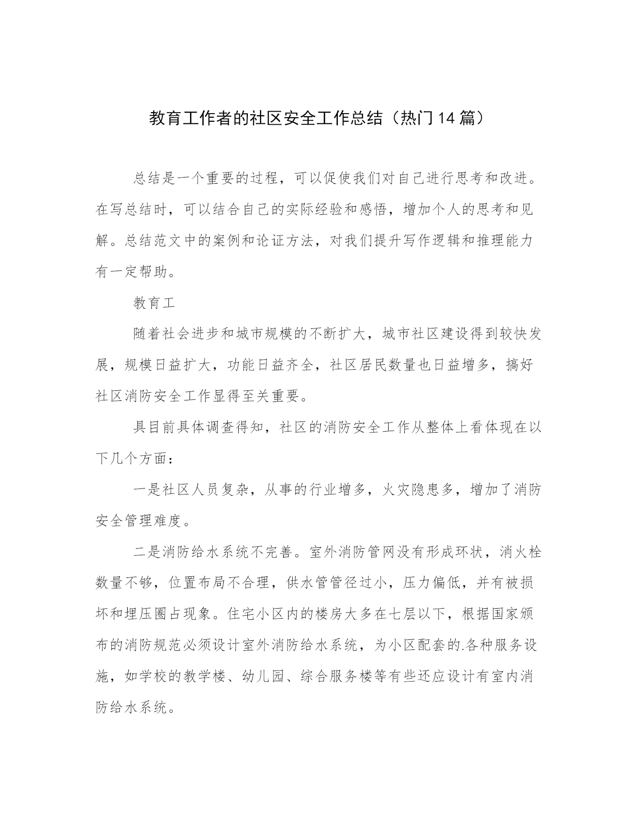 教育工作者的社区安全工作总结(热门14篇)总结是一个重要的过程,可以促使我们对自己进行思考和改进。在写总结时,可以结合自己的实际经验和感悟,增加个人的思考和见解。总结范文中的案例和论证方法,对我们提升写作逻辑和推理能力有一定帮助。教育工随着社会进步和城市规模的不断扩大,城市社区建设得到较快发展,规模日益扩大,功能日益齐全,社区居民数量也日益增多,搞好社区消防安全工作显得至关重要。具目前具体调查得知,社区的消防安全工作从整体上看体现在以下几个方面:一是社区人员复杂,从事的行业增多,火灾隐患多,增加了消防安全