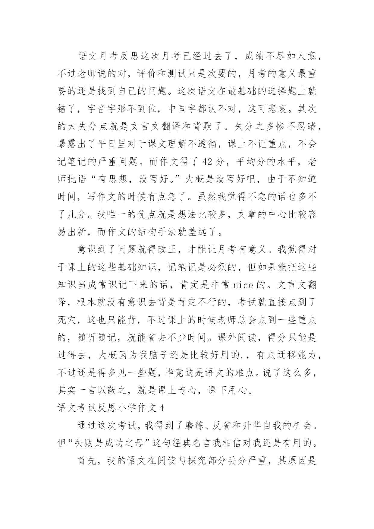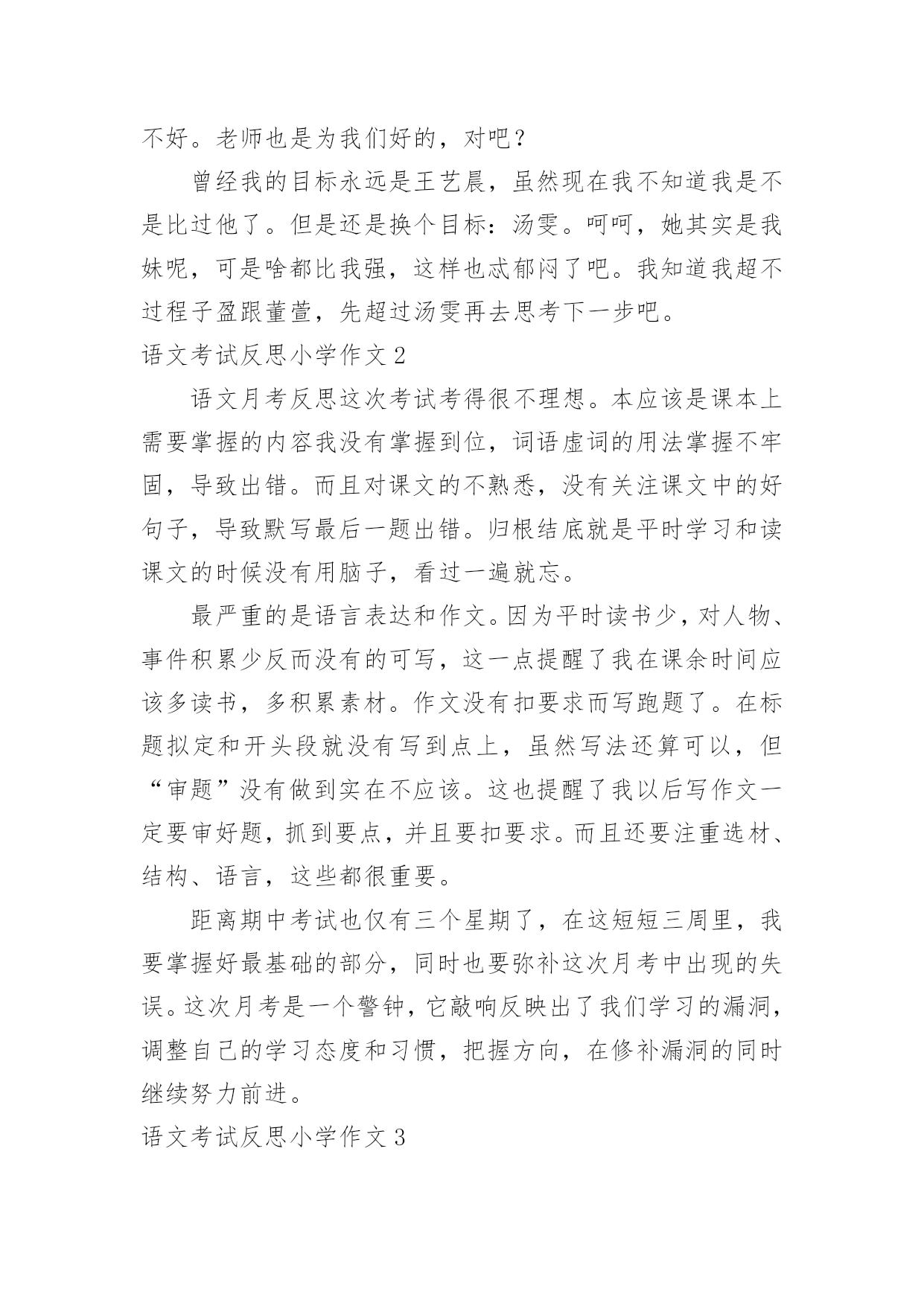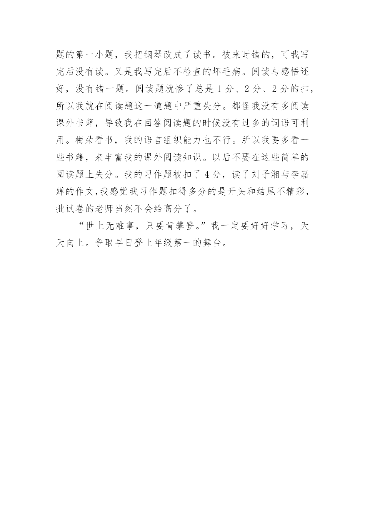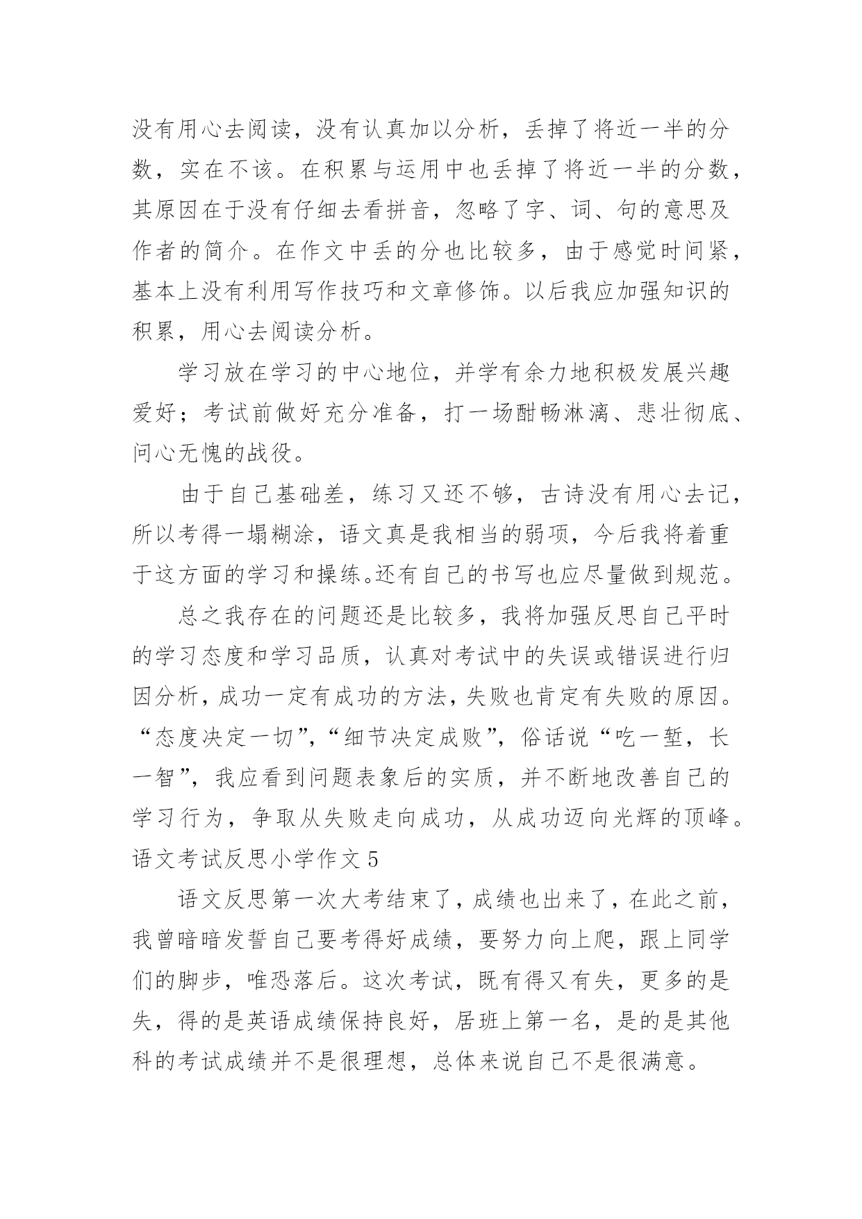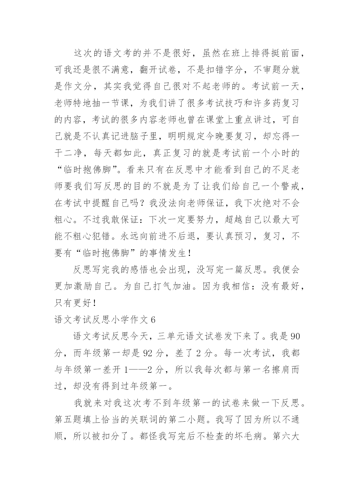 语文考试反思小学作文语文考试反思小学作文在生活、工作和学习中,大家都不可避免地会接触到作文吧,作文是一种言语活动,具有高度的综合性和创造性。你所见过的作文是什么样的呢?下面是小编收集整理的语文考试反思小学作文,仅供参考,希望能够帮助到大家。语文考试反思小学作文1语文反思今天我仍旧笑笑的,因为是新的一天,我要定下个新的目标,过去的终究是过去了,重要的是现在跟将来。想必周老师她肯定很难过吧,我语文竟然考的这么差。肯定也很难过,因为我太贪玩,整天跟他们“混”在一起。可是也谢谢你相信我,我是有自己的原则的,不管别人怎么看,我也不会违背的。我有自制力的,真的我们都互相鼓励要加油,不只是光玩。至少我是这样的。今天知道我们班语文没有得全年级第一,才得了第二,即使只跟第一相差0。04分,可是呢,这也算是个“不正常现象”。同学们太浮,说实在的呢,要不是老师们这么镇着我们,那整个班得“轻飘飘”到不行。同学们不理解,照样贪玩,所以我还是“请求”你们,不要看不到老师的辛苦跟难过。就像今天,张老师明明都感冒了,还扯着嗓子讲课,你们还不听,是不是太过分了呢?最后一个学期了呀,不努力怎么行呢?不要想着反正也不会留级,可是考不上好班风气也不好,慢慢的你也会变得不好。老师也是为我们好的,对吧?曾经我的目标永远是王艺晨,虽然现在我不知道我是不是比过他了。但是还是换个目标:汤雯。呵呵,她其实是我妹呢,可是啥都比我强,这样也忒郁闷了吧。我知道我超不过程子盈跟董萱,先超过汤雯再去思考下一步吧。语文考试反思小学作文2语文月考反思这次考试考得很不理想。本应该是课本上需要掌握的内容我没有掌握到位,词语虚词的用法掌握不牢固,导致出错。而且对课文的不熟悉,没有关注课文中的好句子,导致默写最后一题出错。归根结底就是平时学习和读课文的时候没有用脑子,看过一遍就忘。最严重的是语言表达和作文。因为平时读书少,对人物、事件积累少反而没有的可写,这一点提醒了我在课余时间应该多读书,多积累素材。作文没有扣要求而写跑题了。在标题拟定和开头段就没有写到点上,虽然写法还算可以,但“审题”没有做到实在不应该。这也提醒了我以后写作文一定要审好题,抓到要点,并且要扣要求。而且还要注重选材、结构、语言,这些都很重要。距离期中考试也仅有三个星期了,在这短短三周里,我要掌握好最基础的部分,同时也要弥补这次月考中出现的失误。这次月考是一个警钟,它敲响反映出了我们学习的漏洞,调整自己的学习态度和习惯,把握方向,在修补漏洞的同时继续努力前进。语文考试反思小学作文3语文月考反思这次月考已经过去了,成绩不尽如人意,不过老师说的对,评价和测试只是次要的,月考的意义最重要的还是找到自己的问题。这次语文在最基础的选择题上就错了,字音字形不到位,中国字都认不对,这可悲哀。其次的大失分点就是文言文翻译和背默了。失分之多惨不忍睹,暴露出了平日里对于课文理解不透彻,课上不记重点,不会记笔记的严重问题。而作文得了42分,平均分的水平,老师批语“有思想,没写好。”大概是没写好吧,由于不知道时间,写作文的时候有点急了。虽然我觉得不急的话也多不了几分。我唯一的优点就是想法比较多,文章的中心比较容易出新,而作文的结构手法就差远了。意识到了问题就得改正,才能让月考有意义。我觉得对于课上的这些基础知识,记笔记是必须的,但如果能把这些知识当成常识记下来的话,肯定是非常nice的。文言文翻译,根本就没有意识去背是肯定不行的,考试就直接点到了死穴,这也只能背,不过课上的时候老师总会点到一些重点的,随听随记,就能省去不少时间。课外阅读,得分只能是过得去,大概因为我脑子还是比较好用的.,有点迁移能力,不过还是得多见一些题,毕竟这是语文的难点。说了这么多,其实一言以蔽之,就是课上专心,课下用心。语文考试反思小学作文4通过这次考试,我得到了磨练、反省和升华自我的机会。但“失败是成功之母”这句经典名言我相信对我还是有用的。首先,我的语文在阅读与探究部分丢分严重,其原因是没有用心去阅读,没有认真加以分析,丢掉了将近一半的分数,实在不该。在积累与运用中也丢掉了将近一半的分数,其原因在于没有仔细去看拼音,忽略了字、词、句的意思及作者的简介。在作文中丢的分也比较多,由于感觉时间紧,基本上没有利用写作技巧和文章修饰。以后我应加强知识的积累,用心去阅读分析。学习放在学习的中心地位,并学有余力地积极发展兴趣爱好;考试前做好充分准备,打一场酣畅淋漓、悲壮彻底、问心无愧的战役。由于自己基础差,练习又还不够,古诗没有用心去记,所以考得一塌糊涂,语文真是我相当的弱项,今后我将着重于这方面的学习和操练。还有自己的书写也应尽量做到规范。总之我存在的问题还是比较多,我将加强反思自己平时的学习态度和学习品质,认真对考试中的失误或错误进行归因分析,成功一定有成功的方法,失败也肯定有失败的原