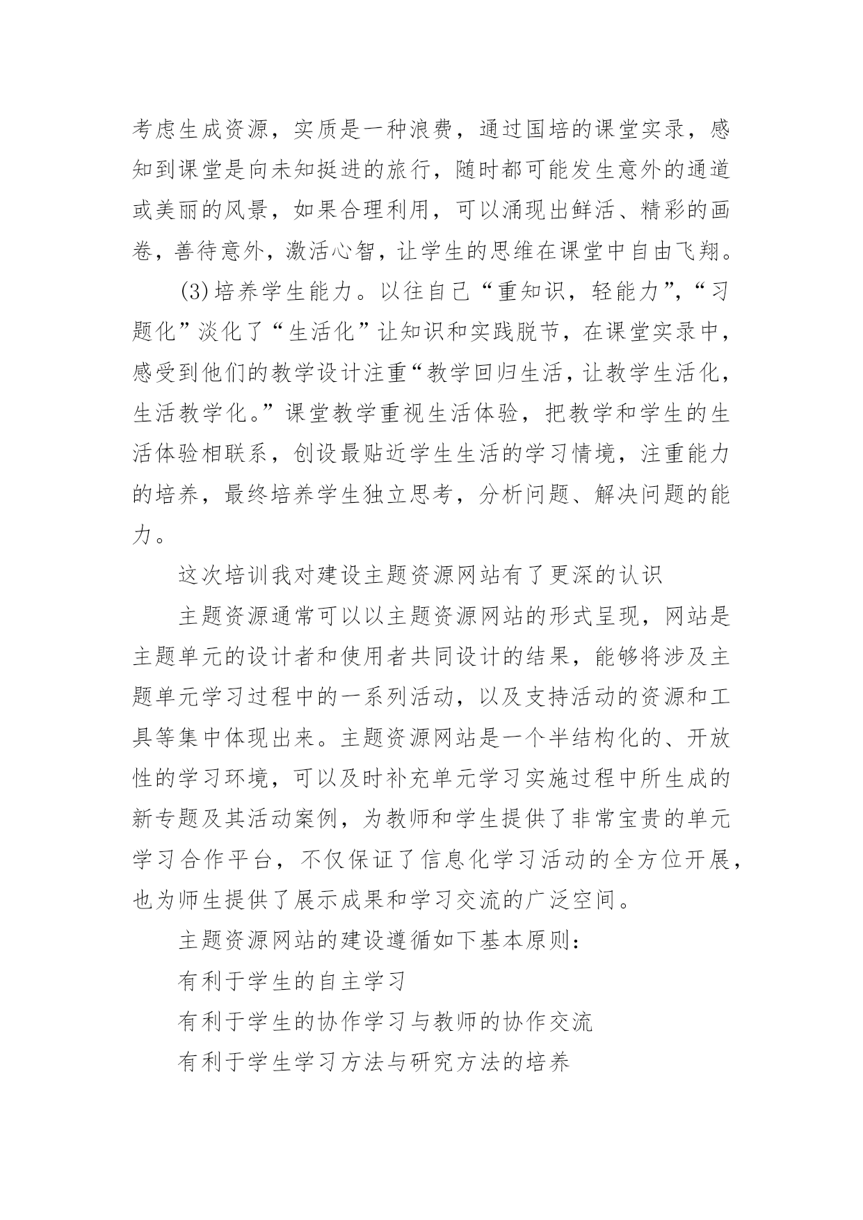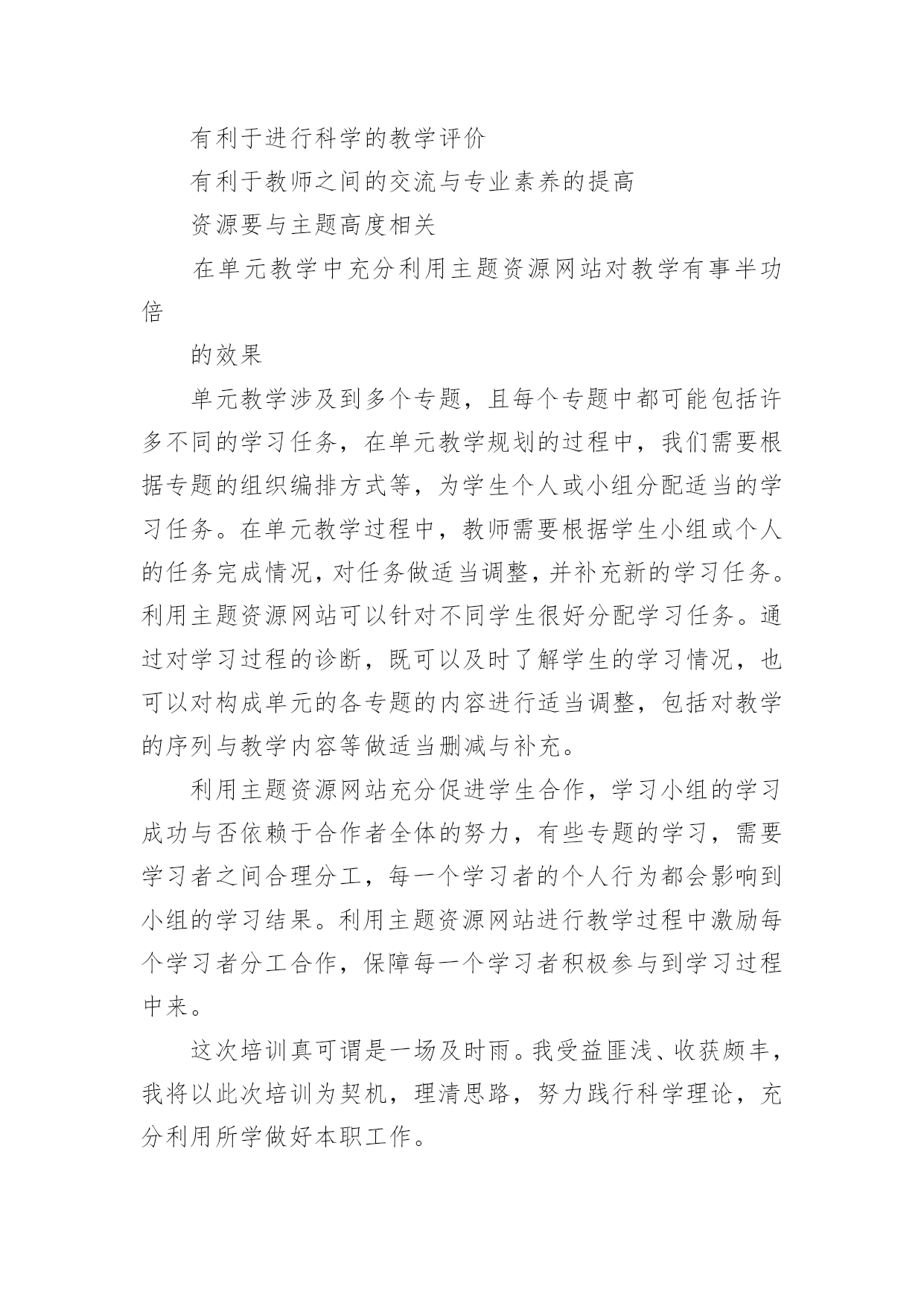 农村中小学教师教育技术应用能力远程培训总结能够参加这次培训,首先要感谢学校领导给了我这次很难得的机会,还要感谢各级辅导教师和所有工作人员,为我们精心安排的这次培训。通过培训,我对教育技术有了清晰的认识和深刻的理解,教学技术理论水平和运用能力得到了一定程度的提高。现将学习收获和感受总结如下:做为一名小学信息技术教师通过培训,我认识到教育技术培训不应成为教师挣学时、评职称的工具,而应是“新课改”理论的一种实践载体;教育技术是时代对教师的要求,是完善教师专业技能的基本要求。通过培训使我对优化教学设计能力进一步提高。以前的教学设计,只关心对知识的设计,而忽略了情感态度的关注,只会照搬教材的设计过程,不会设计符合学生发展的教案,只会注重课堂活动,淡化了情感和能力的培养。在国培的学习中,专家们专业科学的理论理念作指导,优秀老师的课堂实录做引领,还有辅导老师的辅导和同行们的交流互动,让我学会课改下的教学设计更应该关注学生的学情,生成资源的开发和调控,能力的培养和生成。(1)关注学生的学情。以往的课堂机械、沉闷,只注重知识的传授,国培让我知道更要注重身心的点化和人格的润泽。更要体现学科文化素养的精髓,唤醒学生的求知欲望。(2)捕捉生成资源。以往是遵循固定路线的教学,从不考虑生成资源,实质是一种浪费,通过国培的课堂实录,感知到课堂是向未知挺进的旅行,随时都可能发生意外的通道或美丽的风景,如果合理利用,可以涌现出鲜活、精彩的画卷,善待意外,激活心智,让学生的思维在课堂中自由飞翔。(3)培养学生能力。以往自己“重知识,轻能力”,“习题化”淡化了“生活化”让知识和实践脱节,在课堂实录中,感受到他们的教学设计注重“教学回归生活,让教学生活化,生活教学化。”课堂教学重视生活体验,把教学和学生的生活体验相联系,创设最贴近学生生活的学习情境,注重能力的培养,最终培养学生独立思考,分析问题、解决问题的能力。这次培训我对建设主题资源网站有了更深的认识主题资源通常可以以主题资源网站的形式呈现,网站是主题单元的设计者和使用者共同设计的结果,能够将涉及主题单元学习过程中的一系列活动,以及支持活动的资源和工具等集中体现出来。主题资源网站是一个半结构化的、开放性的学习环境,可以及时补充单元学习实施过程中所生成的新专题及其活动案例,为教师和学生提供了非常宝贵的单元学习合作平台,不仅保证了信息化学习活动的全方位开展,也为师生提供了展示成果和学习交流的广泛空间。主题资源网站的建设遵循如下基本原则:有利于学生的自主学习有利于学生的协作学习与教师的协作交流有利于学生学习方法与研究方法的培养有利于进行科学的教学评价有利于教师之间的交流与专业素养的提高资源要与主题高度相关在单元教学中充分利用主题资源网站对教学有事半功倍的效果单元教学涉及到多个专题,且每个专题中都可能包括许多不同的学习任务,在单元教学规划的过程中,我们需要根据专题的组织编排方式等,为学生个人或小组分配适当的学习任务。在单元教学过程中,教师需要根据学生小组或个人的任务完成情况,对任务做适当调整,并补充新的学习任务。利用主题资源网站可以针对不同学生很好分配学习任务。通过对学习过程的诊断,既可以及时了解学生的学习情况,也可以对构成单元的各专题的内容进行适当调整,包括对教学的序列与教学内容等做适当删减与补充。利用主题资源网站充分促进学生合作,学习小组的学习成功与否依赖于合作者全体的努力,有些专题的学习,需要学习者之间合理分工,每一个学习者的个人行为都会影响到小组的学习结果。利用主题资源网站进行教学过程中激励每个学习者分工合作,保障每一个学习者积极参与到学习过程中来。这次培训真可谓是一场及时雨。我受益匪浅、收获颇丰,我将以此次培训为契机,理清思路,努力践行科学理论,充分利用所学做好本职工作。