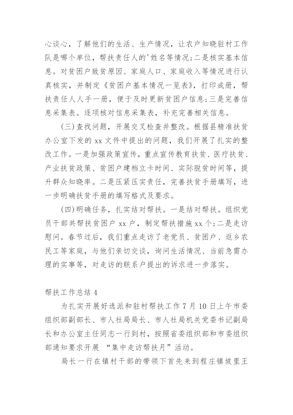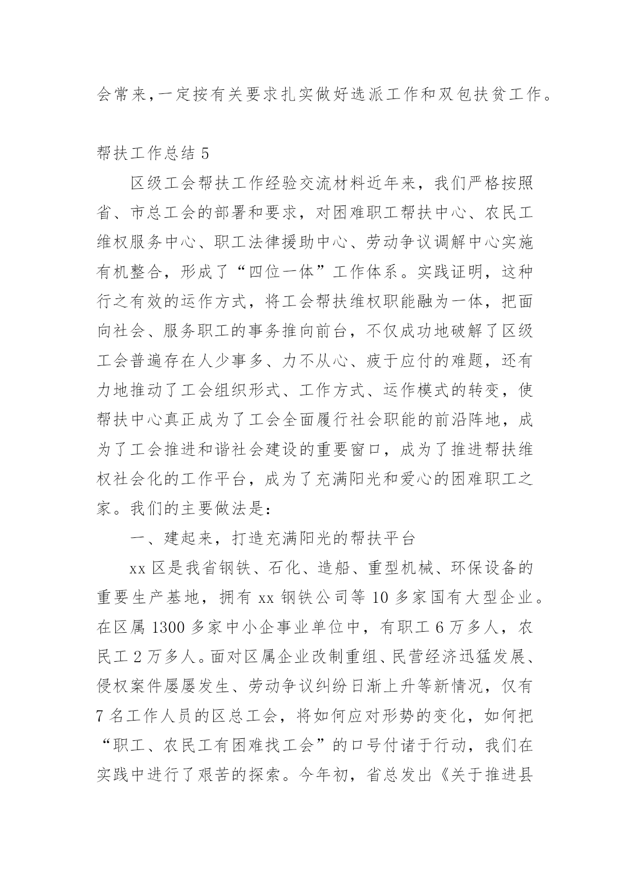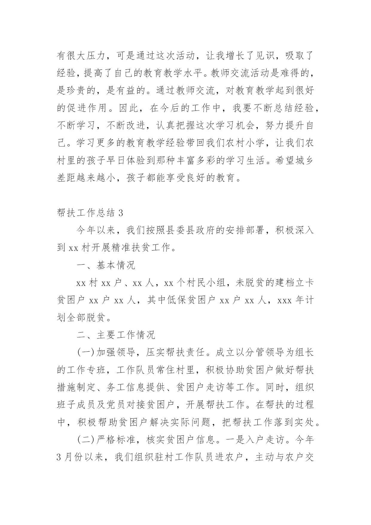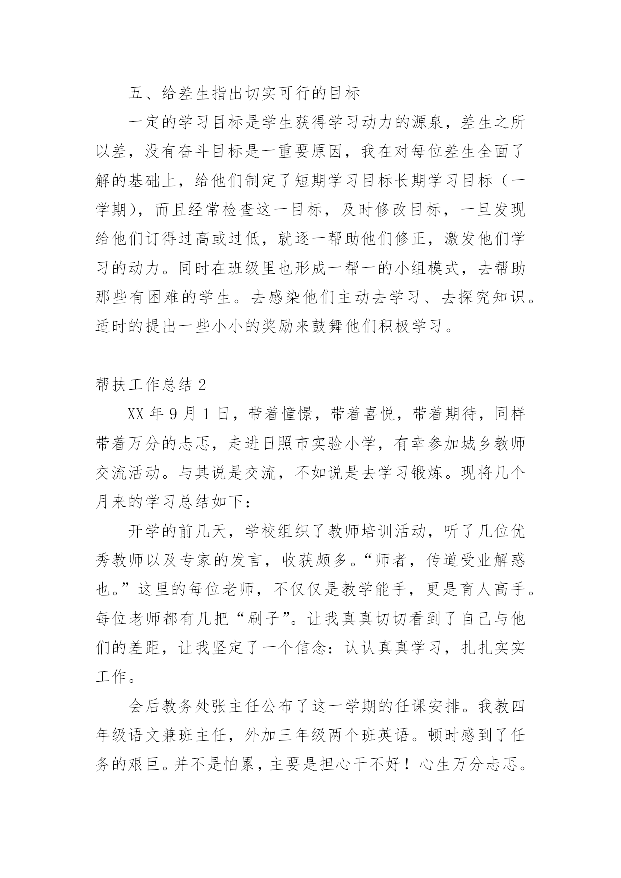 帮扶工作总结总结是指对某一阶段的工作、学习或思想中的经验或情况进行分析研究,做出带有规律性结论的书面材料,它可以使我们更有效率,不如立即行动起来写一份总结吧。那么你知道总结如何写吗?以下是小编整理的帮扶工作总结,欢迎阅读,希望大家能够喜欢。帮扶工作总结1本学期,学校继续举行了师生帮扶学困生、经济生、问题生活动,作为班主任帮助学生进步更是责无旁贷。通过内化教育,学生的学习动机、学习积极性大大地被调动起来,不管是优等生或是学困生、经济生、问题生,现已能明确自己的学习目的,不时为别人,而是为自己;学习风气较以前有明显的变化,以前是“要我学”,现在是“我要学”。通过不断的加强训练,老师帮助学生获取一个个小成功,学生的自信心、意志力得到很大的提高;现对这项工作总结如下:一、理解、尊重、宽容,善待差生教学成功与否,不仅取决于学习者的智力因素,还取决于他们情绪,态度、学习动力等,因此教师在任何时候要注意控制自己的情绪,不迁、怒、不急燥,切忌使用训斥,侮辱人格和伤害自尊心的语言;切忌向家长及班主任告状。这些差生在班级中常被学生鄙视,有些教师也指定他们是班级的“败类”,“包袱”。在社会上受到冷眼,在家也受到家长的训斥。心里有一种压抑感,在厌学情绪。自信心不强我主动采取适当的形式去栽培他们。二、具体问题具体分析在工作过程中能个体分析、群体分析,确立发展目标和措施,找出每个学生的'优点、缺点、潜在的优点、缺点,新的生长点。用发展的眼光看自己,分析别人。积极对待学生的每一个闪光点,施以恰如其分的鼓励性评价,争取科任老师热心配合,使得每一位学生能安心于课堂的学习,把学困生和问题生的厌学,逃学情绪抑制在一个最低点上。让经济生感受到大家对他得关爱,积极的去帮助他们,树立信心。三、对症下药,开发非智力因素差生同样具有进取心,自尊心,渴望进步。但他们由于各种因素造成了成绩差。作为教师对具体学生要作具体分析,各个突破,比如父母离异的学生,大多数较内向,自卑,性格孤僻,我主动给他们母亲般的爱,找他们谈心,了解他们的一些情况,并在生活上给予足够的关心。我还注意了解每位差生的情况。决不把他们当作包袱,不鄙视他们,不放度他们,了解他们特长,爱好,寻找他们身上的“闪光点”,多表扬鼓励增强他们的上进心。四、争取家长的配合:没有家长的积极配合,差生很难完成学习任务,我抓住家长一般都关心孩子学习这一特点,利用家长会,及家长来访常和他们联系,争取他们的合作,督促孩子做作业,这对差生成绩的提高有很大的作用。五、给差生指出切实可行的目标一定的学习目标是学生获得学习动力的源泉,差生之所以差,没有奋斗目标是一重要原因,我在对每位差生全面了解的基础上,给他们制定了短期学习目标长期学习目标(一学期),而且经常检查这一目标,及时修改目标,一旦发现给他们订得过高或过低,就逐一帮助他们修正,激发他们学习的动力。同时在班级里也形成一帮一的小组模式,去帮助那些有困难的学生。去感染他们主动去学习、去探究知识。适时的提出一些小小的奖励来鼓舞他们积极学习。帮扶工作总结2XX年9月1日,带着憧憬,带着喜悦,带着期待,同样带着万分的忐忑,走进日照市实验小学,有幸参加城乡教师交流活动。与其说是交流,不如说是去学习锻炼。现将几个月来的学习总结如下:开学的前几天,学校组织了教师培训活动,听了几位优秀教师以及专家的发言,收获颇多。“师者,传道受业解惑也。”这里的每位老师,不仅仅是教学能手,更是育人高手。每位老师都有几把“刷子”。让我真真切切看到了自己与他们的差距,让我坚定了一个信念:认认真真学习,扎扎实实工作。会后教务处张主任公布了这一学期的任课安排。我教四年级语文兼班主任,外加三年级两个班英语。顿时感到了任务的艰巨。并不是怕累,主要是担心干不好!心生万分忐忑。拿到学生名单的那一刻,傻眼了,四年级五班,64名学生,原来学生数的三倍,这该如何下手?开学第一天,忙得不可开交。主要对学校不熟悉,不知道该干什么,怎么干,什么时间干,去哪里干。好在学校老师都很热情,学生也很懂事,用了整整一个星期,对学校的一日常规渐渐摸索清楚。从学生入校,到晨读,到做操,到午练,到活动,到放学,每一时刻作为班主任,都必须跟上。为了尽快熟悉每位学生,我争取将更多的时间陪在孩子身边,找到他们原来班主任,向他们了解学生情况,从学习到家庭,不断地批阅孩子的作业,从作业发现孩子的特点......64名学生,居然用了一个多星期全部记住。这对于记性非常差的我来说,真的是不容易。慢慢地,一切步入正轨。我们开始了在一起的学习生活……庄严肃穆的升国旗仪式开始了,红领巾映红了一张张笑脸,我们在国旗下茁壮成长......我们的课间操朗朗的读书声开启了每一个美好的早上,我们的早读让每个早晨充满书香,填满智慧。愉快的课间活动充满了孩子的欢声笑语……我们的午练最多彩,看书