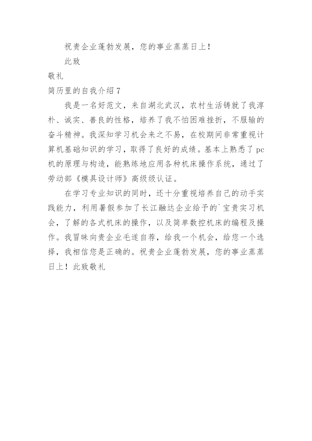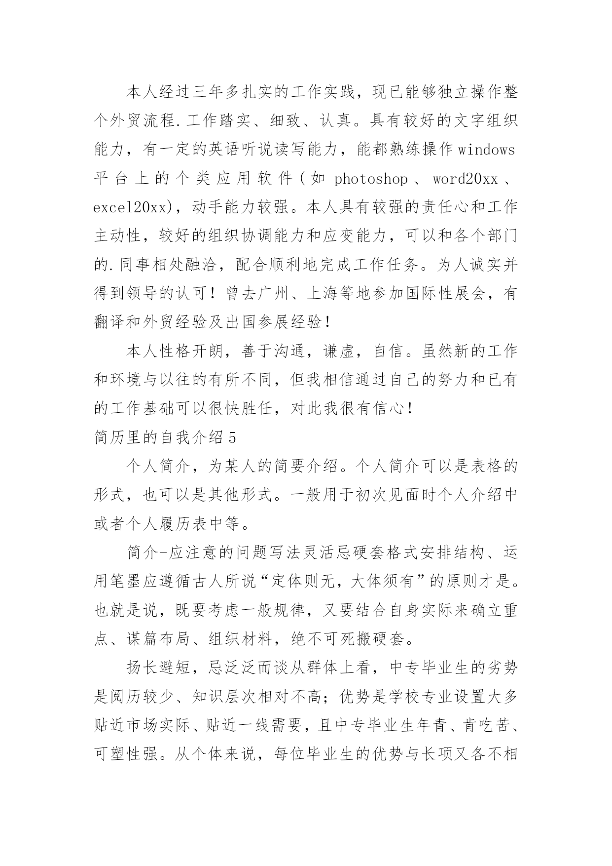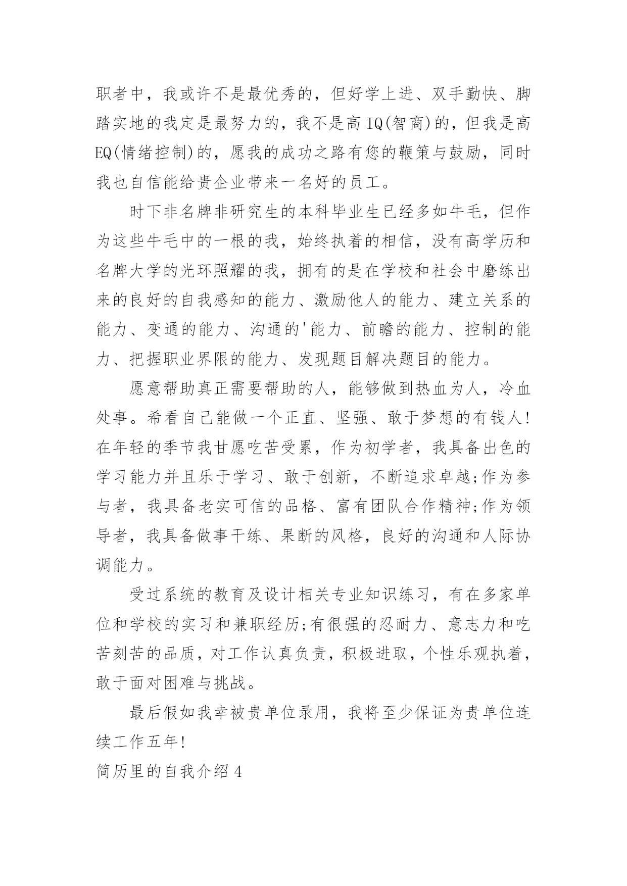 简历里的自我介绍简历里的自我介绍(合集7篇)光阴的迅速,一眨眼就过去了,没想到也到了自己找工作的时间,现在的你想必是在写简历吧。简历怎么写才能具有特色?下面是小编帮大家整理的简历里的自我介绍,欢迎大家分享。简历里的自我介绍1本人性格较为开朗,从大一时就经常外出结交来自不同国家的朋友,而且一直保持联系,有良好的与人交流的能力。暑假或者平时空余的时间,帮一个印度人兼职翻译或者出货柜,跑市场。也得到了客人的认可,客人回国以后,还会保持跟我联系。我接触的产品行业比较广泛,有文具,箱包,皮具,家具,香水装饰品,灯饰等,自学能力强,善于思考,吃苦耐劳,有良好的.沟通能力,善于与他人相处,富有团队合作精神,热爱运动。但人非完人,自己在某些方面还是有一定的不足,比如知识,社会经验等;不过我相信这些都是可以通过自己努力的学习来提高的,我也正朝着这个方向努力!学校的三年时间里,让我可以学到很多以前不懂的知识,无论是在知识能力,还是在个人素质修养方面都是令我受益匪浅,让我知道了,技术的重要性。我一定会通自己的努力,来严格要求自己,希望贵公司能够让我在这里工作,因为我有乐观向上,刻苦耐劳,不怕辛苦的学习和工作态度,也希望在其中能学更多的知识,能扩大视野,好好的抓住机会锻炼自己来追求梦想。让我在竞争中获益,向实际困难挑战,让我在坐折中成长,殷切地期望能够在你的公司领导下,能有更大的发展。简历里的自我介绍2在大学期间,我始终以提高自身的综合素质为目标,以自我的全面发展为努力方向,树立正确的人生观、价值观和世界观。为适应社会发展的需求,我认真学习各种专业知识,发挥自己的特长;挖掘自身的潜力,结合每年的'暑期社会实践机会,从而逐步提高了自己的学习能力和分析处理问题的能力以及一定的协调组织和管理能力。“学而知不足”是我大学期间学习和工作的动力,除了必修课之外,我还坚持自学了Office、Flash、Frontpage、photoshop等多种专业软件。学习之余,我还不忘坚持参加各种体育活动与社交活动。在思想行为方面,我作风优良、待人诚恳,能较好处理人际关际,处事冷静稳健,能合理地统筹安排生活中的事务。作为一名20xx年通信工程专业的大学,我所拥有的是年轻和知识。年轻也许意味着欠缺经验,但是年轻也意味着热情和活力,我自信能凭自己的能力和学识在毕业以后的工作和生活中克服各种困难,不断实现自我的人生价值和追求的目标。简历里的自我介绍3本人吃苦刻苦、具有良好的团队合作精神,在众多的求职者中,我或许不是最优秀的,但好学上进、双手勤快、脚踏实地的我定是最努力的,我不是高IQ(智商)的,但我是高EQ(情绪控制)的,愿我的成功之路有您的鞭策与鼓励,同时我也自信能给贵企业带来一名好的员工。时下非名牌非研究生的本科毕业生已经多如牛毛,但作为这些牛毛中的一根的我,始终执着的相信,没有高学历和名牌大学的光环照耀的我,拥有的是在学校和社会中磨练出来的良好的自我感知的能力、激励他人的能力、建立关系的能力、变通的能力、沟通的'能力、前瞻的能力、控制的能力、把握职业界限的能力、发现题目解决题目的能力。愿意帮助真正需要帮助的人,能够做到热血为人,冷血处事。希看自己能做一个正直、坚强、敢于梦想的有钱人!在年轻的季节我甘愿吃苦受累,作为初学者,我具备出色的学习能力并且乐于学习、敢于创新,不断追求卓越;作为参与者,我具备老实可信的品格、富有团队合作精神;作为领导者,我具备做事干练、果断的风格,良好的沟通和人际协调能力。受过系统的教育及设计相关专业知识练习,有在多家单位和学校的实习和兼职经历;有很强的忍耐力、意志力和吃苦刻苦的品质,对工作认真负责,积极进取,个性乐观执着,敢于面对困难与挑战。最后假如我幸被贵单位录用,我将至少保证为贵单位连续工作五年!简历里的自我介绍4本人经过三年多扎实的工作实践,现已能够独立操作整个外贸流程.工作踏实、细致、认真。具有较好的文字组织能力,有一定的英语听说读写能力,能都熟练操作windows平台上的个类应用软件(如photoshop、word20xx、excel20xx),动手能力较强。本人具有较强的责任心和工作主动性,较好的组织协调能力和应变能力,可以和各个部门的.同事相处融洽,配合顺利地完成工作任务。为人诚实并得到领导的认可!曾去广州、上海等地参加国际性展会,有翻译和外贸经验及出国参展经验!本人性格开朗,善于沟通,谦虚,自信。虽然新的工作和环境与以往的有所不同,但我相信通过自己的努力和已有的工作基础可以很快胜任,对此我很有信心!简历里的自我介绍5个人简介,为某人的简要介绍。个人简介可以是表格的形式,也可以是其他形式。一般用于初次见面时个人介绍中或者个人履历表中等。简介-应注意的问题写法灵活忌硬套格式安排结构、运用笔墨应遵循古人所说“定体则无,大体须有”的原则才是