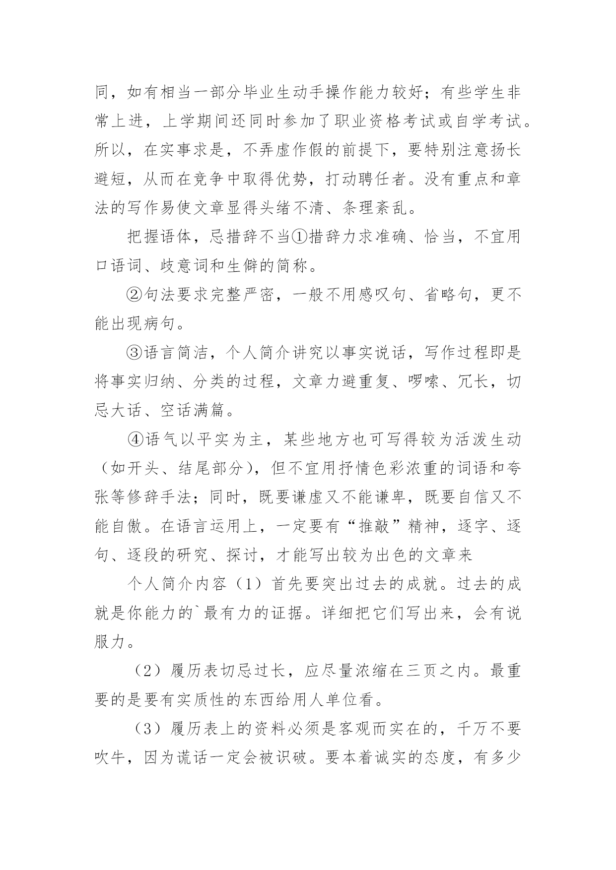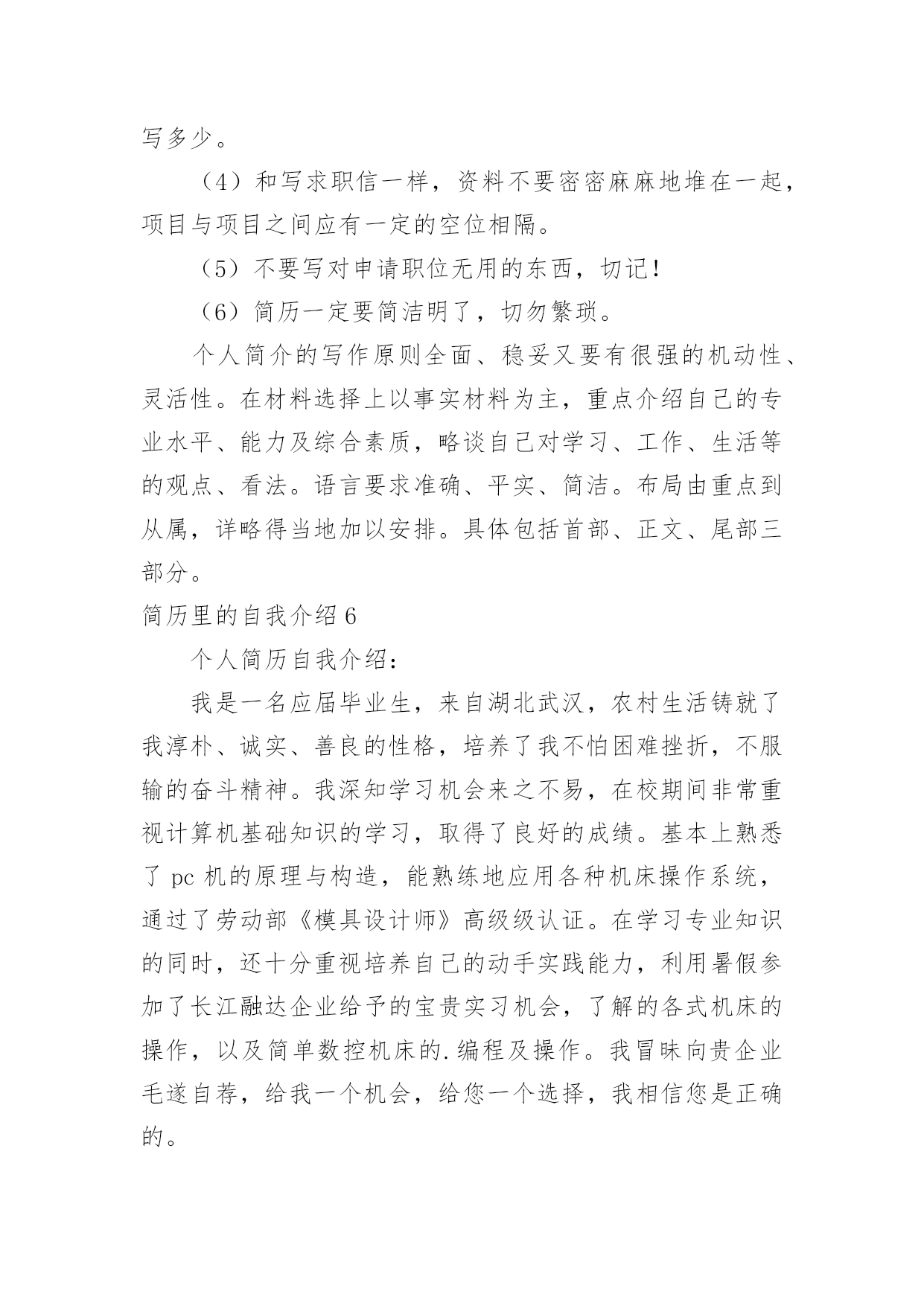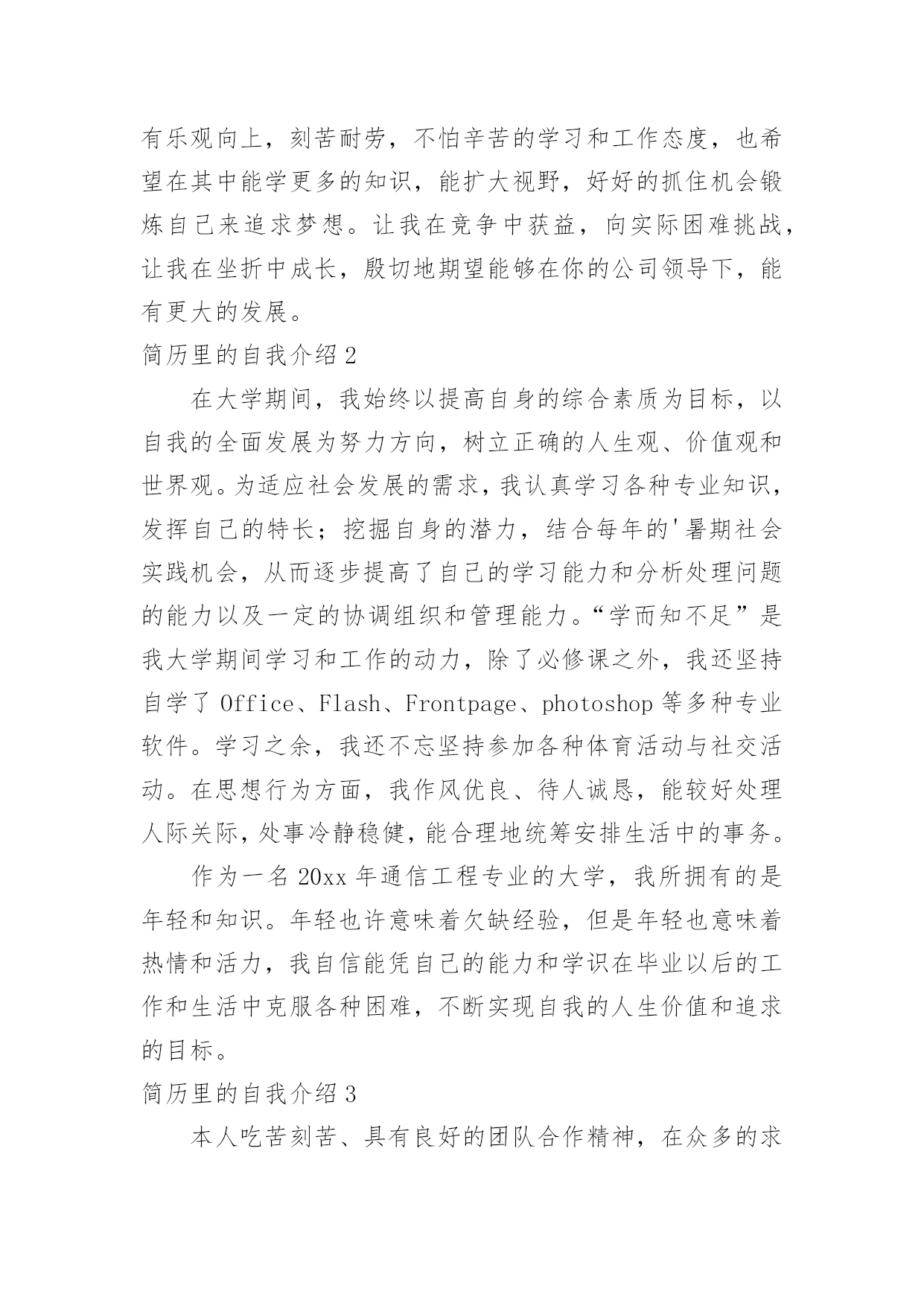 简历里的自我介绍简历里的自我介绍(合集7篇)光阴的迅速,一眨眼就过去了,没想到也到了自己找工作的时间,现在的你想必是在写简历吧。简历怎么写才能具有特色?下面是小编帮大家整理的简历里的自我介绍,欢迎大家分享。简历里的自我介绍1本人性格较为开朗,从大一时就经常外出结交来自不同国家的朋友,而且一直保持联系,有良好的与人交流的能力。暑假或者平时空余的时间,帮一个印度人兼职翻译或者出货柜,跑市场。也得到了客人的认可,客人回国以后,还会保持跟我联系。我接触的产品行业比较广泛,有文具,箱包,皮具,家具,香水装饰品,灯饰等,自学能力强,善于思考,吃苦耐劳,有良好的.沟通能力,善于与他人相处,富有团队合作精神,热爱运动。但人非完人,自己在某些方面还是有一定的不足,比如知识,社会经验等;不过我相信这些都是可以通过自己努力的学习来提高的,我也正朝着这个方向努力!学校的三年时间里,让我可以学到很多以前不懂的知识,无论是在知识能力,还是在个人素质修养方面都是令我受益匪浅,让我知道了,技术的重要性。我一定会通自己的努力,来严格要求自己,希望贵公司能够让我在这里工作,因为我有乐观向上,刻苦耐劳,不怕辛苦的学习和工作态度,也希望在其中能学更多的知识,能扩大视野,好好的抓住机会锻炼自己来追求梦想。让我在竞争中获益,向实际困难挑战,让我在坐折中成长,殷切地期望能够在你的公司领导下,能有更大的发展。简历里的自我介绍2在大学期间,我始终以提高自身的综合素质为目标,以自我的全面发展为努力方向,树立正确的人生观、价值观和世界观。为适应社会发展的需求,我认真学习各种专业知识,发挥自己的特长;挖掘自身的潜力,结合每年的'暑期社会实践机会,从而逐步提高了自己的学习能力和分析处理问题的能力以及一定的协调组织和管理能力。“学而知不足”是我大学期间学习和工作的动力,除了必修课之外,我还坚持自学了Office、Flash、Frontpage、photoshop等多种专业软件。学习之余,我还不忘坚持参加各种体育活动与社交活动。在思想行为方面,我作风优良、待人诚恳,能较好处理人际关际,处事冷静稳健,能合理地统筹安排生活中的事务。作为一名20xx年通信工程专业的大学,我所拥有的是年轻和知识。年轻也许意味着欠缺经验,但是年轻也意味着热情和活力,我自信能凭自己的能力和学识在毕业以后的工作和生活中克服各种困难,不断实现自我的人生价值和追求的目标。简历里的自我介绍3本人吃苦刻苦、具有良好的团队合作精神,在众多的求职者中,我或许不是最优秀的,但好学上进、双手勤快、脚踏实地的我定是最努力的,我不是高IQ(智商)的,但我是高EQ(情绪控制)的,愿我的成功之路有您的鞭策与鼓励,同时我也自信能给贵企业带来一名好的员工。时下非名牌非研究生的本科毕业生已经多如牛毛,但作为这些牛毛中的一根的我,始终执着的相信,没有高学历和名牌大学的光环照耀的我,拥有的是在学校和社会中磨练出来的良好的自我感知的能力、激励他人的能力、建立关系的能力、变通的能力、沟通的'能力、前瞻的能力、控制的能力、把握职业界限的能力、发现题目解决题目的能力。愿意帮助真正需要帮助的人,能够做到热血为人,冷血处事。希看自己能做一个正直、坚强、敢于梦想的有钱人!在年轻的季节我甘愿吃苦受累,作为初学者,我具备出色的学习能力并且乐于学习、敢于创新,不断追求卓越;作为参与者,我具备老实可信的品格、富有团队合作精神;作为领导者,我具备做事干练、果断的风格,良好的沟通和人际协调能力。受过系统的教育及设计相关专业知识练习,有在多家单位和学校的实习和兼职经历;有很强的忍耐力、意志力和吃苦刻苦的品质,对工作认真负责,积极进取,个性乐观执着,敢于面对困难与挑战。最后假如我幸被贵单位录用,我将至少保证为贵单位连续工作五年!简历里的自我介绍4本人经过三年多扎实的工作实践,现已能够独立操作整个外贸流程.工作踏实、细致、认真。具有较好的文字组织能力,有一定的英语听说读写能力,能都熟练操作windows平台上的个类应用软件(如photoshop、word20xx、excel20xx),动手能力较强。本人具有较强的责任心和工作主动性,较好的组织协调能力和应变能力,可以和各个部门的.同事相处融洽,配合顺利地完成工作任务。为人诚实并得到领导的认可!曾去广州、上海等地参加国际性展会,有翻译和外贸经验及出国参展经验!本人性格开朗,善于沟通,谦虚,自信。虽然新的工作和环境与以往的有所不同,但我相信通过自己的努力和已有的工作基础可以很快胜任,对此我很有信心!简历里的自我介绍5个人简介,为某人的简要介绍。个人简介可以是表格的形式,也可以是其他形式。一般用于初次见面时个人介绍中或者个人履历表中等。简介-应注意的问题写法灵活忌硬套格式安排结构、运用笔墨应遵循古人所说“定体则无,大体须有”的原则才是