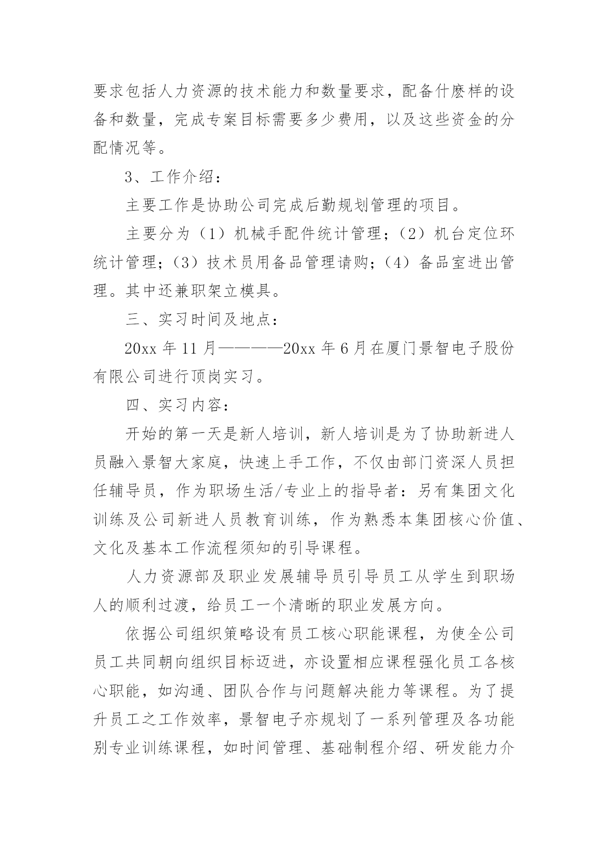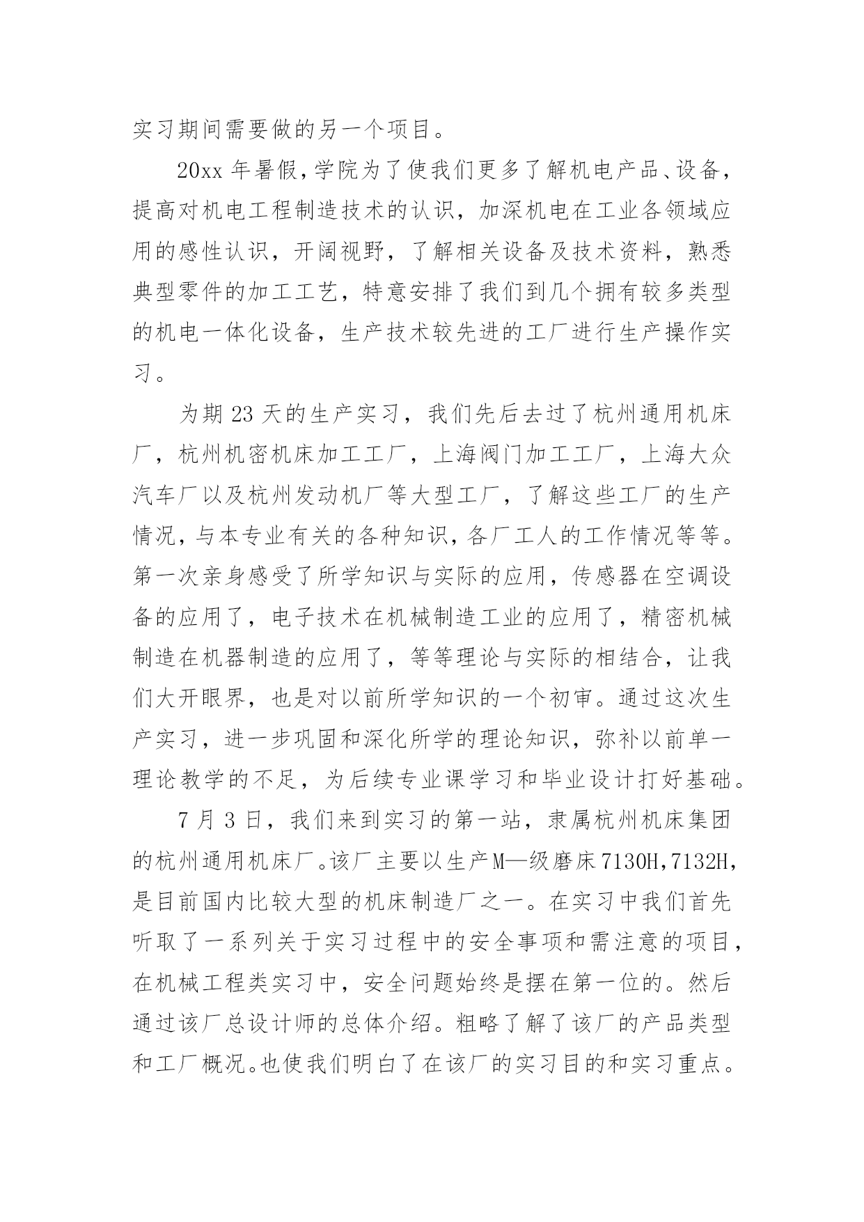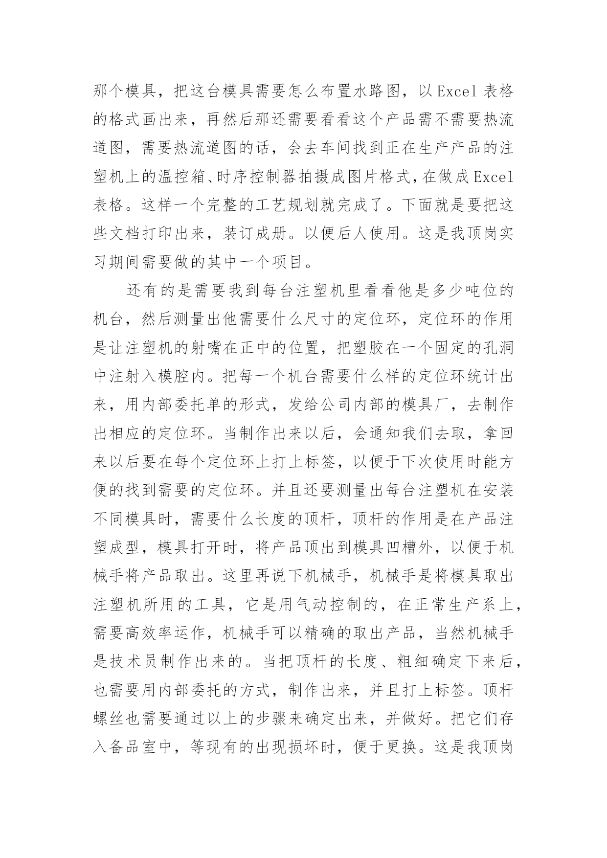 机电类实习报告关于机电类实习报告随着人们自身素质提升,越来越多的事务都会使用到报告,报告成为了一种新兴产业。相信很多朋友都对写报告感到非常苦恼吧,以下是小编帮大家整理的关于机电类实习报告,供大家参考借鉴,希望可以帮助到有需要的朋友。关于机电类实习报告1前言:机电一体化专业是一个宽口径专业,适应范围很广,在校期间除学习各种机械制造和原理、电工电子、计算机技术、控制技术等理论知识外,还将参加各种技能培训和国家职业资格证书考试,充分体现重视技能培养的特点。随着计算机技术的迅猛发展和广泛应用,机电一体化技术获得前所未有的发展,成为一门综合计算机与信息技术、自动控制技术、传动技术和机械技术等交叉的系统技术,目前正向光机电一体化技术方向发展,应用范围愈来愈广。一、实习目的:1、通过工作实习加深了对机电一体化专业认识,巩固了专业思想,激发了学习热情。2、熟悉公司工作流程、专业涉及的工作要领。为以后走上更好的工作岗位积累一定的知识和经验。3、开拓我们的视野,增强了专业知识,锻炼了独立工作的能力,拓展了更广的知识和业务。通过现场的工作实习和企业员工的交流指导,理论联系实际,把所学的理论知识加以印证、深化、巩固和充实,培养分析、解决工程实际问题的能力,为后继的学习以及其他方面的深入了解打下了坚实的基础。二、实习情况介绍:1、公司简介:岗位介绍:专案是一个特殊的将被完成的有限任务,它是在一定的时间内、满足一系列特定目标的多项相关工作的总称。专案是台湾惯用名词,在国内专案相当于项目。2、专案包括三层含义:(1)专案是一项有待完成的任务,有特定的环境与要求;(2)在一定组织结构内,利用有限的资源(包括人力、物力和财力等)在规定的时间内完成任务;(3)任务是满足一定性能、质量、数量和技术指标等要求。对照IT企业的工作内容,基本都可以称之爲专案,因此对这些工作的管理,均可以采用专案管理的方法。专案就是要完成的一个具体任务,一旦这个任务完成,这个专案的使命就完成了。专案受到周围环境的影响,而且环境对专案的执行有一定的约束,例如考虑到和其他专案的相容,必须采用的技术和开发理念等等。为了完成专案的任务,必须要组建一支团队,团队成员分工合作以完成各个分目标,进而实现总体目标。专案对资源有一定的要求,这些要求包括人力资源的技术能力和数量要求,配备什麽样的设备和数量,完成专案目标需要多少费用,以及这些资金的分配情况等。3、工作介绍:主要工作是协助公司完成后勤规划管理的项目。主要分为(1)机械手配件统计管理;(2)机台定位环统计管理;(3)技术员用备品管理请购;(4)备品室进出管理。其中还兼职架立模具。三、实习时间及地点:20xx年11月————20xx年6月在厦门景智电子股份有限公司进行顶岗实习。四、实习内容:开始的第一天是新人培训,新人培训是为了协助新进人员融入景智大家庭,快速上手工作,不仅由部门资深人员担任辅导员,作为职场生活/专业上的指导者:另有集团文化训练及公司新进人员教育训练,作为熟悉本集团核心价值、文化及基本工作流程须知的引导课程。人力资源部及职业发展辅导员引导员工从学生到职场人的顺利过渡,给员工一个清晰的职业发展方向。依据公司组织策略设有员工核心职能课程,为使全公司员工共同朝向组织目标迈进,亦设置相应课程强化员工各核心职能,如沟通、团队合作与问题解决能力等课程。为了提升员工之工作效率,景智电子亦规划了一系列管理及各功能别专业训练课程,如时间管理、基础制程介绍、研发能力介绍及英语能力提升课程,以加强员工之工作技能。这一天的时间就是在课程的学习以及考试中度过的,在下午的时候,公司来人分配我们这些新员工,我被分配到P13成型生计部门,按正常情况下,晚上是需要加班的,不过因为我们是新来的员工,提前下班了,明天再去被分配到的部门报道。终于到了正式工作的时候了,我到了成型生计部门,在这里我知道了成型生计部门的作用,主要是控制注塑机,制作出想要的产品。注塑成型是利用塑胶原料受热后成为熔融状态流体利用注射成型机的压力、速度,将熔融塑胶注射入预先设计好的紧闭模腔内,经过冷却后而得到所需的制品的过程。我的老大带我熟悉了一起工作的同事,然后让我认识工作中需要知道的知识。这让我学到了很多。自此我就进入了这个大家庭里。作为一个专案除了要了解自己所做的工作流程外,还要加强自己的责任心只有这样才能更好的做出客户想要达到的产品要求。我一般做的是把设置好的注塑机的参数做成图片,将每一台模具需要什么样的成型条件,记录下来,装订成册,以便于后来人能够更快的上手操作。我会每天看看都有那些新的产品需要做出工艺参数文档来,如果有要做的,那么我会去车间找到那台正在生产产品的注塑机,拍摄下它的参数来,再回到办公室里把他做成Excel表格的格式保存下来。做出工艺参数文档以后,还要看看这个产品用用的是