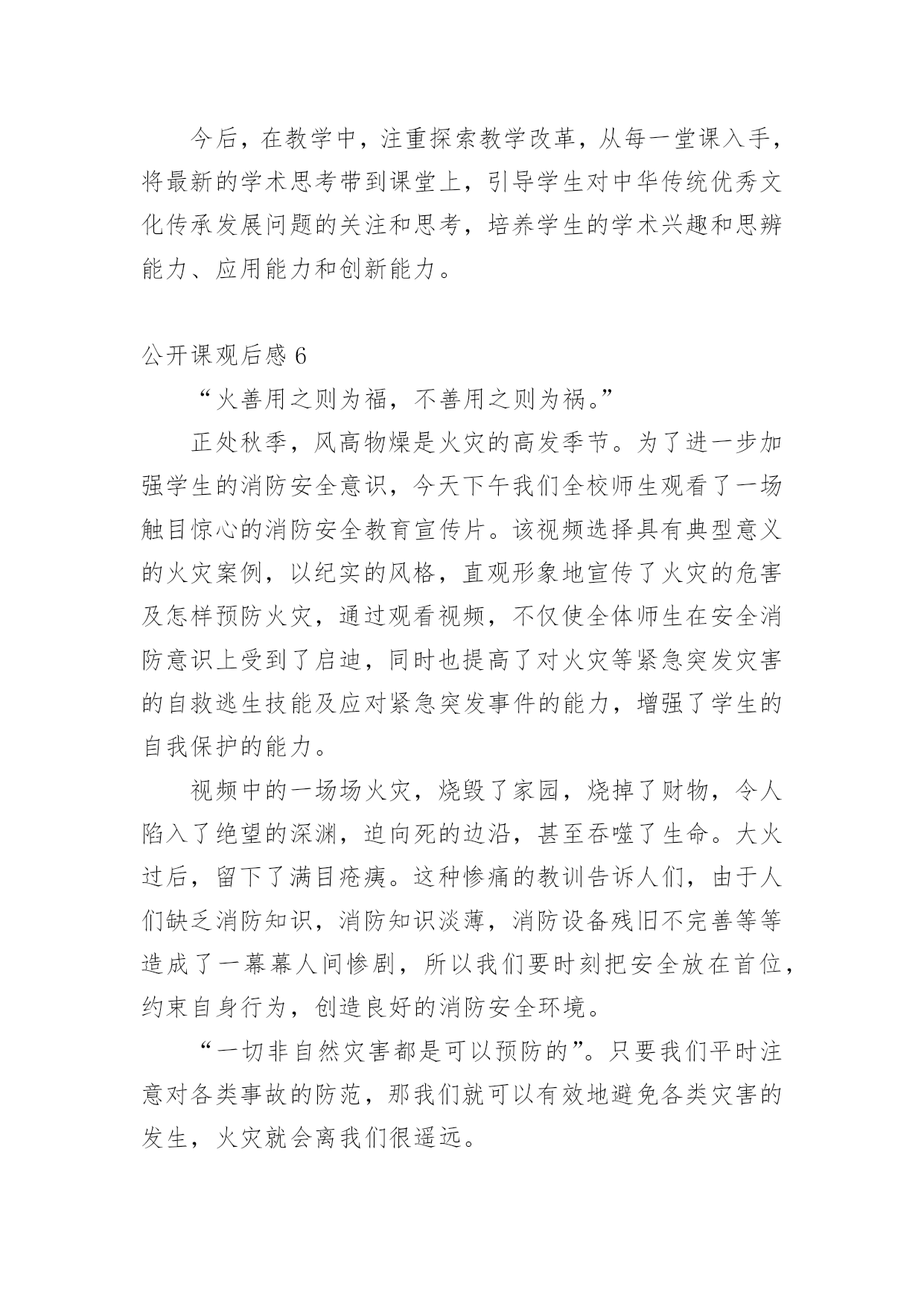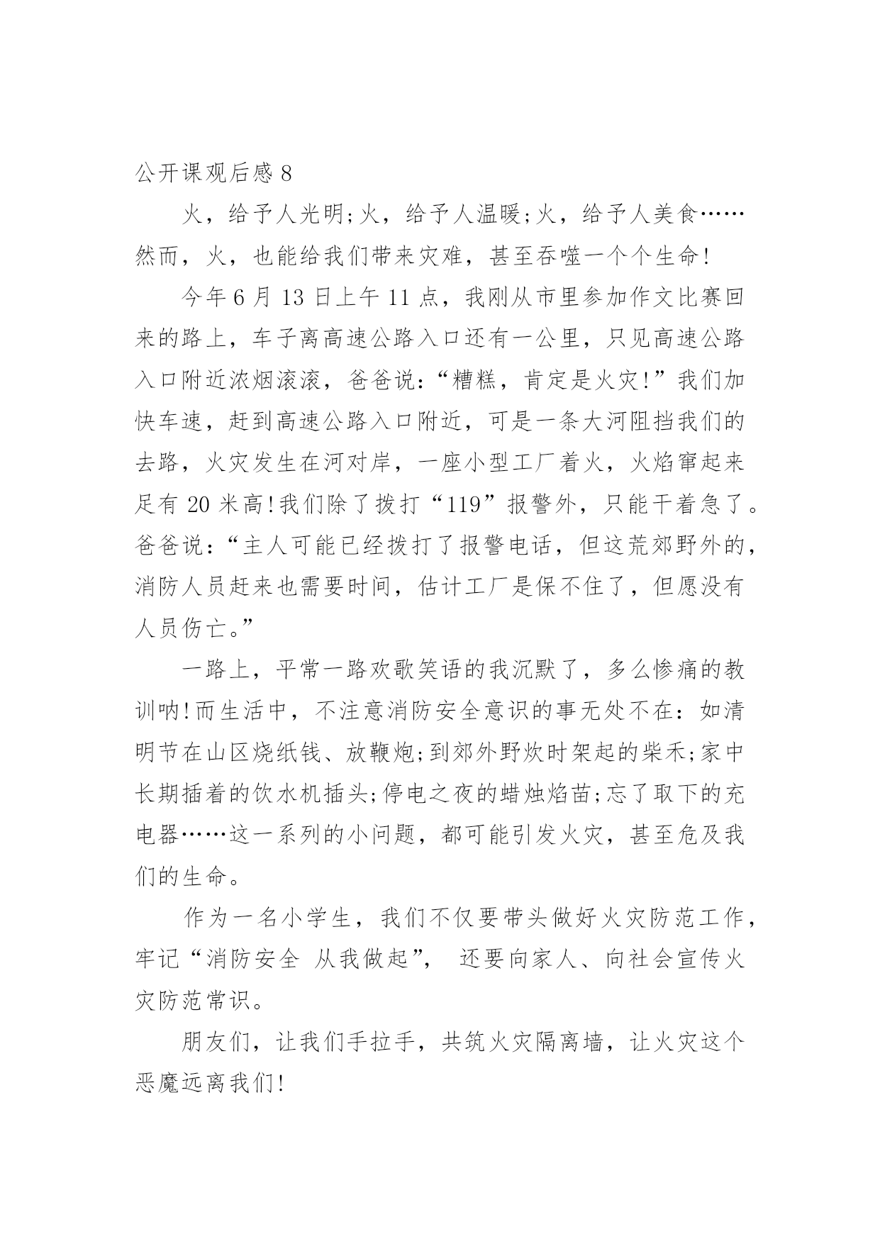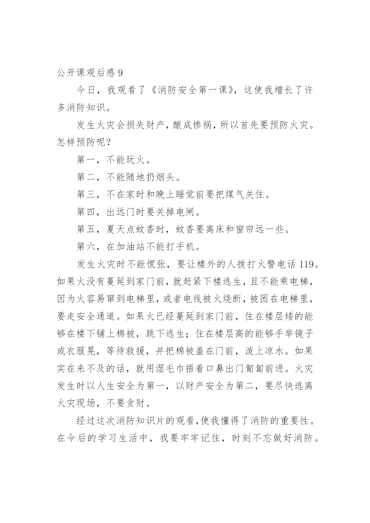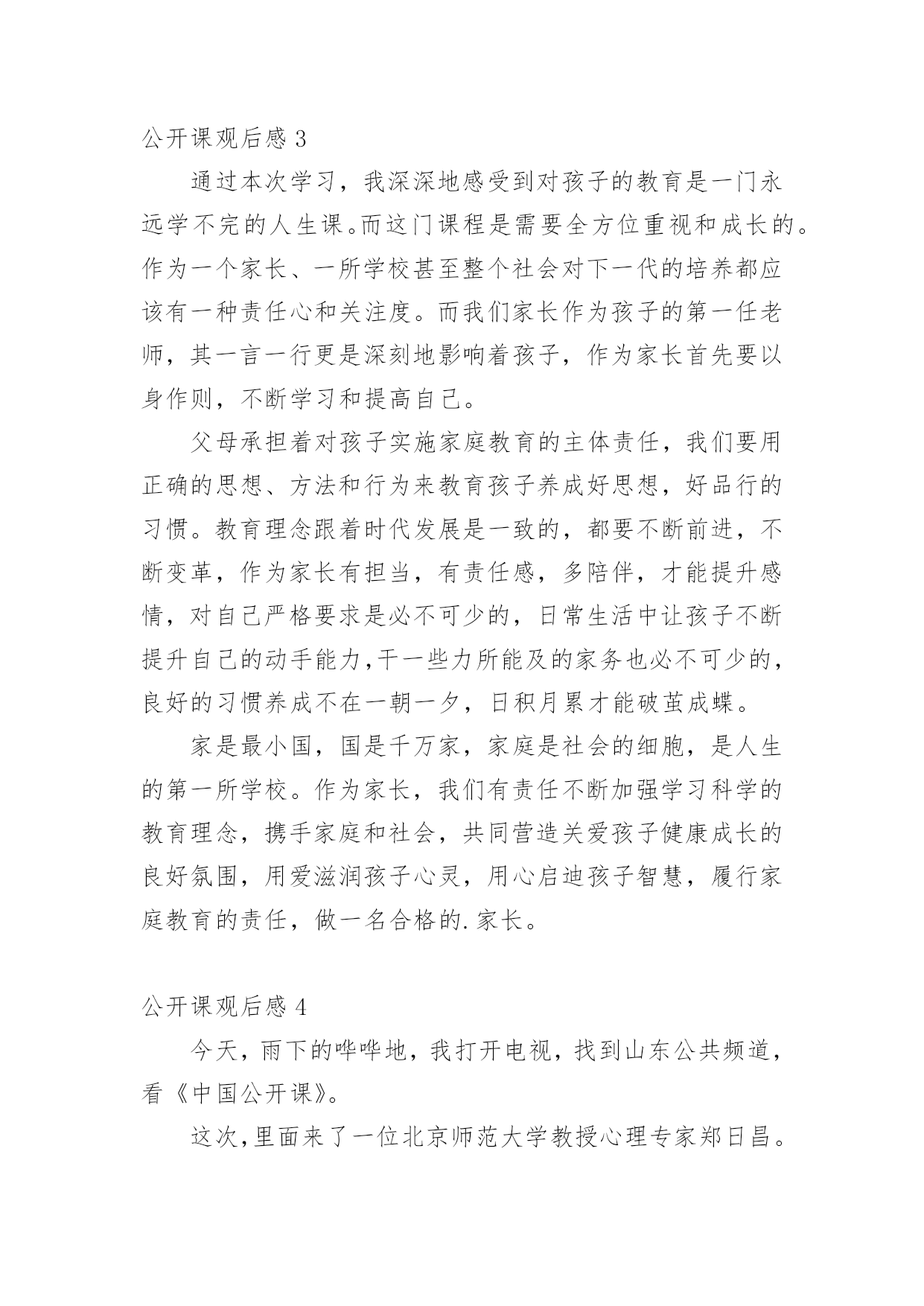 公开课观后感看完一部作品后,这次观看让你有什么领悟呢?是时候写一篇观后感好好记录一下了。那要怎么写好观后感呢?以下是小编帮大家整理的公开课观后感,欢迎阅读与收藏。公开课观后感1看完了消防安全网络公开课后,我被吓住了。原来生活中的某个细节都可能导致严重的火灾,给人带来损失与伤害。这本书里讲了火猛于虎,我觉得很对,所以从现在开始,我要减少我家里发生火灾的可能性。视频里还讲了许多有关火灾的案例;上面写的案例让我呆住了,因为有一场火灾竟是一支小小的香烟引起的,小小的香烟竟让一家三口的房间烧成了一片废墟,真让人害怕呀!当然,书上也教了我们预防和扑灭火的方法:如果是油锅起火的话就要马上盖上锅盖。从视频里还学到了许多课堂上老师没有教过的知识:火虽然可以为我们带来很多的方便,很多的轻松与很多的幸福,但在这温和的一面的背后还隐藏着一张狰狞可怕的面容,这张面容可以让我们的幸福快乐在一瞬间消失不见,就像在做梦一样。火灾真是非常可怕的,我要让火不给我们造成伤害有什么办法呢?有了,就是要利用好火,让它只帮助我们不伤害我们,让它把那“坏脾气”改一改。还要在家里装上灭火器,做好准备。只要我们预防,就不会发生太多的火灾。公开课观后感2周日,我和爸爸妈妈看了教育心理学专家郑日昌教授主讲的《学习的方法和习惯》郑教授与学生和家长面对面交流,解决学生和家长的困惑。让电视机前的我们学到了很多东西。每个家长和同学都想有个好的成绩。要想有个好的成绩,要有好的学习方法和习惯;好的家庭环境;好的心理学习氛围等。家庭和睦就是一个良好的学习环境,如果家庭不和睦,孩子就会受到影响,形不成一个良好的心理学习氛围,学习成绩就上不去。平时,爸爸妈妈要多鼓励我们,培养我们学习的积极性,在学习中得到快乐。如果哪门功课学得不好,就让爸爸妈妈帮着补习。在学习新的知识时,也要把旧的知识复习一遍。养成自我学习的好习惯,不要让爸爸妈妈督促强迫着去学习。如果考试考得不好,爸爸妈妈也不能指责我们,要和我们讨论讨论,和我们一起找原因。让我们自己知道哪儿不行,让我们主动改正。爸爸妈妈要学会倾听,能跟我们很好的对话。做完作业要自己检查,这样就知道错的地方在哪里,加深了印象以后就不会再犯错了,这样可以培养我们的细心。郑教授讲的很详细生动,通过这次观看节目,对照我自身日常学习的方法和习惯,找到了差别不足,以后我要改掉不良的学习方法和习惯,争取把我的成绩提高。公开课观后感3通过本次学习,我深深地感受到对孩子的教育是一门永远学不完的人生课。而这门课程是需要全方位重视和成长的。作为一个家长、一所学校甚至整个社会对下一代的培养都应该有一种责任心和关注度。而我们家长作为孩子的第一任老师,其一言一行更是深刻地影响着孩子,作为家长首先要以身作则,不断学习和提高自己。父母承担着对孩子实施家庭教育的主体责任,我们要用正确的思想、方法和行为来教育孩子养成好思想,好品行的习惯。教育理念跟着时代发展是一致的,都要不断前进,不断变革,作为家长有担当,有责任感,多陪伴,才能提升感情,对自己严格要求是必不可少的,日常生活中让孩子不断提升自己的动手能力,干一些力所能及的家务也必不可少的,良好的习惯养成不在一朝一夕,日积月累才能破茧成蝶。家是最小国,国是千万家,家庭是社会的细胞,是人生的第一所学校。作为家长,我们有责任不断加强学习科学的教育理念,携手家庭和社会,共同营造关爱孩子健康成长的良好氛围,用爱滋润孩子心灵,用心启迪孩子智慧,履行家庭教育的责任,做一名合格的.家长。公开课观后感4今天,雨下的哗哗地,我打开电视,找到山东公共频道,看《中国公开课》。这次,里面来了一位北京师范大学教授心理专家郑日昌。一位家长提出了问题:在同一个班的学生,为何成绩有好有坏?郑老师说,是因为孩子的视觉,听觉、动觉与先天和后天。当然,先天的孩子不一定就是天才,硕士;后天的孩子也不一定是蠢材,笨蛋。但孩子的视觉,听觉与动觉却不一样,有的动觉好,有的听觉好。也有许多家长在意孩子的智力,“孩子之间的智力没有多少差距,”这就是郑老师给的答案,“想让孩子的智力高起来,要家庭和睦,孩子要刻苦认真。”“孩子成绩下降的因素有这些:不与孩子沟通、孩子学习马虎、不细心、不总结错误。”有了错误,就要改正,一个家长问:“提高孩子学习的方法有哪些?”郑老师的答案是:1、自我管理2、合理安排时间3、预习、复习4、下课多放松5、做笔记。接着,郑老师又给我们讲了扩散思维法和记忆力慢与快。在这短短的几十分钟中,我知道了孩子学习成绩与父母有着密切的关系,父母只有多与孩子沟通才能了解孩子,才能找出原因。同学们,我们是祖国的顶梁柱,我们都是祖国一个个希望的种子,让我们好好学习,扎根长出枝叶和花苞,在祖国需要我们时,这花就会怒放,扎下好地基,才有欣欣向荣的景象!公开课观后感54月12日晚北京电视台播出了《春