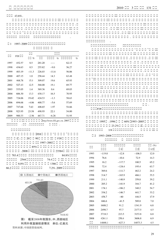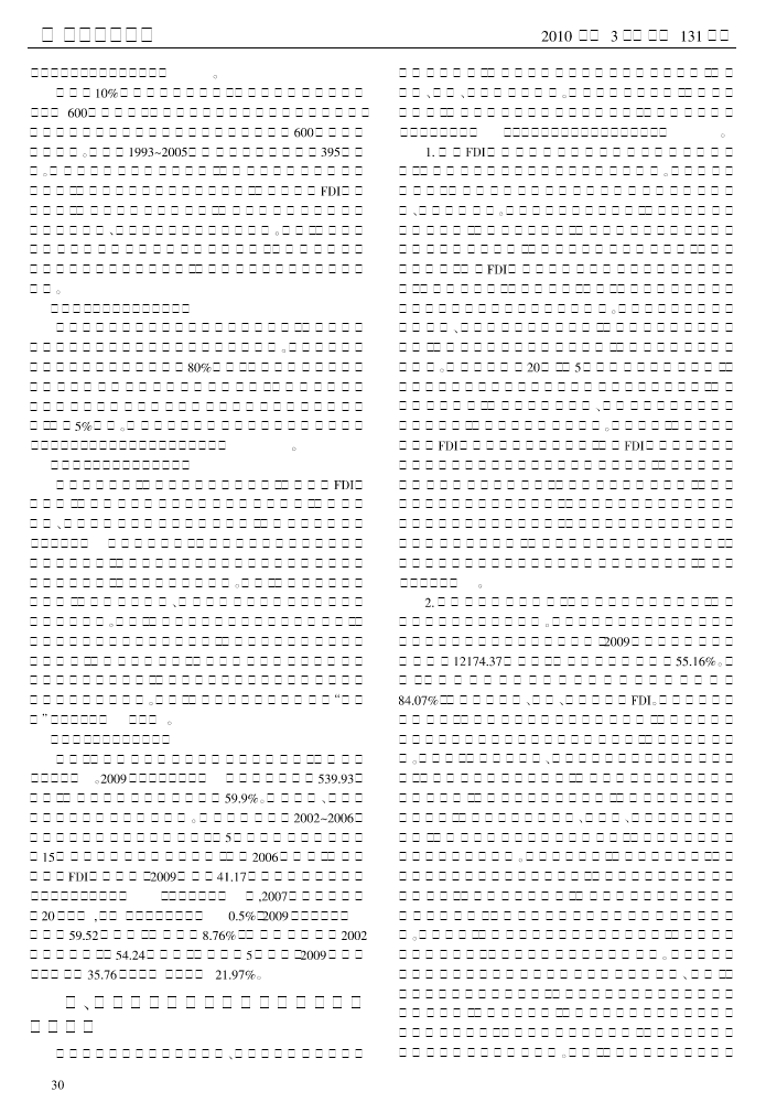 金融教学与研究2010年第3期(总第131期)我国利用外商直接投资存在的问题及对策毕海霞(河北金融学院,河北保定070051)摘要:20世纪90年代中后期以来,随着我国从整体性短缺经济向结构性过剩经济的转变,外商直接投资的负面效应开始显现,我国利用外商直接投资面临着产业、行业、区域结构失衡,核心技术含量不高,FDI利润汇回给国际收支带来潜在风险等新问题。因此,要提高我国利用FDI的质量和效果,需调整和改进利用外资的政策,均衡引导外商直接投资资金的流入与流出;注重培育自主创新能力,增强我国企业的国际竞争力;积极开拓新的引资途径,优化利用外资结构;加快技术进步与创新,实现从引资到引知的战略转移;规范对外资企业的优惠政策,建立健全市场竞争机制。关键词:外商直接投资;失衡;问题;对策中图分类号:F830.59文献标识码:A文章编号:1006-3544(2010)03-0028-0420世纪80年代末以来,外商直接投资(FDI)大量流入发比重最小。①这种投资结构与我国产业结构中第二产业产出展中国家。2009年,我国新批设立外商投资企业23435家,合偏高是一致的,如果不考虑其他因素,在某种程度上可以说,同外资金额1935.1亿美元,实际使用外资900.3亿美元,同比外商直接投资加剧了我国产业发展的不均衡。分别下降14.8%、8.4%和2.6%。2010年1~2月,全国新批设立(二)行业分布结构失衡外商投资企业3163家,同比增长14.56%;实际使用外资金额外商直接投资不仅在我国三大产业之间的分布结构不140.24亿美元,同比增长4.86%。中国连续17年成为利用外资均衡,在各行业内部的不均衡也十分明显,主要表现在:外商最多的发展中国家。改革开放30年来,吸引外资年均增长在第二产业的投资中,过多地集中在制造业,且对劳动密集20%,是我国国内生产总值增速的2倍多,居发展中国家第一型产业和技术含量不高的制造业投资比较多,而对高科技行位,世界第二位。近年来,外商直接投资在促进我国外贸出业的投资明显偏少;第三产业则集中于房地产业,而房地产口、引进先进科学技术、弥补国内资本的不足、增加就业机沉淀的资金给经济走出低谷带来困难。会、稳定人民币汇率等方面产生了重要的影响,为我国经济从表1可以看出,我国吸收的外商直接投资约70%集中在的发展注入了新的活力。毫无疑问,外商直接投资对推动我制造业,20世纪90年代末期,我国制造业实际吸收的外商直国开放型经济的发展和增强综合经济国力发挥了十分重要接投资占总金额的比重约为56%,2000年以来,该比重呈显著的作用,但不容忽视的是,20世纪90年代中后期以来,随着我上升趋势,2004年超过70%,比1997年增加近10个百分点,在国从整体性短缺经济向结构性过剩经济的转变,虽然外商直2005年以后虽然有所下降,但2005~2009年间仍然达到50%以接投资对我国经济发展的推动作用依然强劲,但在引进外商上。2009年,外商投资制造业新设立企业9767家,实际使用外直接投资中存在的一系列问题逐渐显现,对我国经济发展产资金额467.71亿美元,分别占同期全国总量的41.68%和生了一定的制约作用,对此我们应给予高度重视。51.95%。制造业吸收外资主要集中于2009年,外商投资主要一我国利用外商直接投资存在的主要集中在通信设备、计算机及其他电子设备制造业,电气机械、及器材制造业,化学原料及化学制品制造业,交通运输设备问题制造业和通用设备制造业等行业。(一)产业分布极不平衡制造业是我国较成熟的行业,而外商对该行业的大规模外商直接投资在各产业的分布呈现出高度的不平衡性。投资,从另一个侧面说明了外资未能充分引导我国新兴行业这种不均衡突出表现为:2009年,我国在外商投资中流入第的开发,在一定程度上更加剧了我国行业结构的失衡。而且,二产业的外商直接投资比重明显偏高,实际使用金额达到这种投资结构也容易使外商借此转移过时的设备和技术,从500.7亿美元,所占比重高达55.6%;第三产业次之,实际使用而抑制我国自身的自主研发能力。可见外商投资产业过于集金额为385.3亿美元,所占比重为42.8%;第一产业最少,外商中、低水平重复引进造成资源浪费、效率低下。投资农、林、牧、渔业新设立外商投资企业896家,实际使用外同时,在第三产业中,外商投资于房地产行业的比重过资金额14.29亿美元,分别占同期全国总量的3.82%和1.59%,高,2009年房地产业新设立外商投资企业569家,同比增长25.88%,实际使用外资金额167.96亿美元,占第三产业实际投收稿日期:2010-03-24作者简介:毕海霞,女,河北金融学院副教授,研究方向为国际金融。
