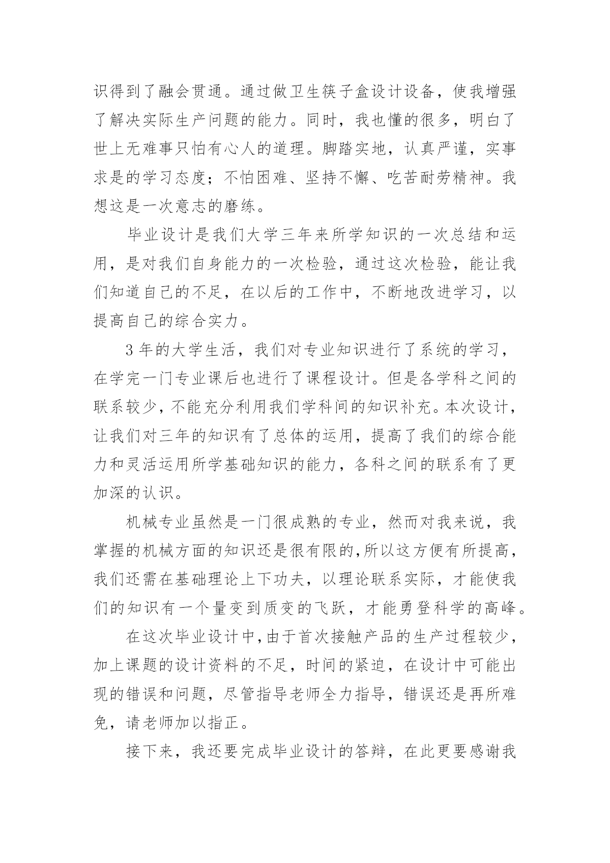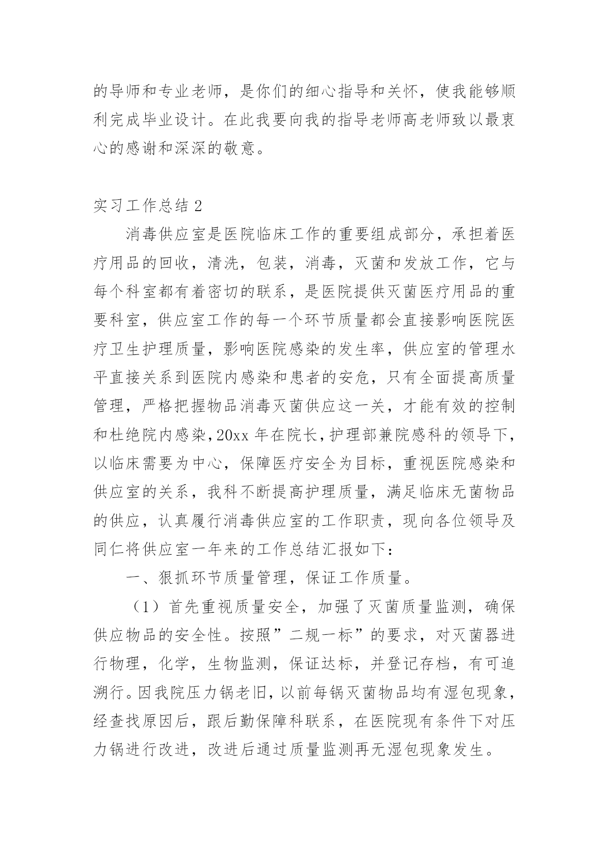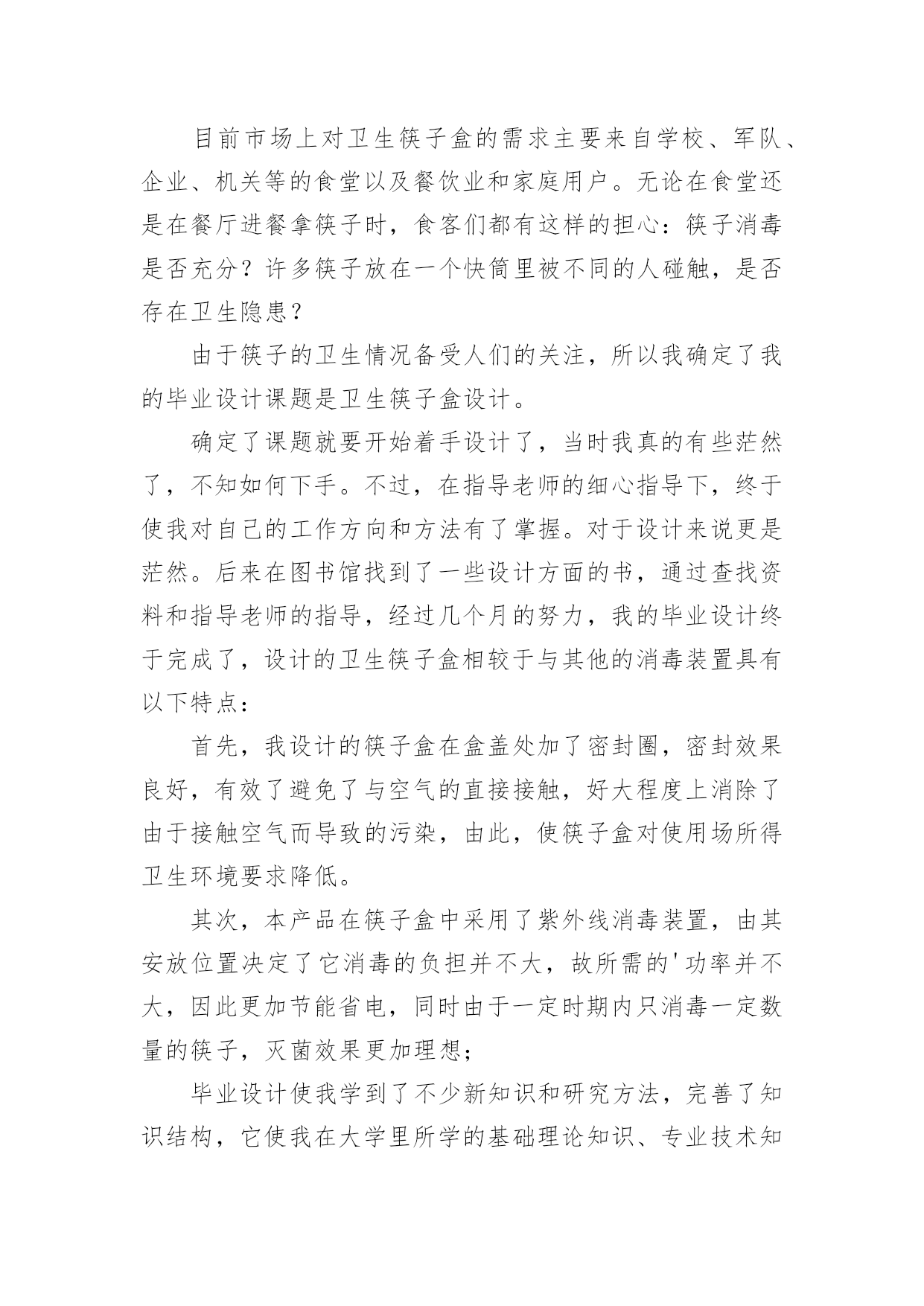 实习工作总结总结是把一定阶段内的有关情况分析研究,做出有指导性的经验方法以及结论的书面材料,它在我们的学习、工作中起到呈上启下的作用,不如我们来制定一份总结吧。那么如何把总结写出新花样呢?以下是小编收集整理的实习工作总结,仅供参考,欢迎大家阅读。实习工作总结1大专的课程已经结束了,我选择继续接本学习。和实习的学生相比我们似乎比较轻松,没有加班、有的是足够的休息时间。但是,我认为自己没有浪费这些时间,接本课程之余我选择看一些计算机,以及金融方面的书,大大丰富了课余生活。另外我也花了一部分时间做毕业设计,对于毕业设计,它就好比一门综合的教程,让我们把所学有所思。本次设计的课题卫生筷子盒设计设计。从一开始确定课题我就发现毕业设计不是件简单的事情,不同于往常的课程设计。本次设计的所有数据计算等都要由自己一个人独立完成且量比较大。我记得在确定课题那会,天天去图书馆找课题,但不管怎么找,就是找不到能做课题的内容,后来,通过浏览网页和社会调查,我发现目前人们对筷子的卫生情况越来越重视,但筷子的消毒的方面不尽人意,所以我就有突发对筷子盒设计的想法,通过进一步的市场调研我发现了很多问题。目前市场上对卫生筷子盒的需求主要来自学校、军队、企业、机关等的食堂以及餐饮业和家庭用户。无论在食堂还是在餐厅进餐拿筷子时,食客们都有这样的担心:筷子消毒是否充分?许多筷子放在一个快筒里被不同的人碰触,是否存在卫生隐患?由于筷子的卫生情况备受人们的关注,所以我确定了我的毕业设计课题是卫生筷子盒设计。确定了课题就要开始着手设计了,当时我真的有些茫然了,不知如何下手。不过,在指导老师的细心指导下,终于使我对自己的工作方向和方法有了掌握。对于设计来说更是茫然。后来在图书馆找到了一些设计方面的书,通过查找资料和指导老师的指导,经过几个月的努力,我的毕业设计终于完成了,设计的卫生筷子盒相较于与其他的消毒装置具有以下特点:首先,我设计的筷子盒在盒盖处加了密封圈,密封效果良好,有效了避免了与空气的直接接触,好大程度上消除了由于接触空气而导致的污染,由此,使筷子盒对使用场所得卫生环境要求降低。其次,本产品在筷子盒中采用了紫外线消毒装置,由其安放位置决定了它消毒的负担并不大,故所需的'功率并不大,因此更加节能省电,同时由于一定时期内只消毒一定数量的筷子,灭菌效果更加理想;毕业设计使我学到了不少新知识和研究方法,完善了知识结构,它使我在大学里所学的基础理论知识、专业技术知识得到了融会贯通。通过做卫生筷子盒设计设备,使我增强了解决实际生产问题的能力。同时,我也懂的很多,明白了世上无难事只怕有心人的道理。脚踏实地,认真严谨,实事求是的学习态度;不怕困难、坚持不懈、吃苦耐劳精神。我想这是一次意志的磨练。毕业设计是我们大学三年来所学知识的一次总结和运用,是对我们自身能力的一次检验,通过这次检验,能让我们知道自己的不足,在以后的工作中,不断地改进学习,以提高自己的综合实力。3年的大学生活,我们对专业知识进行了系统的学习,在学完一门专业课后也进行了课程设计。但是各学科之间的联系较少,不能充分利用我们学科间的知识补充。本次设计,让我们对三年的知识有了总体的运用,提高了我们的综合能力和灵活运用所学基础知识的能力,各科之间的联系有了更加深的认识。机械专业虽然是一门很成熟的专业,然而对我来说,我掌握的机械方面的知识还是很有限的,所以这方便有所提高,我们还需在基础理论上下功夫,以理论联系实际,才能使我们的知识有一个量变到质变的飞跃,才能勇登科学的高峰。在这次毕业设计中,由于首次接触产品的生产过程较少,加上课题的设计资料的不足,时间的紧迫,在设计中可能出现的错误和问题,尽管指导老师全力指导,错误还是再所难免,请老师加以指正。接下来,我还要完成毕业设计的答辩,在此更要感谢我的导师和专业老师,是你们的细心指导和关怀,使我能够顺利完成毕业设计。在此我要向我的指导老师高老师致以最衷心的感谢和深深的敬意。实习工作总结2消毒供应室是医院临床工作的重要组成部分,承担着医疗用品的回收,清洗,包装,消毒,灭菌和发放工作,它与每个科室都有着密切的联系,是医院提供灭菌医疗用品的重要科室,供应室工作的每一个环节质量都会直接影响医院医疗卫生护理质量,影响医院感染的发生率,供应室的管理水平直接关系到医院内感染和患者的安危,只有全面提高质量管理,严格把握物品消毒灭菌供应这一关,才能有效的控制和杜绝院内感染,20xx年在院长,护理部兼院感科的领导下,以临床需要为中心,保障医疗安全为目标,重视医院感染和供应室的关系,我科不断提高护理质量,满足临床无菌物品的供应,认真履行消毒供应室的工作职责,现向各位领导及同仁将供应室一年来的工作总结汇报如下:一、狠抓环节质量管理,保证工作质量。(1)首先重视质量安全,加强了灭菌质量监测,确保供应物品的安