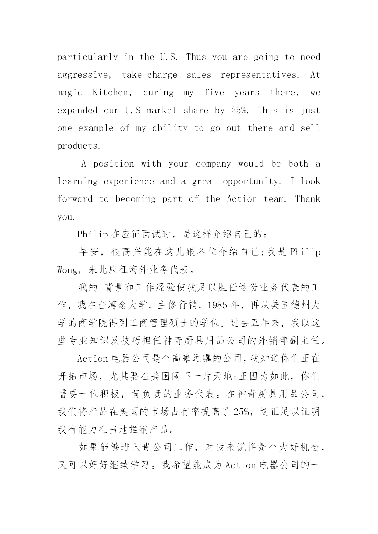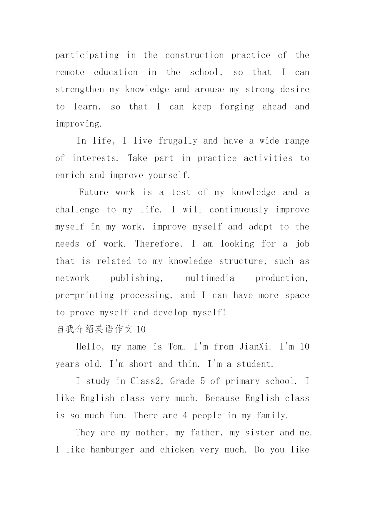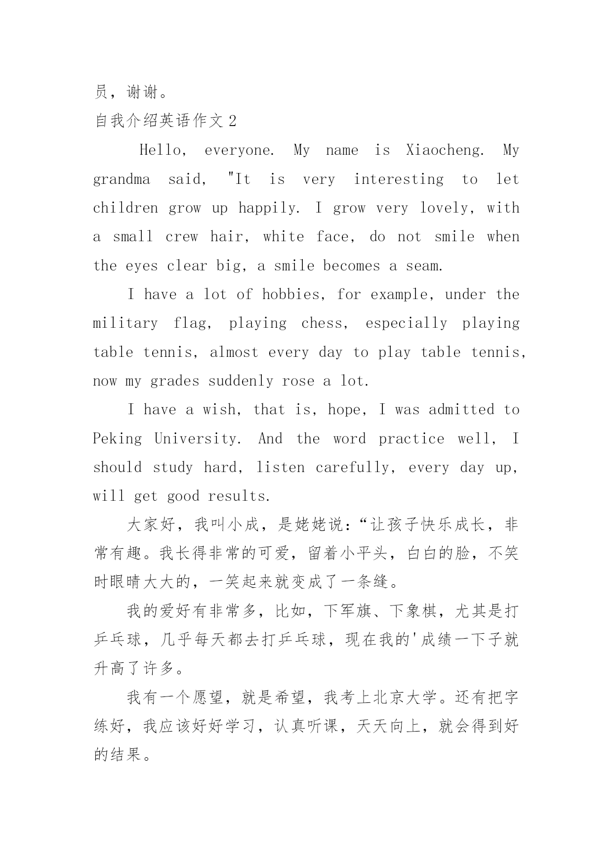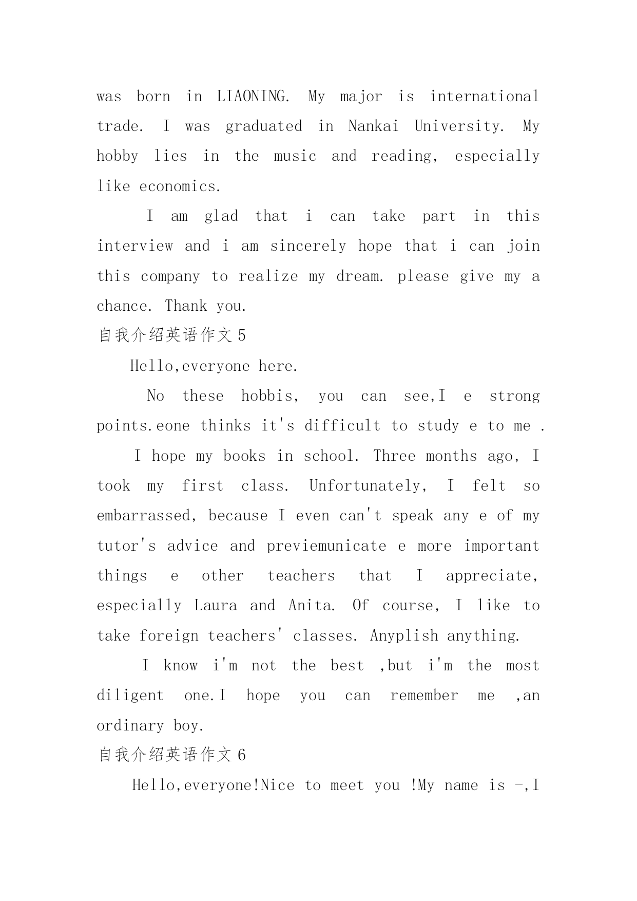 自我介绍英语作文自我介绍英语作文大全(15篇)当我们在一个新环境中,可能需要我们进行自我介绍,通过自我介绍可以让他人了解我们。那么我们该怎么去写自我介绍呢?以下是小编精心整理的自我介绍英语作文,仅供参考,希望能够帮助到大家。自我介绍英语作文1IntroducingYourselfatanInterview(应征面谈)Goodmonring.It'sapleasureformetobehereinfrontofyoutopresentmyself.MynameisPhilipWong,andIamacandidateforthepositionofOverseasSalesRepresentative.Mybackgroundandworkexperiencearetailor-madeforthisposition.IstudiedmarketingasanundergradhereinTaiwan,andin1985,IreceivedmyMBAfromtheUniversityofTexasSchoolofBusiness.Forfiveyearsnow,IhaveutilizedmyskillsandknowledgeastheAssistantDirectorofExportsformagickitchenSupplies.ActionAppliancesisaforward-lookingcompany.Iamawarethatyouareexpandingintonewmarkets,particularlyintheU.S.Thusyouaregoingtoneedaggressive,take-chargesalesrepresentatives.AtmagicKitchen,duringmyfiveyearsthere,weexpandedourU.Smarketshareby25%.Thisisjustoneexampleofmyabilitytogooutthereandsellproducts.Apositionwithyourcompanywouldbebothalearningexperienceandagreatopportunity.IlookforwardtobecomingpartoftheActionteam.Thankyou.Philip在应征面试时,是这样介绍自己的:早安,很高兴能在这儿跟各位介绍自己;我是PhilipWong,来此应征海外业务代表。我的`背景和工作经验使我足以胜任这份业务代表的工作,我在台湾念大学,主修行销,1985年,再从美国德州大学的商学院得到工商管理硕士的学位。过去五年来,我以这些专业知识及技巧担任神奇厨具用品公司的外销部副主任。Action电器公司是个高瞻远瞩的公司,我知道你们正在开拓市场,尤其要在美国闯下一片天地;正因为如此,你们需要一位积极,肯负责的业务代表。在神奇厨具用品公司,我们将产品在美国的市场占有率提高了25%,这正足以证明我有能力在当地推销产品。如果能够进入贵公司工作,对我来说将是个大好机会,又可以好好继续学习。我希望能成为Action电器公司的一员,谢谢。自我介绍英语作文2Hello,everyone.MynameisXiaocheng.Mygrandmasaid,"Itisveryinterestingtoletchildrengrowuphappily.Igrowverylovely,withasmallcrewhair,whiteface,donotsmilewhentheeyesclearbig,asmilebecomesaseam.Ihavealotofhobbies,forexample,underthemilitaryflag,playingchess,especiallyplayingtabletennis,almosteverydaytoplaytabletennis,nowmygradessuddenlyrosealot.Ihaveawish,thatis,hope,IwasadmittedtoPekingUniversity.Andthewordpracticewell,Ishouldstudyhard,listencarefully,everydayup,willgetgoodresults.大家好,我叫小成,是姥姥说:“让孩子快乐成长,非常有趣。我长得非常的可爱,留着小平头,白白的脸,不笑时眼晴大大的,一笑起来就变成了一条缝。我的爱好有非常多,比如,下军旗、下象棋,尤其是打乒乓球,几乎每天都去打乒乓球,现在我的'成绩一下子就升高了许多。我有一个愿望,就是希望,我考上北京大学。还有把字练好,我应该好好学习,认真听课,