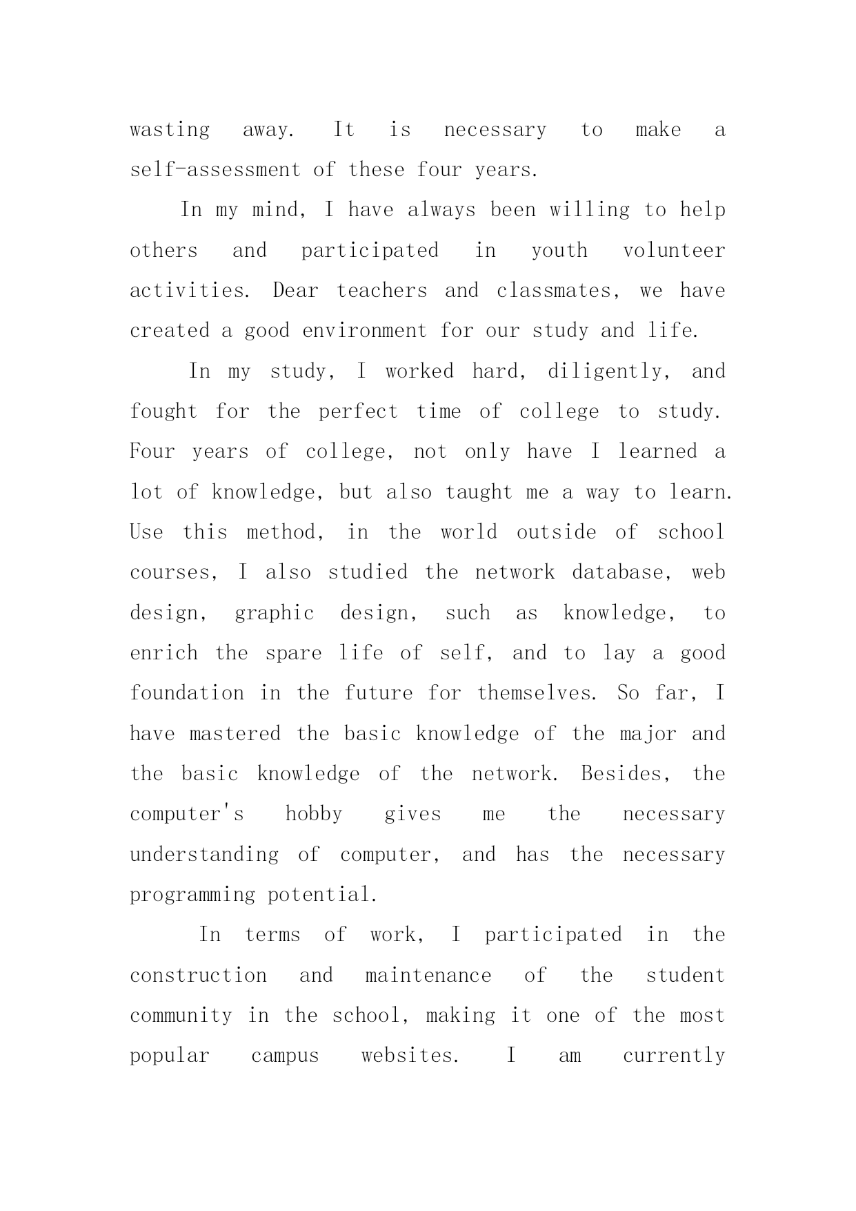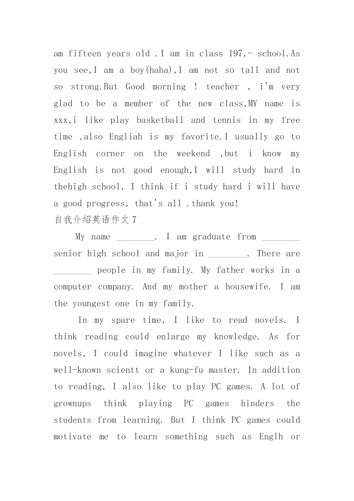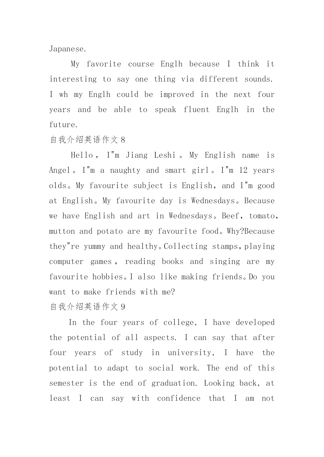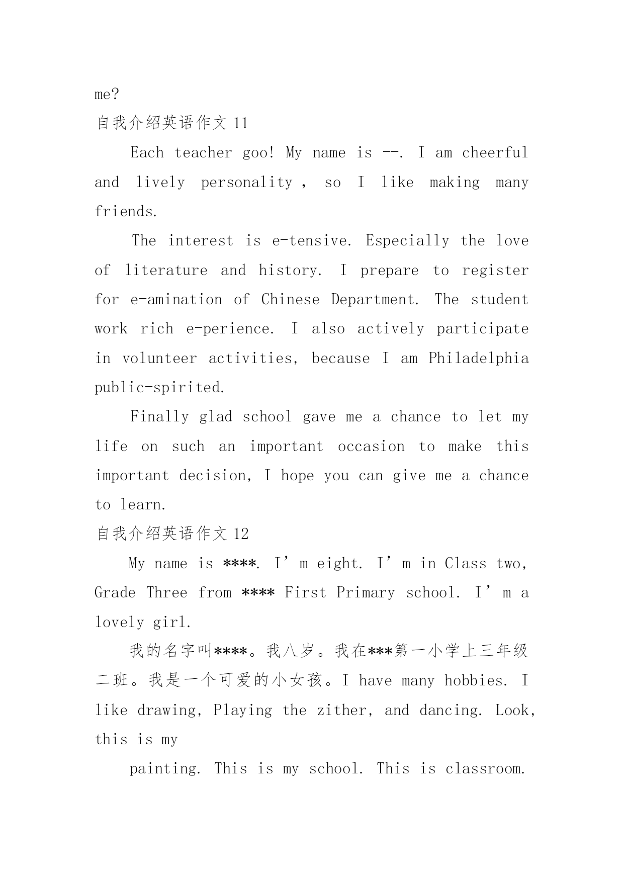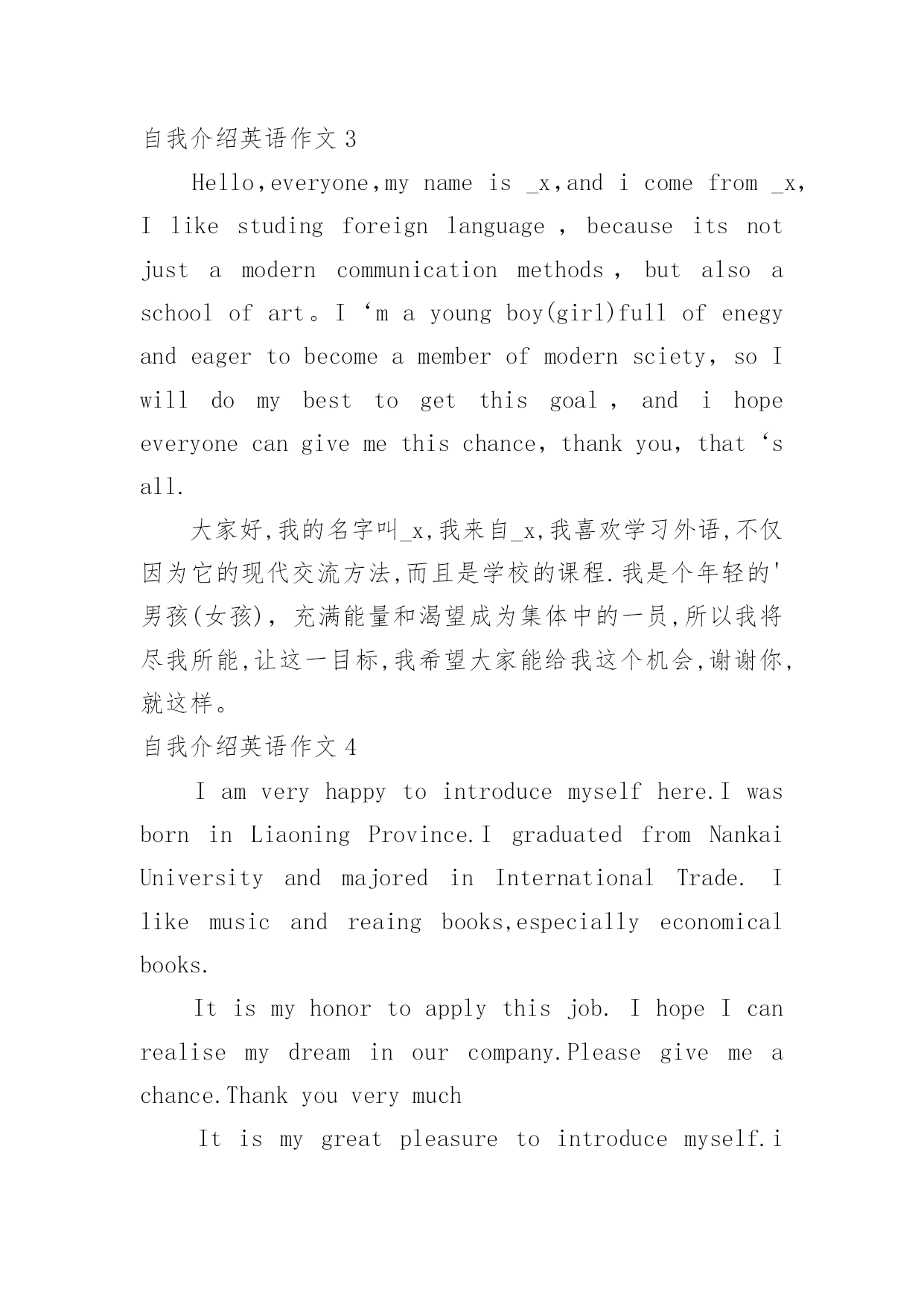 自我介绍英语作文自我介绍英语作文大全(15篇)当我们在一个新环境中,可能需要我们进行自我介绍,通过自我介绍可以让他人了解我们。那么我们该怎么去写自我介绍呢?以下是小编精心整理的自我介绍英语作文,仅供参考,希望能够帮助到大家。自我介绍英语作文1IntroducingYourselfatanInterview(应征面谈)Goodmonring.It'sapleasureformetobehereinfrontofyoutopresentmyself.MynameisPhilipWong,andIamacandidateforthepositionofOverseasSalesRepresentative.Mybackgroundandworkexperiencearetailor-madeforthisposition.IstudiedmarketingasanundergradhereinTaiwan,andin1985,IreceivedmyMBAfromtheUniversityofTexasSchoolofBusiness.Forfiveyearsnow,IhaveutilizedmyskillsandknowledgeastheAssistantDirectorofExportsformagickitchenSupplies.ActionAppliancesisaforward-lookingcompany.Iamawarethatyouareexpandingintonewmarkets,particularlyintheU.S.Thusyouaregoingtoneedaggressive,take-chargesalesrepresentatives.AtmagicKitchen,duringmyfiveyearsthere,weexpandedourU.Smarketshareby25%.Thisisjustoneexampleofmyabilitytogooutthereandsellproducts.Apositionwithyourcompanywouldbebothalearningexperienceandagreatopportunity.IlookforwardtobecomingpartoftheActionteam.Thankyou.Philip在应征面试时,是这样介绍自己的:早安,很高兴能在这儿跟各位介绍自己;我是PhilipWong,来此应征海外业务代表。我的`背景和工作经验使我足以胜任这份业务代表的工作,我在台湾念大学,主修行销,1985年,再从美国德州大学的商学院得到工商管理硕士的学位。过去五年来,我以这些专业知识及技巧担任神奇厨具用品公司的外销部副主任。Action电器公司是个高瞻远瞩的公司,我知道你们正在开拓市场,尤其要在美国闯下一片天地;正因为如此,你们需要一位积极,肯负责的业务代表。在神奇厨具用品公司,我们将产品在美国的市场占有率提高了25%,这正足以证明我有能力在当地推销产品。如果能够进入贵公司工作,对我来说将是个大好机会,又可以好好继续学习。我希望能成为Action电器公司的一员,谢谢。自我介绍英语作文2Hello,everyone.MynameisXiaocheng.Mygrandmasaid,"Itisveryinterestingtoletchildrengrowuphappily.Igrowverylovely,withasmallcrewhair,whiteface,donotsmilewhentheeyesclearbig,asmilebecomesaseam.Ihavealotofhobbies,forexample,underthemilitaryflag,playingchess,especiallyplayingtabletennis,almosteverydaytoplaytabletennis,nowmygradessuddenlyrosealot.Ihaveawish,thatis,hope,IwasadmittedtoPekingUniversity.Andthewordpracticewell,Ishouldstudyhard,listencarefully,everydayup,willgetgoodresults.大家好,我叫小成,是姥姥说:“让孩子快乐成长,非常有趣。我长得非常的可爱,留着小平头,白白的脸,不笑时眼晴大大的,一笑起来就变成了一条缝。我的爱好有非常多,比如,下军旗、下象棋,尤其是打乒乓球,几乎每天都去打乒乓球,现在我的'成绩一下子就升高了许多。我有一个愿望,就是希望,我考上北京大学。还有把字练好,我应该好好学习,认真听课,