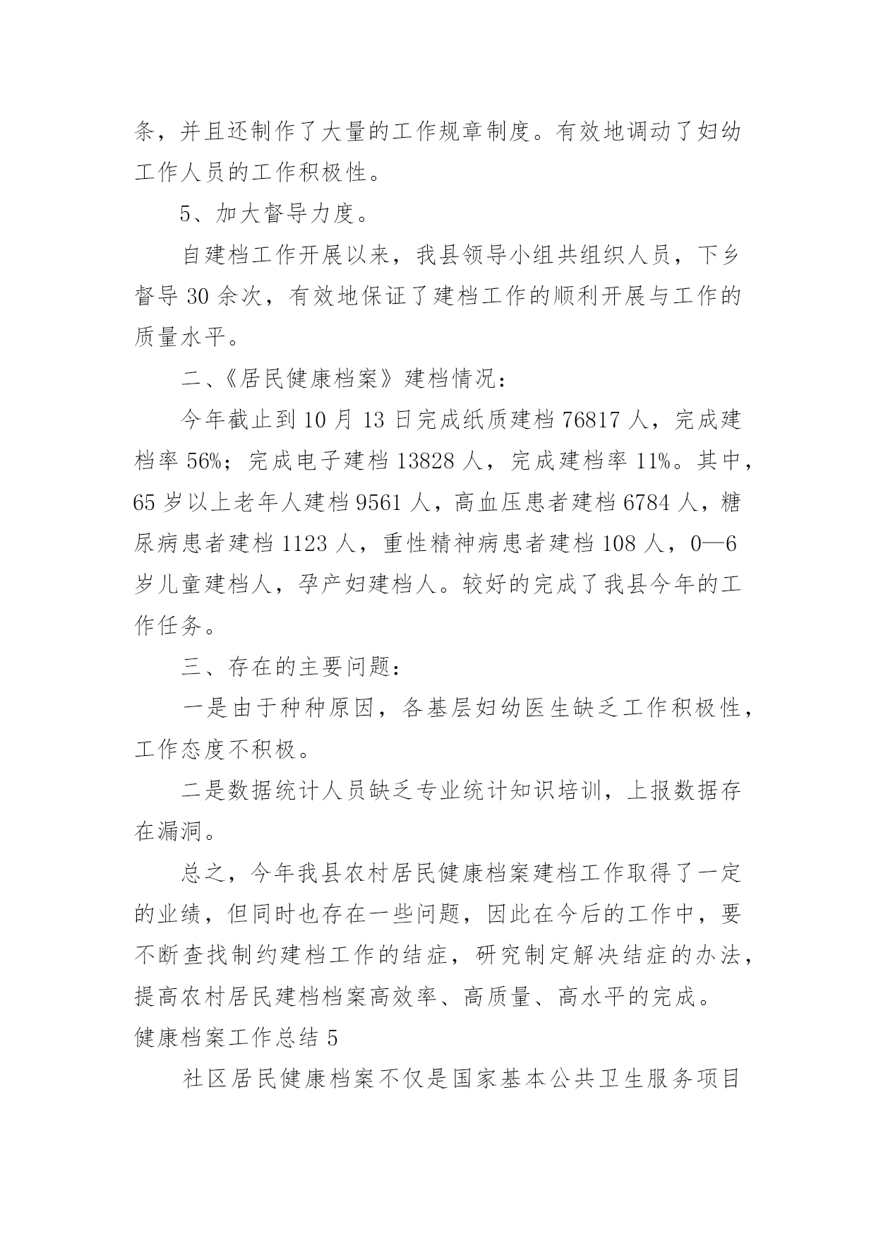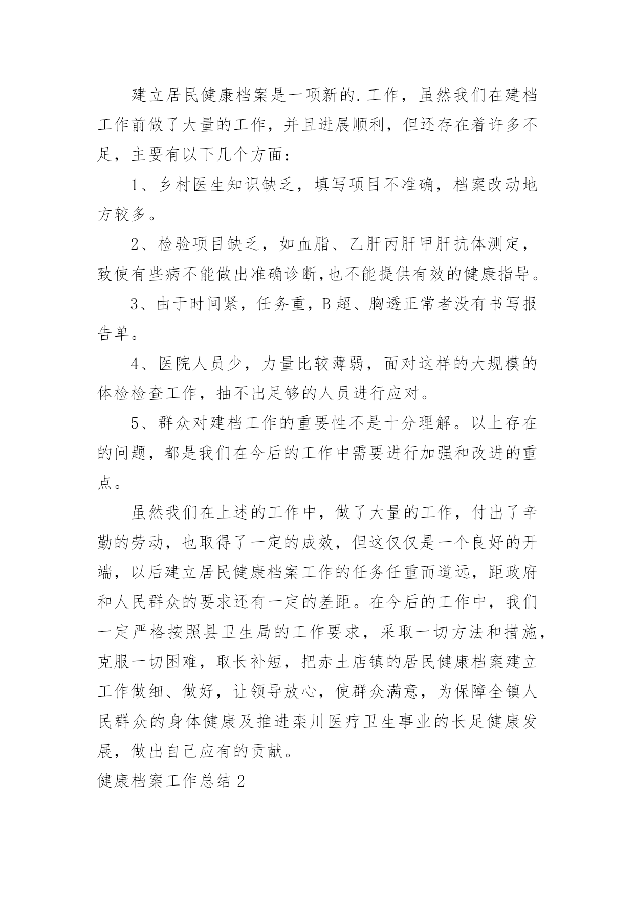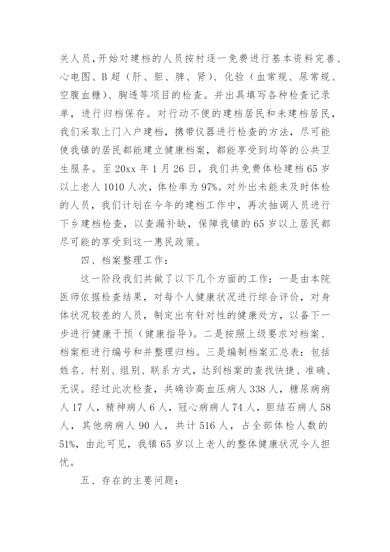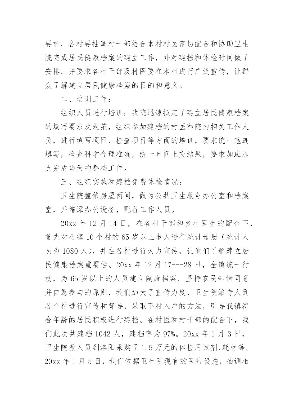 健康档案工作总结健康档案工作总结总结就是对一个时期的学习、工作或其完成情况进行一次全面系统的回顾和分析的书面材料,它可以帮助我们总结以往思想,发扬成绩,不妨让我们认真地完成总结吧。总结怎么写才是正确的呢?下面是小编精心整理的健康档案工作总结,希望对大家有所帮助。健康档案工作总结1为全镇农村居民建立居民健康档案,是落实国家基本公共卫生服务项目的重要内容,是促进基本公共卫生服务逐步均等的重要举措。赤土店镇的居民健康档案建立工作,在县卫生局的正确领导和指导下,在镇党委政府的大力支持下,在各村医生的密切配合下,通过全院职工的共同努力,取得了阶段性成效,现就我镇前一阶段的居民健康档案建立工作情况总结汇报如下:一、宣传发动:依照县卫生局的工作步骤和安排,我们在参加了县的动员会后,迅速召开班子会议,研究部署我镇的建档工作,并向镇政府主要领导做了汇报,并成立了赤土店镇公共卫生服务办公室,并在镇政府的主持下,召开了由村两委班子、乡村医生及其他相关人员参加的公共卫生项目启动会议。会议要求,各村要抽调村干部结合本村村医密切配合和协助卫生院完成居民健康档案的建立工作,并对建档和体检时间做了安排。并要求各村干部及村医要在本村进行广泛宣传,让群众了解建立居民健康档案的目的和意义。二、培训工作:组织人员进行培训:我院迅速拟定了建立居民健康档案的填写要求及规范,组织参加建档的村医和院内相关工作人员,进行填写项目、检查项目等方面的培训,要求统一笔迹填写,检查科学合理准确,统一时间上交结果,要求加班加点完成当天的整档工作。三、组织实施和建档免费体检情况:卫生院整修房屋两间,做为公共卫生服务办公室和档案室,并增添办公设备,配备工作人员。20xx年12月14日,在各村干部和乡村医生的配合下,首先对全镇10个村的65岁以上老人进行统计造册(统计人员为1080人),并在各村进行大力宣传,让他们了解建立居民健康档案重要性。20xx年12月17---28日,全镇统一行动,为65岁以上的人员建立健康档案。坚持农民知情同意并自愿参与的原则,我们加大了宣传力度,卫生院派专人到各个村进行宣传和督导,采取下村入户的方法,引导我镇符合年龄的居民积极进行建档。在村医和村干部的配合下,我们此次共建档1042人,建档率为97%。20xx年1月3日,卫生院派人员到洛阳采购了1.5万元的体检用试剂、耗材等。20xx年1月5日,我们依据卫生院现有的医疗设施,抽调相关人员,开始对建档的人员按村逐一免费进行基本资料完善、心电图、B超(肝、胆、脾、肾)、化验(血常规、尿常规、空腹血糖)、胸透等项目的检查。并出具填写各种检查记录单,进行归档保存。对行动不便的建档居民和未建档居民,我们采取上门入户建档,携带仪器进行检查的方法,尽可能使我镇的居民都能建立健康档案,都能享受到均等的公共卫生服务。至20xx年1月26日,我们共免费体检建档65岁以上老人1010人次,体检率为97%。对外出未能来及时体检的人员,我们计划在今年的建档工作中,再次抽调人员进行下乡建档检查,以查漏补缺,保障我镇的65岁以上居民都尽可能的享受到这一惠民政策。四、档案整理工作:这一阶段我们共做了以下几个方面的工作:一是由本院医师依据检查结果,对每个人健康状况进行综合评价,对身体状况较差的人员,制定出有针对性的健康处方,以备下一步进行健康干预(健康指导)。二是按照上级要求对档案、档案柜进行编号和并整理归档。三是编制档案汇总表:包括姓名、村别、组别、联系方式,达到档案的查找快捷、准确、无误。经过此次检查,共确诊高血压病人338人,糖尿病病人17人,精神病人6人,冠心病病人74人,胆结石病人58人,其他病病人90人,共计516人,占全部体检人数的51%,由此可见,我镇65岁以上老人的整体健康状况令人担忧。五、存在的主要问题:建立居民健康档案是一项新的.工作,虽然我们在建档工作前做了大量的工作,并且进展顺利,但还存在着许多不足,主要有以下几个方面:1、乡村医生知识缺乏,填写项目不准确,档案改动地方较多。2、检验项目缺乏,如血脂、乙肝丙肝甲肝抗体测定,致使有些病不能做出准确诊断,也不能提供有效的健康指导。3、由于时间紧,任务重,B超、胸透正常者没有书写报告单。4、医院人员少,力量比较薄弱,面对这样的大规模的体检检查工作,抽不出足够的人员进行应对。5、群众对建档工作的重要性不是十分理解。以上存在的问题,都是我们在今后的工作中需要进行加强和改进的重点。虽然我们在上述的工作中,做了大量的工作,付出了辛勤的劳动,也取得了一定的成效,但这仅仅是一个良好的开端,以后建立居民健康档案工作的任务任重而道远,距政府和人民群众的要求还有一定的差距。在今后的工作中,我们一定严格按照县卫生局的工作要求,采取一切方法和措施,克服一切困难,取长补短,把赤土店镇的居民健康档案建