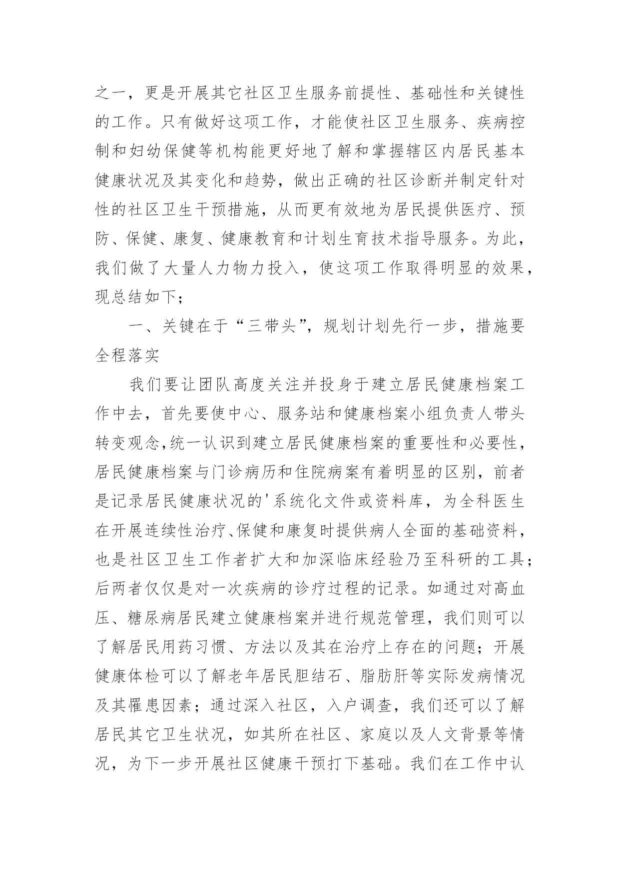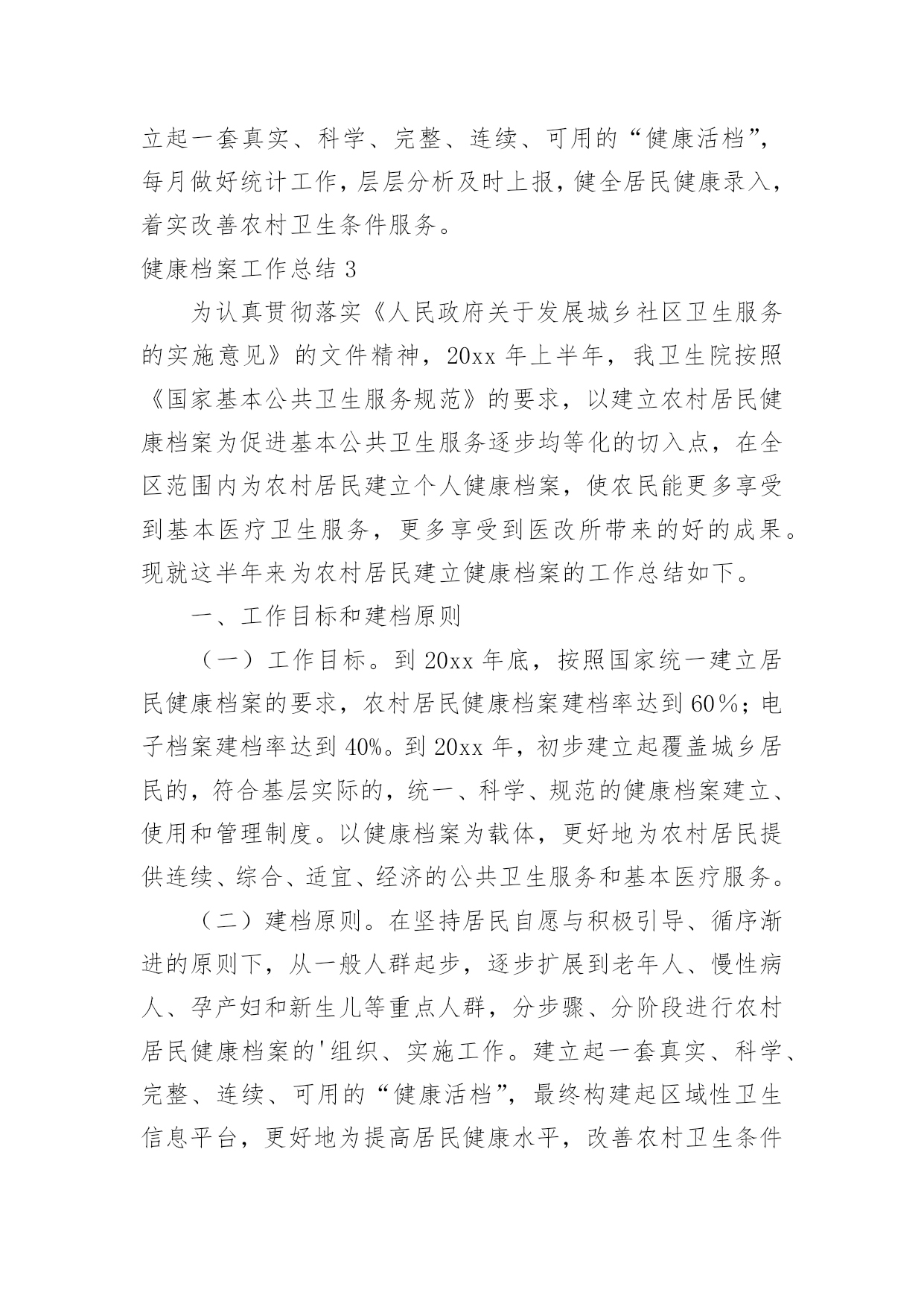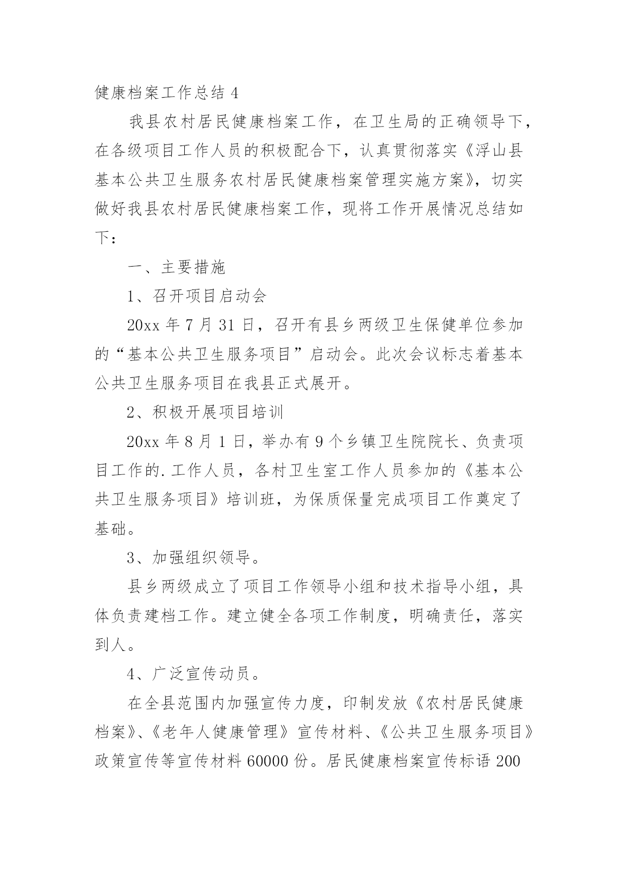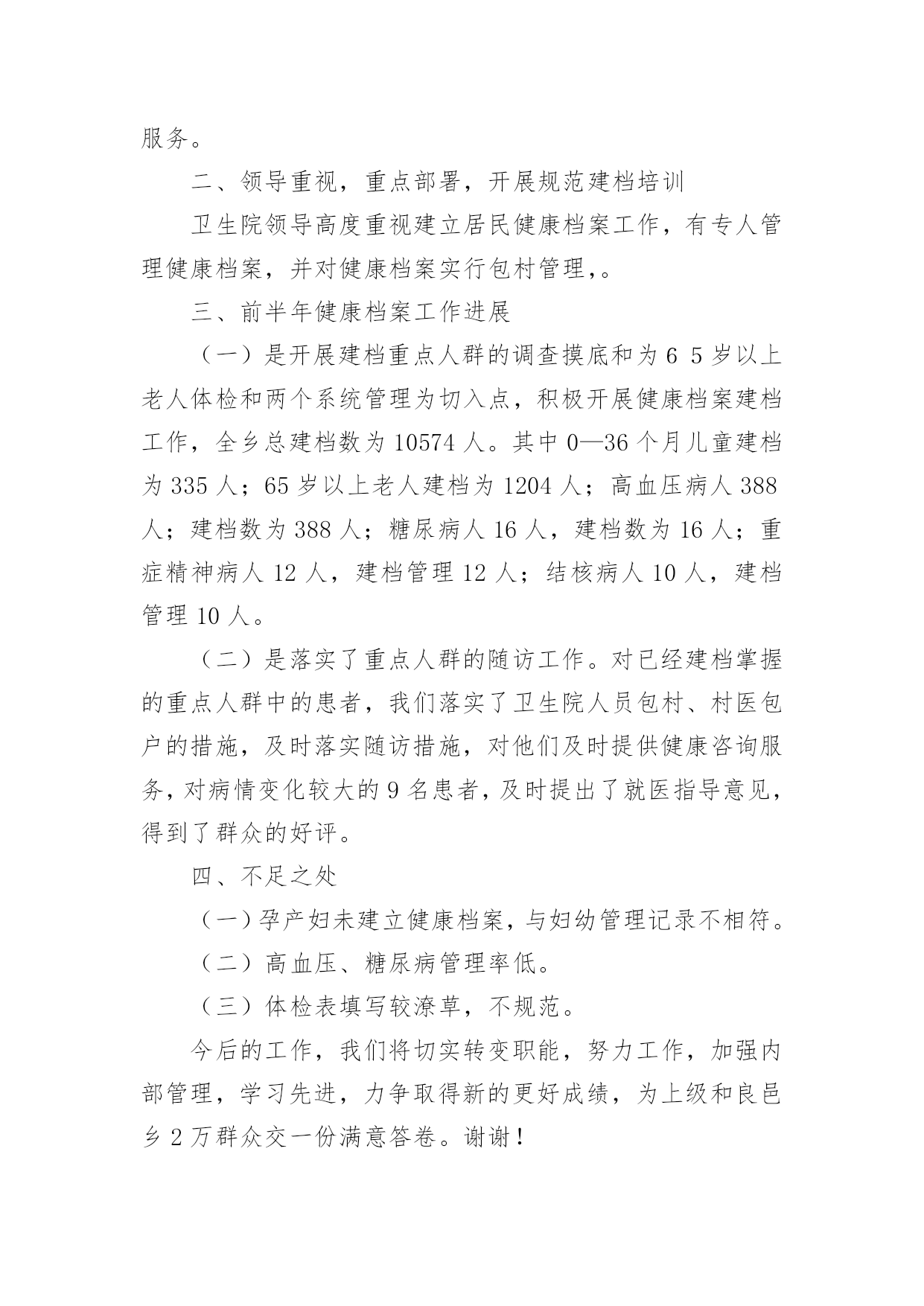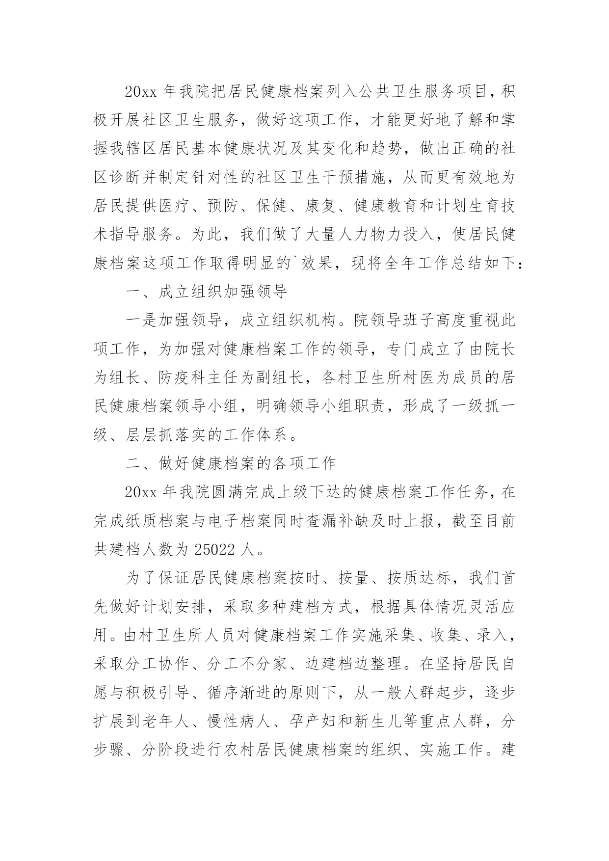 健康档案工作总结健康档案工作总结总结就是对一个时期的学习、工作或其完成情况进行一次全面系统的回顾和分析的书面材料,它可以帮助我们总结以往思想,发扬成绩,不妨让我们认真地完成总结吧。总结怎么写才是正确的呢?下面是小编精心整理的健康档案工作总结,希望对大家有所帮助。健康档案工作总结1为全镇农村居民建立居民健康档案,是落实国家基本公共卫生服务项目的重要内容,是促进基本公共卫生服务逐步均等的重要举措。赤土店镇的居民健康档案建立工作,在县卫生局的正确领导和指导下,在镇党委政府的大力支持下,在各村医生的密切配合下,通过全院职工的共同努力,取得了阶段性成效,现就我镇前一阶段的居民健康档案建立工作情况总结汇报如下:一、宣传发动:依照县卫生局的工作步骤和安排,我们在参加了县的动员会后,迅速召开班子会议,研究部署我镇的建档工作,并向镇政府主要领导做了汇报,并成立了赤土店镇公共卫生服务办公室,并在镇政府的主持下,召开了由村两委班子、乡村医生及其他相关人员参加的公共卫生项目启动会议。会议要求,各村要抽调村干部结合本村村医密切配合和协助卫生院完成居民健康档案的建立工作,并对建档和体检时间做了安排。并要求各村干部及村医要在本村进行广泛宣传,让群众了解建立居民健康档案的目的和意义。二、培训工作:组织人员进行培训:我院迅速拟定了建立居民健康档案的填写要求及规范,组织参加建档的村医和院内相关工作人员,进行填写项目、检查项目等方面的培训,要求统一笔迹填写,检查科学合理准确,统一时间上交结果,要求加班加点完成当天的整档工作。三、组织实施和建档免费体检情况:卫生院整修房屋两间,做为公共卫生服务办公室和档案室,并增添办公设备,配备工作人员。20xx年12月14日,在各村干部和乡村医生的配合下,首先对全镇10个村的65岁以上老人进行统计造册(统计人员为1080人),并在各村进行大力宣传,让他们了解建立居民健康档案重要性。20xx年12月17---28日,全镇统一行动,为65岁以上的人员建立健康档案。坚持农民知情同意并自愿参与的原则,我们加大了宣传力度,卫生院派专人到各个村进行宣传和督导,采取下村入户的方法,引导我镇符合年龄的居民积极进行建档。在村医和村干部的配合下,我们此次共建档1042人,建档率为97%。20xx年1月3日,卫生院派人员到洛阳采购了1.5万元的体检用试剂、耗材等。20xx年1月5日,我们依据卫生院现有的医疗设施,抽调相关人员,开始对建档的人员按村逐一免费进行基本资料完善、心电图、B超(肝、胆、脾、肾)、化验(血常规、尿常规、空腹血糖)、胸透等项目的检查。并出具填写各种检查记录单,进行归档保存。对行动不便的建档居民和未建档居民,我们采取上门入户建档,携带仪器进行检查的方法,尽可能使我镇的居民都能建立健康档案,都能享受到均等的公共卫生服务。至20xx年1月26日,我们共免费体检建档65岁以上老人1010人次,体检率为97%。对外出未能来及时体检的人员,我们计划在今年的建档工作中,再次抽调人员进行下乡建档检查,以查漏补缺,保障我镇的65岁以上居民都尽可能的享受到这一惠民政策。四、档案整理工作:这一阶段我们共做了以下几个方面的工作:一是由本院医师依据检查结果,对每个人健康状况进行综合评价,对身体状况较差的人员,制定出有针对性的健康处方,以备下一步进行健康干预(健康指导)。二是按照上级要求对档案、档案柜进行编号和并整理归档。三是编制档案汇总表:包括姓名、村别、组别、联系方式,达到档案的查找快捷、准确、无误。经过此次检查,共确诊高血压病人338人,糖尿病病人17人,精神病人6人,冠心病病人74人,胆结石病人58人,其他病病人90人,共计516人,占全部体检人数的51%,由此可见,我镇65岁以上老人的整体健康状况令人担忧。五、存在的主要问题:建立居民健康档案是一项新的.工作,虽然我们在建档工作前做了大量的工作,并且进展顺利,但还存在着许多不足,主要有以下几个方面:1、乡村医生知识缺乏,填写项目不准确,档案改动地方较多。2、检验项目缺乏,如血脂、乙肝丙肝甲肝抗体测定,致使有些病不能做出准确诊断,也不能提供有效的健康指导。3、由于时间紧,任务重,B超、胸透正常者没有书写报告单。4、医院人员少,力量比较薄弱,面对这样的大规模的体检检查工作,抽不出足够的人员进行应对。5、群众对建档工作的重要性不是十分理解。以上存在的问题,都是我们在今后的工作中需要进行加强和改进的重点。虽然我们在上述的工作中,做了大量的工作,付出了辛勤的劳动,也取得了一定的成效,但这仅仅是一个良好的开端,以后建立居民健康档案工作的任务任重而道远,距政府和人民群众的要求还有一定的差距。在今后的工作中,我们一定严格按照县卫生局的工作要求,采取一切方法和措施,克服一切困难,取长补短,把赤土店镇的居民健康档案建