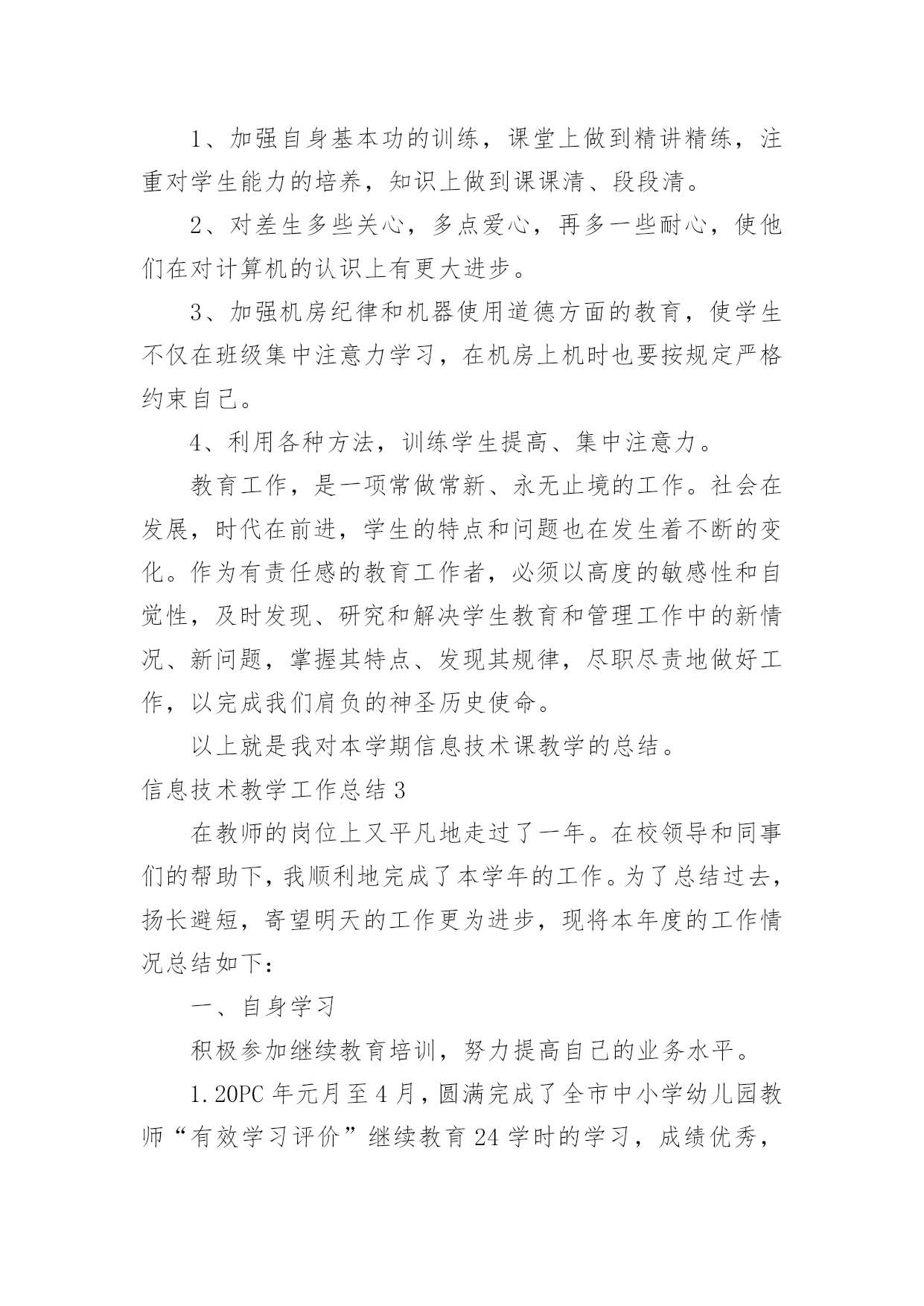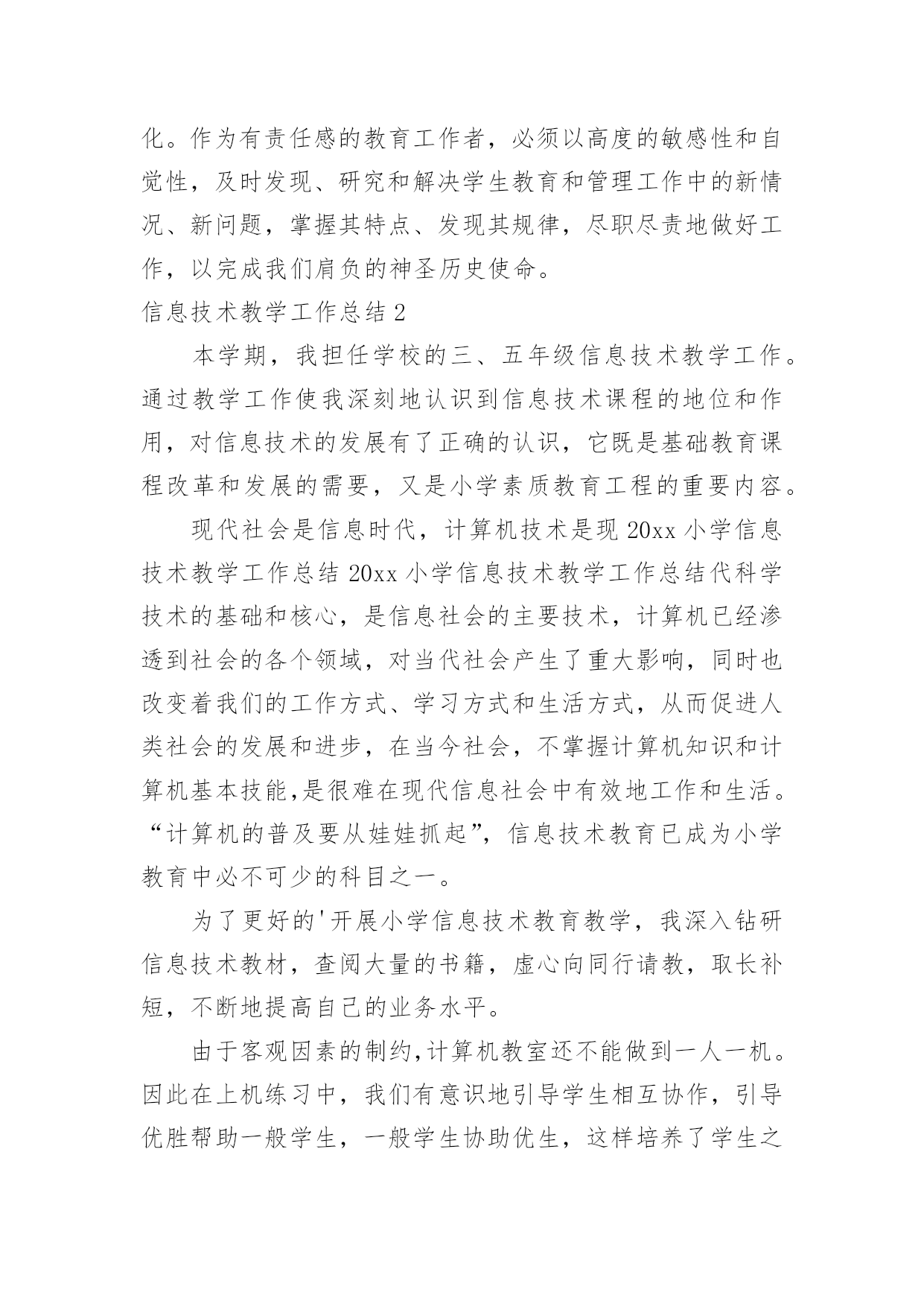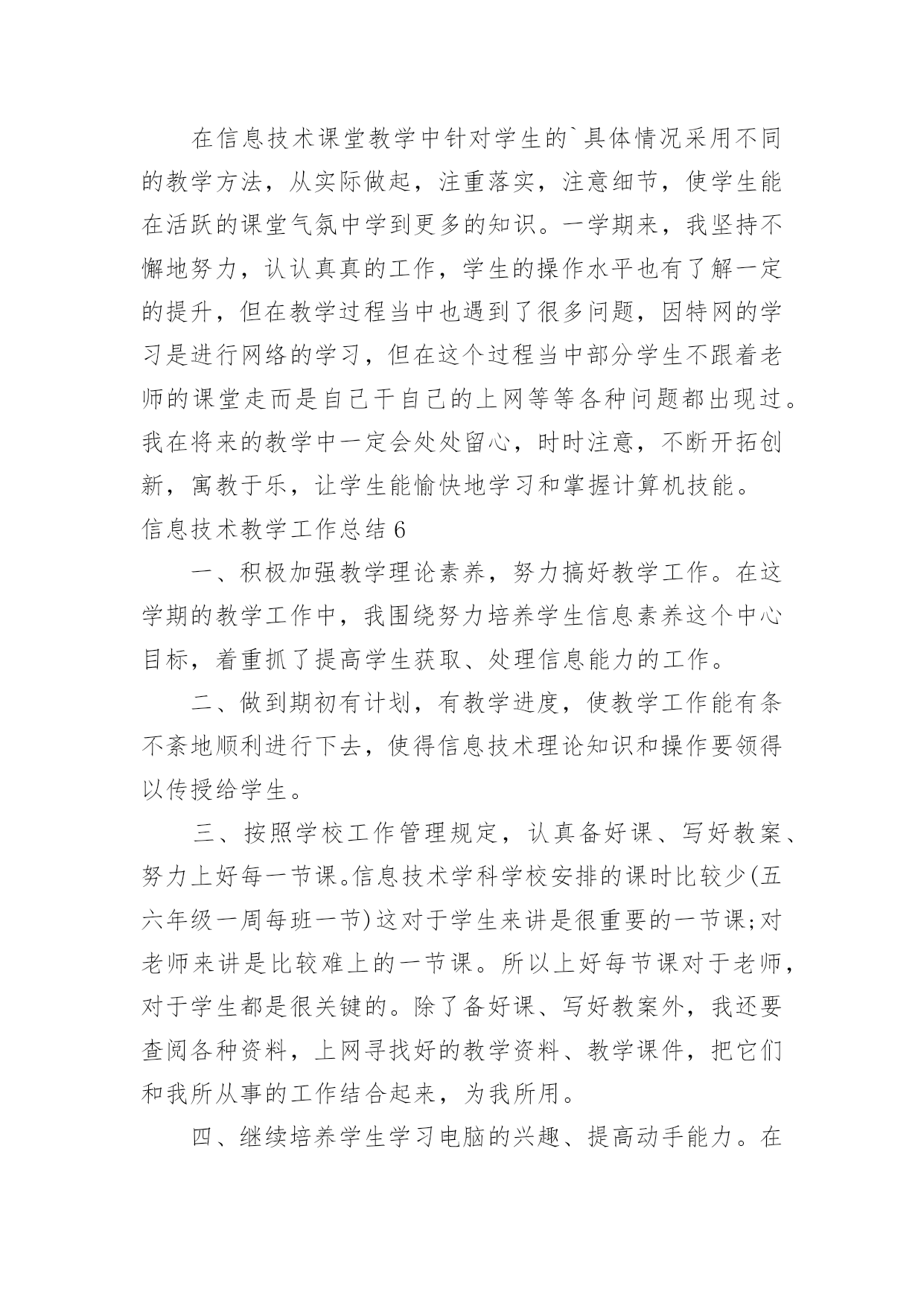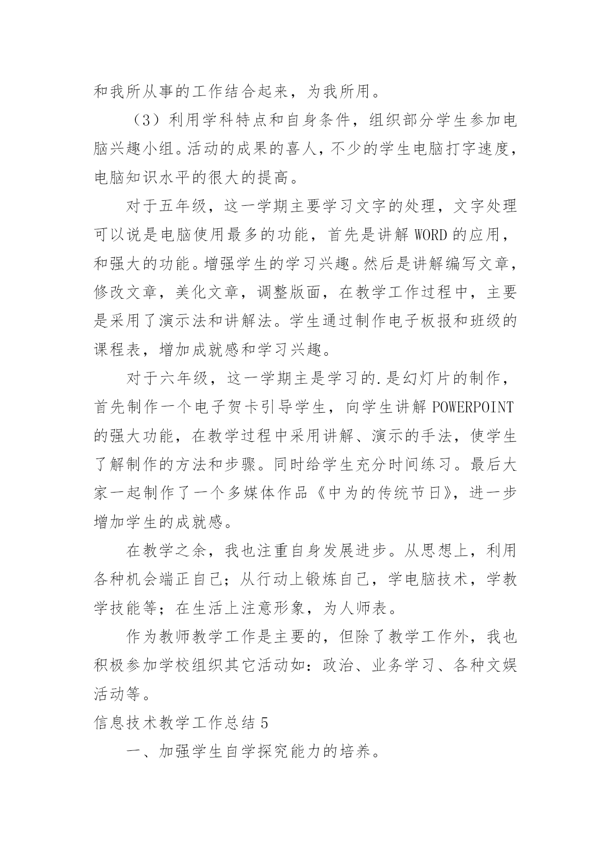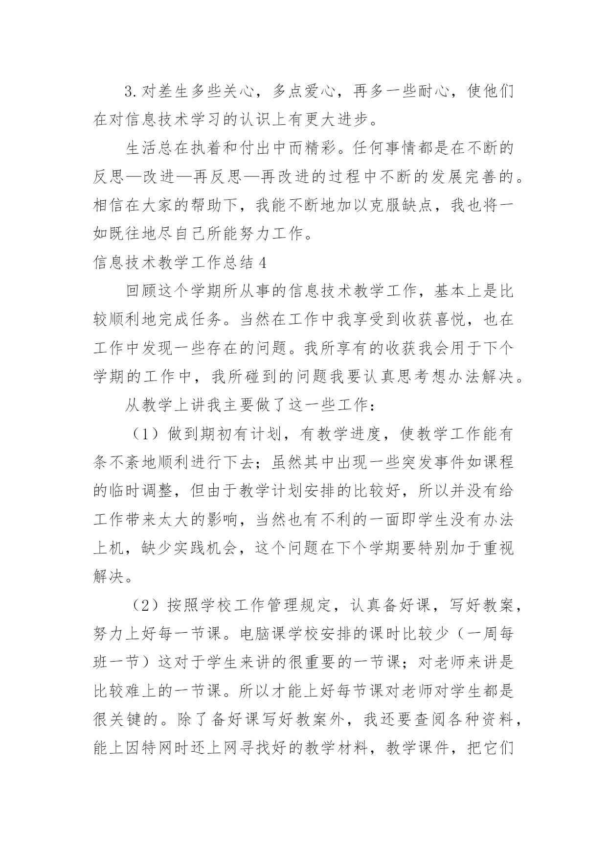 信息技术教学工作总结信息技术教学工作总结15篇总结是事后对某一时期、某一项目或某些工作进行回顾和分析,从而做出带有规律性的结论,它能够给人努力工作的动力,让我们来为自己写一份总结吧。我们该怎么去写总结呢?下面是小编收集整理的信息技术教学工作总结,仅供参考,大家一起来看看吧。信息技术教学工作总结1本学期即将结束,回顾这一学期,本人能够努力工作,认真学习,从多方面进行计算机教学和管理工作。有辛勤的耕耘,有收获的喜悦,也有不足与遗憾,现总结如下:一、思想认识一学期来,我服从学校的工作安排,配合领导和老师们做好各项工作。我相信在以后的工作学习中,我会在领导和同事们的帮助下,通过自己的努力,克服缺点,取得更大的进步。二、教学方面本学期,我担任学校的四、五年级信息技术教学工作。通过教学使我深刻地认识到信息技术课程的地位和作用,对信息技术的发展有了正确的认识,它既是基础教育课程改革和发展的需要,又是小学素质教育工程的重要内容。1、备课开学初,根据学校要求,认真写好教学计划,提前备好课,写好教案。认真钻研教材,学习好小学信息技术课程指导纲要,虚心向其他教师学习、请教,力求吃透教材,找准重点、难点。2、上课上好课的前提是做好课前准备,不打无准备之仗,尤其本学科主要课程都要上机完成,因此每节课前都要认真做好上机备课,检查机器状态,有无“不可用机器”。上课时认真讲课,力求抓住重点,突破难点,精讲精练,充分调动学生的学习积极性,使学生真正成为“主体”,在学习过程中充分发挥学生的.想象力和创造力,在掌握基础知识的前提下,使学生能做出有创新、有创意的作品。通过一节课的教学使学生既掌握知识又掌握技巧,使他们有成就感,学生上了每一节课都有收获。三、努力方向1、加强自身基本功的训练,课堂上做到精讲精练,注重对学生能力的培养。2、对学生多些关心,多点爱心,再多一些耐心,使他们在对计算机的认识上有更大进步。3、加强机房纪律和机器使用道德方面的教育,使学生不仅在班级集中注意力学习,在机房上机时也要按规定严格约束自己。教育工作,是一项常做常新、永无止境的工作。社会在发展,时代在前进,学生的特点和问题也在发生着不断的变化。作为有责任感的教育工作者,必须以高度的敏感性和自觉性,及时发现、研究和解决学生教育和管理工作中的新情况、新问题,掌握其特点、发现其规律,尽职尽责地做好工作,以完成我们肩负的神圣历史使命。信息技术教学工作总结2本学期,我担任学校的三、五年级信息技术教学工作。通过教学工作使我深刻地认识到信息技术课程的地位和作用,对信息技术的发展有了正确的认识,它既是基础教育课程改革和发展的需要,又是小学素质教育工程的重要内容。现代社会是信息时代,计算机技术是现20xx小学信息技术教学工作总结20xx小学信息技术教学工作总结代科学技术的基础和核心,是信息社会的主要技术,计算机已经渗透到社会的各个领域,对当代社会产生了重大影响,同时也改变着我们的工作方式、学习方式和生活方式,从而促进人类社会的发展和进步,在当今社会,不掌握计算机知识和计算机基本技能,是很难在现代信息社会中有效地工作和生活。“计算机的普及要从娃娃抓起”,信息技术教育已成为小学教育中必不可少的科目之一。为了更好的'开展小学信息技术教育教学,我深入钻研信息技术教材,查阅大量的书籍,虚心向同行请教,取长补短,不断地提高自己的业务水平。由于客观因素的制约,计算机教室还不能做到一人一机。因此在上机练习中,我们有意识地引导学生相互协作,引导优胜帮助一般学生,一般学生协助优生,这样培养了学生之间地团结互助地精神,使学生之间地关系更加和谐。现将自己本学期的教学工作作个总结。引入图画,激发学习兴趣。三年级的学生对去年学的画图特别感兴趣,而计算机正具有能画画的特点。根据这一特点,可以把计算机新课的学习寓于画画之中,激发学生学习的兴趣。在学生浓厚的兴趣中学习新知识,掌握新技能。利用学习成绩,提高学生的求知欲,在不断地学习中,采用边学边用的方法,学一点就让学生应用起来,不仅要满足学生的好奇心,还要在应用过程中,充分肯定学生自身的能力,增强学生的自信心,保持和促进学生学习的积极性,进一步激发学生学习计算机的兴趣,形成一个良性循环。每学习一课的内容结束后,都要对学生的学习进行评价。及时做总结,写反思信息技术教学注重内容衔接,抓住重点。因此在课后要及时总结课堂上的不足,以便能及时更正。只有不断反思,才有不断进步!回顾这学期从事信息技术的教学工作,虽然信息技术是一门新兴的学科,而我又是新手,但是基本上是比较顺利地完成了教学任务。当然,在工作中也会出现不如人意的事,但我相信,通过我的努力在工作中处处留心,时时注意,不断开拓创新,一定能将教学水平提高到一个新的高度,让学生能愉快地学习和掌握计算机技能。努力方向:1、加强自身基本功的训练,课堂上