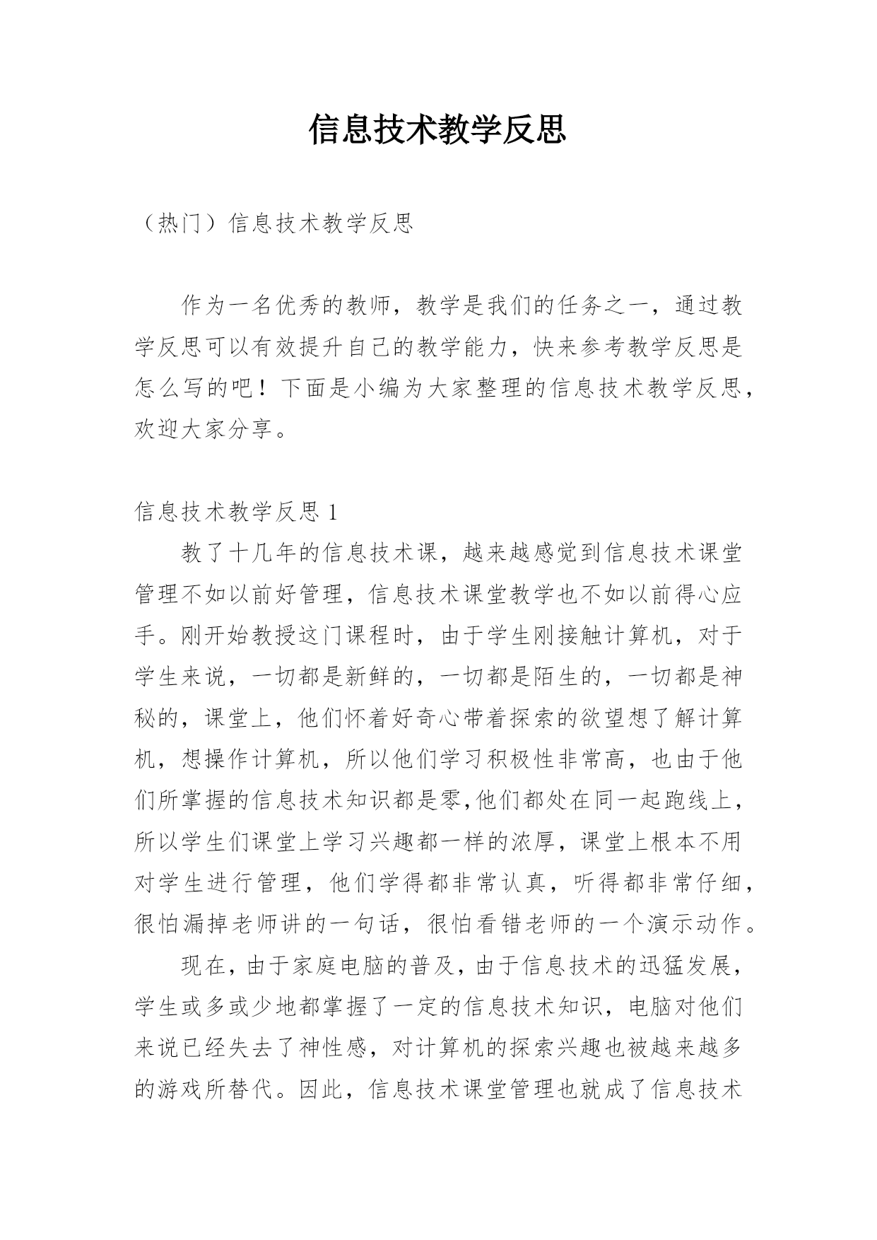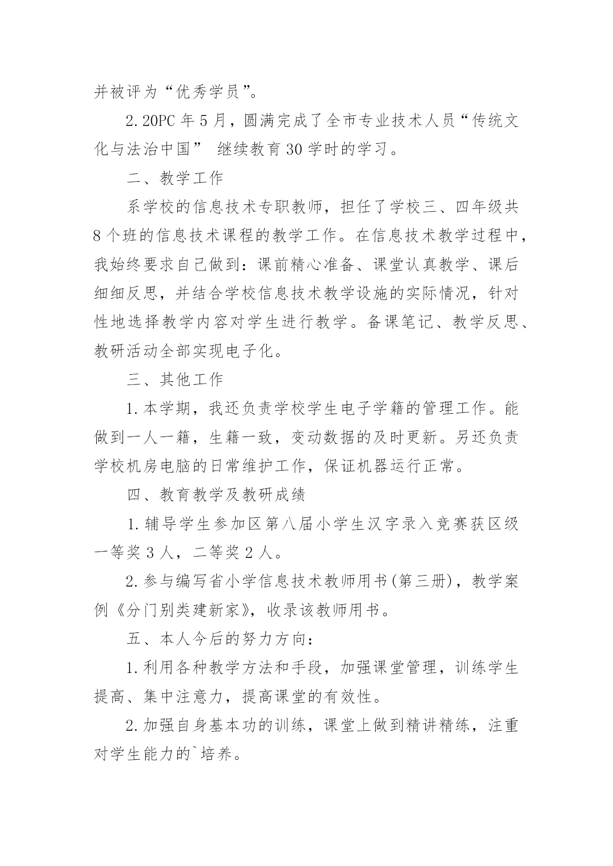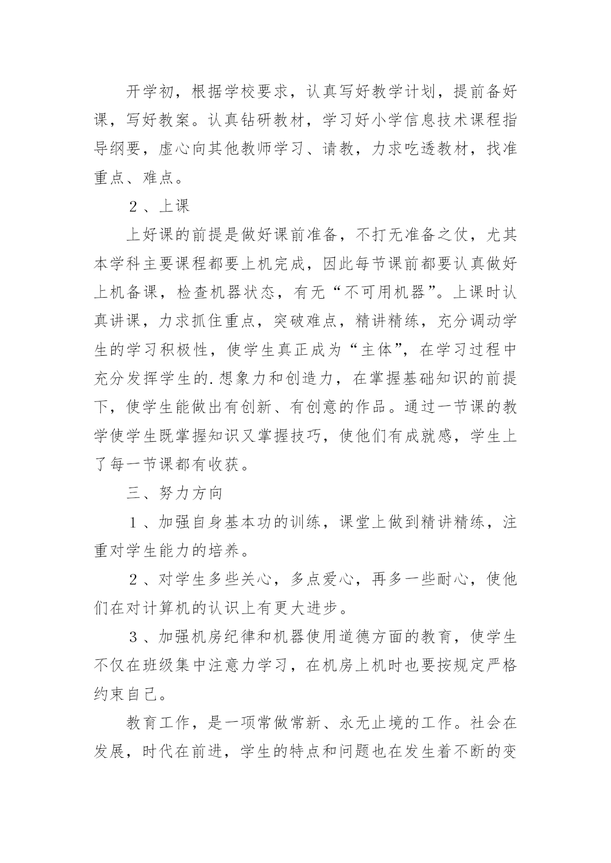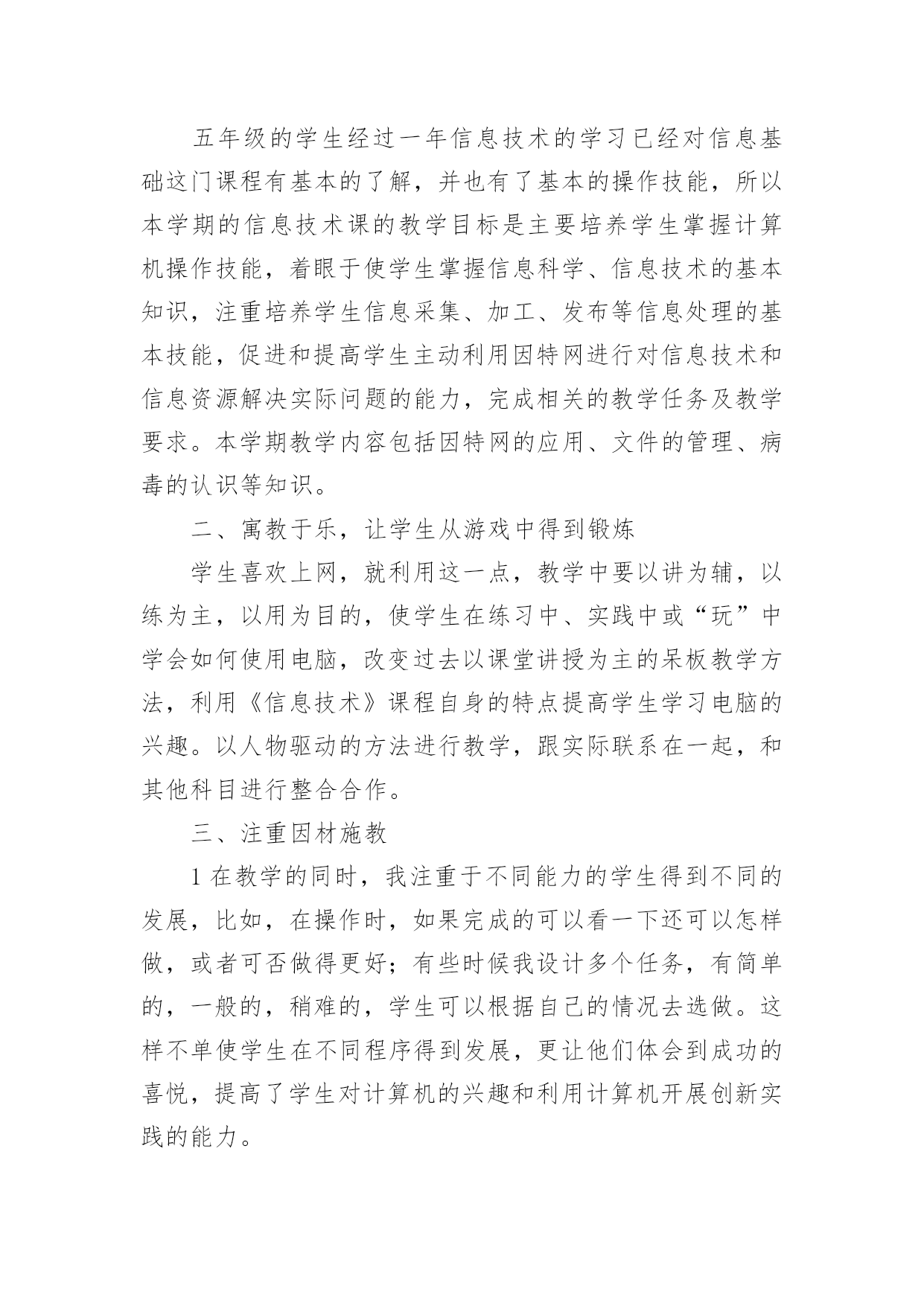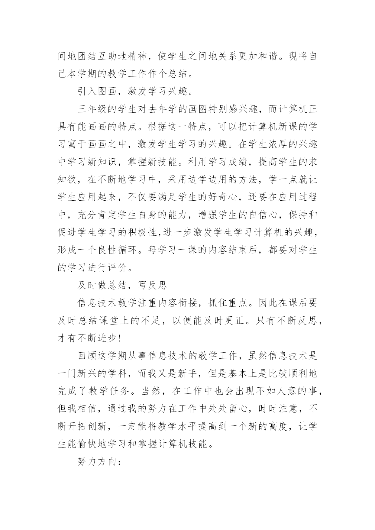 信息技术教学工作总结信息技术教学工作总结15篇总结是事后对某一时期、某一项目或某些工作进行回顾和分析,从而做出带有规律性的结论,它能够给人努力工作的动力,让我们来为自己写一份总结吧。我们该怎么去写总结呢?下面是小编收集整理的信息技术教学工作总结,仅供参考,大家一起来看看吧。信息技术教学工作总结1本学期即将结束,回顾这一学期,本人能够努力工作,认真学习,从多方面进行计算机教学和管理工作。有辛勤的耕耘,有收获的喜悦,也有不足与遗憾,现总结如下:一、思想认识一学期来,我服从学校的工作安排,配合领导和老师们做好各项工作。我相信在以后的工作学习中,我会在领导和同事们的帮助下,通过自己的努力,克服缺点,取得更大的进步。二、教学方面本学期,我担任学校的四、五年级信息技术教学工作。通过教学使我深刻地认识到信息技术课程的地位和作用,对信息技术的发展有了正确的认识,它既是基础教育课程改革和发展的需要,又是小学素质教育工程的重要内容。1、备课开学初,根据学校要求,认真写好教学计划,提前备好课,写好教案。认真钻研教材,学习好小学信息技术课程指导纲要,虚心向其他教师学习、请教,力求吃透教材,找准重点、难点。2、上课上好课的前提是做好课前准备,不打无准备之仗,尤其本学科主要课程都要上机完成,因此每节课前都要认真做好上机备课,检查机器状态,有无“不可用机器”。上课时认真讲课,力求抓住重点,突破难点,精讲精练,充分调动学生的学习积极性,使学生真正成为“主体”,在学习过程中充分发挥学生的.想象力和创造力,在掌握基础知识的前提下,使学生能做出有创新、有创意的作品。通过一节课的教学使学生既掌握知识又掌握技巧,使他们有成就感,学生上了每一节课都有收获。三、努力方向1、加强自身基本功的训练,课堂上做到精讲精练,注重对学生能力的培养。2、对学生多些关心,多点爱心,再多一些耐心,使他们在对计算机的认识上有更大进步。3、加强机房纪律和机器使用道德方面的教育,使学生不仅在班级集中注意力学习,在机房上机时也要按规定严格约束自己。教育工作,是一项常做常新、永无止境的工作。社会在发展,时代在前进,学生的特点和问题也在发生着不断的变化。作为有责任感的教育工作者,必须以高度的敏感性和自觉性,及时发现、研究和解决学生教育和管理工作中的新情况、新问题,掌握其特点、发现其规律,尽职尽责地做好工作,以完成我们肩负的神圣历史使命。信息技术教学工作总结2本学期,我担任学校的三、五年级信息技术教学工作。通过教学工作使我深刻地认识到信息技术课程的地位和作用,对信息技术的发展有了正确的认识,它既是基础教育课程改革和发展的需要,又是小学素质教育工程的重要内容。现代社会是信息时代,计算机技术是现20xx小学信息技术教学工作总结20xx小学信息技术教学工作总结代科学技术的基础和核心,是信息社会的主要技术,计算机已经渗透到社会的各个领域,对当代社会产生了重大影响,同时也改变着我们的工作方式、学习方式和生活方式,从而促进人类社会的发展和进步,在当今社会,不掌握计算机知识和计算机基本技能,是很难在现代信息社会中有效地工作和生活。“计算机的普及要从娃娃抓起”,信息技术教育已成为小学教育中必不可少的科目之一。为了更好的'开展小学信息技术教育教学,我深入钻研信息技术教材,查阅大量的书籍,虚心向同行请教,取长补短,不断地提高自己的业务水平。由于客观因素的制约,计算机教室还不能做到一人一机。因此在上机练习中,我们有意识地引导学生相互协作,引导优胜帮助一般学生,一般学生协助优生,这样培养了学生之间地团结互助地精神,使学生之间地关系更加和谐。现将自己本学期的教学工作作个总结。引入图画,激发学习兴趣。三年级的学生对去年学的画图特别感兴趣,而计算机正具有能画画的特点。根据这一特点,可以把计算机新课的学习寓于画画之中,激发学生学习的兴趣。在学生浓厚的兴趣中学习新知识,掌握新技能。利用学习成绩,提高学生的求知欲,在不断地学习中,采用边学边用的方法,学一点就让学生应用起来,不仅要满足学生的好奇心,还要在应用过程中,充分肯定学生自身的能力,增强学生的自信心,保持和促进学生学习的积极性,进一步激发学生学习计算机的兴趣,形成一个良性循环。每学习一课的内容结束后,都要对学生的学习进行评价。及时做总结,写反思信息技术教学注重内容衔接,抓住重点。因此在课后要及时总结课堂上的不足,以便能及时更正。只有不断反思,才有不断进步!回顾这学期从事信息技术的教学工作,虽然信息技术是一门新兴的学科,而我又是新手,但是基本上是比较顺利地完成了教学任务。当然,在工作中也会出现不如人意的事,但我相信,通过我的努力在工作中处处留心,时时注意,不断开拓创新,一定能将教学水平提高到一个新的高度,让学生能愉快地学习和掌握计算机技能。努力方向:1、加强自身基本功的训练,课堂上