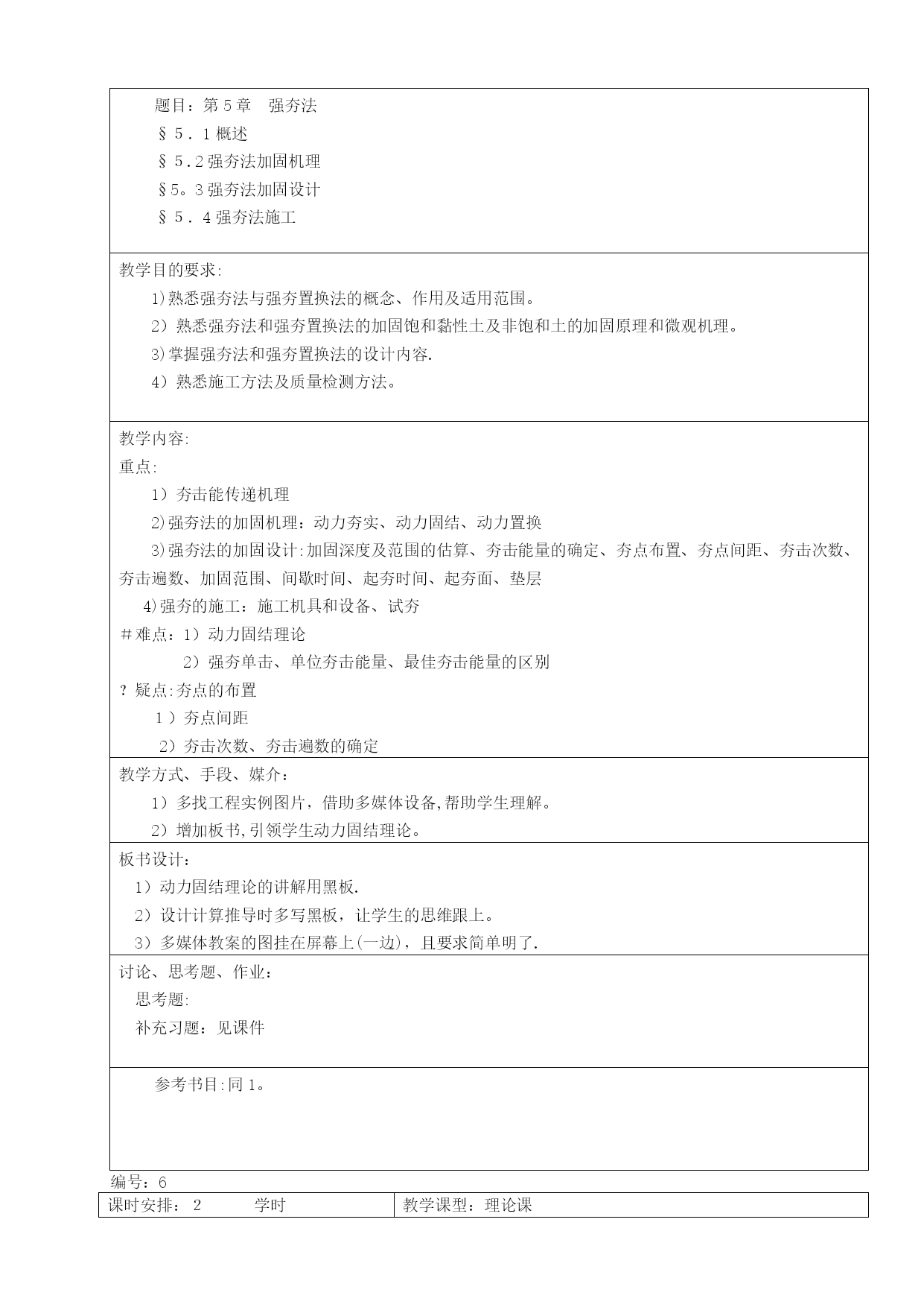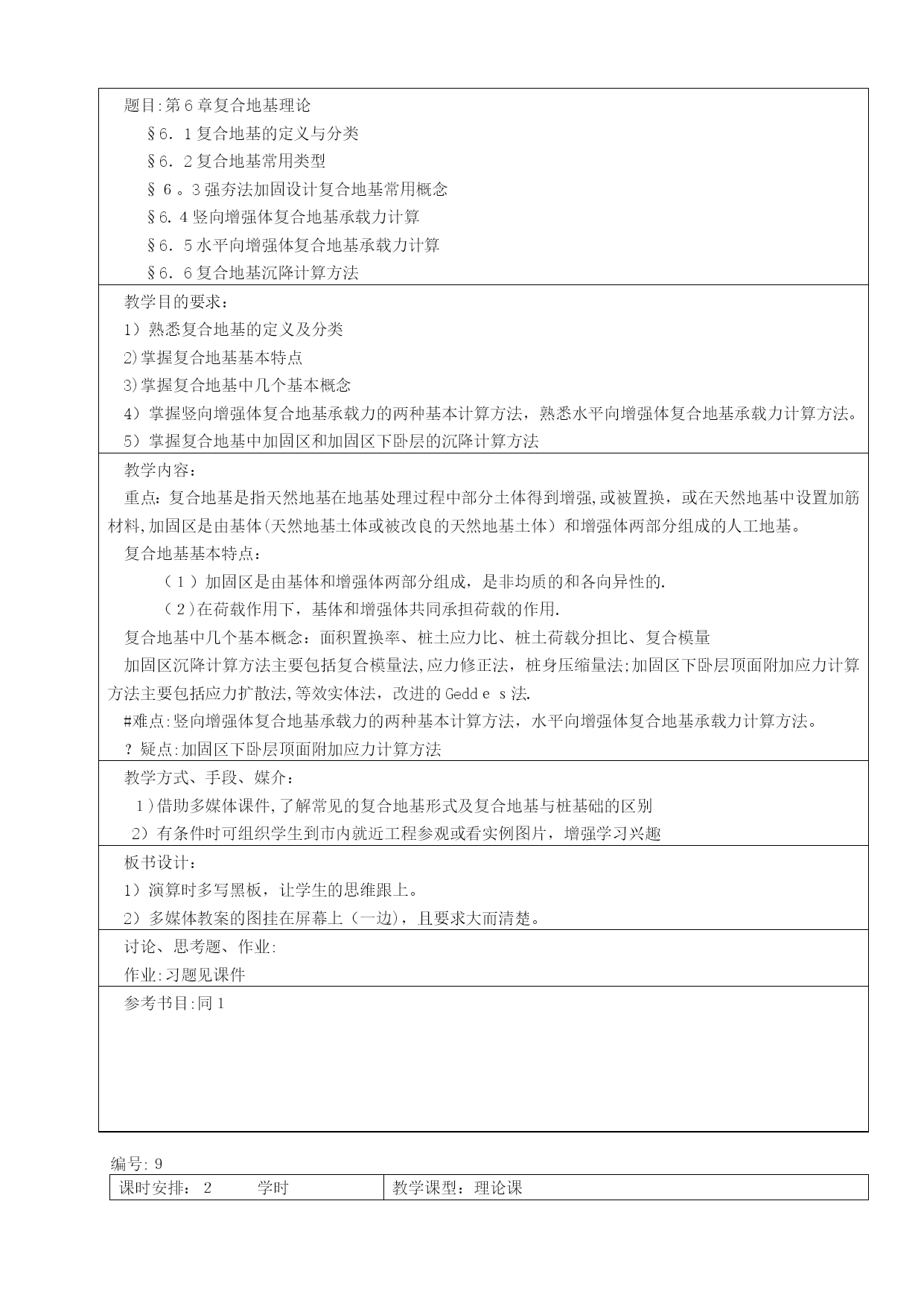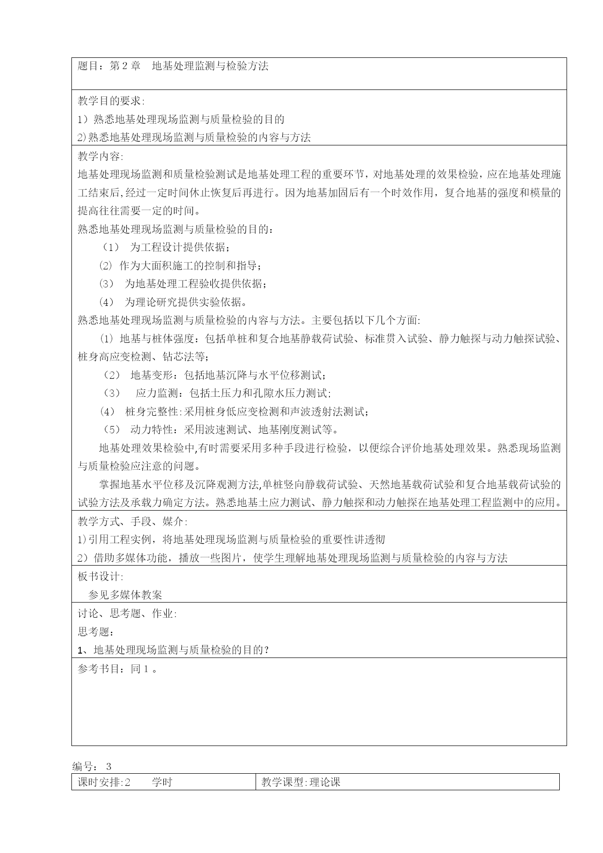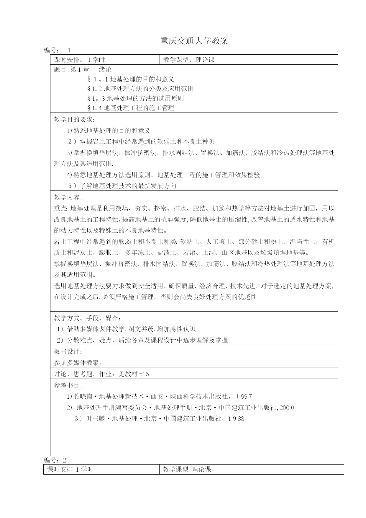地基处理技术(完整资料)(可以直接使用,可编辑优秀版资料,欢迎下载)重庆交通大学教案编号:1课时安排:1学时教学课型:理论课题目:第1章绪论§1。1地基处理的目的和意义§1.2地基处理方法的分类及应用范围§1。3地基处理的方法的选用原则§1.4地基处理工程的施工管理教学目的要求:1)熟悉地基处理的目的和意义2)掌握岩土工程中经常遇到的软弱土和不良土种类3)掌握换填垫层法、振冲挤密法、排水固结法、置换法、加筋法、胶结法和冷热处理法等地基处理方法及其适用范围.4)熟悉地基处理方法选用原则、地基处理工程的施工管理和效果检验5)了解地基处理技术的最新发展方向教学内容:重点:地基处理是利用换填、夯实、挤密、排水、胶结、加筋和热学等方法对地基土进行加固,用以改良地基土的工程特性,提高地基土的抗剪强度,降低地基土的压缩性,改善地基土的透水特性和地基的动力特性以及特殊土的不良地基特性。岩土工程中经常遇到的软弱土和不良土种类:软粘土、人工填土、部分砂土和粉土、湿陷性土、有机质土和泥炭土、膨胀土、多年冻土、盐渍土、岩溶、土洞、山区地基以及垃圾填埋地基等。掌握换填垫层法、振冲挤密法、排水固结法、置换法、加筋法、胶结法和冷热处理法等地基处理方法及其适用范围。选用地基处理方法要力求做到安全适用、确保质量、经济合理、技术先进。对于选定的地基处理方案,在设计完成之后,必须严格施工管理,否则会尚失良好处理方案的优越性。教学方式、手段、媒介:1)借助多媒体课件教学,图文并茂,增加感性认识2)分散难点、疑点,后续各章及课程设计中逐步理解及掌握板书设计:参见多媒体教案。讨论、思考题、作业:见教材p16参考书目:1)龚晓南·地基处理新技术·西安·陕西科学技术出版社,19972)地基处理手册编写委员会·地基处理手册·北京·中国建筑工业出版社,20003)叶书麟·地基处理·北京·中国建筑工业出版社,1988编号:2课时安排:1学时教学课型:理论课题目:第2章地基处理监测与检验方法教学目的要求:1)熟悉地基处理现场监测与质量检验的目的2)熟悉地基处理现场监测与质量检验的内容与方法教学内容:地基处理现场监测和质量检验测试是地基处理工程的重要环节,对地基处理的效果检验,应在地基处理施工结束后,经过一定时间休止恢复后再进行。因为地基加固后有一个时效作用,复合地基的强度和模量的提高往往需要一定的时间。熟悉地基处理现场监测与质量检验的目的:(1)为工程设计提供依据;(2)作为大面积施工的控制和指导;(3)为地基处理工程验收提供依据;(4)为理论研究提供实验依据。熟悉地基处理现场监测与质量检验的内容与方法。主要包括以下几个方面:(1)地基与桩体强度:包括单桩和复合地基静载荷试验、标准贯入试验、静力触探与动力触探试验、桩身高应变检测、钻芯法等;(2)地基变形:包括地基沉降与水平位移测试;(3)应力监测:包括土压力和孔隙水压力测试;(4)桩身完整性:采用桩身低应变检测和声波透射法测试;(5)动力特性:采用波速测试、地基刚度测试等。地基处理效果检验中,有时需要采用多种手段进行检验,以便综合评价地基处理效果。熟悉现场监测与质量检验应注意的问题。掌握地基水平位移及沉降观测方法,单桩竖向静载荷试验、天然地基载荷试验和复合地基载荷试验的试验方法及承载力确定方法。熟悉地基土应力测试、静力触探和动力触探在地基处理工程监测中的应用。教学方式、手段、媒介:1)引用工程实例,将地基处理现场监测与质量检验的重要性讲透彻2)借助多媒体功能,播放一些图片,使学生理解地基处理现场监测与质量检验的内容与方法板书设计:参见多媒体教案讨论、思考题、作业:思考题:1、地基处理现场监测与质量检验的目的?参考书目:同1。编号:3课时安排:2学时教学课型:理论课题目:第3章换填垫层法§3.1垫层的作用及适用范围;§3.2土的压实原理§3.3垫层设计;§3.4垫层的施工方法§3.5垫层法的质量检验教学目的要求:1)熟悉换填垫层法的定义、适用范围以及换填垫层的作用2)熟悉土的压实原理3)掌握换填垫层设计的内容4)熟悉垫层的施工方法和要点以及垫层施工完成后的质量检验教学内容:换填垫层的主要作用:(1)提高持力层的承载力;(2)减少沉降量;(3)加速软弱土层的排水固结;(4)防止冻胀;(5)消除膨胀土的胀缩作用.熟悉土的压实原理。在工程实践中,对垫层碾压质量的检验,要求能获得填土的最大干密度,其最大干密度可用室内击实试验确定。掌握换填垫层设计的内容:垫层厚度的确定,垫层宽度的确定,垫层承载力的确定,垫层沉降计算,垫层材料的选用。垫层施工按密实方法分类,可分为机械碾压法、重锤夯实法和平板振动法。应根据不同