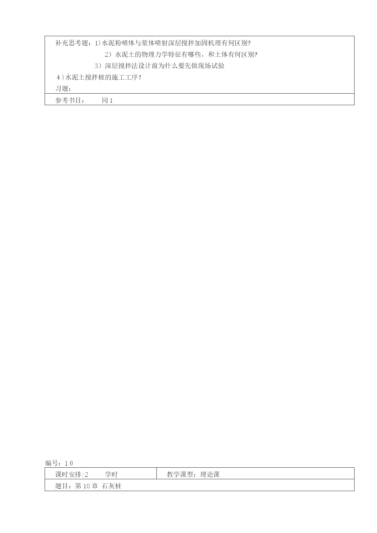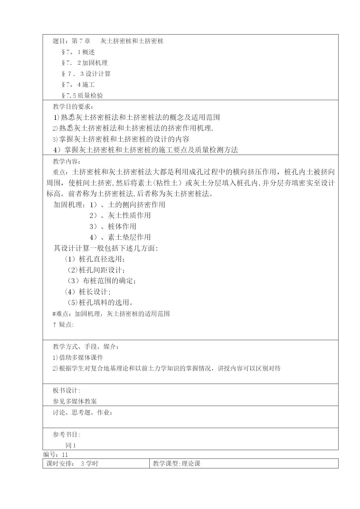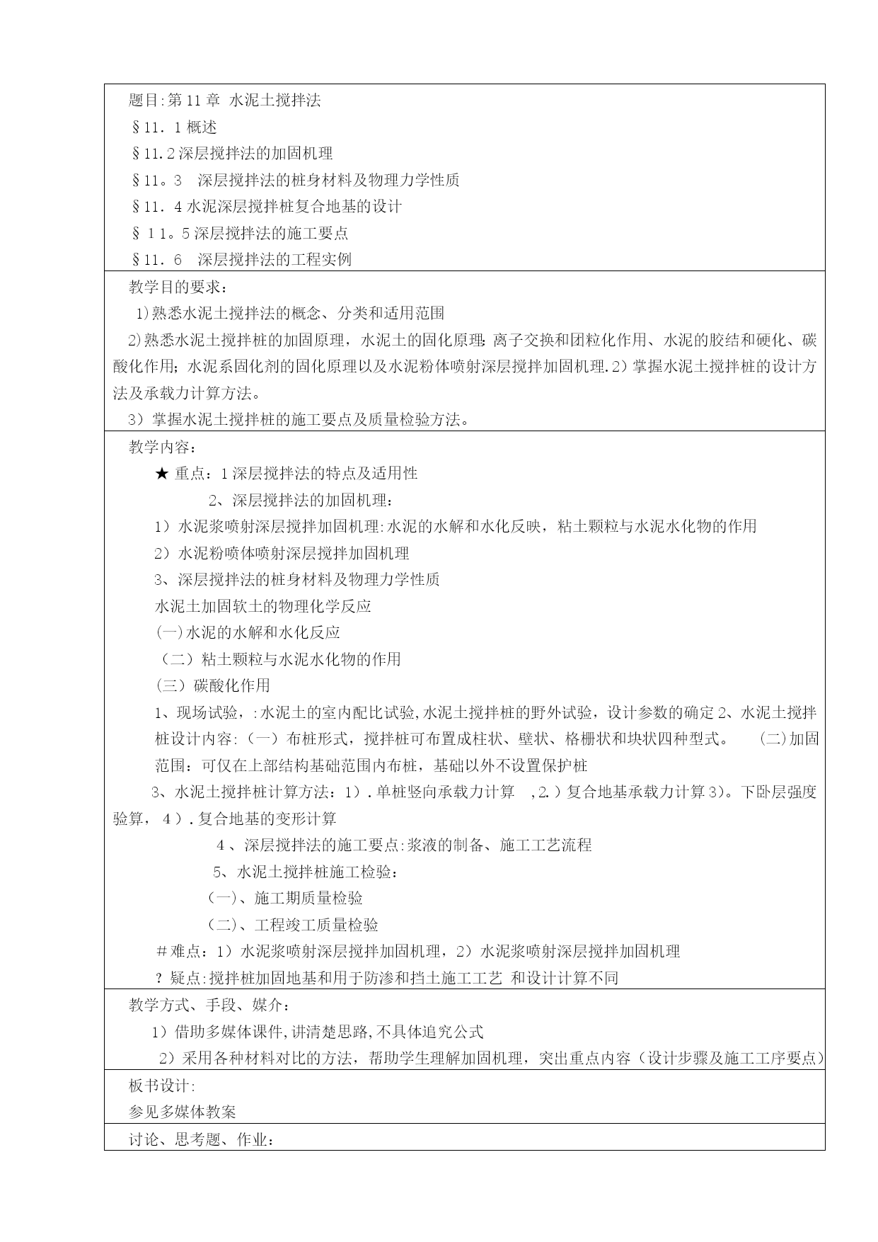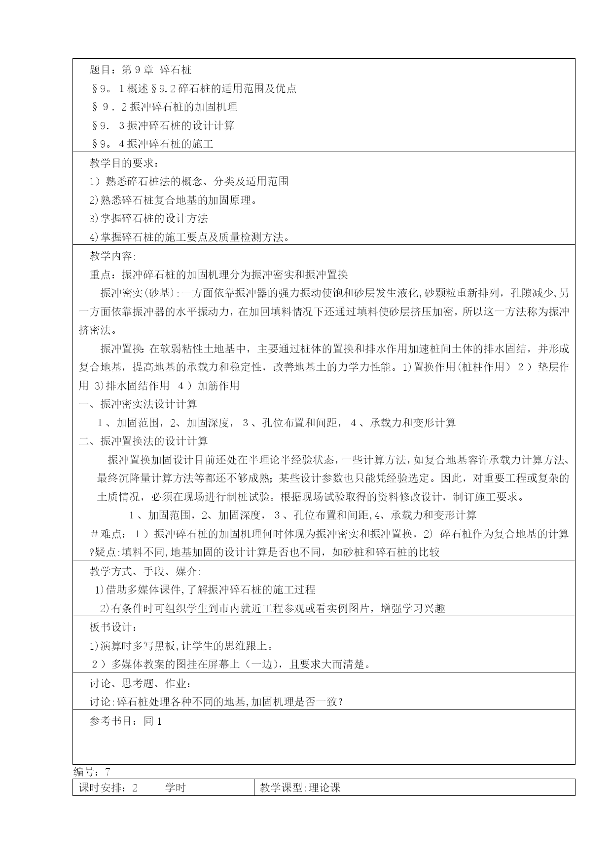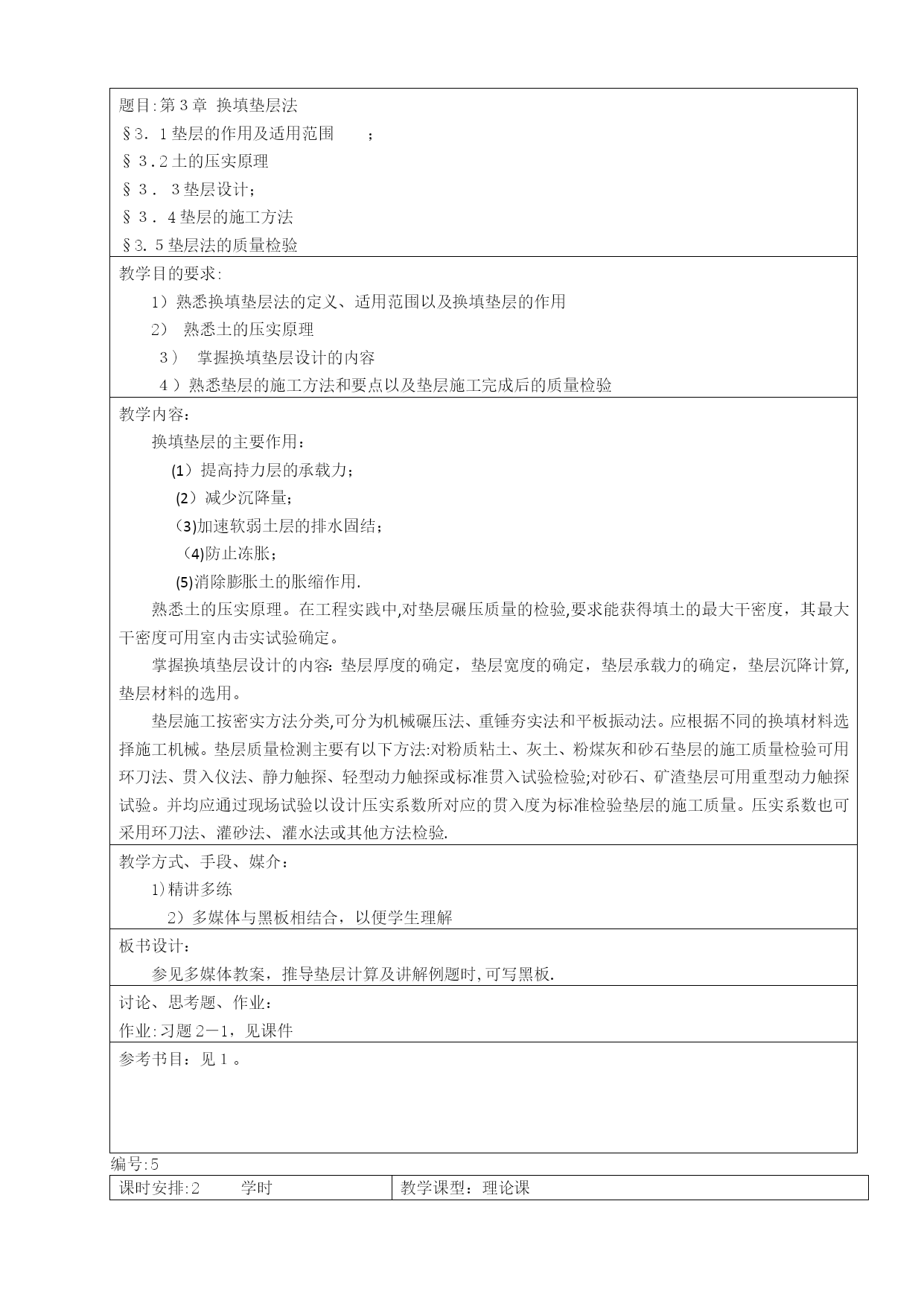 地基处理技术(完整资料)(可以直接使用,可编辑优秀版资料,欢迎下载)重庆交通大学教案编号:1课时安排:1学时教学课型:理论课题目:第1章绪论§1。1地基处理的目的和意义§1.2地基处理方法的分类及应用范围§1。3地基处理的方法的选用原则§1.4地基处理工程的施工管理教学目的要求:1)熟悉地基处理的目的和意义2)掌握岩土工程中经常遇到的软弱土和不良土种类3)掌握换填垫层法、振冲挤密法、排水固结法、置换法、加筋法、胶结法和冷热处理法等地基处理方法及其适用范围.4)熟悉地基处理方法选用原则、地基处理工程的施工管理和效果检验5)了解地基处理技术的最新发展方向教学内容:重点:地基处理是利用换填、夯实、挤密、排水、胶结、加筋和热学等方法对地基土进行加固,用以改良地基土的工程特性,提高地基土的抗剪强度,降低地基土的压缩性,改善地基土的透水特性和地基的动力特性以及特殊土的不良地基特性。岩土工程中经常遇到的软弱土和不良土种类:软粘土、人工填土、部分砂土和粉土、湿陷性土、有机质土和泥炭土、膨胀土、多年冻土、盐渍土、岩溶、土洞、山区地基以及垃圾填埋地基等。掌握换填垫层法、振冲挤密法、排水固结法、置换法、加筋法、胶结法和冷热处理法等地基处理方法及其适用范围。选用地基处理方法要力求做到安全适用、确保质量、经济合理、技术先进。对于选定的地基处理方案,在设计完成之后,必须严格施工管理,否则会尚失良好处理方案的优越性。教学方式、手段、媒介:1)借助多媒体课件教学,图文并茂,增加感性认识2)分散难点、疑点,后续各章及课程设计中逐步理解及掌握板书设计:参见多媒体教案。讨论、思考题、作业:见教材p16参考书目:1)龚晓南·地基处理新技术·西安·陕西科学技术出版社,19972)地基处理手册编写委员会·地基处理手册·北京·中国建筑工业出版社,20003)叶书麟·地基处理·北京·中国建筑工业出版社,1988编号:2课时安排:1学时教学课型:理论课题目:第2章地基处理监测与检验方法教学目的要求:1)熟悉地基处理现场监测与质量检验的目的2)熟悉地基处理现场监测与质量检验的内容与方法教学内容:地基处理现场监测和质量检验测试是地基处理工程的重要环节,对地基处理的效果检验,应在地基处理施工结束后,经过一定时间休止恢复后再进行。因为地基加固后有一个时效作用,复合地基的强度和模量的提高往往需要一定的时间。熟悉地基处理现场监测与质量检验的目的:(1)为工程设计提供依据;(2)作为大面积施工的控制和指导;(3)为地基处理工程验收提供依据;(4)为理论研究提供实验依据。熟悉地基处理现场监测与质量检验的内容与方法。主要包括以下几个方面:(1)地基与桩体强度:包括单桩和复合地基静载荷试验、标准贯入试验、静力触探与动力触探试验、桩身高应变检测、钻芯法等;(2)地基变形:包括地基沉降与水平位移测试;(3)应力监测:包括土压力和孔隙水压力测试;(4)桩身完整性:采用桩身低应变检测和声波透射法测试;(5)动力特性:采用波速测试、地基刚度测试等。地基处理效果检验中,有时需要采用多种手段进行检验,以便综合评价地基处理效果。熟悉现场监测与质量检验应注意的问题。掌握地基水平位移及沉降观测方法,单桩竖向静载荷试验、天然地基载荷试验和复合地基载荷试验的试验方法及承载力确定方法。熟悉地基土应力测试、静力触探和动力触探在地基处理工程监测中的应用。教学方式、手段、媒介:1)引用工程实例,将地基处理现场监测与质量检验的重要性讲透彻2)借助多媒体功能,播放一些图片,使学生理解地基处理现场监测与质量检验的内容与方法板书设计:参见多媒体教案讨论、思考题、作业:思考题:1、地基处理现场监测与质量检验的目的?参考书目:同1。编号:3课时安排:2学时教学课型:理论课题目:第3章换填垫层法§3.1垫层的作用及适用范围;§3.2土的压实原理§3.3垫层设计;§3.4垫层的施工方法§3.5垫层法的质量检验教学目的要求:1)熟悉换填垫层法的定义、适用范围以及换填垫层的作用2)熟悉土的压实原理3)掌握换填垫层设计的内容4)熟悉垫层的施工方法和要点以及垫层施工完成后的质量检验教学内容:换填垫层的主要作用:(1)提高持力层的承载力;(2)减少沉降量;(3)加速软弱土层的排水固结;(4)防止冻胀;(5)消除膨胀土的胀缩作用.熟悉土的压实原理。在工程实践中,对垫层碾压质量的检验,要求能获得填土的最大干密度,其最大干密度可用室内击实试验确定。掌握换填垫层设计的内容:垫层厚度的确定,垫层宽度的确定,垫层承载力的确定,垫层沉降计算,垫层材料的选用。垫层施工按密实方法分类,可分为机械碾压法、重锤夯实法和平板振动法。应根据不同
