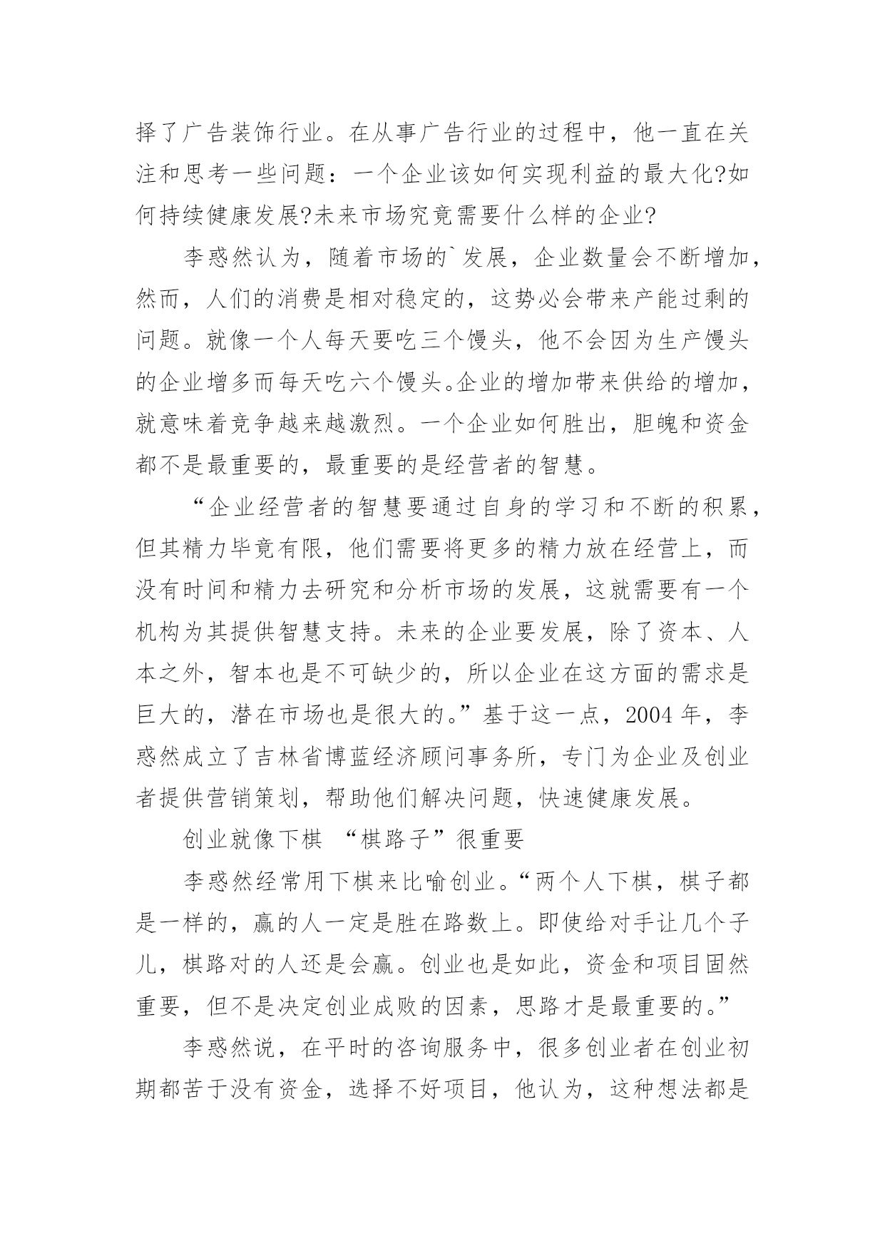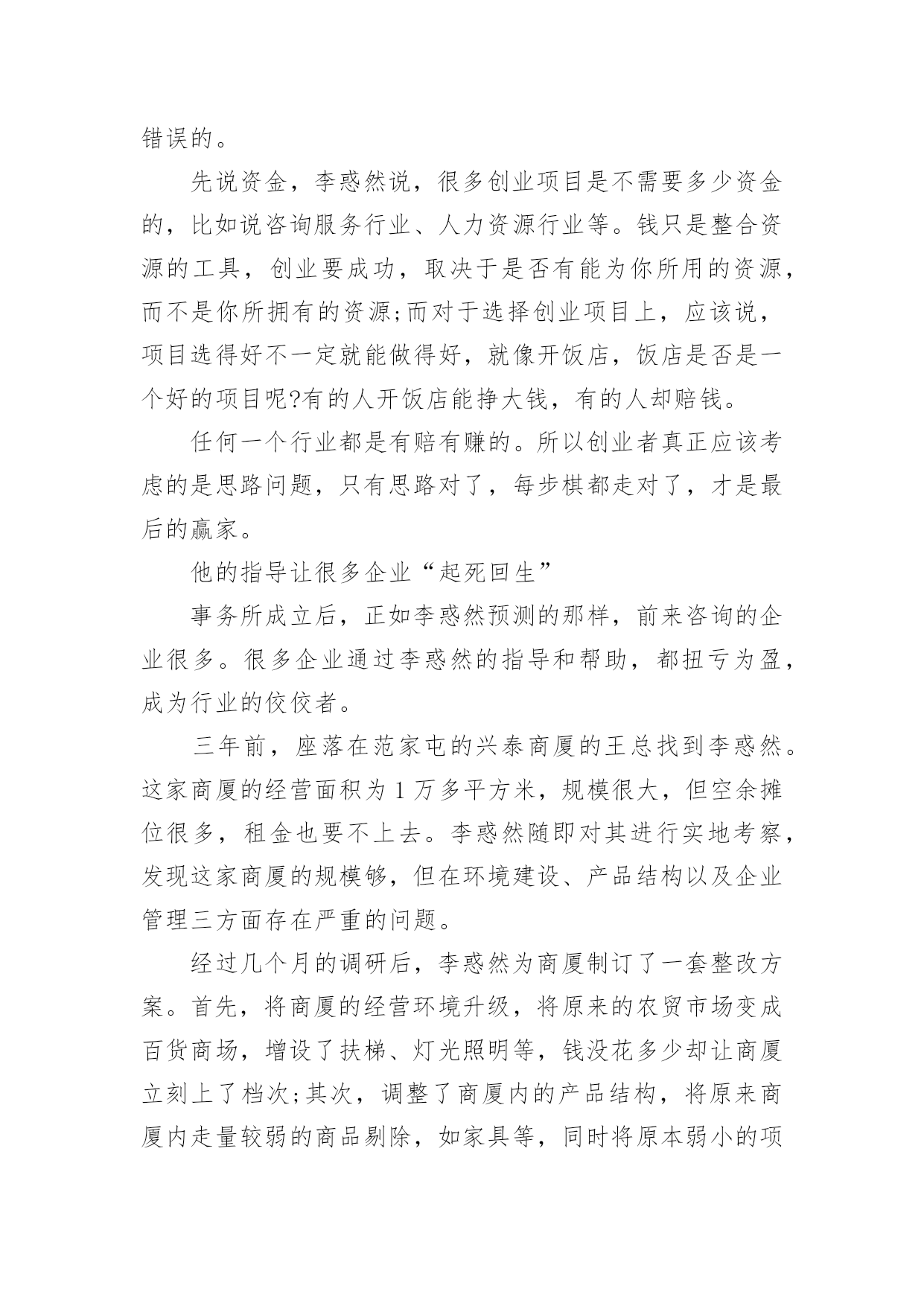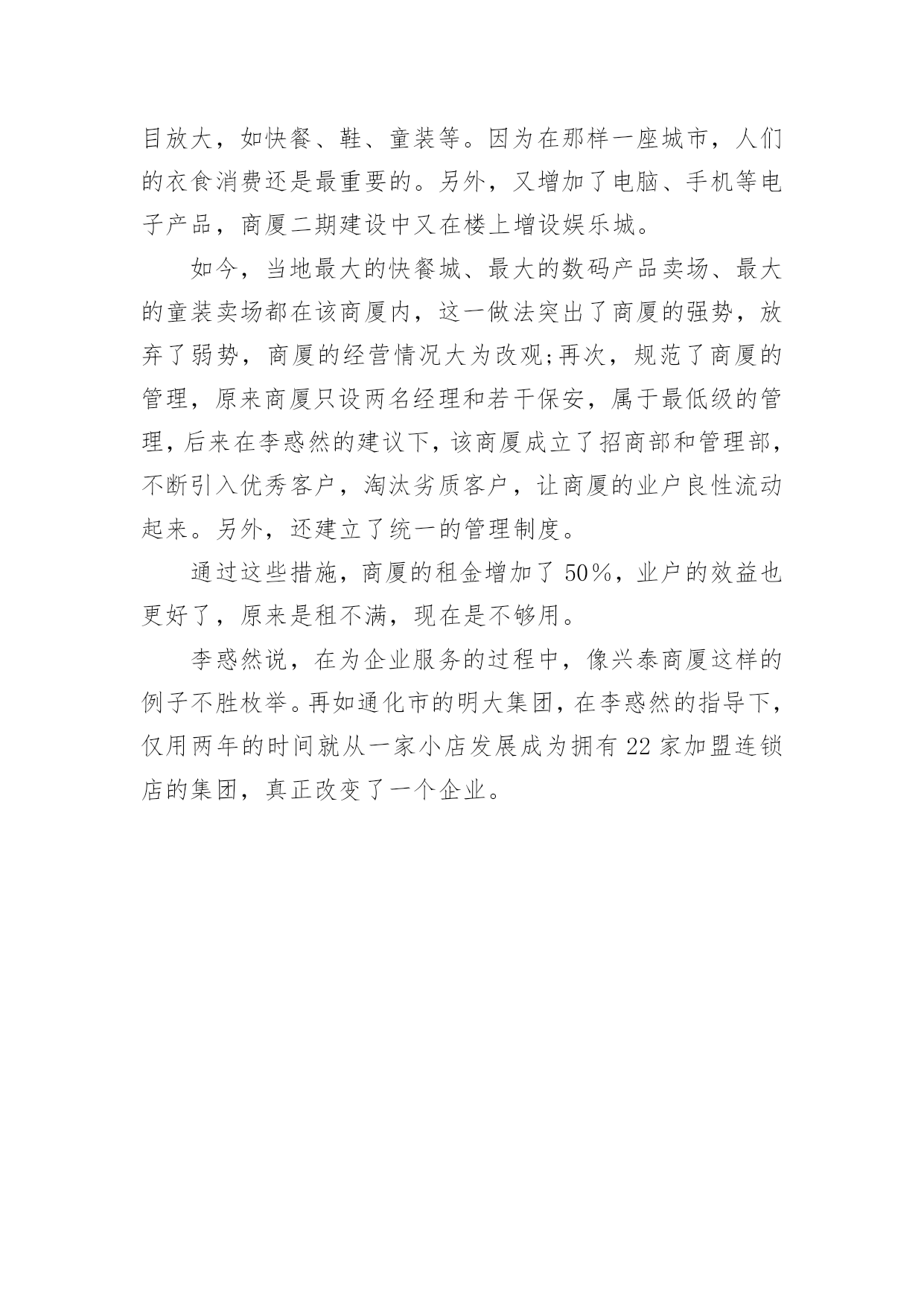 创业导师宣讲资料创业导师宣讲资料企业发展战略专家、中小企业营销策划专家、著名实战派微观经济研究人……和小编一起来看看下文关于创业导师宣讲资料,欢迎借鉴!吉林省博蓝经济顾问事务所的李惑然头衔很多,但大家都愿意称他为“创业专家”李老师。十几年前,他从一名国企高管“下海”成为一名企业家,如今,他用自己在商海的实战经验和自学的经济理论为诸多企业以及有创业意愿的人进行企业发展营销策划指导,帮助很多死气沉沉的企业重焕生机,成为业界的领军,指导很多创业者走出迷茫,步入成功。他说,每一次为别人出谋划策的同时,自己也得到了进步,在帮助别人创业的同时,自己的创业道路也越走越顺畅――对市场的洞悉让他选择了“下海”1987年李惑然参加工作,当时他在一家国企上班,由于他的勤奋和聪颖,很快就从一名基层工作人员发展成为一名高管。然而,就在他的事业如日中天时,1996年,他却做出一个惊人之举“下海”。“当时很多人都不理解我,觉得我放着稳定工作不干,非要自己去创业,前途未卜。可我觉得,中国市场很快就会发生翻天覆地的变化,自主创业在不久的将来就会成为一种趋势,发展潜力巨大。”李惑然说。“下海”初期,李惑然选择了广告装饰行业。在从事广告行业的过程中,他一直在关注和思考一些问题:一个企业该如何实现利益的最大化?如何持续健康发展?未来市场究竟需要什么样的企业?李惑然认为,随着市场的`发展,企业数量会不断增加,然而,人们的消费是相对稳定的,这势必会带来产能过剩的问题。就像一个人每天要吃三个馒头,他不会因为生产馒头的企业增多而每天吃六个馒头。企业的增加带来供给的增加,就意味着竞争越来越激烈。一个企业如何胜出,胆魄和资金都不是最重要的,最重要的是经营者的智慧。“企业经营者的智慧要通过自身的学习和不断的积累,但其精力毕竟有限,他们需要将更多的精力放在经营上,而没有时间和精力去研究和分析市场的发展,这就需要有一个机构为其提供智慧支持。未来的企业要发展,除了资本、人本之外,智本也是不可缺少的,所以企业在这方面的需求是巨大的,潜在市场也是很大的。”基于这一点,2004年,李惑然成立了吉林省博蓝经济顾问事务所,专门为企业及创业者提供营销策划,帮助他们解决问题,快速健康发展。创业就像下棋“棋路子”很重要李惑然经常用下棋来比喻创业。“两个人下棋,棋子都是一样的,赢的人一定是胜在路数上。即使给对手让几个子儿,棋路对的人还是会赢。创业也是如此,资金和项目固然重要,但不是决定创业成败的因素,思路才是最重要的。”李惑然说,在平时的咨询服务中,很多创业者在创业初期都苦于没有资金,选择不好项目,他认为,这种想法都是错误的。先说资金,李惑然说,很多创业项目是不需要多少资金的,比如说咨询服务行业、人力资源行业等。钱只是整合资源的工具,创业要成功,取决于是否有能为你所用的资源,而不是你所拥有的资源;而对于选择创业项目上,应该说,项目选得好不一定就能做得好,就像开饭店,饭店是否是一个好的项目呢?有的人开饭店能挣大钱,有的人却赔钱。任何一个行业都是有赔有赚的。所以创业者真正应该考虑的是思路问题,只有思路对了,每步棋都走对了,才是最后的赢家。他的指导让很多企业“起死回生”事务所成立后,正如李惑然预测的那样,前来咨询的企业很多。很多企业通过李惑然的指导和帮助,都扭亏为盈,成为行业的佼佼者。三年前,座落在范家屯的兴泰商厦的王总找到李惑然。这家商厦的经营面积为1万多平方米,规模很大,但空余摊位很多,租金也要不上去。李惑然随即对其进行实地考察,发现这家商厦的规模够,但在环境建设、产品结构以及企业管理三方面存在严重的问题。经过几个月的调研后,李惑然为商厦制订了一套整改方案。首先,将商厦的经营环境升级,将原来的农贸市场变成百货商场,增设了扶梯、灯光照明等,钱没花多少却让商厦立刻上了档次;其次,调整了商厦内的产品结构,将原来商厦内走量较弱的商品剔除,如家具等,同时将原本弱小的项目放大,如快餐、鞋、童装等。因为在那样一座城市,人们的衣食消费还是最重要的。另外,又增加了电脑、手机等电子产品,商厦二期建设中又在楼上增设娱乐城。如今,当地最大的快餐城、最大的数码产品卖场、最大的童装卖场都在该商厦内,这一做法突出了商厦的强势,放弃了弱势,商厦的经营情况大为改观;再次,规范了商厦的管理,原来商厦只设两名经理和若干保安,属于最低级的管理,后来在李惑然的建议下,该商厦成立了招商部和管理部,不断引入优秀客户,淘汰劣质客户,让商厦的业户良性流动起来。另外,还建立了统一的管理制度。通过这些措施,商厦的租金增加了50%,业户的效益也更好了,原来是租不满,现在是不够用。李惑然说,在为企业服务的过程中,像兴泰商厦这样的例子不胜枚举。再如通化市的明大集团,在李惑然的指导下,仅用两年的时间就从一家小店发展成为拥有22家加盟连锁店的集团,真正改变了一个企