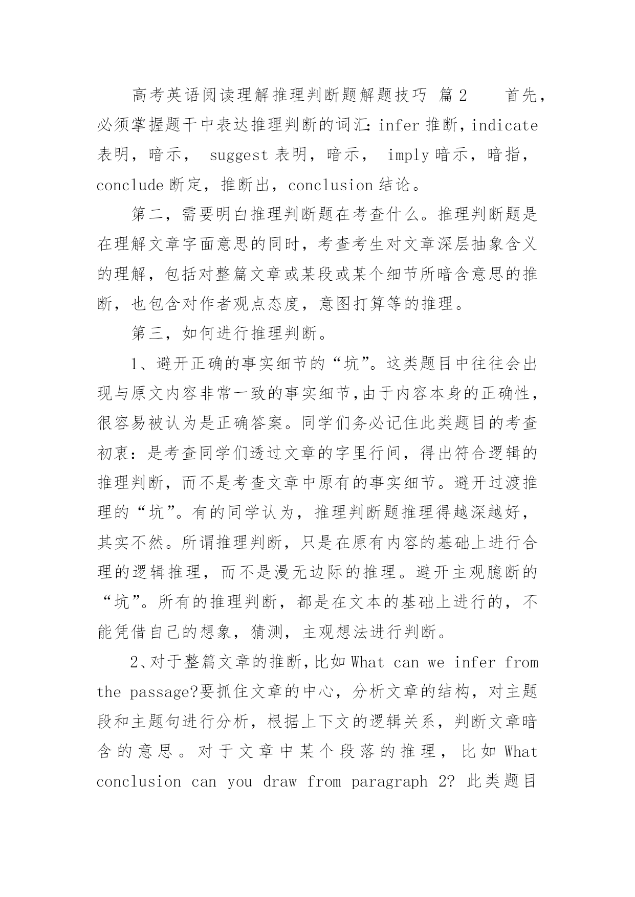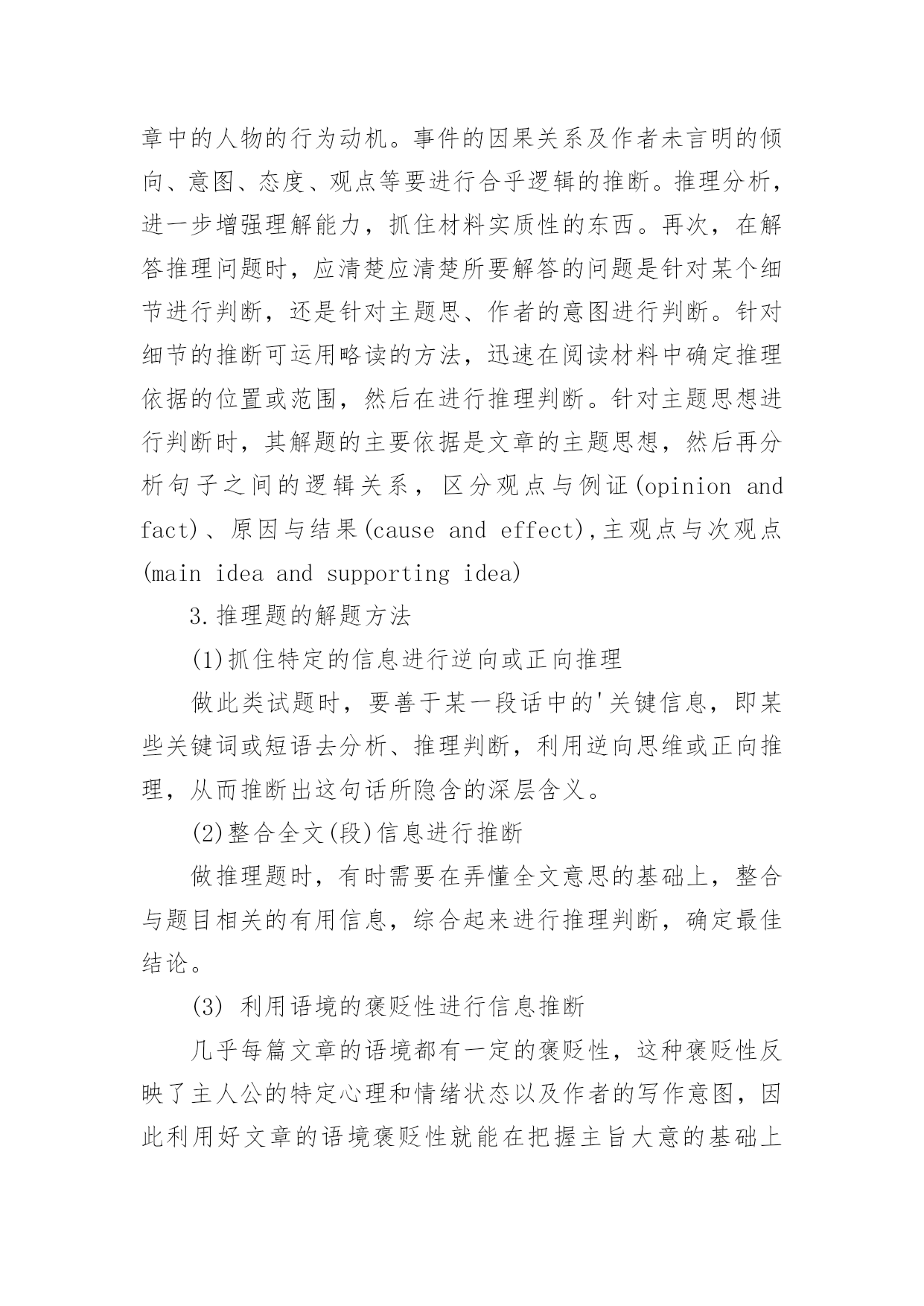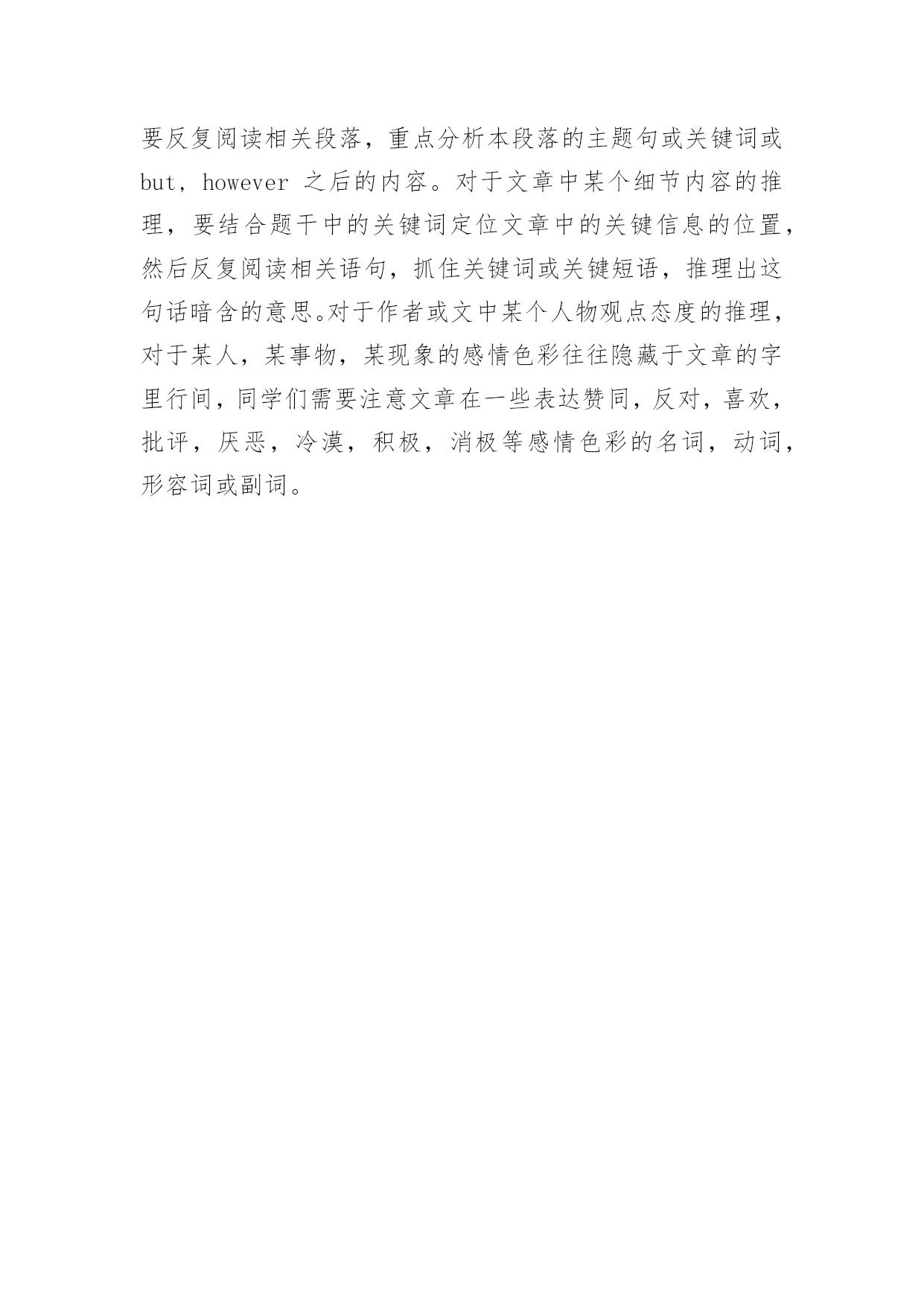 高考英语阅读理解推理判断题解题技巧高考英语阅读理解推理判断题解题技巧英语阅读能力的考查不但要求理解具体事实细节,也要求理解抽象的含义,既要求理解字面意思,又要求理解其深层含义,包括作者的态度、观点、意图等;既要求理解文章中某句、某段的含义及全文的逻辑关系,又要求根据其含义及逻辑关系进行推理和判断。下面是小编为大家收集的关于高考英语阅读理解推理判断题解题技巧,欢迎大家阅读!高考英语阅读理解推理判断题解题技巧篇1推理判断属于高层次阅读理解,在解答时应注意以下几点:1.掌握常见的提问形式常用infer,imply,suggest,conclude,learn,intend,mean,describe,purpose等词提问,或提问中含有表示推测的情态动词,如:can,could,might,would等何其他表示可能性的副词或词组,如probably,mostlikely等。2.解题思路做题时一定要从整体上把握语篇内容,在语篇的表面意义与隐含意义、已知信息与未知信息间架起桥梁,透过字里行间,去体会作者的“弦外音”.在阅读是要抓住文章的主题和细节,分析文章结构,根据上下文内在联系,挖掘文章的深沉含义。首先在进行推理时,要仔细阅读短文,千万不可脱离原文而凭个人的看法,主观臆断。其次对于暗含在文章中的人物的行为动机。事件的因果关系及作者未言明的倾向、意图、态度、观点等要进行合乎逻辑的推断。推理分析,进一步增强理解能力,抓住材料实质性的东西。再次,在解答推理问题时,应清楚应清楚所要解答的问题是针对某个细节进行判断,还是针对主题思、作者的意图进行判断。针对细节的推断可运用略读的方法,迅速在阅读材料中确定推理依据的位置或范围,然后在进行推理判断。针对主题思想进行判断时,其解题的主要依据是文章的主题思想,然后再分析句子之间的逻辑关系,区分观点与例证(opinionandfact)、原因与结果(causeandeffect),主观点与次观点(mainideaandsupportingidea)3.推理题的解题方法(1)抓住特定的信息进行逆向或正向推理做此类试题时,要善于某一段话中的'关键信息,即某些关键词或短语去分析、推理判断,利用逆向思维或正向推理,从而推断出这句话所隐含的深层含义。(2)整合全文(段)信息进行推断做推理题时,有时需要在弄懂全文意思的基础上,整合与题目相关的有用信息,综合起来进行推理判断,确定最佳结论。(3)利用语境的褒贬性进行信息推断几乎每篇文章的语境都有一定的褒贬性,这种褒贬性反映了主人公的特定心理和情绪状态以及作者的写作意图,因此利用好文章的语境褒贬性就能在把握主旨大意的基础上对文章进行准确的逻辑判断。认真阅读原文并找出反映语境褒贬性及变化的标志性词汇或句子,对我们掌握文章主旨大意,了解主人公的心理特点几发展变化,从而进行正确的逻辑判断很有好处。(4)根据文章的结论推断作者的态度作者的态度、倾向是作者对陈述的观点是赞同、反对还是犹豫不定,对记述或描写的人、物或事件是赞颂、同情、冷漠还是厌恶、憎恨。作者的这种思想倾向和感情色彩往往隐含在文章的字里行间,或流露于修饰的词语之中。因此,在推断过程中,应特别注意文章中作者的措辞,尤其是表达感情色彩的形容词。(5)根据上下文的逻辑关系得出结论逻辑结论是指严格根据文章中所陈述的事实、论点、例证等一系列论据材料进行推理,从而得出合乎逻辑的结论,而不是根据自己的经验、态度、观点或爱好去理解文章的内涵。做这类题时,应把握作者的写作思路,预测下文可能发展的内容。文章可按照事件发展的经过描写,也可按因果关系、对比关系来描写。(6)结合自己已有的知识进行推断知识推断是根据文章中所阐述的细节,运用自己掌握的基础知识进行分析、推敲,从而得出符合文章意思的结论的的一种推断方法。知识推断题一般都是针对细节。解答此类题不仅需要我们有一定的社会基础知识,而且还需要对细节以及有关背景知识有充分的理解。高考英语阅读理解推理判断题解题技巧篇2首先,必须掌握题干中表达推理判断的词汇:infer推断,indicate表明,暗示,suggest表明,暗示,imply暗示,暗指,conclude断定,推断出,conclusion结论。第二,需要明白推理判断题在考查什么。推理判断题是在理解文章字面意思的同时,考查考生对文章深层抽象含义的理解,包括对整篇文章或某段或某个细节所暗含意思的推断,也包含对作者观点态度,意图打算等的推理。第三,如何进行推理判断。1、避开正确的事实细节的“坑”。这类题目中往往会出现与原文内容非常一致的事实细节,由于内容本身的正确性,很容易被认为是正确答案。同学们务必记住此类题目的考查初衷:是考查同学们透过文章的字里行间,得出符合逻辑的推理判断,而不是考查文章中原有的事实细节。避开过渡推理的“坑”。有的