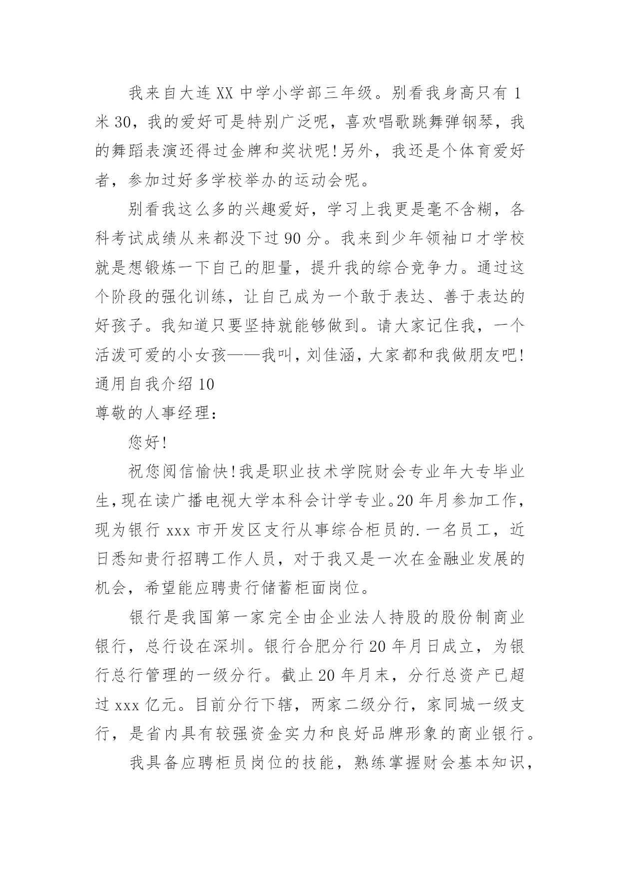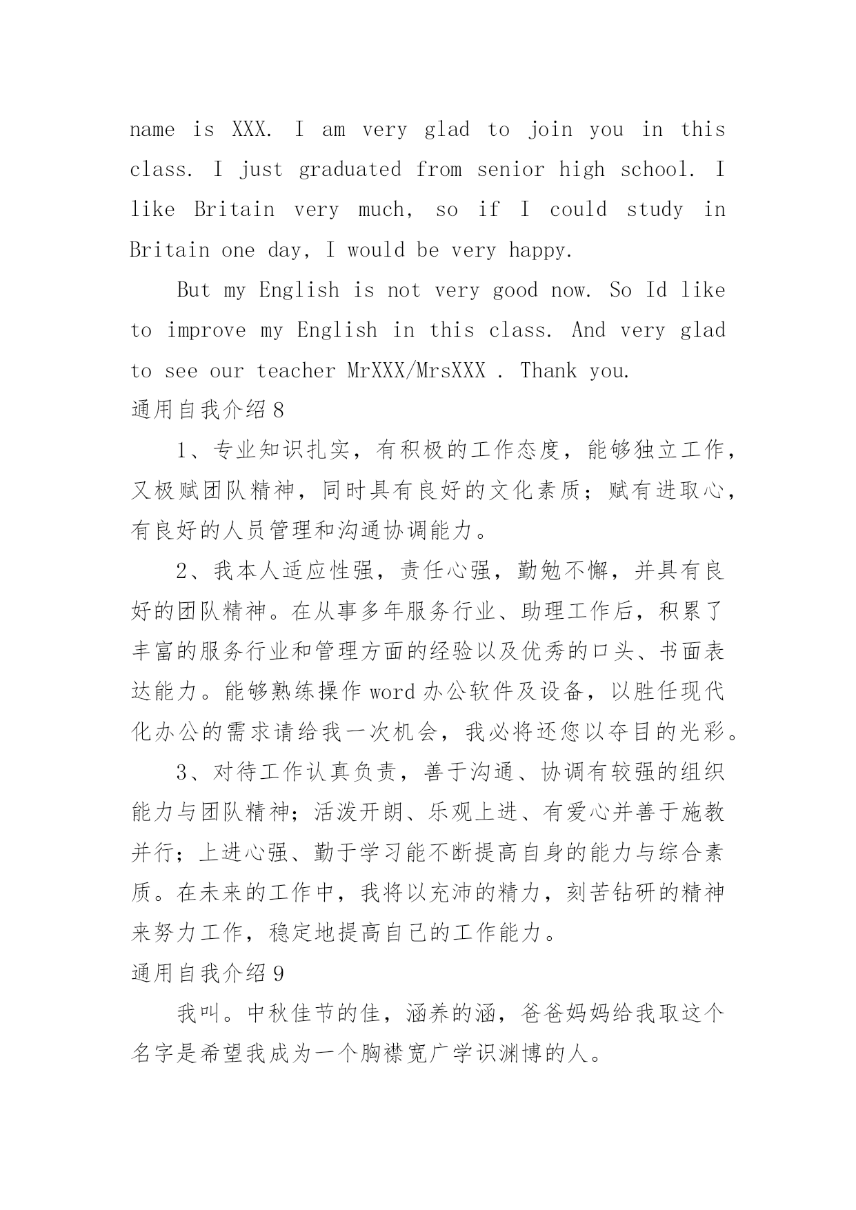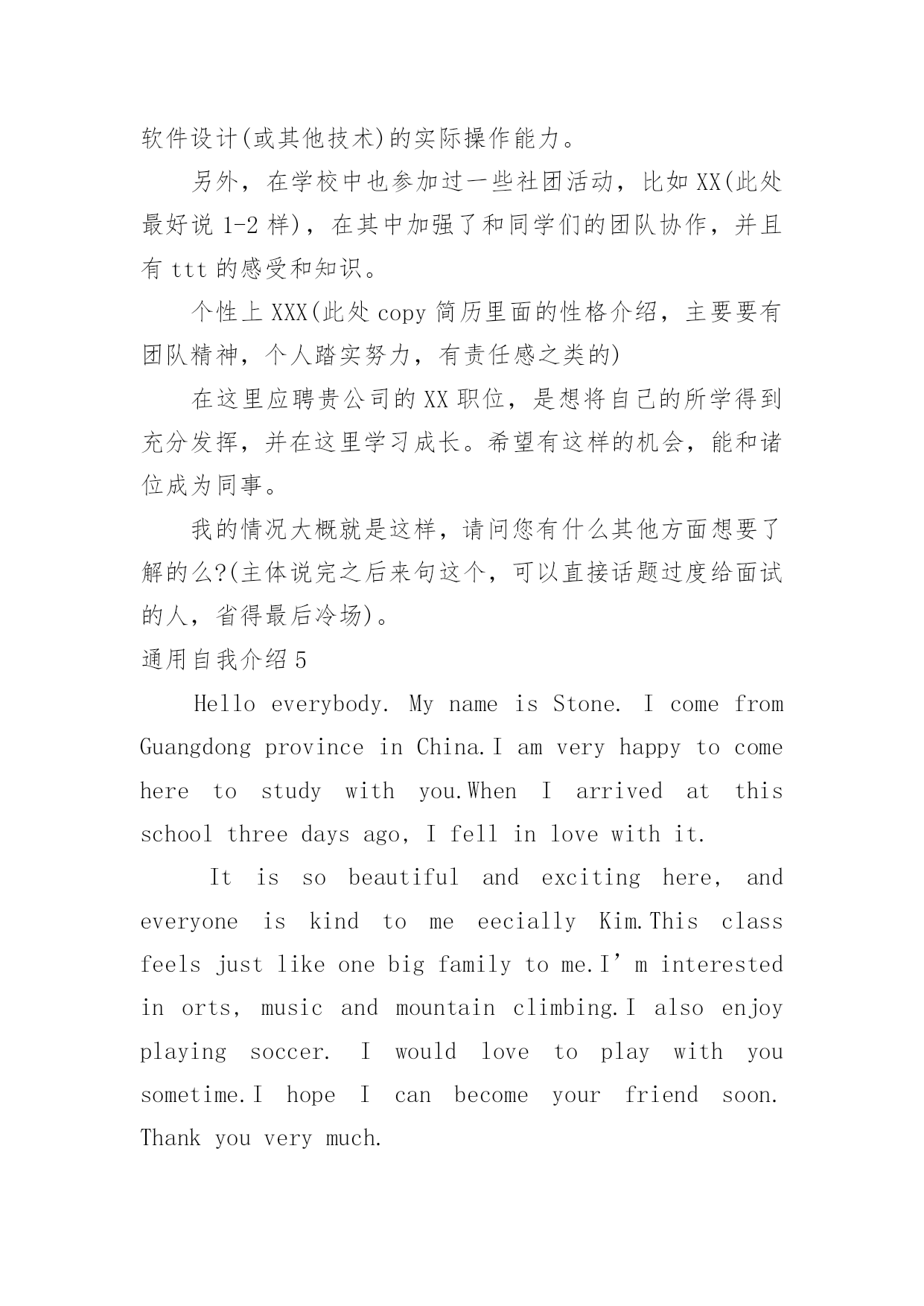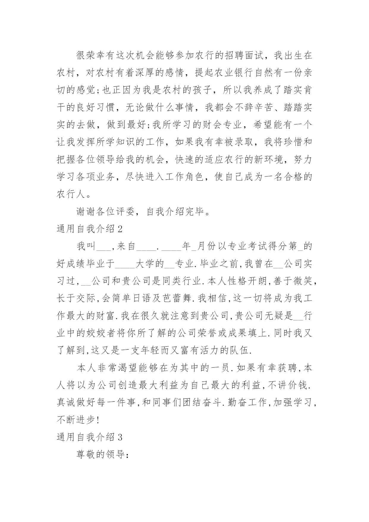 自我介绍通用自我介绍当来到的一个陌生的地方时,通常需要我们进行自我介绍,自我介绍是人与人进行沟通的出发点。相信大家又在为写自我介绍犯愁了吧!以下是小编为大家整理的通用自我介绍,欢迎大家借鉴与参考,希望对大家有所帮助。通用自我介绍1尊敬的各位评委:你们好!首先做一下简单自我介绍,我叫,今年岁,毕业与学校,学习的财会专业,取得了会计证等等,在校期间多次获得奖学金,荣获名誉称号之类。去年月份毕业以后,我有幸在有限责任公司工作,优雅的人文环境和浓厚的学术氛围,激励着我不断地拼搏、进取。在这半年的时间里,我工作主动,责任心强,认真细致,工作业绩得了部门主管领导的一致认可。回顾这几年的工作学习生活,感触很深,但觉的收获还是颇丰的。学到的不仅仅是专业知识,还有社会经验,为人处事等等,养成和发展了良好的团队合作精神和积极的学习进取精神。自己的知识水平、思想境界、工作能力都迈上了一个新的台阶。很荣幸有这次机会能够参加农行的招聘面试,我出生在农村,对农村有着深厚的感情,提起农业银行自然有一份亲切的感觉;也正因为我是农村的孩子,所以我养成了踏实肯干的良好习惯,无论做什么事情,我都会不辞辛苦、踏踏实实的去做,做到最好;我所学习的财会专业,希望能有一个让我发挥所学知识的工作,如果我有幸被录取,我将珍惜和把握各位领导给我的机会,快速的适应农行的新环境,努力学习各项业务,尽快进入工作角色,使自己成为一名合格的农行人。谢谢各位评委,自我介绍完毕。通用自我介绍2我叫___,来自____.____年_月份以专业考试得分第_的好成绩毕业于____大学的__专业.毕业之前,我曾在__公司实习过,__公司和贵公司是同类行业.本人性格开朗,善于微笑,长于交际,会简单日语及芭蕾舞.我相信,这一切将成为我工作最大的财富.我在很久就注意到贵公司,贵公司无疑是__行业中的姣姣者将你所了解的公司荣誉或成果填上.同时我又了解到,这又是一支年轻而又富有活力的队伍.本人非常渴望能够在为其中的一员.如果有幸获聘,本人将以为公司创造最大利益为自己最大的利益,不讲价钱.真诚做好每一件事,和同事们团结奋斗.勤奋工作,加强学习,不断进步!通用自我介绍3尊敬的领导:您好!首先衷心感谢您在百忙之中抽出时间来阅读我的自荐材料,本人久慕贵公司盛名,深知贵公司实力雄厚、工作氛围活跃、工作态度严谨、极具活力。若能用我所学的知识,为贵公司效力将是我无尚的光荣。希望我的个人自我介绍,能为贵公司奉献我的绵薄之力。我叫张潘,是一名即将于20xx年07月毕业的湖南科技职业学院计算机多媒体专业的学生。借此择业之际,我怀着一颗赤诚的心和对事业的执著追求,真诚地推荐自己。因为敢于冒险,而品味过成功的丰硕果实;因为探索冒险,也体验过触礁的震荡和凄凉。但是这一切都锻炼了我作为企业人员所须具备的成熟与胆识!大学的学习生活使我领悟到了人生的真谛。经过大学三年多的洗礼,不仅给予了我扎实的专业知识,还使我在生活,实践,交际等社会能力方面得以锻炼,为将来所从事的工作打下了良好的基础。从大一开始利用周末时间到长沙浪漫今生婚庆公司做兼职员工,负责婚礼现场布置、灯光,业绩突出,提高了实际工作经验,并多次受到公司的表扬;此外利用寒暑假时间在电脑公司做学徒,工作扎实,并多次获得奖金,后被提拔为公司技术部做技术员;大二利用周末时间在房地产公司做业务员,并参加了长沙房交会宣传工作;此外还和同学一起组建卓越战团,担任雨花区业务经理,与湖南移动总公司长沙分公司合作,从事移动校园业务工作。在各项实践工作中锻炼了我的管理、组织、策划等各方面的能力,我认为一个人只有把聪明才智应用到实际上工作中去,服务于社会,有利于社会,让效益和效率来证明自己,才能真正体现自己的自身价值!我坚信,路是一步一步走出来的。只有脚踏实地,努力工作,才能发挥出人的全部潜力,做出更出色的成绩,实现人生的最大价值!“我以心去开取心,我以火去点燃火,我以高尚的灵魂去铸造灵魂的高尚,我以诚挚的情感去培养感情的诚挚。”我热爱贵公司所从事的事业,殷切地期望能够在您的领导下,为这一光荣的事业添砖加瓦,并且在实践中不断学习、进步。下页附求职简历表,盼面谈!收笔之际,郑重地提一个小小的要求:无论您是否选择我,尊敬的领导,希望您能够接受我诚恳的谢意!祝愿贵公司事业蒸蒸日上此致敬礼!自荐人:xxxxx年xx月xx日通用自我介绍4尊敬的领导:您好!我是XXX毕业于XX学校tt专业,获得的是XX学位。在学校期间,主修的专业课有XXX(此处添加技术类专业课,尤其是和应聘工作相关的),根据所学的知识,也参加过一些具体项目的事实,比如X项目,在其中负责XX模块或者XX工作,应用了ttt计算机语言或者技术,取得了XX什么样的成果。并在实践中,加深了对tt的认识,提高了软件设计(或其他技术)的实际操作能力。另外,在学