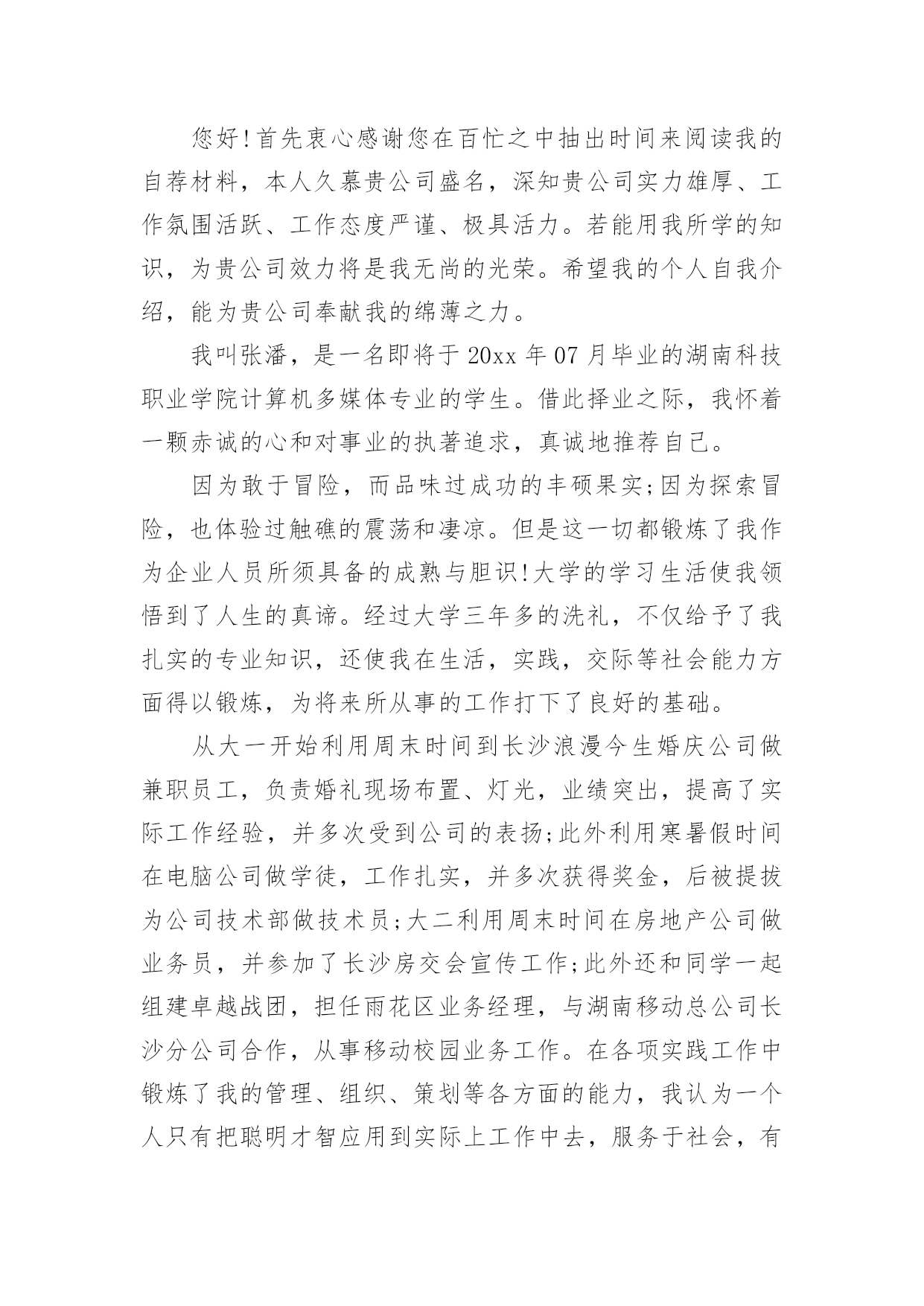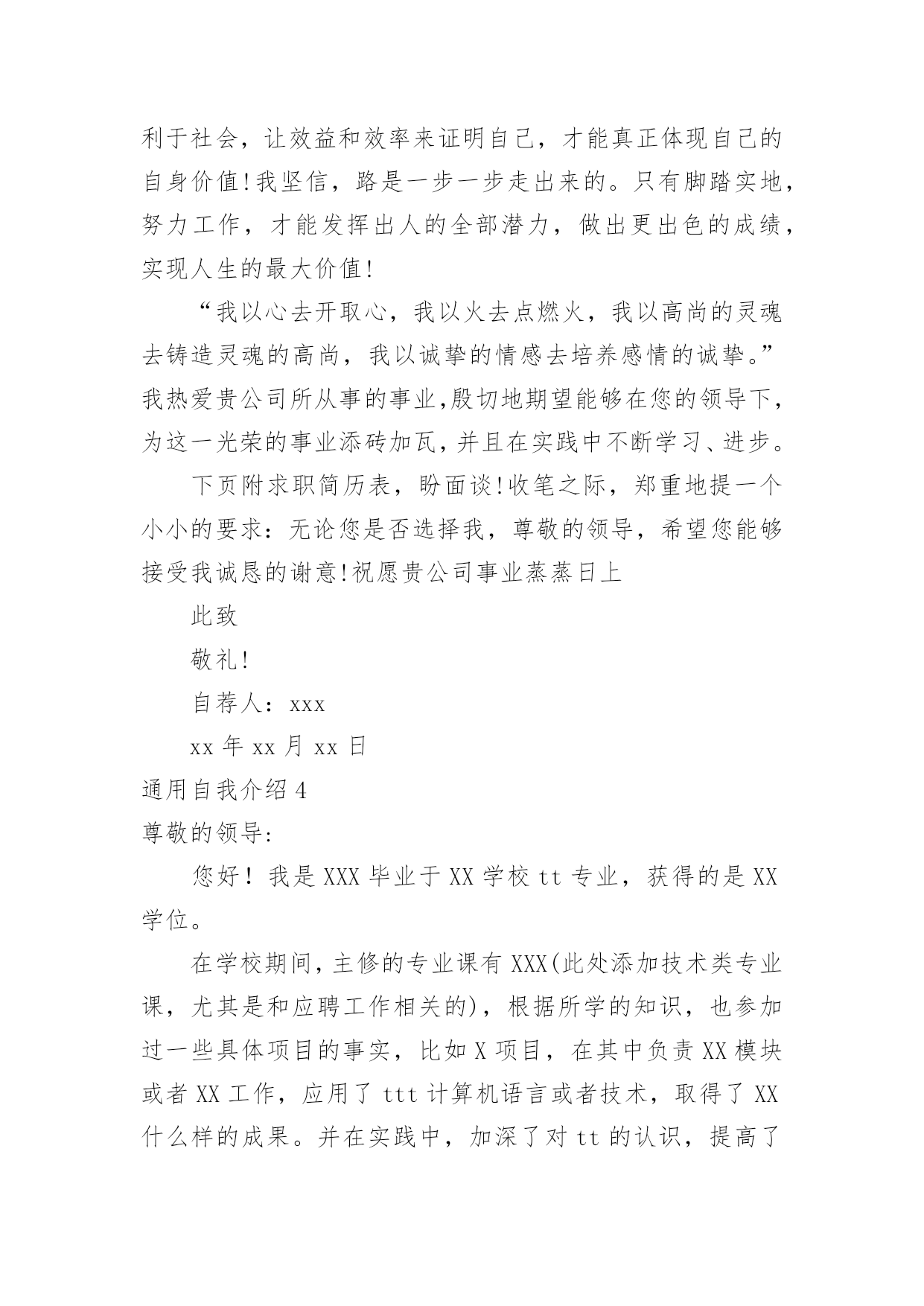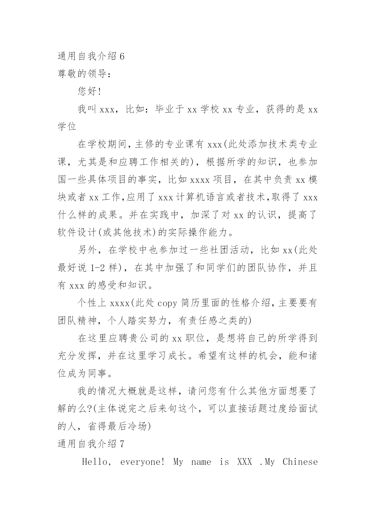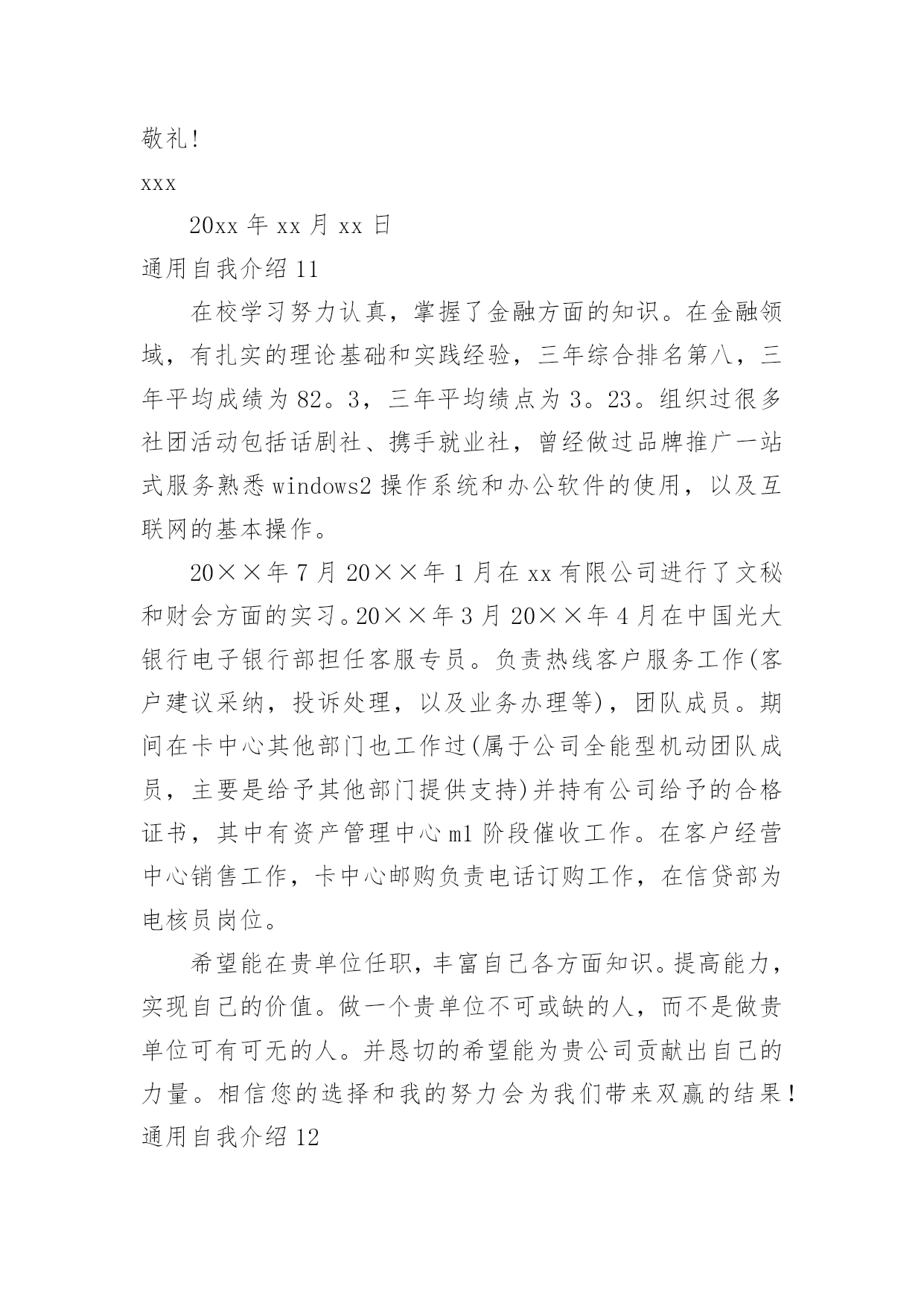 自我介绍通用自我介绍当来到的一个陌生的地方时,通常需要我们进行自我介绍,自我介绍是人与人进行沟通的出发点。相信大家又在为写自我介绍犯愁了吧!以下是小编为大家整理的通用自我介绍,欢迎大家借鉴与参考,希望对大家有所帮助。通用自我介绍1尊敬的各位评委:你们好!首先做一下简单自我介绍,我叫,今年岁,毕业与学校,学习的财会专业,取得了会计证等等,在校期间多次获得奖学金,荣获名誉称号之类。去年月份毕业以后,我有幸在有限责任公司工作,优雅的人文环境和浓厚的学术氛围,激励着我不断地拼搏、进取。在这半年的时间里,我工作主动,责任心强,认真细致,工作业绩得了部门主管领导的一致认可。回顾这几年的工作学习生活,感触很深,但觉的收获还是颇丰的。学到的不仅仅是专业知识,还有社会经验,为人处事等等,养成和发展了良好的团队合作精神和积极的学习进取精神。自己的知识水平、思想境界、工作能力都迈上了一个新的台阶。很荣幸有这次机会能够参加农行的招聘面试,我出生在农村,对农村有着深厚的感情,提起农业银行自然有一份亲切的感觉;也正因为我是农村的孩子,所以我养成了踏实肯干的良好习惯,无论做什么事情,我都会不辞辛苦、踏踏实实的去做,做到最好;我所学习的财会专业,希望能有一个让我发挥所学知识的工作,如果我有幸被录取,我将珍惜和把握各位领导给我的机会,快速的适应农行的新环境,努力学习各项业务,尽快进入工作角色,使自己成为一名合格的农行人。谢谢各位评委,自我介绍完毕。通用自我介绍2我叫___,来自____.____年_月份以专业考试得分第_的好成绩毕业于____大学的__专业.毕业之前,我曾在__公司实习过,__公司和贵公司是同类行业.本人性格开朗,善于微笑,长于交际,会简单日语及芭蕾舞.我相信,这一切将成为我工作最大的财富.我在很久就注意到贵公司,贵公司无疑是__行业中的姣姣者将你所了解的公司荣誉或成果填上.同时我又了解到,这又是一支年轻而又富有活力的队伍.本人非常渴望能够在为其中的一员.如果有幸获聘,本人将以为公司创造最大利益为自己最大的利益,不讲价钱.真诚做好每一件事,和同事们团结奋斗.勤奋工作,加强学习,不断进步!通用自我介绍3尊敬的领导:您好!首先衷心感谢您在百忙之中抽出时间来阅读我的自荐材料,本人久慕贵公司盛名,深知贵公司实力雄厚、工作氛围活跃、工作态度严谨、极具活力。若能用我所学的知识,为贵公司效力将是我无尚的光荣。希望我的个人自我介绍,能为贵公司奉献我的绵薄之力。我叫张潘,是一名即将于20xx年07月毕业的湖南科技职业学院计算机多媒体专业的学生。借此择业之际,我怀着一颗赤诚的心和对事业的执著追求,真诚地推荐自己。因为敢于冒险,而品味过成功的丰硕果实;因为探索冒险,也体验过触礁的震荡和凄凉。但是这一切都锻炼了我作为企业人员所须具备的成熟与胆识!大学的学习生活使我领悟到了人生的真谛。经过大学三年多的洗礼,不仅给予了我扎实的专业知识,还使我在生活,实践,交际等社会能力方面得以锻炼,为将来所从事的工作打下了良好的基础。从大一开始利用周末时间到长沙浪漫今生婚庆公司做兼职员工,负责婚礼现场布置、灯光,业绩突出,提高了实际工作经验,并多次受到公司的表扬;此外利用寒暑假时间在电脑公司做学徒,工作扎实,并多次获得奖金,后被提拔为公司技术部做技术员;大二利用周末时间在房地产公司做业务员,并参加了长沙房交会宣传工作;此外还和同学一起组建卓越战团,担任雨花区业务经理,与湖南移动总公司长沙分公司合作,从事移动校园业务工作。在各项实践工作中锻炼了我的管理、组织、策划等各方面的能力,我认为一个人只有把聪明才智应用到实际上工作中去,服务于社会,有利于社会,让效益和效率来证明自己,才能真正体现自己的自身价值!我坚信,路是一步一步走出来的。只有脚踏实地,努力工作,才能发挥出人的全部潜力,做出更出色的成绩,实现人生的最大价值!“我以心去开取心,我以火去点燃火,我以高尚的灵魂去铸造灵魂的高尚,我以诚挚的情感去培养感情的诚挚。”我热爱贵公司所从事的事业,殷切地期望能够在您的领导下,为这一光荣的事业添砖加瓦,并且在实践中不断学习、进步。下页附求职简历表,盼面谈!收笔之际,郑重地提一个小小的要求:无论您是否选择我,尊敬的领导,希望您能够接受我诚恳的谢意!祝愿贵公司事业蒸蒸日上此致敬礼!自荐人:xxxxx年xx月xx日通用自我介绍4尊敬的领导:您好!我是XXX毕业于XX学校tt专业,获得的是XX学位。在学校期间,主修的专业课有XXX(此处添加技术类专业课,尤其是和应聘工作相关的),根据所学的知识,也参加过一些具体项目的事实,比如X项目,在其中负责XX模块或者XX工作,应用了ttt计算机语言或者技术,取得了XX什么样的成果。并在实践中,加深了对tt的认识,提高了软件设计(或其他技术)的实际操作能力。另外,在学
