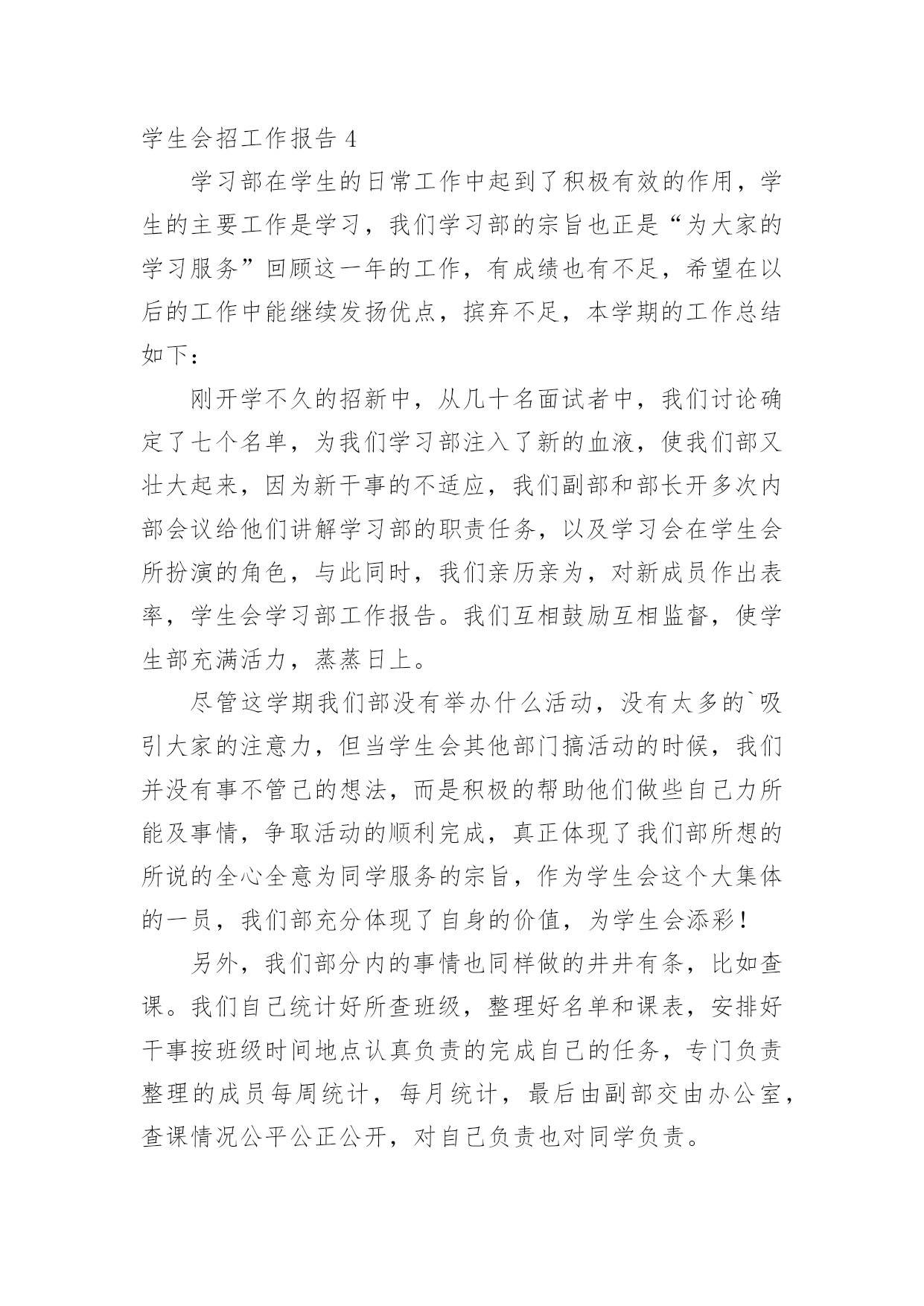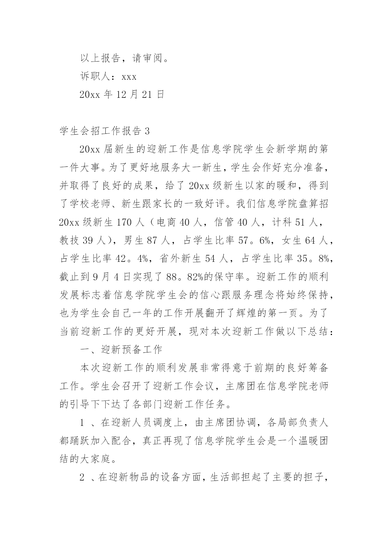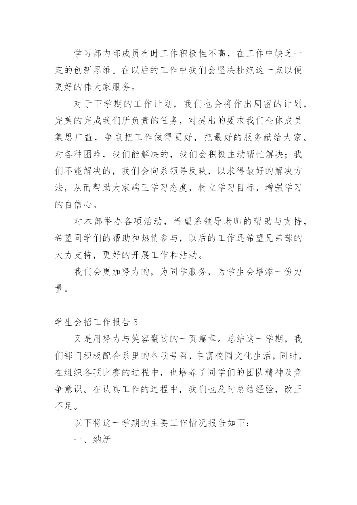 学生会招工作报告在经济发展迅速的今天,我们使用报告的情况越来越多,报告根据用途的不同也有着不同的类型。那么你真正懂得怎么写好报告吗?下面是小编收集整理的学生会招工作报告,欢迎阅读,希望大家能够喜欢。学生会招工作报告1一、坚持一个中心,两个基本点坚持以为学院活动寻找赞助商筹措经费为中心,搞好部门内部精神文明建设,完善部门例会、考核、培训制度。部门本学期坚持每月召开最少两次的工作会议,总结新干事在近来工作中遇到的问题,对干事进行工作技能、社交礼仪方面的培训,同时鼓励干事参与学院组织的每次活动。实施量化考核制度,对每次部门例会、学院活动不能及时到场参与又不请假的干事,记录在案,作为年终评比的依据。对有突出贡献的干事,在例会上给予相应的表扬。实行部门淘汰制,对于无任何贡献的干事,让其自动退出,该制度的实施对其他干事来说也是一种很好的鞭策手段,更能激励他们进步。在学院活动中,积极外出筹措经费,协调配合其他部门完成学院的每次活动,没有发生过任何因为我部门的工作而出现的错误。二、成绩有突出,工作有进展本学期在团委老师的指导下,在学生会主席和部长的带领下,部门的工作取得了较大的进步,赞助经费达2100元(不含赞助物资),除去相应宣传费用、提成,剩余经费1300元,与去年相比有了很大的提高。同时也与市中心的部分商家取得了相应的联系,让外联部的工作范围进一步的扩大。个人总结:在学生会外联部工作已经有一年半的时间了,从大一的一名干事到现在的一名副部,我看到了外联部在不断的成长,同时我自己也成长了很多。外联部的工作不同于其他部门,我们每天与外界打交道的更多,了解的也更多,需要建立更多的人脉关系。今年作为一名副部,给部门干事介绍的外界信息还是相对较少的,这一点是与别的学院相比是最大的差距,需要在以后的工作中加以改进。总的来说,这一年多来付出了时间付出了汗水,收获了知识,汲取了经验。一次次总结经验和教训以后修改的策划书这些都增深了我对事物的见解和洞察力,还有通过直接跟赞助商的对话,这些都提高了我的口才,锻炼了我的沟通能力,也丰富了我社会知识,增长了我的阅历,在外联部的内部工作安排上的协调方面也使得我对很多方面有了新的认识。所以,我还是想说,谢谢学长们的信任与支持。虽然我在这学期的工作中没有取得很优异成绩,我想在这些经验的帮助指导下,下学期的工作会顺利很多。不管前面多名困难,我也不会放弃,只有不懈的坚持、努力才能成功。在以上这样的活动中,我一点点的学习着,也一点点的进步着,虽然处事的经验还不是那么的丰富,考虑事情的方面也不是那么的周全,但我相信随着时间的积累和不断的学习,对于今后的工作我肯定会更加的充满信心。我也会怀着积极向上的良好态度和精神一直努力着。学生会招工作报告2各位代表:大家好。我是xx学院自律治保主任xxx,来自09通信工程一班,自20xx年四月接手自律工作以来,已经工作半年多了,本学期在院领导和老师的带领与指导下,在学生会全体同学的共同努力下,我们自律治保部圆满的完成了本学期的工作,切实做到了以务实的工作为广大同学服务,充分发挥学生会桥梁纽带作用,完成了一切关于所有同学切身利益的工作,在开展各项工作的过程中,密切配合分院和团委、学生会各个时期的工作,有效地开展了各种活动,先进行如下诉职:一、部门管理方面1、本学期自律治保部设部长一名,副部长二名,另有干事六名。在部门管理中,由部长统筹管理本部门,副部长分管各个学干工作,辅助部长完成各项工作,六名学干中分别为四男二女,分别完成每周特定的查勤工作。部长与副部长在完成一半工作的同时,也会注意观察每名学干的特长之处,发挥每名学干的优点,可以有效的提高工作效率,大家各司其职、齐心协力协助部门开展活动。明确的分工使我部的工作有条不紊,井然有序!2、在部门管理上,我们坚持制度化、规范化。既然身处自律部门,那么自律工作就要从自身做起!无论是部门成员资料、部门考勤记录,还是每周检查结果,各项活动策划、活动总结等都有详细的记录,力求使本部门的工作制度化、规范化,为今后的考察留下底稿,同时也可以形成借鉴,吸取经验,方便以后开展活动。3、学期之初,多次召集各学干见面,共同交谈,使之熟悉起来。大家的和睦相处可以使我们之间有更好的合作,并且使得我部门得以顺利开展各项工作。二、部门工作方面1、本年4月份,我们学院首届“心之家由我造,学之家由我创”主题教育活动,该活动刚好契合了学校的寝室文化艺术节的系列活动;2、本年6月份,配合院学生会组织“毕业晚会”。期间,我们是负责后勤和会场纪律维持的工作;3、本年9月份,迎接新生工作;4、本年9月份,院学生会招新工作;5、本年xx月份,配合学院完成校庆活动相关工作;6、本年xx月份,配合学院完成运动会相关工作;7、本年xx月份,配合学院完成“星河杯”歌唱比赛工作;8、本年xx月份,