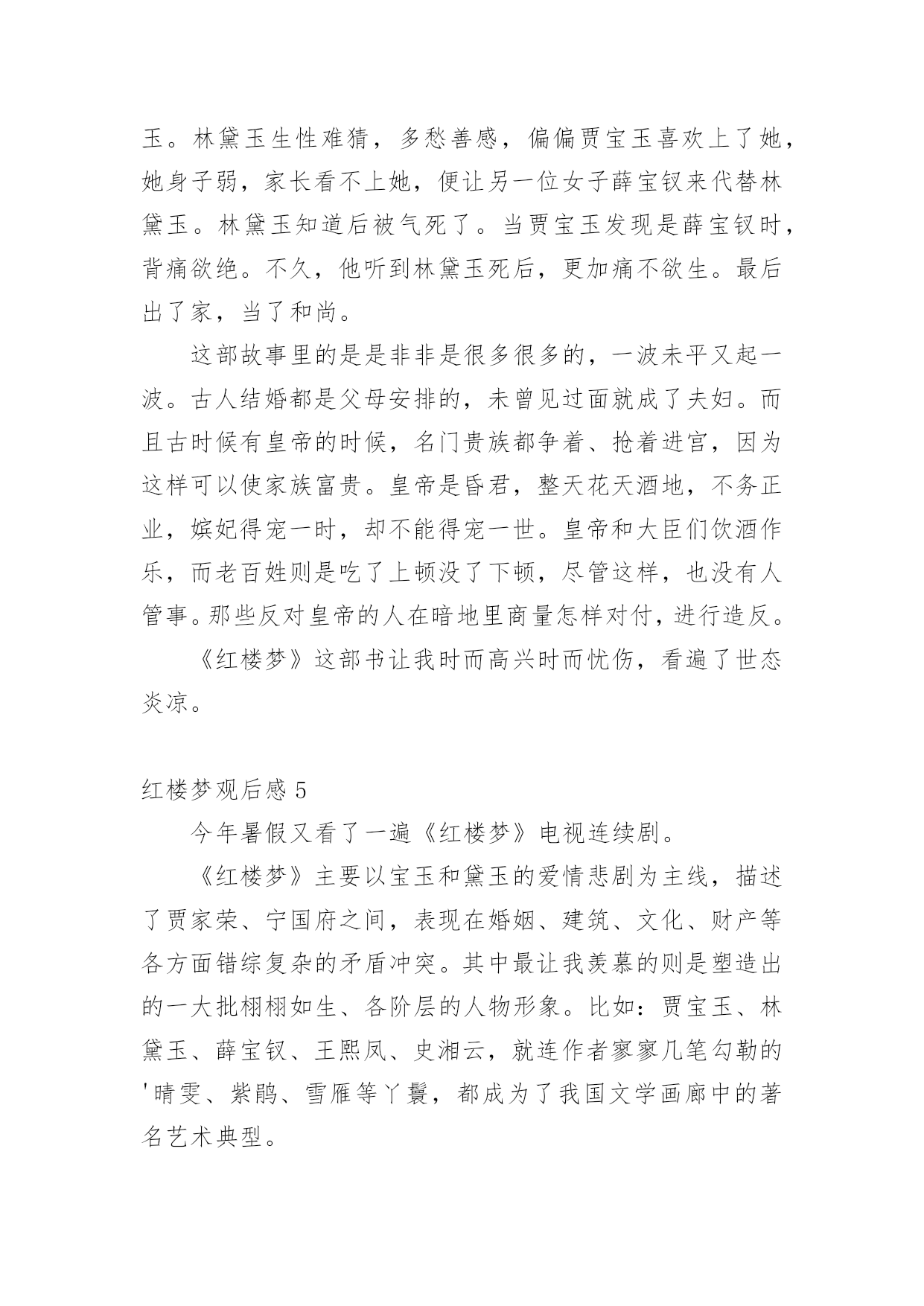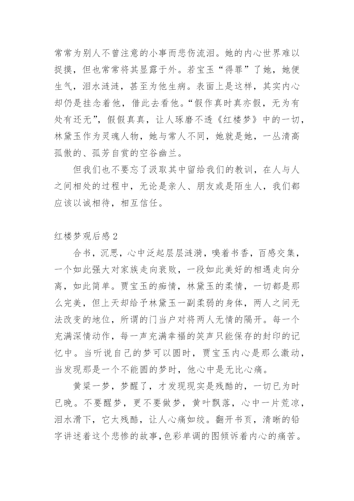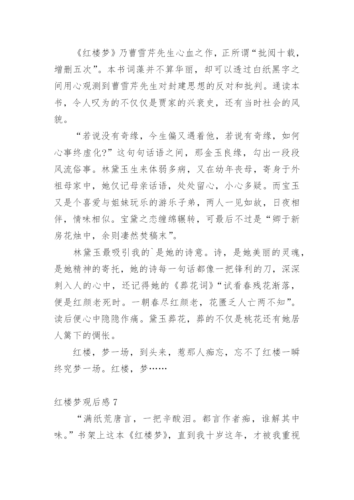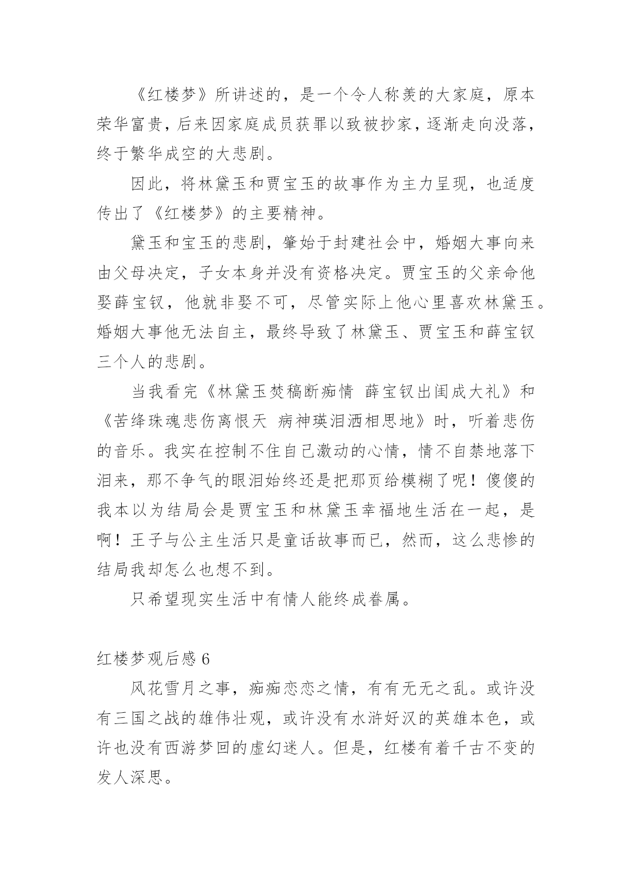 红楼梦观后感红楼梦观后感13篇在看完一部作品以后,这次观看让你心中有什么感想呢?需要写一篇观后感好好地作记录了。那么我们该怎么去写观后感呢?以下是小编精心整理的红楼梦观后感,希望能够帮助到大家。红楼梦观后感1文学家读《红楼梦》,读的是一代名家曹雪芹留下的撼世的不朽传奇;历史家读的是封建社会制度的腐朽败坏。一百个人读红楼梦,就会有一百种理解,这句话真的一点都不假!从不同的'角度会有不同的感受。我并不是文学家、思想家又或是历史家,我只是无数拜读《红楼梦》的平常人之一。我无法从他的文学价值和影响上去精研细琢,我只能倾心于我的感觉,那“满纸荒唐言,一把辛酸泪”如涓涓细流一般倾入我心感,令我难以自拔。感动、欣喜、愤怒、心疼、惋惜……我沉浸在《红楼梦》里,心也随着故事情节跌宕起伏。而在《红楼梦》中,我最喜欢的人物正是心清如水的林黛玉。林黛玉是一个才华横溢而性格孤傲的女子,她从小失去双亲,寄居在荣国府。虽然贾母对她疼爱有加,但由于清高自尊的个性,她常生“寄人篱下”的伤感。她多愁善感,常常为别人不曾注意的小事而悲伤流泪。她的内心世界难以捉摸,但也常常将其显露于外。若宝玉“得罪”了她,她便生气,泪水涟涟,甚至为他生病。表面上是这样,其实内心却仍是挂念着他,借此去看他。“假作真时真亦假,无为有处有还无”,假假真真,让人琢磨不透《红楼梦》中的一切,林黛玉作为灵魂人物,她与常人不同,她就是她,一丛清高孤傲的、孤芳自赏的空谷幽兰。但我们也不要忘了汲取其中留给我们的教训,在人与人之间相处的过程中,无论是亲人、朋友或是陌生人,我们都应该以诚相待,相互信任。红楼梦观后感2合书,沉思,心中泛起层层涟漪,嗅着书香,百感交集,一个如此强大对家族走向衰败,一段如此美好的相遇走向分离,如此简单。贾宝玉的痴情,林黛玉的柔情,一切都是那么完美,但上天却给予林黛玉一副柔弱的身体,两人之间无法改变的地位,所谓的门当户对将两人无情的隔开。每一个充满深情动作,每一声充满幸福的笑声只能保存的封印的记忆中。当听说自己的梦可以圆时,贾宝玉内心是那么激动,当发现那是一个不能圆的梦时,他心中是无比心痛。黄粱一梦,梦醒了,才发现现实是残酷的,一切已为时已晚。不要醒梦,更不要做梦,黄叶飘落,心中一片荒凉,泪水滑下,它太残酷,让人心痛如绞。翻开书页,清晰的铅字讲述着这个悲惨的故事,色彩单调的图倾诉着内心的痛苦。一个悲惨的'故事牵动,感染了多少人的心呢?闭上眼,回想着,一幕幕在脑海里回放,心中的苦涩渐渐蔓延。如果当时不是别人续写,曹雪芹是否会改变这一结局,为这个曲折的故事画上一个完美的句号,给予一好梦。如果贾宝玉与林黛玉之间没有地位的隔阂,他们是否可以如愿以偿。如果林黛玉没有一身柔弱的躯体,当贾宝玉发现后是否会回到她的身边。一切只是期望,最后的结局将所有的幻想破灭,换来一个悲伤的结局。阵阵凉意,让人冷的发抖,呼出一口气,瞬间在冷气中飘散,心里只有说不清的悲哀。愿望美好,现实残酷。愿世上无一悲哀,在梦里……红楼梦观后感3第一次对《红楼梦》感兴趣还是在桐华的小说中,看到这样一句话:“少不读红楼,老不读三国”,红楼梦作为四大名著之一,小孩子却是不能读的,于是带着强烈的好奇,开始看这方面的电视剧。故事讲的是一个家族的兴衰,一个家族的大小故事。主人公为贾宝玉,他应该说来是一个柔中稍稍带刚的男子,他的柔有部分是因为环境所致,他们家上上下下几乎都是女性,掌管全家的也全是女子,自然而然地就应了一句话“近朱者赤,近墨者黑”。他们的家族是因为家中一女子进宫当了皇帝的宠妃而盛起,是他们天天吟诗作乐,而其中又有两女子非提不可,那便是薛宝钗和林黛玉。林黛玉生性猜忌,多愁善感,可贾宝玉偏偏就是喜欢她,她身子弱,老祖宗看不上她,便骗贾宝玉与薛宝钗成亲,林黛玉闻讯气死,而当贾宝玉揭开喜帕发现并非林黛玉,而黛玉又身亡,悲痛欲绝,出家当了和尚。在剧中,性格最突出的',要属于林黛玉了。常听人评价黛玉“小性子”甚至“心胸狭窄”,可我不这么认为!因为在这背后,只是因为她太在意宝玉了,因为爱的深、爱的切,所以不能不介意。我总觉得宝玉给黛玉的时间太少,黛玉的心太细腻,而宝玉却体会不到。在她某个抑郁的瞬间,心情像是走丢的小孩没了方寸,宝玉不该到来的问候会被她驳回,狠狠的、凶凶的,却是无心的,不是不接受,只是因为太难受,于是她只有用诗来发泄内心酝酿已久积压不了的情感。记得她的《葬花词》:“依今葬花人笑痴,他年葬花依知是谁?试看春残花渐落,便是红颜老死时。一朝春尽红颜老,花落人亡两不知”。读完后像是被万箭穿心,肝肠寸断般的阵痛。红楼梦观后感4故事里讲的是一个家族的兴衰,一个家族的故事。贾宝玉是这部书中的.主人公,性格有柔有刚。他的柔是因家族的原因,他们家上上下下几乎全都是女性,掌管家族兴望的自然也是女性。他的家族发展的形式应了一句话“近朱者赤,