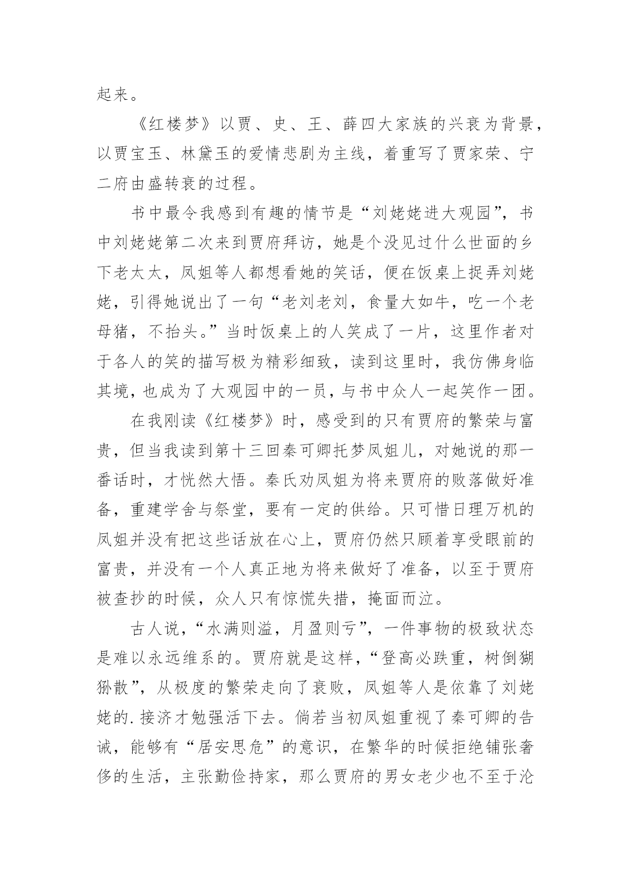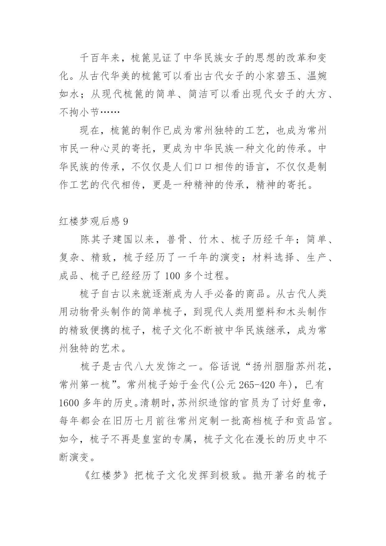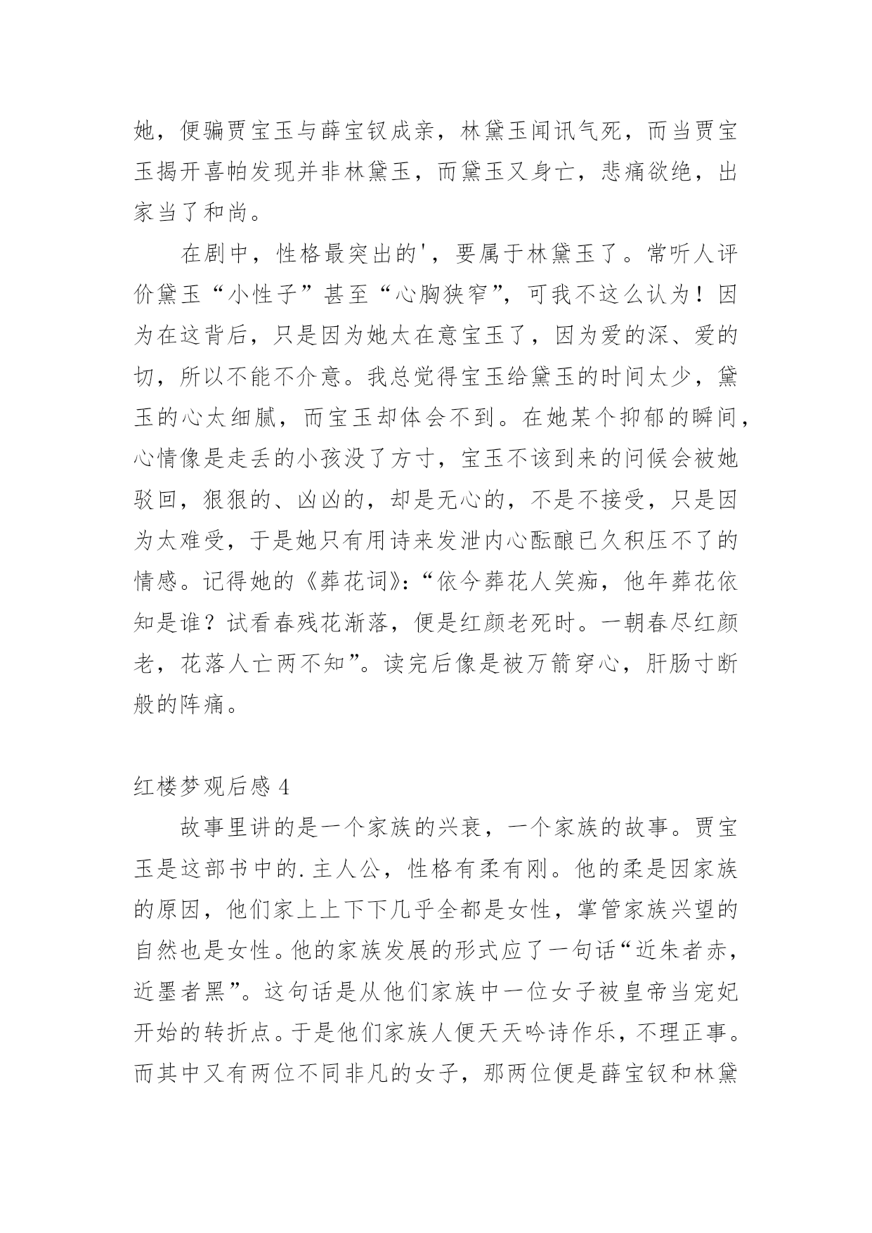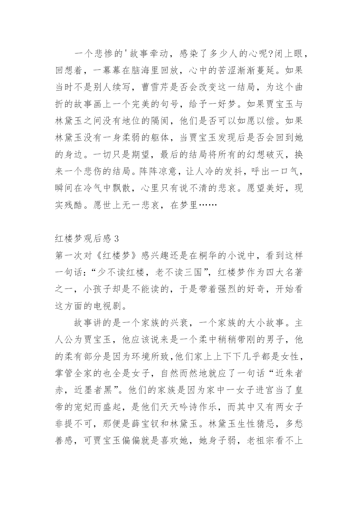 红楼梦观后感红楼梦观后感13篇在看完一部作品以后,这次观看让你心中有什么感想呢?需要写一篇观后感好好地作记录了。那么我们该怎么去写观后感呢?以下是小编精心整理的红楼梦观后感,希望能够帮助到大家。红楼梦观后感1文学家读《红楼梦》,读的是一代名家曹雪芹留下的撼世的不朽传奇;历史家读的是封建社会制度的腐朽败坏。一百个人读红楼梦,就会有一百种理解,这句话真的一点都不假!从不同的'角度会有不同的感受。我并不是文学家、思想家又或是历史家,我只是无数拜读《红楼梦》的平常人之一。我无法从他的文学价值和影响上去精研细琢,我只能倾心于我的感觉,那“满纸荒唐言,一把辛酸泪”如涓涓细流一般倾入我心感,令我难以自拔。感动、欣喜、愤怒、心疼、惋惜……我沉浸在《红楼梦》里,心也随着故事情节跌宕起伏。而在《红楼梦》中,我最喜欢的人物正是心清如水的林黛玉。林黛玉是一个才华横溢而性格孤傲的女子,她从小失去双亲,寄居在荣国府。虽然贾母对她疼爱有加,但由于清高自尊的个性,她常生“寄人篱下”的伤感。她多愁善感,常常为别人不曾注意的小事而悲伤流泪。她的内心世界难以捉摸,但也常常将其显露于外。若宝玉“得罪”了她,她便生气,泪水涟涟,甚至为他生病。表面上是这样,其实内心却仍是挂念着他,借此去看他。“假作真时真亦假,无为有处有还无”,假假真真,让人琢磨不透《红楼梦》中的一切,林黛玉作为灵魂人物,她与常人不同,她就是她,一丛清高孤傲的、孤芳自赏的空谷幽兰。但我们也不要忘了汲取其中留给我们的教训,在人与人之间相处的过程中,无论是亲人、朋友或是陌生人,我们都应该以诚相待,相互信任。红楼梦观后感2合书,沉思,心中泛起层层涟漪,嗅着书香,百感交集,一个如此强大对家族走向衰败,一段如此美好的相遇走向分离,如此简单。贾宝玉的痴情,林黛玉的柔情,一切都是那么完美,但上天却给予林黛玉一副柔弱的身体,两人之间无法改变的地位,所谓的门当户对将两人无情的隔开。每一个充满深情动作,每一声充满幸福的笑声只能保存的封印的记忆中。当听说自己的梦可以圆时,贾宝玉内心是那么激动,当发现那是一个不能圆的梦时,他心中是无比心痛。黄粱一梦,梦醒了,才发现现实是残酷的,一切已为时已晚。不要醒梦,更不要做梦,黄叶飘落,心中一片荒凉,泪水滑下,它太残酷,让人心痛如绞。翻开书页,清晰的铅字讲述着这个悲惨的故事,色彩单调的图倾诉着内心的痛苦。一个悲惨的'故事牵动,感染了多少人的心呢?闭上眼,回想着,一幕幕在脑海里回放,心中的苦涩渐渐蔓延。如果当时不是别人续写,曹雪芹是否会改变这一结局,为这个曲折的故事画上一个完美的句号,给予一好梦。如果贾宝玉与林黛玉之间没有地位的隔阂,他们是否可以如愿以偿。如果林黛玉没有一身柔弱的躯体,当贾宝玉发现后是否会回到她的身边。一切只是期望,最后的结局将所有的幻想破灭,换来一个悲伤的结局。阵阵凉意,让人冷的发抖,呼出一口气,瞬间在冷气中飘散,心里只有说不清的悲哀。愿望美好,现实残酷。愿世上无一悲哀,在梦里……红楼梦观后感3第一次对《红楼梦》感兴趣还是在桐华的小说中,看到这样一句话:“少不读红楼,老不读三国”,红楼梦作为四大名著之一,小孩子却是不能读的,于是带着强烈的好奇,开始看这方面的电视剧。故事讲的是一个家族的兴衰,一个家族的大小故事。主人公为贾宝玉,他应该说来是一个柔中稍稍带刚的男子,他的柔有部分是因为环境所致,他们家上上下下几乎都是女性,掌管全家的也全是女子,自然而然地就应了一句话“近朱者赤,近墨者黑”。他们的家族是因为家中一女子进宫当了皇帝的宠妃而盛起,是他们天天吟诗作乐,而其中又有两女子非提不可,那便是薛宝钗和林黛玉。林黛玉生性猜忌,多愁善感,可贾宝玉偏偏就是喜欢她,她身子弱,老祖宗看不上她,便骗贾宝玉与薛宝钗成亲,林黛玉闻讯气死,而当贾宝玉揭开喜帕发现并非林黛玉,而黛玉又身亡,悲痛欲绝,出家当了和尚。在剧中,性格最突出的',要属于林黛玉了。常听人评价黛玉“小性子”甚至“心胸狭窄”,可我不这么认为!因为在这背后,只是因为她太在意宝玉了,因为爱的深、爱的切,所以不能不介意。我总觉得宝玉给黛玉的时间太少,黛玉的心太细腻,而宝玉却体会不到。在她某个抑郁的瞬间,心情像是走丢的小孩没了方寸,宝玉不该到来的问候会被她驳回,狠狠的、凶凶的,却是无心的,不是不接受,只是因为太难受,于是她只有用诗来发泄内心酝酿已久积压不了的情感。记得她的《葬花词》:“依今葬花人笑痴,他年葬花依知是谁?试看春残花渐落,便是红颜老死时。一朝春尽红颜老,花落人亡两不知”。读完后像是被万箭穿心,肝肠寸断般的阵痛。红楼梦观后感4故事里讲的是一个家族的兴衰,一个家族的故事。贾宝玉是这部书中的.主人公,性格有柔有刚。他的柔是因家族的原因,他们家上上下下几乎全都是女性,掌管家族兴望的自然也是女性。他的家族发展的形式应了一句话“近朱者赤,