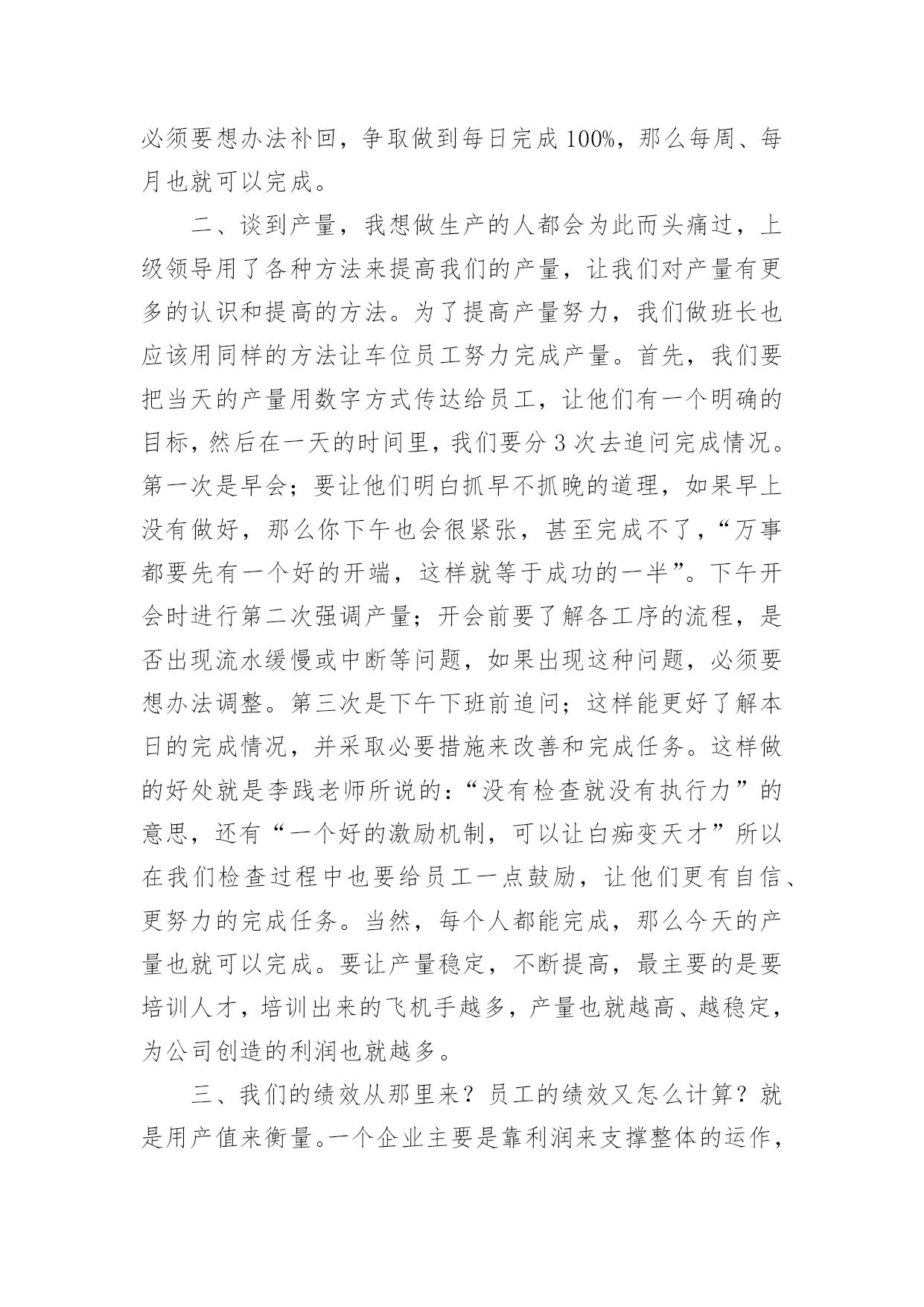 绩效飞轮观后感绩效飞轮观后感看完一部作品后,想必你有不少可以分享的东西,透过观影,我们可以发现一些深刻的感悟。那么我们该怎么去写观后感呢?以下是小编精心整理的绩效飞轮观后感,仅供参考,希望能够帮助到大家。“千斤重担万人挑,人人头上有指标”,让我更清楚地认识了自己的职责,也让我明白管理就是管人,管着员工有条理地做好每一件事情,完成每一个任务,这些都是我从李践老师讲的《绩效飞轮》一课中学到的。李践老师讲的:没有数字量化的绩效等于无效,所以我这次把20xx年的计划做了一个数字表格,在我做表格的同时也领悟到一个道理,那就是:表格能引领方向,表格让我对明年都有了目标,做事也有了激情和希望,但是,只有表格数字而不去努力也是空口说白话,所以我决定用《绩效飞轮》方法拟定了明年的计划,做生产也需要数字和绩效,以下是看了《绩效飞轮》后的感想。一、“时间不等人”这句话每人都知道,但能把时间合理利用的人不多;“时间就是金钱”在最短的时间内创造更多地利益,那才是时间的重要性,所以我们要想把时间掌握到自己手中,必须要从大化小,年化月,月化周,周化日,然后把每日的产量和任务完成,如果今天没完成,那么明日必须要想办法补回,争取做到每日完成100%,那么每周、每月也就可以完成。二、谈到产量,我想做生产的人都会为此而头痛过,上级领导用了各种方法来提高我们的产量,让我们对产量有更多的认识和提高的方法。为了提高产量努力,我们做班长也应该用同样的方法让车位员工努力完成产量。首先,我们要把当天的产量用数字方式传达给员工,让他们有一个明确的目标,然后在一天的时间里,我们要分3次去追问完成情况。第一次是早会;要让他们明白抓早不抓晚的道理,如果早上没有做好,那么你下午也会很紧张,甚至完成不了,“万事都要先有一个好的开端,这样就等于成功的一半”。下午开会时进行第二次强调产量;开会前要了解各工序的流程,是否出现流水缓慢或中断等问题,如果出现这种问题,必须要想办法调整。第三次是下午下班前追问;这样能更好了解本日的完成情况,并采取必要措施来改善和完成任务。这样做的好处就是李践老师所说的:“没有检查就没有执行力”的意思,还有“一个好的激励机制,可以让白痴变天才”所以在我们检查过程中也要给员工一点鼓励,让他们更有自信、更努力的完成任务。当然,每个人都能完成,那么今天的产量也就可以完成。要让产量稳定,不断提高,最主要的是要培训人才,培训出来的飞机手越多,产量也就越高、越稳定,为公司创造的利润也就越多。三、我们的绩效从那里来?员工的绩效又怎么计算?就是用产值来衡量。一个企业主要是靠利润来支撑整体的运作,而我们的工资主要是靠产值拿提成来体现,计件员工的工资主要是靠完成产量多少来计算,因此,我们必须要重视和提高产值,没有产值公司也没有利润,我们也没有工资,要想提升,就要想出“如日中天”的好方法。四、李践老师说:企业要做到认真、快、坚守承诺。所谓认真就是品质,一个产品要想在市场上受到欢迎,必须要品质好。因此,我们在生产过程中,要让员工养成互检、自检的良好习惯,把品质放在首位,在品质良好的情况下再加快我们的效率,在质量保证前提下提高产量,这样才能得到客户的信誉,也是我们要坚守承诺的原则。五、“7S”就是我们的作风,也是最基本的原则。企业有了作风就显得规范,更能显露出一个企业的文化,一个班组良好的工作环境,整齐的生产设备、统一的厂服、积极的工作气氛、热情的团队精神,这就是良好作风的表现,也应证了“要管理首先管好作风”的真谛。六、一个企业最主要的条件就是:要有优秀有能力员工,能为公司创造利益的员工。我认为,优秀有能力的员工都要先了解厂规厂纪和奖罚制度,在没有了解规章制度之前不可以进班组或部门工作,就像李践老师所说:没有规矩,何以成方圆。所以每个员工都要明白和遵守厂规,这样公司才能形成一个大的轨道,我们做班长,经常要面对员工,一定要让每个员工学到最好的经验,挣到更多的钱,让她们对自己有信心,对未来有希望,对公司有感情,这样才能保证员工不流失,保证一个班组的上升势头。