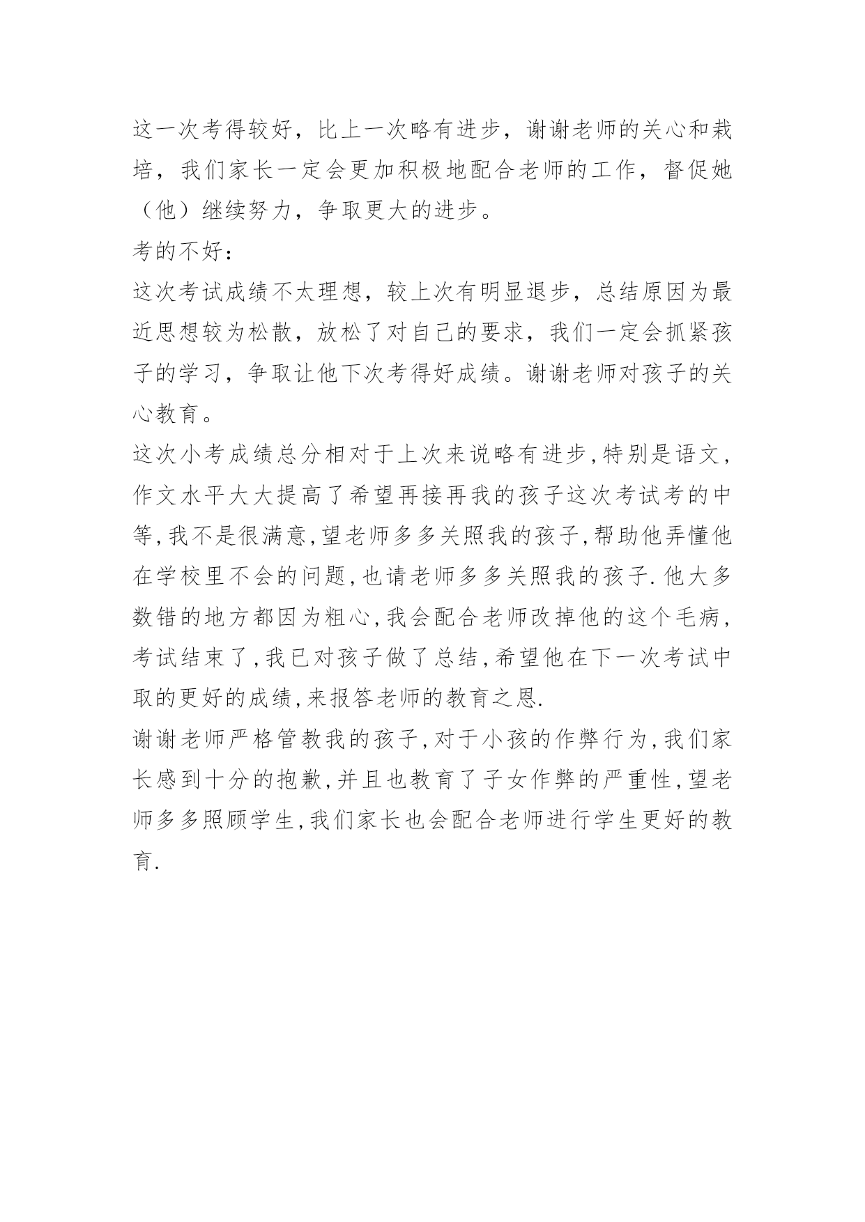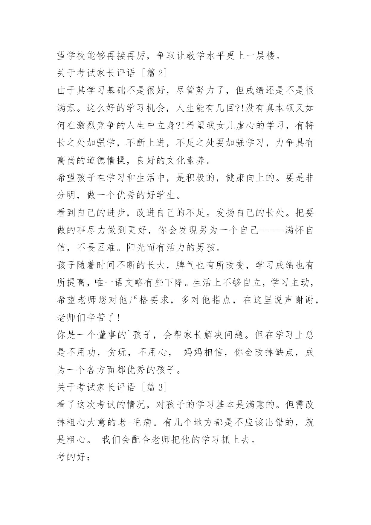 考试家长评语关于考试家长评语1、从孩子的卷子上来看,专业成绩算得上优秀。和上一次相比较,没有退步也没有进步。希望孩子继续努力,更上一层楼。同时也感谢教师平日对我孩子的培养,但是孩子还是有很多要努力的地方。有劳老师以后继续费心教育孩子。我们家长一定会鼎力支持,配合老师!2、老师,您好,首先,感谢您对孩子的教育,让他变得更加的聪明,懂事,孩子的成长离不开老师的教育,老师在孩子的心里具有神圣的地位。希望老师对孩子严加管教,使之变得更棒。希望孩子在以后更加的优秀,再此感谢老师辛勤的付出,当然我们做家长的也会密切配合老师!3、虽然这次成绩并不是班里名列前茅,但这只是一次测试,一次对自己知识的考验,一次查缺补漏的过程,可以让你看清自己不会的地方,对于马虎,在下次考试中要尽量避免,争取取得更大进步!4、孩子考得不是很好,可能是疏忽了,尤其是某某这几科,有点小退步,让我有点惊讶,以往以后孩子可以认真的对待学习,对待考试,既不要太过于担心成绩也不要轻敌。妈妈(爸爸)相信你,一定可以在下一次给我一张满意的答卷!5、本人以为此次语文考试出题难度适中、题量正好,能够准确考察学生的语文能力。我的孩子在此次考试中已经尽了力,发挥了他的正常水平,这个分数也是在意料之中的。希望学校能够再接再厉,争取让教学水平更上一层楼。关于考试家长评语[篇2]由于其学习基础不是很好,尽管努力了,但成绩还是不是很满意。这么好的学习机会,人生能有几回?!没有真本领又如何在激烈竞争的人生中立身?!希望我女儿虚心的学习,有特长之处加强学,不断上进,不足之处要加强学习,力争具有高尚的道德情操,良好的文化素养。希望孩子在学习和生活中,是积极的,健康向上的。要是非分明,做一个优秀的好学生。看到自己的进步,改进自己的不足。发扬自己的长处。把要做的事尽力做到更好,你会发现另为一个自己-----满怀自信,不畏困难。阳光而有活力的男孩。孩子随着时间不断的长大,脾气也有所改变,学习成绩也有所提高,唯一语文略有些下降。生活上不够自立,学习主动,希望老师您对他严格要求,多对他指点,在这里说声谢谢,老师们辛苦了!你是一个懂事的`孩子,会帮家长解决问题。但在学习上总是不用功,贪玩,不用心,妈妈相信,你会改掉缺点,成为一个各方面都优秀的孩子。关于考试家长评语[篇3]看了这次考试的情况,对孩子的学习基本是满意的。但需改掉粗心大意的老-毛病。有几个地方都是不应该出错的,就是粗心。我们会配合老师把他的学习抓上去。考的好:这一次考得较好,比上一次略有进步,谢谢老师的关心和栽培,我们家长一定会更加积极地配合老师的工作,督促她(他)继续努力,争取更大的进步。考的不好:这次考试成绩不太理想,较上次有明显退步,总结原因为最近思想较为松散,放松了对自己的要求,我们一定会抓紧孩子的学习,争取让他下次考得好成绩。谢谢老师对孩子的关心教育。这次小考成绩总分相对于上次来说略有进步,特别是语文,作文水平大大提高了希望再接再我的孩子这次考试考的中等,我不是很满意,望老师多多关照我的孩子,帮助他弄懂他在学校里不会的问题,也请老师多多关照我的孩子.他大多数错的地方都因为粗心,我会配合老师改掉他的这个毛病,考试结束了,我已对孩子做了总结,希望他在下一次考试中取的更好的成绩,来报答老师的教育之恩.谢谢老师严格管教我的孩子,对于小孩的作弊行为,我们家长感到十分的抱歉,并且也教育了子女作弊的严重性,望老师多多照顾学生,我们家长也会配合老师进行学生更好的教育.