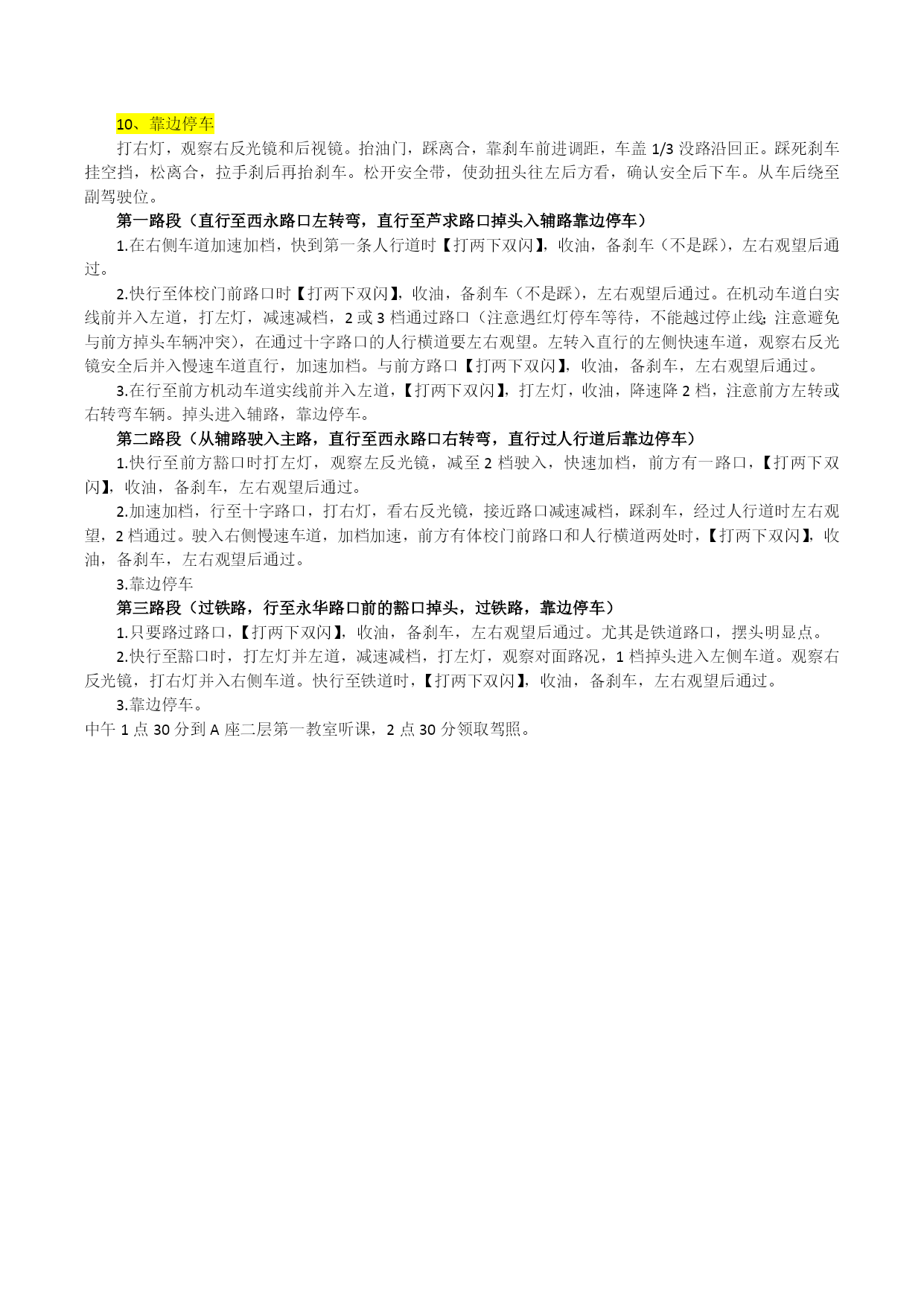 科目三模拟考试早上5点30分起床,6点整从家里出发,6点10分广安门南驾校班车,7点前到达驾校,7点40分坐班车参加外路考试。带身份证,学员卡,学员手册,白底彩照。考试开始:1、绕车:左后侧看车左边,逆时针绕车,沿路观察车门是否关好,从车头到左前车门,观察后方交通情况,开门进车;2、准备:坐上车,关好车门,说:“老师您好,这是我的身份证。”双手递上身份证;调整座椅,系好安全带,检查3块后视镜,检查仪表,说:“报告老师,准备完毕。”被问:“真的准备好了?”使劲推车门确认,拉安全带确认后,回答:“准备完毕。”听到起步口令,开始起步。3、起步:打左灯,踩离合,挂1档,松手刹,使劲回头看左后方检查有无车辆,再边看左后视镜边抬离合,车启动,加把油,左转90度方向盘,1档速度进入慢速车道,关标灯;4、加档:加档先加速,踩一脚油门冲车,快抬油门的同时踩离合,油门先松开,离合接着踩到底,1档换到2档(不能看档位);稍微抬快一点离合,松开离合后再加一脚油冲车,快抬油门的同时踩离合,油门先松开,离合接着踩到底,2档换3档;快抬离合,松开离合后再加一脚油冲车,快抬油门的同时踩离合,油门先松开,离合接着踩到底,3档换4档(考试一般最高要求4档),快抬离合,松开离合后再加一脚油;没有口令,坚决不能超车,不能连续变更车道,如果前方有车或者行人,需要减速减档;5、减档:减档先减速,松油门,踩刹车,降车速,踩离合的同时抬刹车,4档换3档,慢抬离合,松开离合加把油;松油门,踩刹车,降车速,踩离合的同时抬刹车,3档换2档;也可以直接由高档位换到低档位;6、路口:快行至路口时,收油,备刹车(不是踩),左右观望后,加油通过。人行道遇行人要停车让行,踩离合,踩刹车,停在人行道前,换到1档,等行人通过后,起步,加档。7、过减速带:4档变3档,非4档情况下,轻点刹车,或脚搁在刹车上不加油。8、前方信号灯掉头:1)换道(慢车道-快车道):打左灯,使劲扭头看左后视镜,后方无车安全的情况下(不用刹车减档),加油,方向盘稍微向左进入快速车道,马上回正,车并入快车道,判断路口适当距离在减档(50米),松油门,备刹车,速度下降后,踩离合,高档位换到1档,抬离合(1快2停3慢),加把油,速度控制在1档;2)路口红灯:踩离合,踩刹车,停止线以内停车,摘空挡或换1档,等待绿灯,10秒倒数的时候开始准备;打左灯,踩离合,挂1档,看后视镜,抬离合,加把油,1挡的速度前进,看地上斑马线,人过了斑马线,左打满,掉头过程中,扭头向右前方观察,确认安全,进入快速车道,关标灯,加把油行驶一段距离,准备变更到慢车道,自己主动并线,考官没有指令;3)路口绿灯:打左灯,扭头看左后视镜,确认安全,1档速度过斑马线,人过斑马线,左打满,掉头过程中,扭头向右前方观察,确认安全,进入快速车道,关标灯,加把油行驶一段距离,准备变更到慢车道,自己主动并线,考官没有指令;4)换道(快车道-慢车道):打右灯,使劲扭头看右后视镜,后方无车安全的情况下(不用刹车减档),方向盘稍微向右进入快速车道,加油加档;9、前方(小)路口掉头马上打左灯,加油,稍微向左打方向盘,马上回正,车并入快车道,踩离合,踩刹车减速,速度减下来可以松刹车,备刹车,到路口前,换到1档,车速减到步行速度,准备掉头。左后视镜与马路边缘对齐,向左打1圈方向盘,1档的速度掉头,在进入快车道前,踩刹车停车,使劲扭头看右前方,确认安全后,抬离合,1档起步,进入快车道前,往左打一点方向,车正回正方向。打右灯,使劲扭头看右后视镜,此时无口令,观察右后方安全,加油,稍微向右打方向盘,马上回正,车并入慢车道,加油,松油门,踩离合,换2档,继续加档。从辅路转弯进入右前方路口时,进入慢车道。原则是:快车道进快车道,慢车道进慢车道。10、靠边停车打右灯,观察右反光镜和后视镜。抬油门,踩离合,靠刹车前进调距,车盖1/3没路沿回正。踩死刹车挂空挡,松离合,拉手刹后再抬刹车。松开安全带,使劲扭头往左后方看,确认安全后下车。从车后绕至副驾驶位。第一路段(直行至西永路口左转弯,直行至芦求路口掉头入辅路靠边停车)1.在右侧车道加速加档,快到第一条人行道时【打两下双闪】,收油,备刹车(不是踩),左右观望后通过。2.快行至体校门前路口时【打两下双闪】,收油,备刹车(不是踩),左右观望后通过。在机动车道白实线前并入左道,打左灯,减速减档,2或3档通过路口(注意遇红灯停车等待,不能越过停止线;注意避免与前方掉头车辆冲突),在通过十字路口的人行横道要左右观望。左转入直行的左侧快速车道,观察右反光镜安全后并入慢速车道直行,加速加档。与前方路口【打两下双闪】,收油,备刹车,左右观望后通过。3.在行至前方机动车道实线前并入左道,【打两下双闪】,打左灯,收油,降速