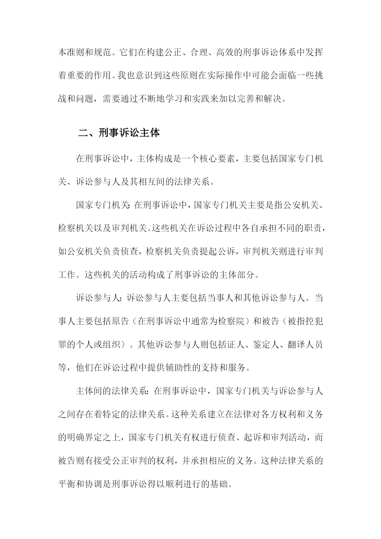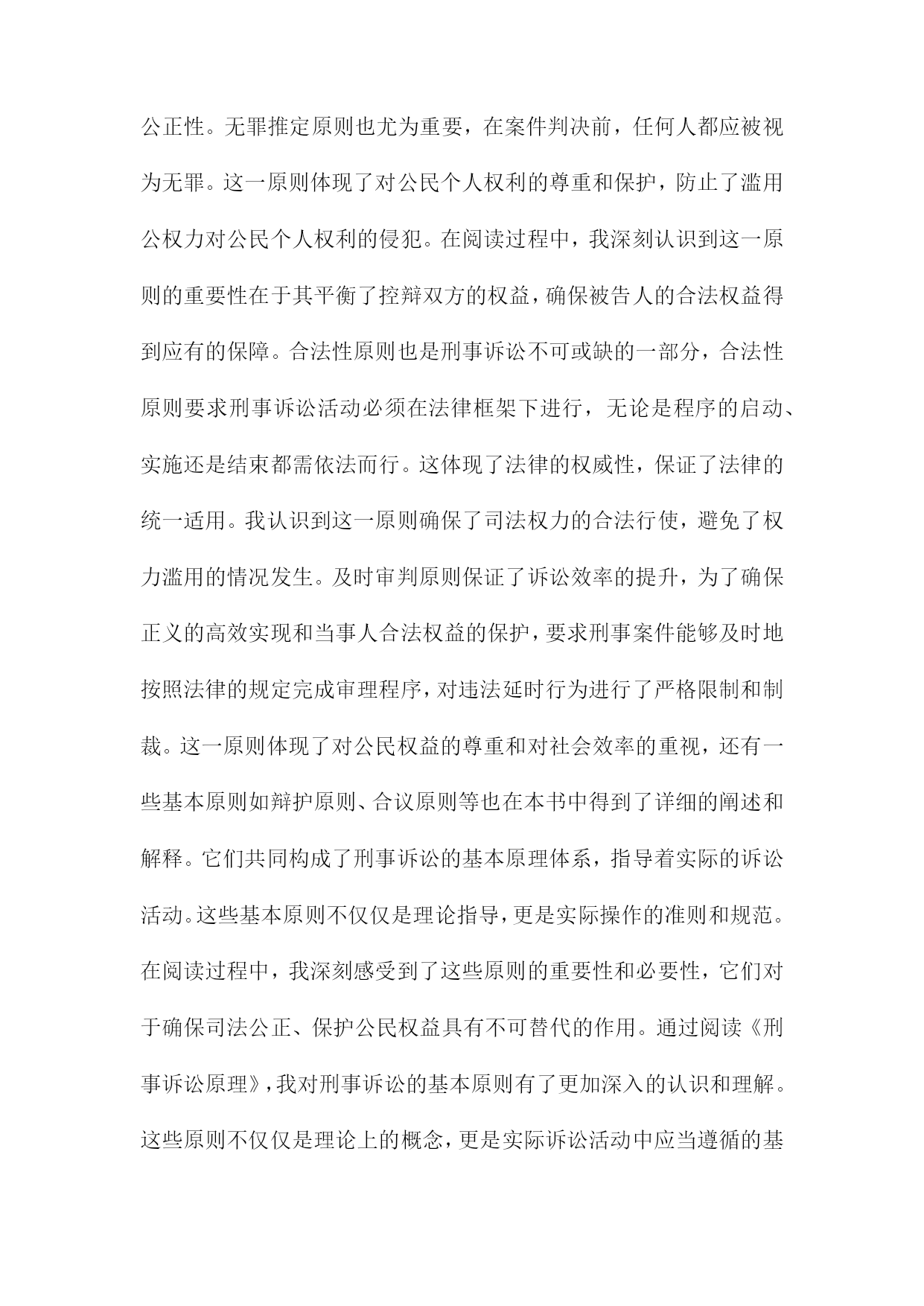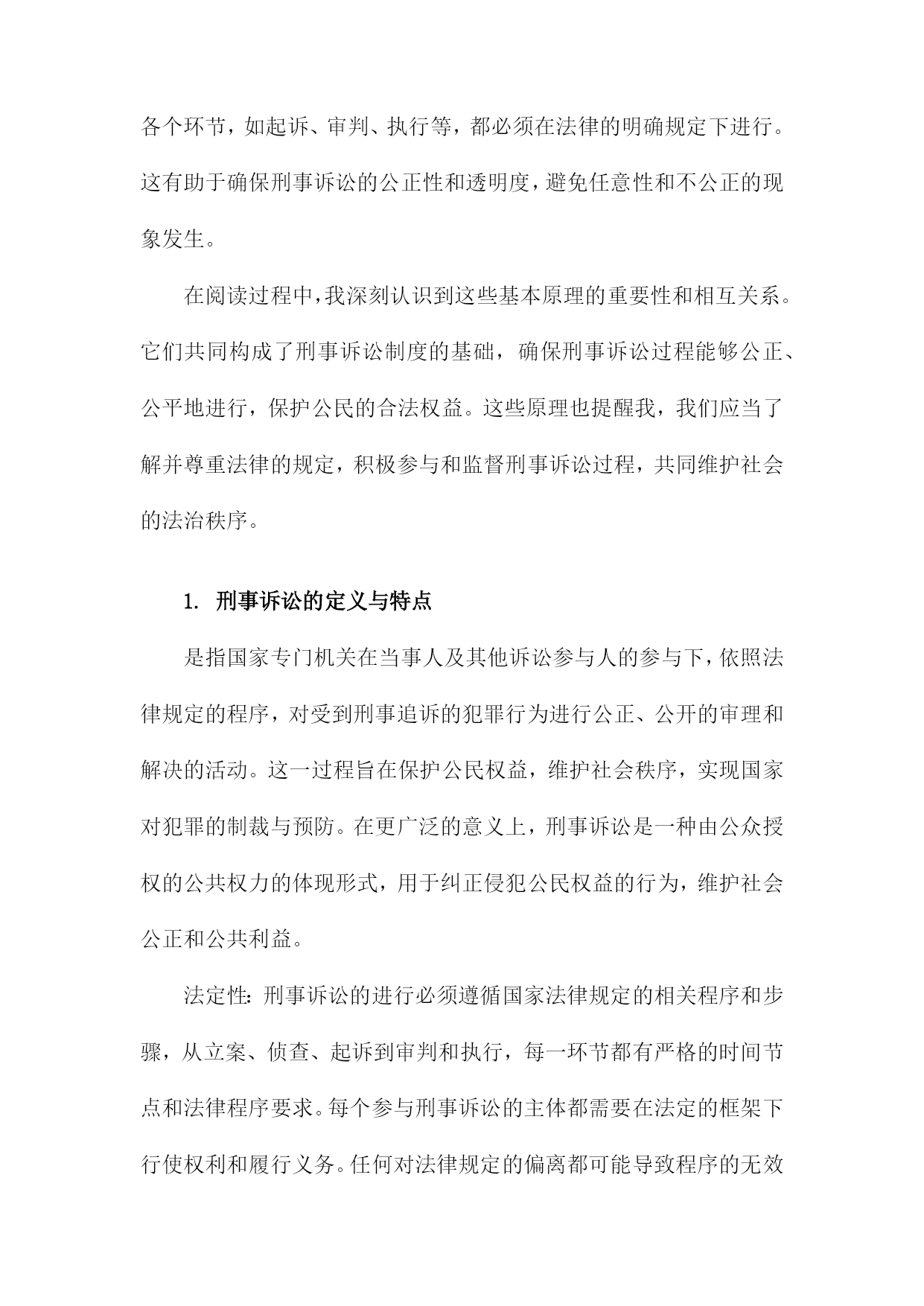 《刑事诉讼原理》阅读札记一、刑事诉讼基本原理在阅读《刑事诉讼原理》我了解到刑事诉讼的基本原理是构建整个刑事诉讼制度的基础。这些原理包括法治原则、公正原则、人权保障原则以及诉讼程序法定原则等。这些内容让我意识到刑事诉讼不仅是一个复杂的过程,而且是一个具有严格规定的法律程序,旨在确保公民的合法权益得到保护。法治原则是刑事诉讼的基本原则之一,要求所有涉及刑事诉讼的主体必须在法律的框架内进行活动,确保法律的公正实施。这意味着无论是国家机关还是个人,在刑事诉讼过程中都必须遵守法律的规定。公正原则强调在刑事诉讼过程中,应当保障公正审判的权利。这包括公正审理、证据充分、定罪量刑合理等方面。公正的审判过程对于维护社会公正和增强公众对司法制度的信任至关重要。人权保障原则体现了对个体权利的尊重和保护,在刑事诉讼中,这一原则要求确保被告人的基本权利得到尊重和保护,防止其受到不公正的对待或滥用权力的侵害。这包括辩护权、知情权、公正审判权等。诉讼程序法定原则强调刑事诉讼的程序性,这意味着刑事诉讼的各个环节,如起诉、审判、执行等,都必须在法律的明确规定下进行。这有助于确保刑事诉讼的公正性和透明度,避免任意性和不公正的现象发生。在阅读过程中,我深刻认识到这些基本原理的重要性和相互关系。它们共同构成了刑事诉讼制度的基础,确保刑事诉讼过程能够公正、公平地进行,保护公民的合法权益。这些原理也提醒我,我们应当了解并尊重法律的规定,积极参与和监督刑事诉讼过程,共同维护社会的法治秩序。1.刑事诉讼的定义与特点是指国家专门机关在当事人及其他诉讼参与人的参与下,依照法律规定的程序,对受到刑事追诉的犯罪行为进行公正、公开的审理和解决的活动。这一过程旨在保护公民权益,维护社会秩序,实现国家对犯罪的制裁与预防。在更广泛的意义上,刑事诉讼是一种由公众授权的公共权力的体现形式,用于纠正侵犯公民权益的行为,维护社会公正和公共利益。法定性:刑事诉讼的进行必须遵循国家法律规定的相关程序和步骤,从立案、侦查、起诉到审判和执行,每一环节都有严格的时间节点和法律程序要求。每个参与刑事诉讼的主体都需要在法定的框架下行使权利和履行义务。任何对法律规定的偏离都可能导致程序的无效或者裁决的不公正。公权性:刑事诉讼是一种由国家公权力主导进行的程序,代表着公众对犯罪的惩罚和正义的追求。这种公权力表现为国家对犯罪的制裁权和对社会公正的维护权。在诉讼过程中,国家专门机关如法院、检察院等扮演着重要角色,负责引导和控制诉讼的进程。2.刑事诉讼的目的和任务在阅读《刑事诉讼原理》我深刻理解了刑事诉讼的目的和任务的复杂性及其重要性。刑事诉讼的目的和任务不仅仅是法律层面的要求,更是社会公正和秩序的体现。刑事诉讼的主要目的是确保法律的正确实施,维护社会的公正和秩序。这体现在通过刑事诉讼程序,对涉嫌犯罪的个体进行公正、公平的审判,确保无罪的人不受刑事追究,有罪的人受到相应的法律制裁。这一目标的实现,依赖于公正、合理的诉讼程序设计和高效的司法体系。刑事诉讼的任务还包括保护公民的权利和自由,防止滥用公权力对公民权益的侵犯。在诉讼过程中,既要保障被告人的合法权益,也要确保被害人的权益得到充分关注和保障。这要求诉讼程序既要体现法律的严肃性,又要兼顾人性的关怀和公正。刑事诉讼的另一重要任务是恢复社会和谐与稳定,通过公正的审判,使被破坏的社会关系得到修复,使社会回归和谐与稳定的状态。这需要司法部门与社区、家庭等社会各方面紧密合作,共同推动社会的和谐与稳定。在阅读过程中,我还认识到刑事诉讼的目的和任务在不同国家和地区可能存在差异。这主要体现在诉讼程序的设计、司法体系的运作以及法律文化的差异等方面。理解和研究刑事诉讼的目的和任务,需要考虑到具体的国情和文化背景。通过阅读《刑事诉讼原理》,我对刑事诉讼的目的和任务有了更深入的理解。我认识到刑事诉讼不仅是法律的实施过程,更是社会公正和秩序的体现。在未来的学习和工作中,我将继续关注和研究刑事诉讼领域的发展,为推动我国司法体系的完善贡献自己的力量。3.刑事诉讼的基本原则在《刑事诉讼原理》中,刑事诉讼的基本原则是整个诉讼活动的灵魂和核心,是构建刑事诉讼制度的基石。阅读这一部分时,我对其中的几个关键原则进行了深入的思考和记录。司法公正原则是刑事诉讼的基石,这一原则要求确保案件得到公正审理,不受外界不正当干扰和影响。实现司法公正的关键在于中立独立的司法机关、专业的司法人员以及合法合规的司法程序。在具体的案件中,保障控辩双方平等的权利是基础中的基础,以确保诉讼的公正性。无罪推定原则也尤为重要,在案件判决前,任何人都应被视为无罪。这一原则体现了对公民个人权利的尊重和保护,防止了滥用公权力对公民个人权利的侵犯。在阅读过程中,我深刻认识到这一原则的重要性在于其平衡了控辩双
