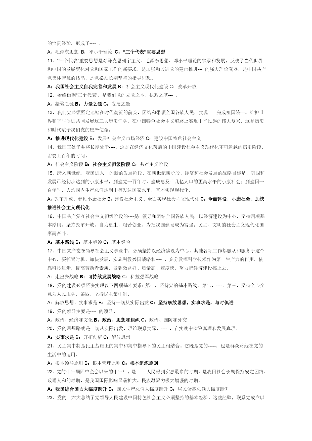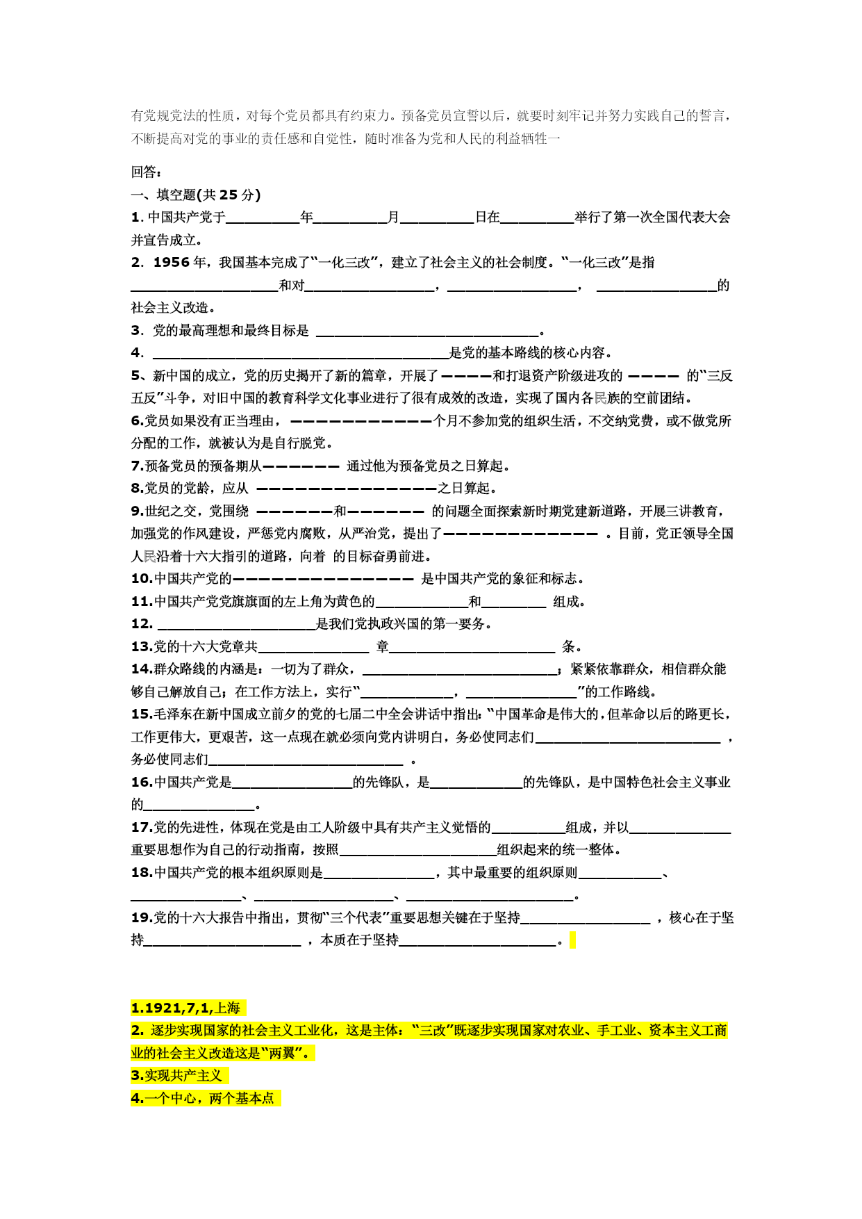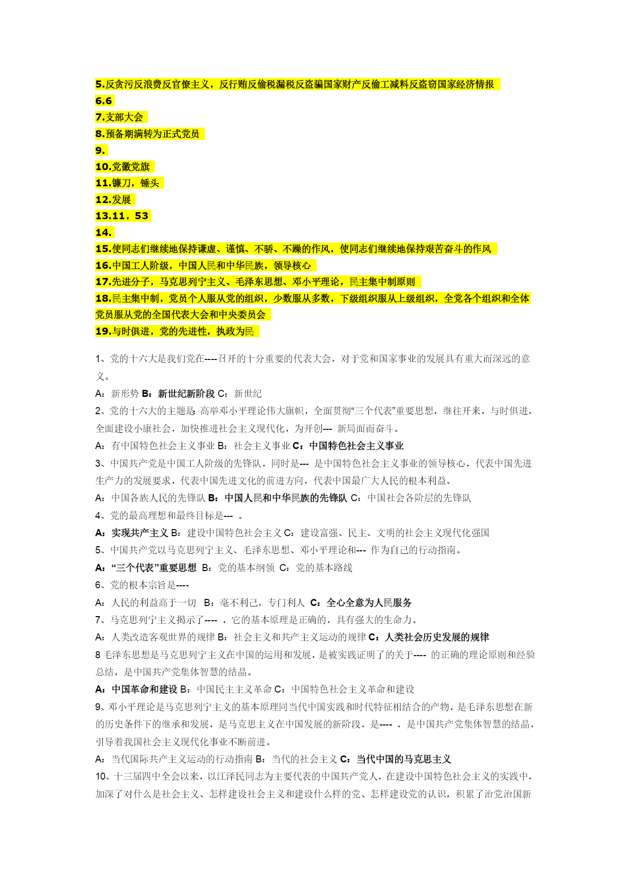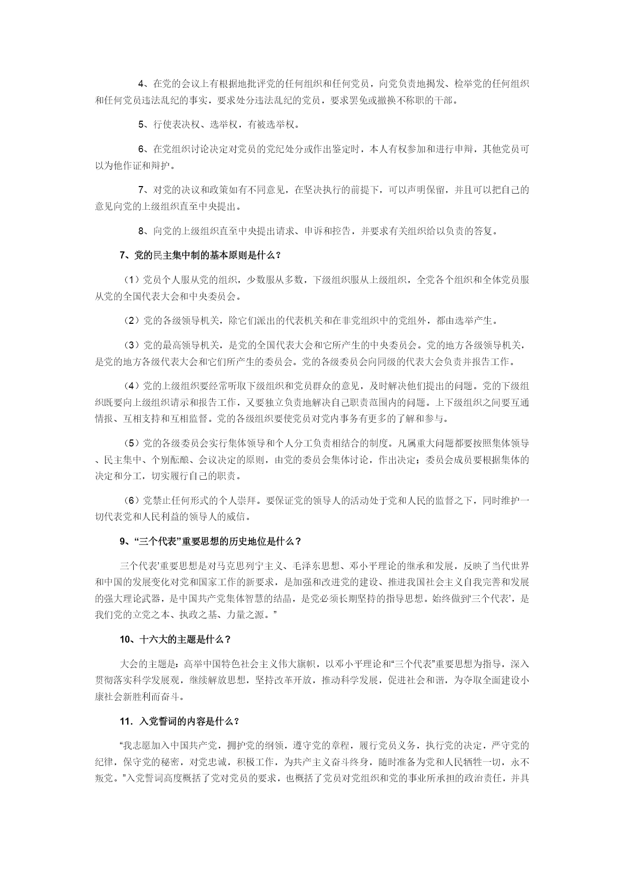2、党在社会主义初级阶段的基本路线是什么?领导和团结全国各族人民,以经济建设为中心,坚持四项基本原则,坚持改革开放,自力更生,艰苦创业,为把我国建设成为富强、民主、文明的社会主义现代化国家而奋斗。”3、为什么说中国共产党是中国工人阶级的先锋队?第一,中国共产党是以工人阶级为阶级基础的。第二,中国共产党是由工人阶级先进分子组成的。第三,中国共产党是用先进理论武装起来的。第四,中国共产党是按照民主集中制的原则建立的。4、上级党组织在批准申请人入党以前,为什么要派人同申请人谈话?一方面是为了使上级党组织直接了解申请人的情况,作进一步的考察,有助于防止产生偏差,保持审批的正确性,从而保证发展党员的质量;另一方面,有助于加深党组织和申请人之间的相互了解,可以有针对性地帮助申请人进一步提高对党的认识,端正入党动机。5、共产党员必须履行哪些义务?(1)认真学习马克思列宁主义、毛泽东思想、邓小平理论和“三个代表”重要思想,学习党的路线、方针、政策及决议,学习党的基本知识,学习科学、文化和业务知识,努力提高为人民服务的本领。(2)贯彻执行党的基本路线和各项方针、政策,带头参加改革开放和社会主义现代化建设,带动群众为经济发展和社会进步艰苦奋斗,在生产、工作、学习和社会生活中起先锋模范作用。(3)坚持党和人民的利益高于一切,个人利益服从党和人民的利益,吃苦在前,享受在后,克己奉公,多做贡献。(4)自觉遵守党的纪律,模范遵守国家的法律法规,严格保守党和国家的秘密,执行党的决定,服从组织分配,积极完成党的任务。(5)维护党的团结和统一,对党忠诚老实,言行一致,坚决反对一切派别组织和小集团活动,反对阳奉阴违的两面派行为和一切阴谋诡计。(6)切实开展批评和自我批评,勇于揭露和纠正工作中的缺点、错误,坚决同消极腐败现象作斗争。(7)密切联系群众,向群众宣传党的主张,遇事同群众商量,及时向党反映群众的意见和要求,维护群众的正当利益。(8)发扬社会主义新风尚,提倡共产主义道德,为了保护国家和人民的利益,在一切困难和危险的时刻挺身而出,英勇斗争,不怕牺牲。6、共产党员享有哪些权利?1、参加党的有关会议,阅读党的有关文件,接受党的教育和培训。2、在党的会议上和党报党刊上,参加关于党的政策问题的讨论。3、对党的工作提出建议和倡议。4、在党的会议上有根据地批评党的任何组织和任何党员,向党负责地揭发、检举党的任何组织和任何党员违法乱纪的事实,要求处分违法乱纪的党员,要求罢免或撤换不称职的干部。5、行使表决权、选举权,有被选举权。6、在党组织讨论决定对党员的党纪处分或作出鉴定时,本人有权参加和进行申辩,其他党员可以为他作证和辩护。7、对党的决议和政策如有不同意见,在坚决执行的前提下,可以声明保留,并且可以把自己的意见向党的上级组织直至中央提出。8、向党的上级组织直至中央提出请求、申诉和控告,并要求有关组织给以负责的答复。7、党的民主集中制的基本原则是什么?(1)党员个人服从党的组织,少数服从多数,下级组织服从上级组织,全党各个组织和全体党员服从党的全国代表大会和中央委员会。(2)党的各级领导机关,除它们派出的代表机关和在非党组织中的党组外,都由选举产生。(3)党的最高领导机关,是党的全国代表大会和它所产生的中央委员会。党的地方各级领导机关,是党的地方各级代表大会和它们所产生的委员会。党的各级委员会向同级的代表大会负责并报告工作。(4)党的上级组织要经常听取下级组织和党员群众的意见,及时解决他们提出的问题。党的下级组织既要向上级组织请示和报告工作,又要独立负责地解决自己职责范围内的问题。上下级组织之间要互通情报、互相支持和互相监督。党的各级组织要使党员对党内事务有更多的了解和参与。(5)党的各级委员会实行集体领导和个人分工负责相结合的制度。凡属重大问题都要按照集体领导、民主集中、个别酝酿、会议决定的原则,由党的委员会集体讨论,作出决定;委员会成员要根据集体的决定和分工,切实履行自己的职责。(6)党禁止任何形式的个人崇拜。要保证党的领导人的活动处于党和人民的监督之下,同时维护一切代表党和人民利益的领导人的威信。9、“三个代表”重要思想的历史地位是什么?三个代表’重要思想是对马克思列宁主义、毛泽东思想、邓小平理论的继承和发展,反映了当代世界和中国的发展变化对党和国家工作的新要求,是加强和改进党的建设、推进我国社会主义自我完善和发展的强大理论武器,是中国共产党集体智慧的结晶,是党必须长期坚持的指导思想。始终做到‘三个代表’,是我们党的立党之本、执政之基、力量之源。”10、十六大的主题是什么?大会的主题是:高举中国特色社会主义伟大旗帜,以邓小平理论和“三个代表”重要思想为指导,深入贯彻落实科学发展观,继续解放思