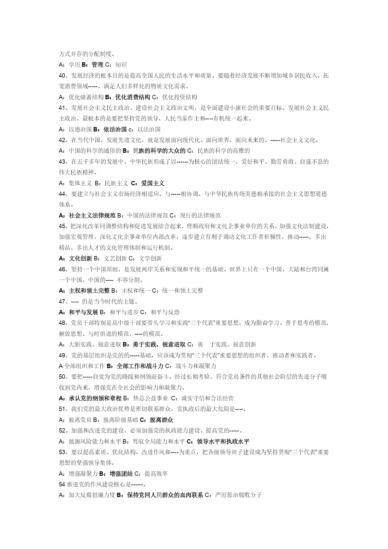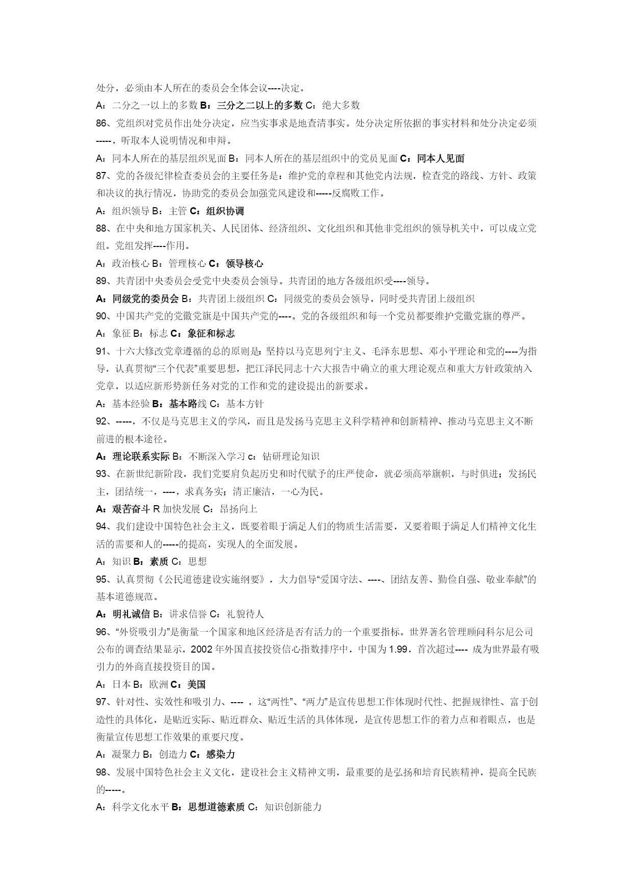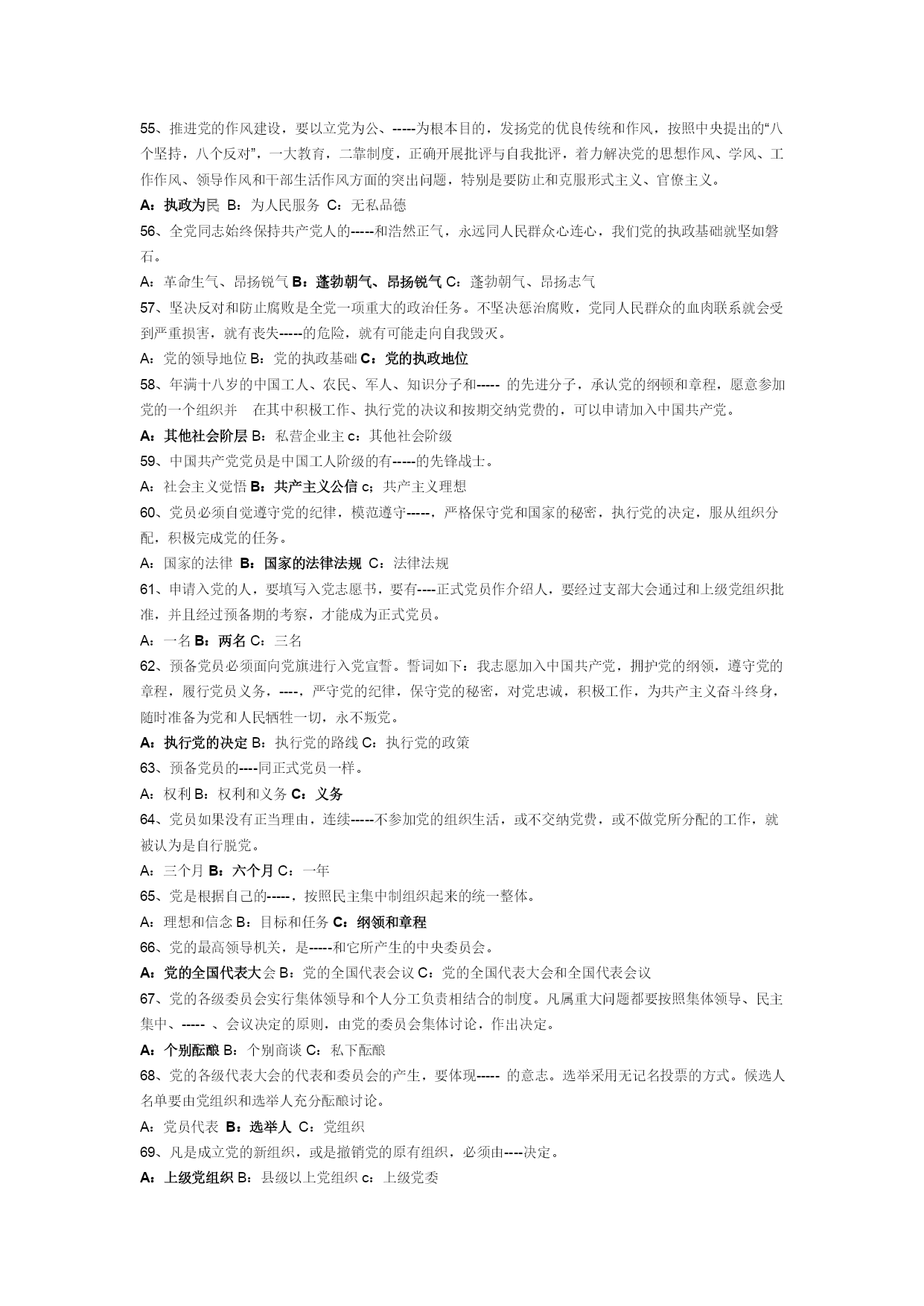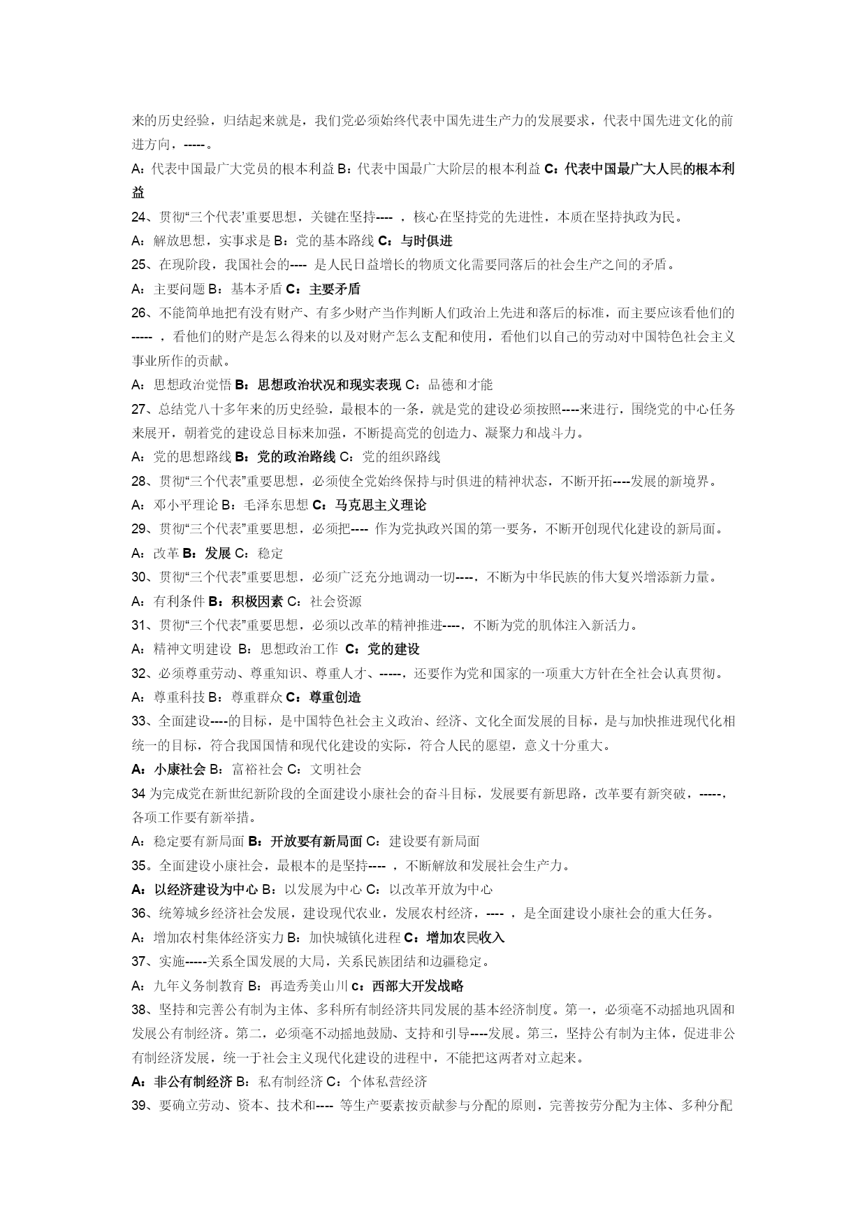 2、党在社会主义初级阶段的基本路线是什么?领导和团结全国各族人民,以经济建设为中心,坚持四项基本原则,坚持改革开放,自力更生,艰苦创业,为把我国建设成为富强、民主、文明的社会主义现代化国家而奋斗。”3、为什么说中国共产党是中国工人阶级的先锋队?第一,中国共产党是以工人阶级为阶级基础的。第二,中国共产党是由工人阶级先进分子组成的。第三,中国共产党是用先进理论武装起来的。第四,中国共产党是按照民主集中制的原则建立的。4、上级党组织在批准申请人入党以前,为什么要派人同申请人谈话?一方面是为了使上级党组织直接了解申请人的情况,作进一步的考察,有助于防止产生偏差,保持审批的正确性,从而保证发展党员的质量;另一方面,有助于加深党组织和申请人之间的相互了解,可以有针对性地帮助申请人进一步提高对党的认识,端正入党动机。5、共产党员必须履行哪些义务?(1)认真学习马克思列宁主义、毛泽东思想、邓小平理论和“三个代表”重要思想,学习党的路线、方针、政策及决议,学习党的基本知识,学习科学、文化和业务知识,努力提高为人民服务的本领。(2)贯彻执行党的基本路线和各项方针、政策,带头参加改革开放和社会主义现代化建设,带动群众为经济发展和社会进步艰苦奋斗,在生产、工作、学习和社会生活中起先锋模范作用。(3)坚持党和人民的利益高于一切,个人利益服从党和人民的利益,吃苦在前,享受在后,克己奉公,多做贡献。(4)自觉遵守党的纪律,模范遵守国家的法律法规,严格保守党和国家的秘密,执行党的决定,服从组织分配,积极完成党的任务。(5)维护党的团结和统一,对党忠诚老实,言行一致,坚决反对一切派别组织和小集团活动,反对阳奉阴违的两面派行为和一切阴谋诡计。(6)切实开展批评和自我批评,勇于揭露和纠正工作中的缺点、错误,坚决同消极腐败现象作斗争。(7)密切联系群众,向群众宣传党的主张,遇事同群众商量,及时向党反映群众的意见和要求,维护群众的正当利益。(8)发扬社会主义新风尚,提倡共产主义道德,为了保护国家和人民的利益,在一切困难和危险的时刻挺身而出,英勇斗争,不怕牺牲。6、共产党员享有哪些权利?1、参加党的有关会议,阅读党的有关文件,接受党的教育和培训。2、在党的会议上和党报党刊上,参加关于党的政策问题的讨论。3、对党的工作提出建议和倡议。4、在党的会议上有根据地批评党的任何组织和任何党员,向党负责地揭发、检举党的任何组织和任何党员违法乱纪的事实,要求处分违法乱纪的党员,要求罢免或撤换不称职的干部。5、行使表决权、选举权,有被选举权。6、在党组织讨论决定对党员的党纪处分或作出鉴定时,本人有权参加和进行申辩,其他党员可以为他作证和辩护。7、对党的决议和政策如有不同意见,在坚决执行的前提下,可以声明保留,并且可以把自己的意见向党的上级组织直至中央提出。8、向党的上级组织直至中央提出请求、申诉和控告,并要求有关组织给以负责的答复。7、党的民主集中制的基本原则是什么?(1)党员个人服从党的组织,少数服从多数,下级组织服从上级组织,全党各个组织和全体党员服从党的全国代表大会和中央委员会。(2)党的各级领导机关,除它们派出的代表机关和在非党组织中的党组外,都由选举产生。(3)党的最高领导机关,是党的全国代表大会和它所产生的中央委员会。党的地方各级领导机关,是党的地方各级代表大会和它们所产生的委员会。党的各级委员会向同级的代表大会负责并报告工作。(4)党的上级组织要经常听取下级组织和党员群众的意见,及时解决他们提出的问题。党的下级组织既要向上级组织请示和报告工作,又要独立负责地解决自己职责范围内的问题。上下级组织之间要互通情报、互相支持和互相监督。党的各级组织要使党员对党内事务有更多的了解和参与。(5)党的各级委员会实行集体领导和个人分工负责相结合的制度。凡属重大问题都要按照集体领导、民主集中、个别酝酿、会议决定的原则,由党的委员会集体讨论,作出决定;委员会成员要根据集体的决定和分工,切实履行自己的职责。(6)党禁止任何形式的个人崇拜。要保证党的领导人的活动处于党和人民的监督之下,同时维护一切代表党和人民利益的领导人的威信。9、“三个代表”重要思想的历史地位是什么?三个代表’重要思想是对马克思列宁主义、毛泽东思想、邓小平理论的继承和发展,反映了当代世界和中国的发展变化对党和国家工作的新要求,是加强和改进党的建设、推进我国社会主义自我完善和发展的强大理论武器,是中国共产党集体智慧的结晶,是党必须长期坚持的指导思想。始终做到‘三个代表’,是我们党的立党之本、执政之基、力量之源。”10、十六大的主题是什么?大会的主题是:高举中国特色社会主义伟大旗帜,以邓小平理论和“三个代表”重要思想为指导,深入贯彻落实科学发展观,继续解放思