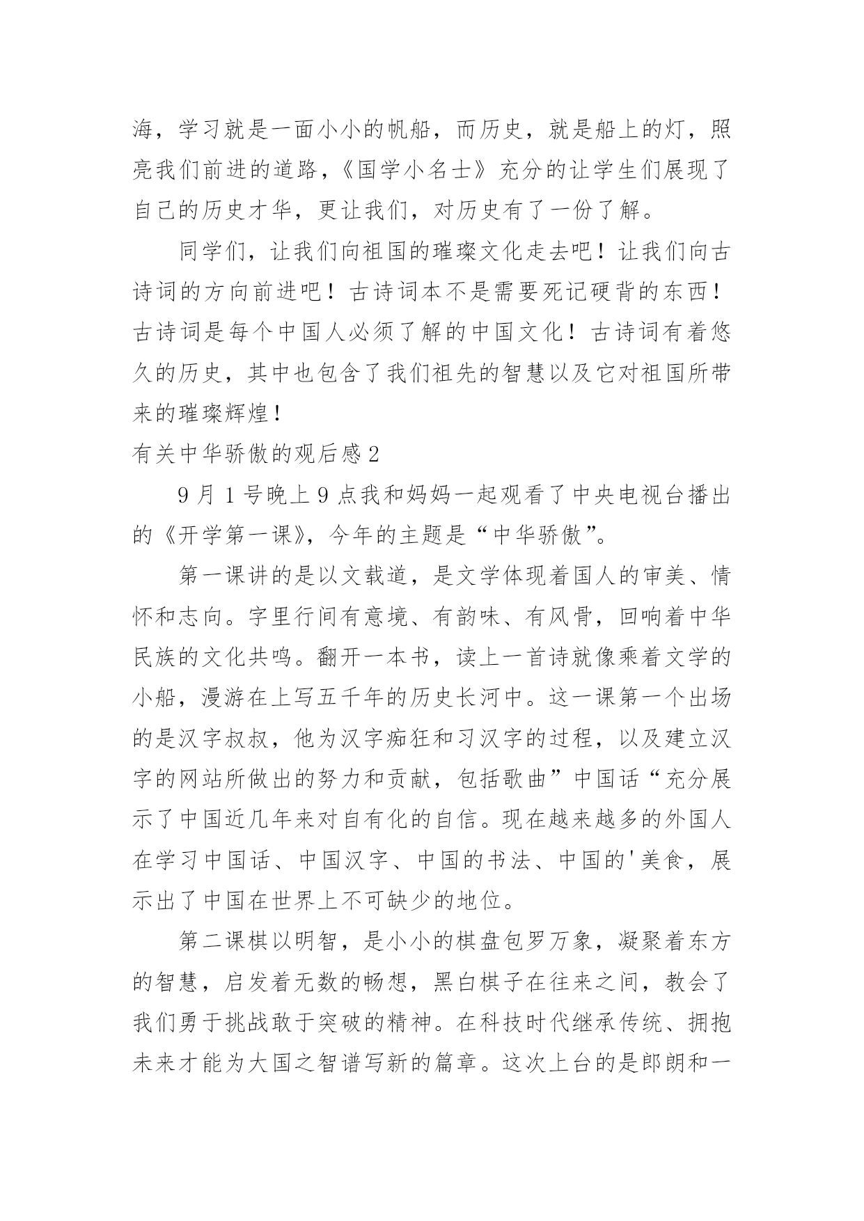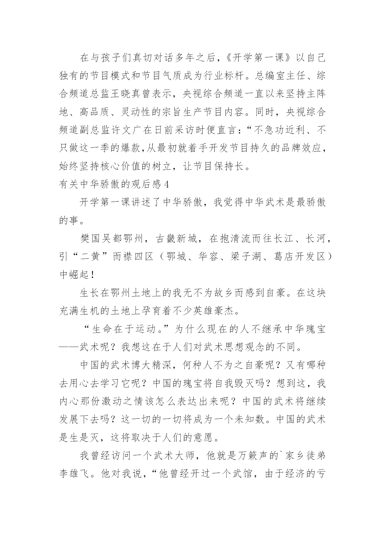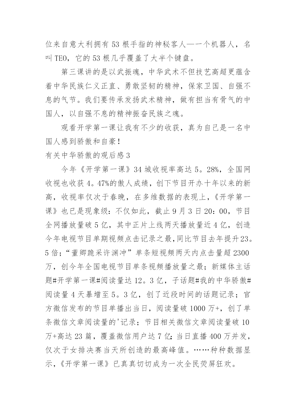 中华骄傲的观后感有关中华骄傲的观后感认真看完一部作品以后,一定有不少感悟吧,这时候,最关键的观后感怎么能落下!那么观后感到底应该怎么写呢?以下是小编为大家收集的有关中华骄傲的观后感,欢迎阅读与收藏。有关中华骄傲的观后感1通过看《国学小名士》我加深了对古诗词加深了理解。古诗词已不再是需要死记硬背的东西了,古诗词是每个中国人必须了解的文化,古诗词有着悠久的历史,其中也包含了我们祖先的智慧。《国学小名士》比赛中的每一位选手都能熟练背诵许多的古诗词,朗朗上口、滔滔不绝。选手们所背诵的古诗词有的是我们耳熟能详的,也有的可能是我们从未听过的。可是他们却句句背诵的滚瓜烂熟。不管是作者即背景还是思想内容,都掌握的非常熟练。这种对古诗词的热爱与熟练程度令我从心里震撼无比。中华民族的优秀传统文化是那样悠久和博大精深,古人给我们留下了灿烂的文化文明和精神财富,使我们一生受益。很庆幸,我们是华夏儿女,我为我们伟大的.中华民族感到骄傲和自豪!历史是美好的,历史是伟大的,知识好比是大海,学习就是一面小小的帆船,而历史,就是船上的灯,照亮我们前进的道路,《国学小名士》充分的让学生们展现了自己的历史才华,更让我们,对历史有了一份了解。同学们,让我们向祖国的璀璨文化走去吧!让我们向古诗词的方向前进吧!古诗词本不是需要死记硬背的东西!古诗词是每个中国人必须了解的中国文化!古诗词有着悠久的历史,其中也包含了我们祖先的智慧以及它对祖国所带来的璀璨辉煌!有关中华骄傲的观后感29月1号晚上9点我和妈妈一起观看了中央电视台播出的《开学第一课》,今年的主题是“中华骄傲”。第一课讲的是以文载道,是文学体现着国人的审美、情怀和志向。字里行间有意境、有韵味、有风骨,回响着中华民族的文化共鸣。翻开一本书,读上一首诗就像乘着文学的小船,漫游在上写五千年的历史长河中。这一课第一个出场的是汉字叔叔,他为汉字痴狂和习汉字的过程,以及建立汉字的网站所做出的努力和贡献,包括歌曲”中国话“充分展示了中国近几年来对自有化的自信。现在越来越多的外国人在学习中国话、中国汉字、中国的书法、中国的'美食,展示出了中国在世界上不可缺少的地位。第二课棋以明智,是小小的棋盘包罗万象,凝聚着东方的智慧,启发着无数的畅想,黑白棋子在往来之间,教会了我们勇于挑战敢于突破的精神。在科技时代继承传统、拥抱未来才能为大国之智谱写新的篇章。这次上台的是郎朗和一位来自意大利拥有53根手指的神秘客人—一个机器人,名叫TEO,它的53根几乎覆盖了大半个键盘。第三课讲的是以武振魂,中华武术不但技艺高超更蕴含着中华民族仁义正直、勇敢坚韧的精神,保家卫国、自强不息的气节。我们要传承发扬武术精神,做有担当有骨气的中国人,以自强不息的精神振奋民族之魂。观看开学第一课让我有不少的收获,真为自己是一名中国人感到骄傲和自豪!有关中华骄傲的观后感3今年《开学第一课》34城收视率高达5。28%,全国网收视也收获4。47%的傲人成绩,创下节目开办十年以来的新高,收视率仅次于春晚,在多维数据的表现上,《开学第一课》也已是现象级:不仅如此,截止9月3日20:00,节目全网播放量破5亿,其中正片上线两天播放量近4亿,创造今年电视节目单期视频点击记录之最,同比节目去年提升23。5倍;“董卿跪采许渊冲”单条短视频两天内点击量超2300万,创今年全国电视节目单条视频播放量之最;新媒体主话题#开学第一课#阅读量达12。3亿,子话题#我的中华骄傲#阅读量4天暴增至5。3亿,创了近段时间的话题记录;官方微信发布的节目单播出当日,阅读量破1000万+,创了单条微信文章阅读量的'记录;节目相关微信文章阅读量破10万+高达23篇,覆盖微信用户达7亿;当日直播400万并发,仅次于女排决赛当天所创造的最高峰值。……种种数据显示,《开学第一课》已真真切切成为一次全民荧屏狂欢。在与孩子们真切对话多年之后,《开学第一课》以自己独有的节目模式和节目气质成为行业标杆。总编室主任、综合频道总监王晓真曾表示,央视综合频道一直以来坚持主阵地、高品质、灵动性的宗旨生产节目内容。同时,央视综合频道副总监许文广在日前采访时便直言:“不急功近利、不只做这一季的爆款,从最初就着手开发节目持久的品牌效应,始终坚持核心价值的树立,让节目保持长。有关中华骄傲的观后感4开学第一课讲述了中华骄傲,我觉得中华武术是最骄傲的事。樊国吴都鄂州,古畿新城,在抱清流而往长江、长河,引“二黄”而襟四区(鄂城、华容、梁子湖、葛店开发区)中崛起!生长在鄂州土地上的我无不为故乡而感到自豪。在这块充满生机的土地上孕育着不少英雄豪杰。“生命在于运动。”为什么现在的人不继承中华瑰宝——武术呢?我想这在于人们对武术思想观念的不同。中国的武术博大精深,何种人不为之自豪呢?又有哪种去用心去学习它呢?中国的瑰宝将自我毁灭吗?想到这,我内心那份
