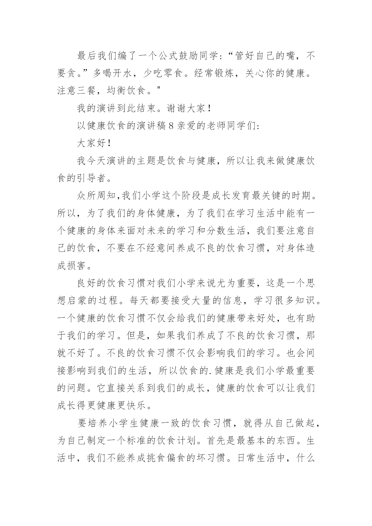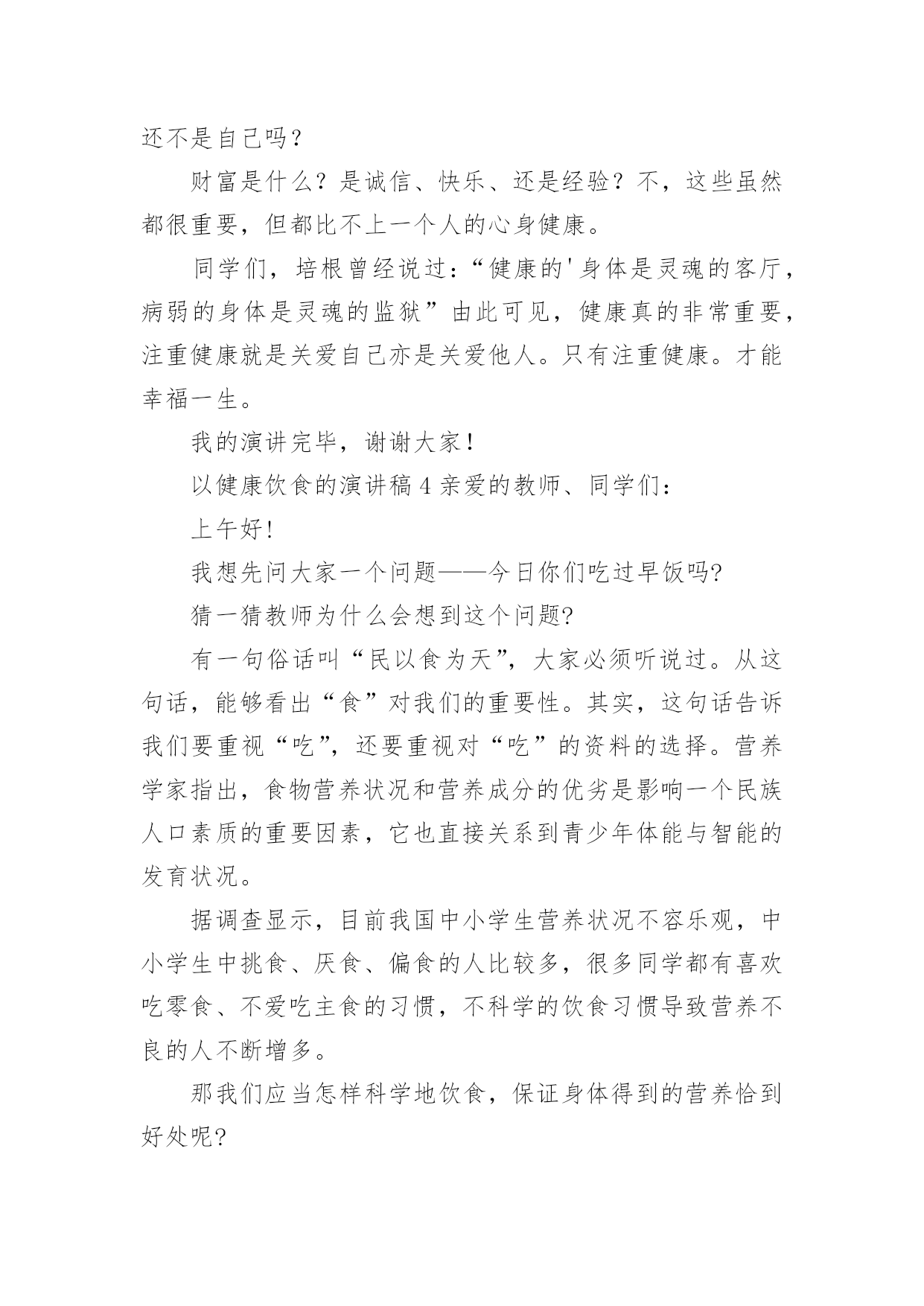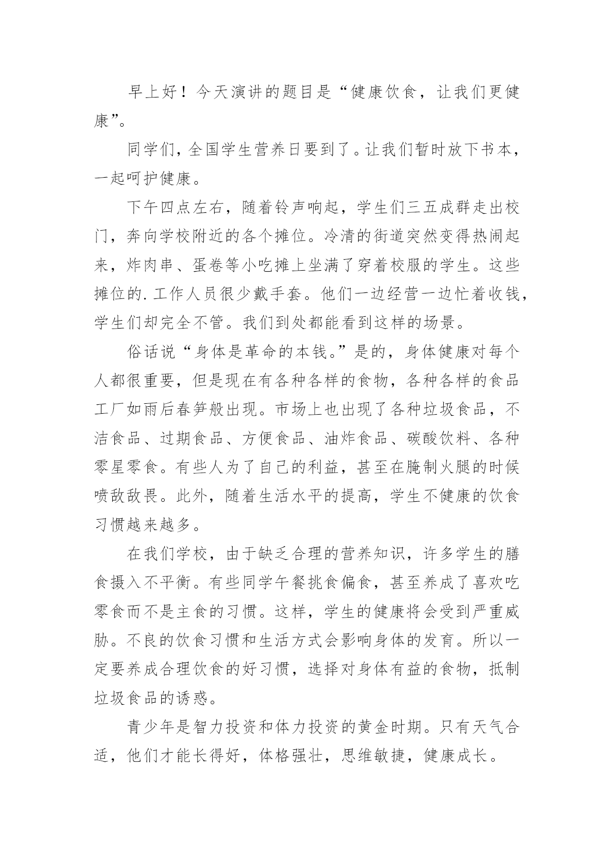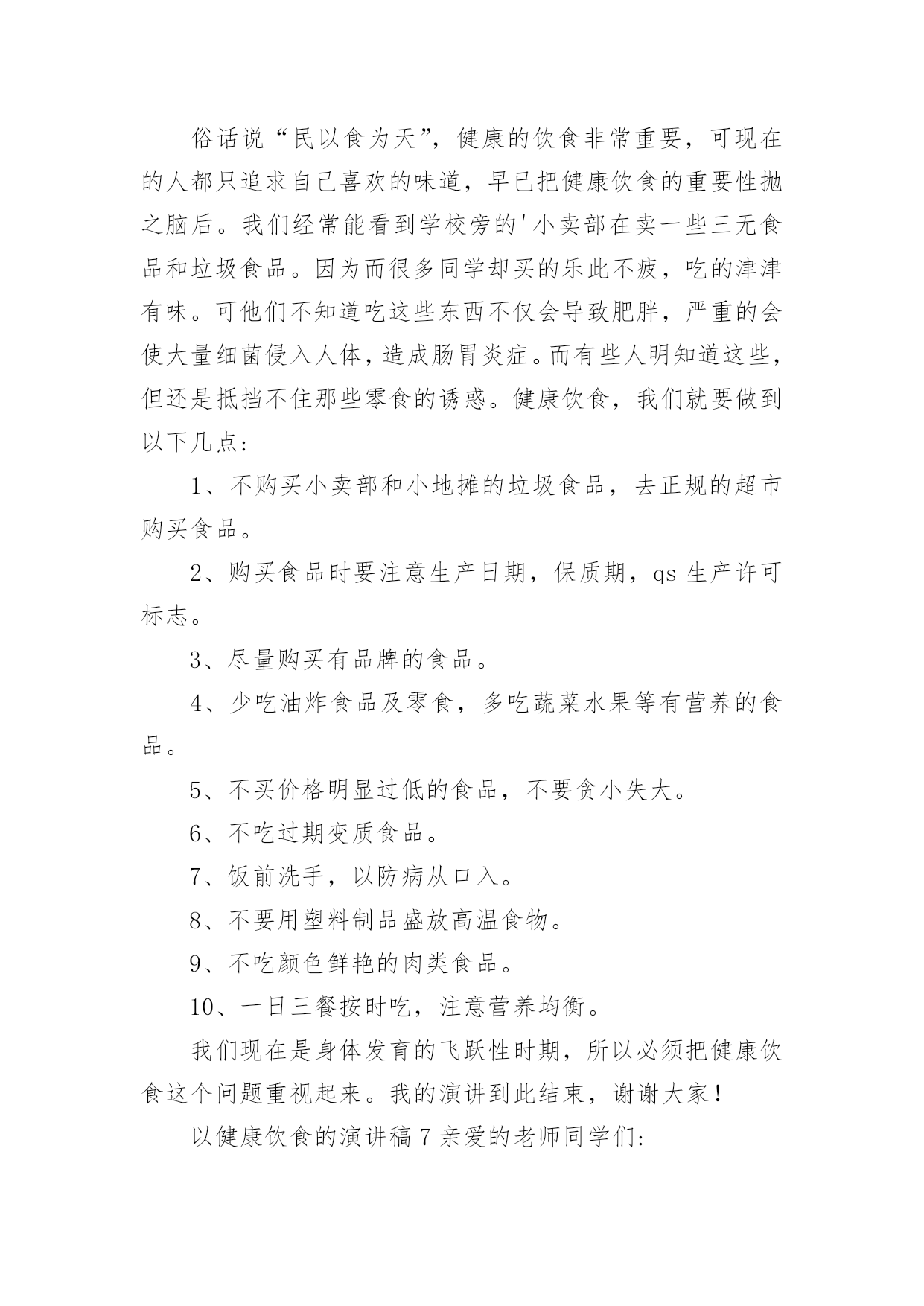 以健康饮食的演讲稿以健康饮食的演讲稿(精选13篇)演讲稿可以提高演讲人的自信心,有助发言人更好地展现自己。在社会一步步向前发展的今天,我们可以使用演讲稿的机会越来越多,你知道演讲稿怎样才能写的好吗?下面是小编收集整理的以健康饮食的演讲稿(精选13篇),希望能够帮助到大家。以健康饮食的演讲稿1尊敬的老师、亲爱的同学们:大家上午好!近期,我在放学的时候,经常发现很多同学一出校门便奔向门口的小卖部,不一会儿,一个个手中便出现了一袋袋的“战利品”,一边迫不及待的往嘴里塞一边愉快的聊着天,感觉“美味极了”!再说说我们的午托部,一些同学仗着爸妈不在身边,经常挑食、不吃饭。然后趁着午托老师不注意跑去街边小店买一些所谓的“极好吃食品”,什么“米线”呀,“肉饼”呀,“辣条”呀等等。更嚣张的'是他们不仅睡前吃,躺在床上还偷吃,午托老师拦都拦不住。我好奇的问他们这些东西什么味道的,真有那么好吃么?他们的神情告诉我,这个东西确实十分的“美味”。妈妈总是告诉我,那些“无良”的产品,里边放了很多的“香精”,就像“毒品”一样,会使人痴迷。如果你真的想吃,还请你选择到正规的卖场或超市购买,但记得不能多吃哟!同学们,为了我们的身体健康,请远离这些垃圾食品!谢谢大家!以健康饮食的演讲稿2尊敬的老师,亲爱的同学们:大家早上好!今天我演讲的主题是《合理膳食,健康成长》。俗话说:“民以食为天”每天的饮食是我们赖以生存的基础,食品是补充身体营养的最有效的途径。食品质量的好坏直接关系到我们的身体。尤其是我们青少年处在生长发育的黄金时段,但有些同学自制力不强,经常会为了一些口腹之欲去吃一些路边摊上不卫生的食品。殊不知这些食品不仅没有营养价值,而且对我们的健康百害而无一利。总有那么一群人,即使知道了食品的危害,仍然在路边的小摊小贩上购买食品。况且市场上大有一些黑心商家,用价格低廉的原材料甚至是有毒的化学物质制成看似营养丰富,实则是让人避而远之的毒大米、毒牛奶,甚至是塑料,你吃的不是蛋白质,而是可以让人致命的'。也许你刚刚吃完的外卖就是商家在不足五平方米的小房间里用上述材料为你精心制作的。等我们到中年的时候,这些潜在的危险便会一股脑全部爆发出来,让你猝不及防。现在拥有健康的本钱,就等于拥有了拼搏的能力。俗话说:“身体是革命的本钱”只要我们拥有强健的体魄,还有什么可以阻挡我们前进的脚步呢?我们还有什么事情是不能做到的呢?那么,如何才能做到合理膳食呢?就三餐而言,早餐应该吃一些营养价值高,少而精的食品。人经过一夜的睡眠,头一晚上进食的营养已近基本消耗完。早上只有及时地补充才能满足我们上午的学习。午餐,则要保证食品的质与量。因为午餐具有承上启下的作用,既要补充早餐吃得少,上午活动量大、能量消耗的空缺,又要为下午的耗能储备能量。至于晚餐,则不能吃的太饱,多余的热量会转换成脂肪,使人发胖,另外,晚餐也不宜吃的太晚,六点最为合适!所以在这里,我希望同学适当的食用快餐、油炸食品,远离过期的小摊小贩上的垃圾食品。用健康的身体和饱满的精神迎接新的一天!我的演讲到此结束,谢谢大家!以健康饮食的演讲稿3亲爱的老师同学们:大家好!俗话说“身体是人们一生的本钱”健康是我们所有人都需要的,健康的身体是生活中取得成功的关键,调理好自己的身体是每个人重要的责任。合理的饮食是很重要的,有句话说得好“人是铁,饭是钢,一顿不吃饿的慌。”人就像一台机械,那么饭就是这台机器的能源。合理的饮食习惯能更好的帮助我们拥有一个强大的胃,提供给人们所需要的各种营养。如果你的饮食习惯没有规律,就会导致发胖等对身体有害的各种疾病,嘴巴是吃的爽了,自己的身体却要为嘴巴的行为买单,最终受害的还不是自己吗?财富是什么?是诚信、快乐、还是经验?不,这些虽然都很重要,但都比不上一个人的心身健康。同学们,培根曾经说过:“健康的'身体是灵魂的客厅,病弱的身体是灵魂的监狱”由此可见,健康真的非常重要,注重健康就是关爱自己亦是关爱他人。只有注重健康。才能幸福一生。我的演讲完毕,谢谢大家!以健康饮食的演讲稿4亲爱的教师、同学们:上午好!我想先问大家一个问题——今日你们吃过早饭吗?猜一猜教师为什么会想到这个问题?有一句俗话叫“民以食为天”,大家必须听说过。从这句话,能够看出“食”对我们的重要性。其实,这句话告诉我们要重视“吃”,还要重视对“吃”的资料的选择。营养学家指出,食物营养状况和营养成分的优劣是影响一个民族人口素质的重要因素,它也直接关系到青少年体能与智能的发育状况。据调查显示,目前我国中小学生营养状况不容乐观,中小学生中挑食、厌食、偏食的人比较多,很多同学都有喜欢吃零食、不爱吃主食的习惯,不科学的饮食习惯导致营养不良的人不断增多。那我们应当怎样科学地饮食,保证身体得到的营养恰到好处呢?首先,要养成不挑食、不偏食的习惯。经常偏食、挑食,容易营养