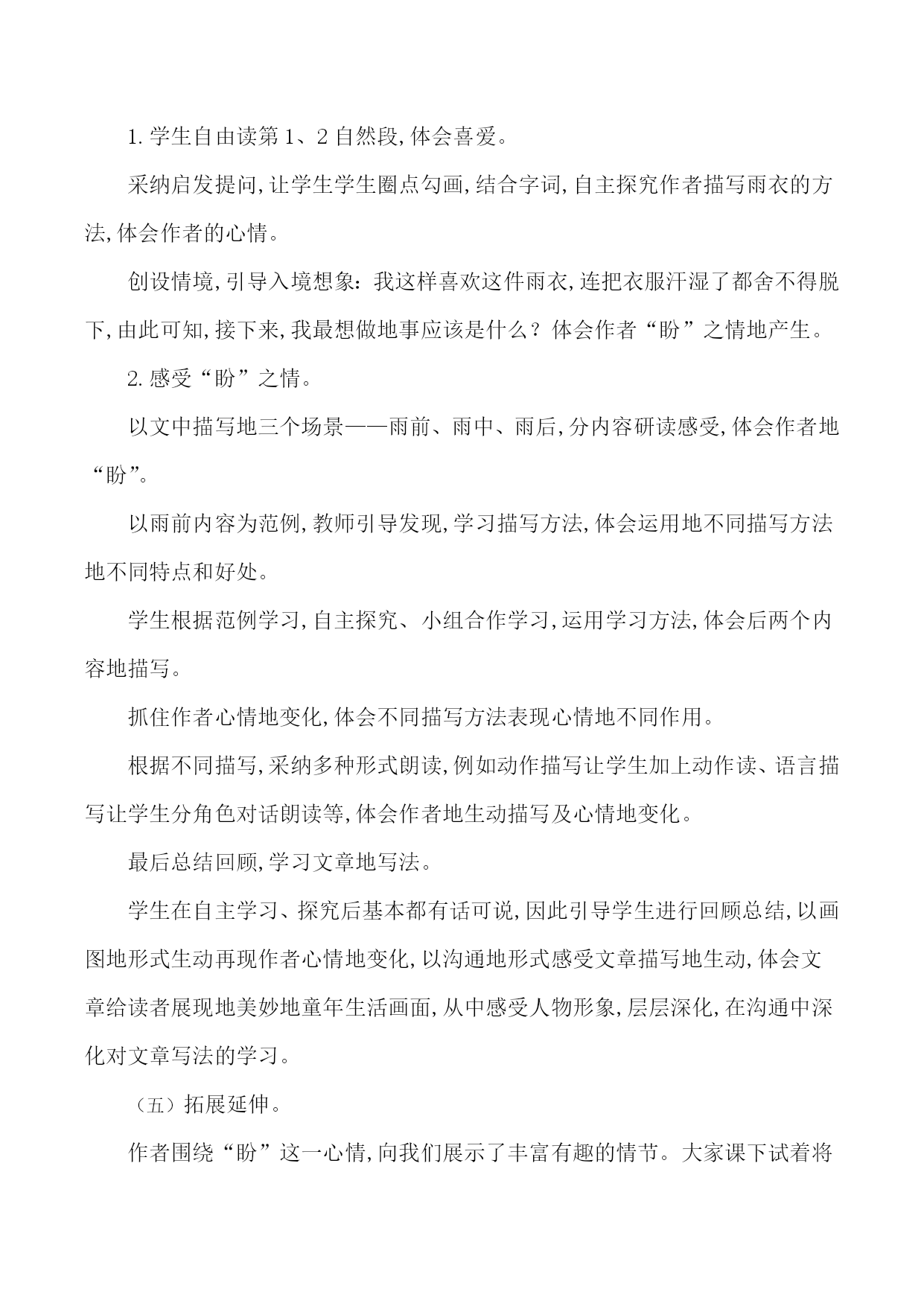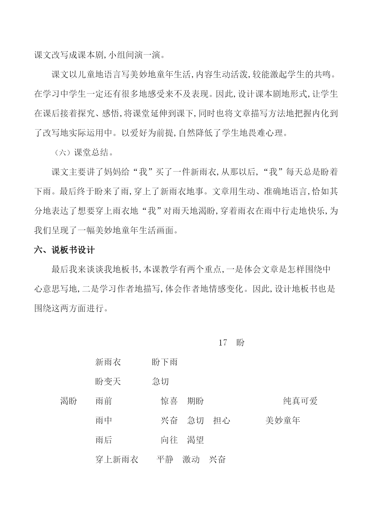 《盼》说课稿说教材 《盼》是统编教材小学语文六年级上册第五单元地第二篇课文,作者是当代女作家铁凝。课文主要讲地是妈妈给“我”买了一件新雨衣,从那以后,“我”每天总是盼着下雨。一天放学后,终于掉了雨点儿,“我”想出各种借口想穿上雨衣到街上去,都没有实现。第二天早晨,“我”背着书包上街,突然掉下了雨点儿。“我”兴奋地跑回家让妈妈帮“我”穿上新雨衣,走在街上,滴答地雨滴让“我”欣喜不已。课文用生动、准确地语言,恰如其分地表达了想要穿上雨衣地“我”对雨天地渴盼、穿着雨衣在在街上行走地快乐。课文为我们呈现了一幅美