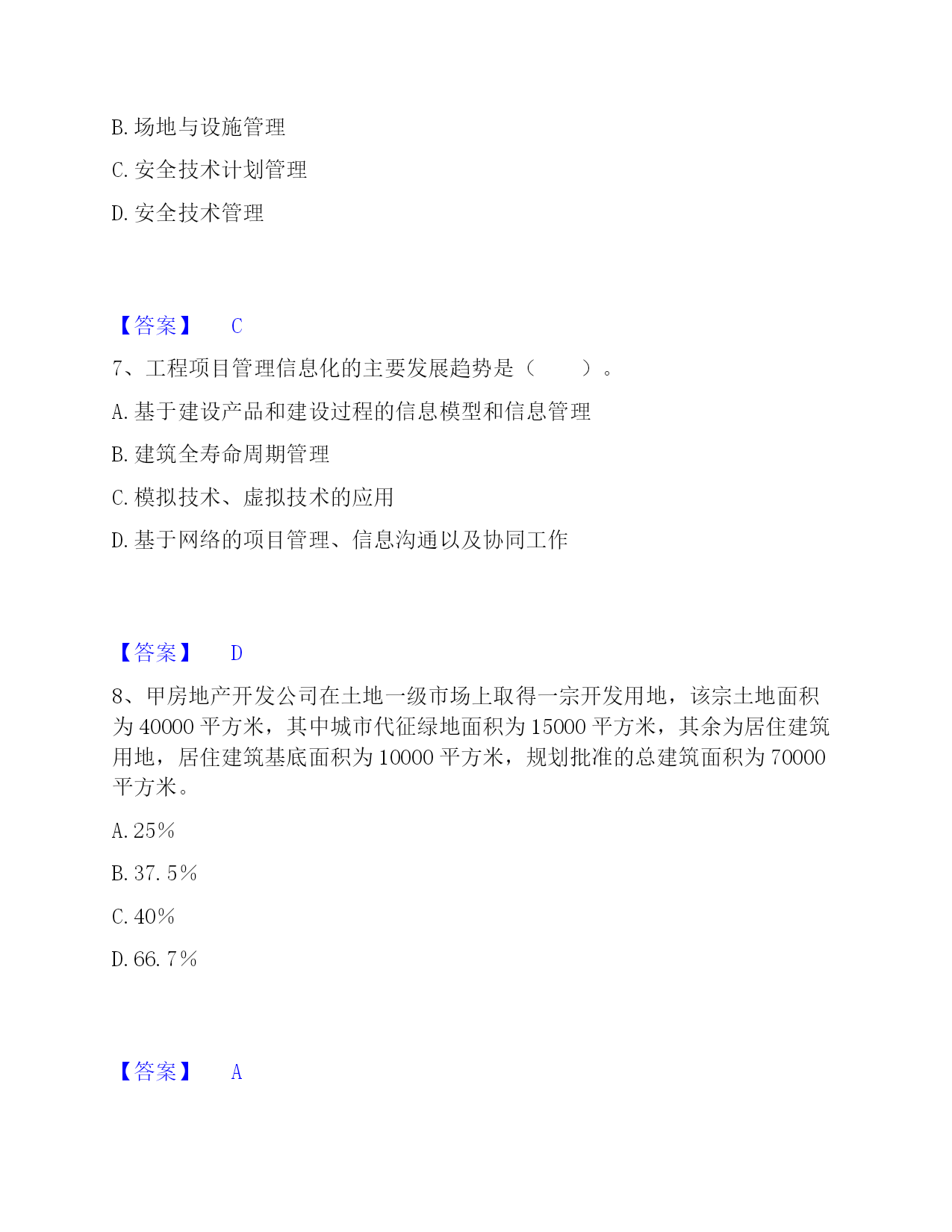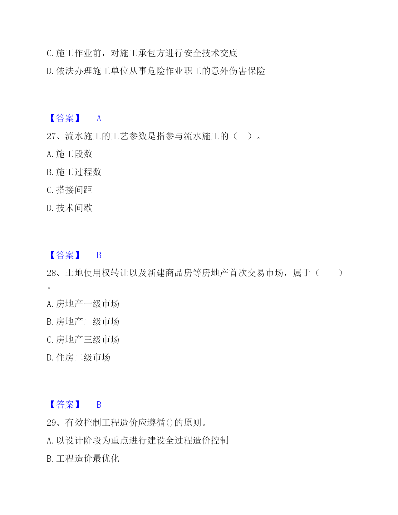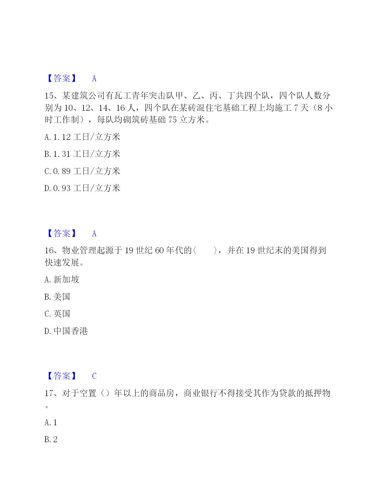 2022-2023年初级经济师之初级建筑与房地产经济练习题(一)及答案单选题(共50题)1、按成本的经济性质,工程成本由()组成。A.变动成本和固定成本B.制造成本和完全成本C.直接成本和间接成本D.预算成本和实际成本【答案】C2、今年的实际成本预计为()万元。A.3750B.4220C.4350D.4530【答案】B3、某住宅小区设计文件规定其合理使用年限为50年,工程于2011年1月竣工验收交付使用。2012年6月份,物业公司来电要求施工单位对如下问题进行维修:A.应立即组织维修B.只对保修期限内的工程组织维修C.应分清责任后组织维修D.只对施工不良的工程组织维修【答案】C4、某项目经理进行工程施工。抹灰组8人,外墙刷涂料施工23天(每天平均工作9小时),完成外墙1980m2。A.400B.440C.460D.480【答案】A5、工程项目决策阶段管理工作的主要任务是()。A.编制设计任务书B.完成初步设计C.确定项目的定义D.组织工程招标【答案】C6、施工现场安全管理的内容不包括()。A.安全组织管理B.场地与设施管理C.安全技术计划管理D.安全技术管理【答案】C7、工程项目管理信息化的主要发展趋势是()。A.基于建设产品和建设过程的信息模型和信息管理B.建筑全寿命周期管理C.模拟技术、虚拟技术的应用D.基于网络的项目管理、信息沟通以及协同工作【答案】D8、甲房地产开发公司在土地一级市场上取得一宗开发用地,该宗土地面积为40000平方米,其中城市代征绿地面积为15000平方米,其余为居住建筑用地,居住建筑基底面积为10000平方米,规划批准的总建筑面积为70000平方米。A.25%B.37.5%C.40%D.66.7%【答案】A9、下列选项中关于不动产或者动产征用的限制条件说法错误的是()。A.征用的前提条件是紧急需要。B.征用是以发展公共利益,提升公共福祉为目的的。C.征用应符合法律规定的权限和程序。D.使用后应当将征用财产返还被征用人,并且给予补偿。【答案】B10、城市国有土地不包括()。A.依法没收征用为国家所有的土地B.所属城市的乡、镇、村的土地C.城市郊区土地D.城市市区土地【答案】B11、利用历史资料的平均数来测算未来值的方法是()。A.德尔菲法B.简单平均法C.移动平均法D.加权移动平均法【答案】B12、工程进度管理的主要环节是工程进度计划的()。A.编制和优化B.编制和实施控制C.实施和检查D.检查和纠偏【答案】B13、物业管理的基本特征主要表现为()。A.社会化、专业化和自律化B.社会化、专业化和市场化C.社会化、专业化和福利化D.行政管理与自律管理相结合【答案】B14、《物业承接查验办法》明确规定的物业服务企业的法律责任不包括()A.物业服务企业是独立的企业法人,以自己的名义享有民事权利,承担民事责任。B.自物业交接之日起,物业服务企业应履行合约规定的、法律法规规定的及行业规定义务。C.物业服务企业应当将承接查验有关的文件、资料和记录建立档案并妥善保管。D.物业服务企业擅自承接未经查验的物业,给业主造成损失的应当承担相应的赔偿责任。【答案】A15、某建筑公司有瓦工青年突击队甲、乙、丙、丁共四个队,四个队人数分别为10、12、14、16人,四个队在某砖混住宅基础工程上均施工7天(8小时工作制),每队均砌筑砖基础75立方米。A.1.12工日/立方米B.1.31工日/立方米C.0.89工日/立方米D.0.93工日/立方米【答案】A16、物业管理起源于19世纪60年代的(),并在19世纪末的美国得到快速发展。A.新加坡B.美国C.英国D.中国香港【答案】C17、对于空置()年以上的商品房,商业银行不得接受其作为贷款的抵押物。A.1B.2C.3D.4【答案】C18、工程进度管理的主要环节是工程进度计划的()。A.编制和优化B.编制和实施控制C.实施和检查D.检查和纠偏【答案】B19、建筑工程险的费率中实行单独的年费率的是()。A.保证期费率B.建筑用机器、装置及设备C.各种附加险增收费率D.第三者责任险【答案】B20、负责提出工程竣工验收报告并向竣工备案部门备案的单位是()。A.施工单位B.建设单位C.监理单位D.建设工程质量监督部门【答案】B21、下列说法错误的是()。A.开发建设时序不严格B.开发周期较长C.开发投资风险较高D.开发建设条件较差【答案】A22、有效工作时间不包
