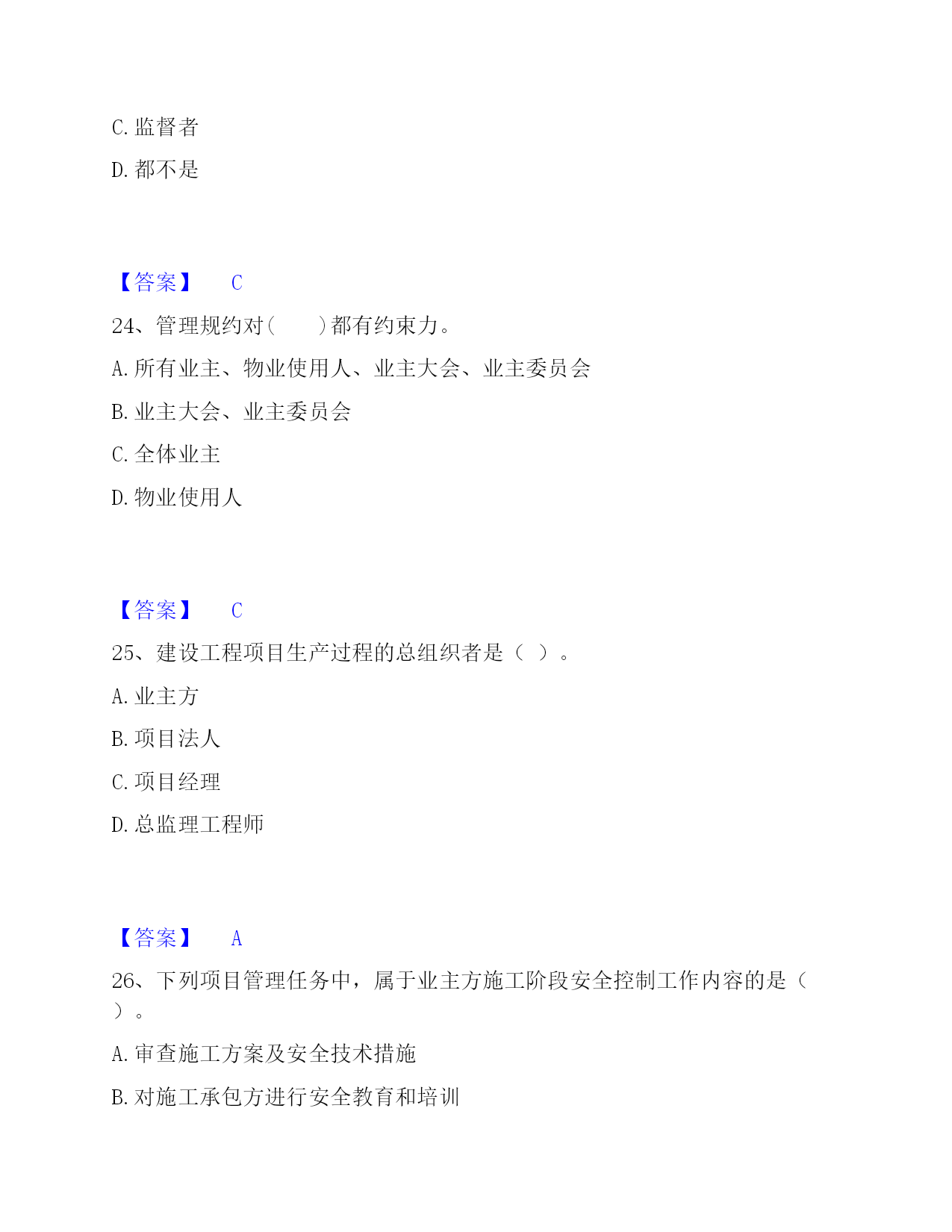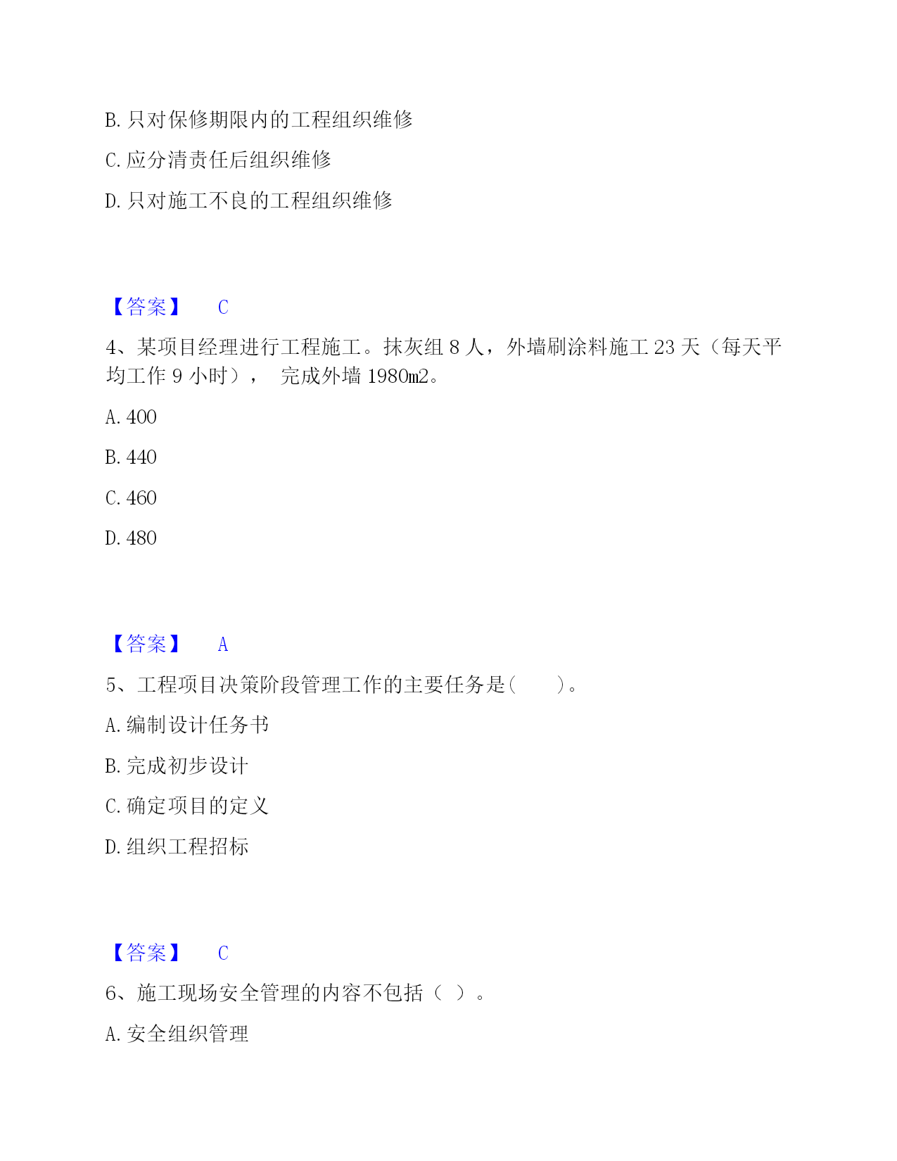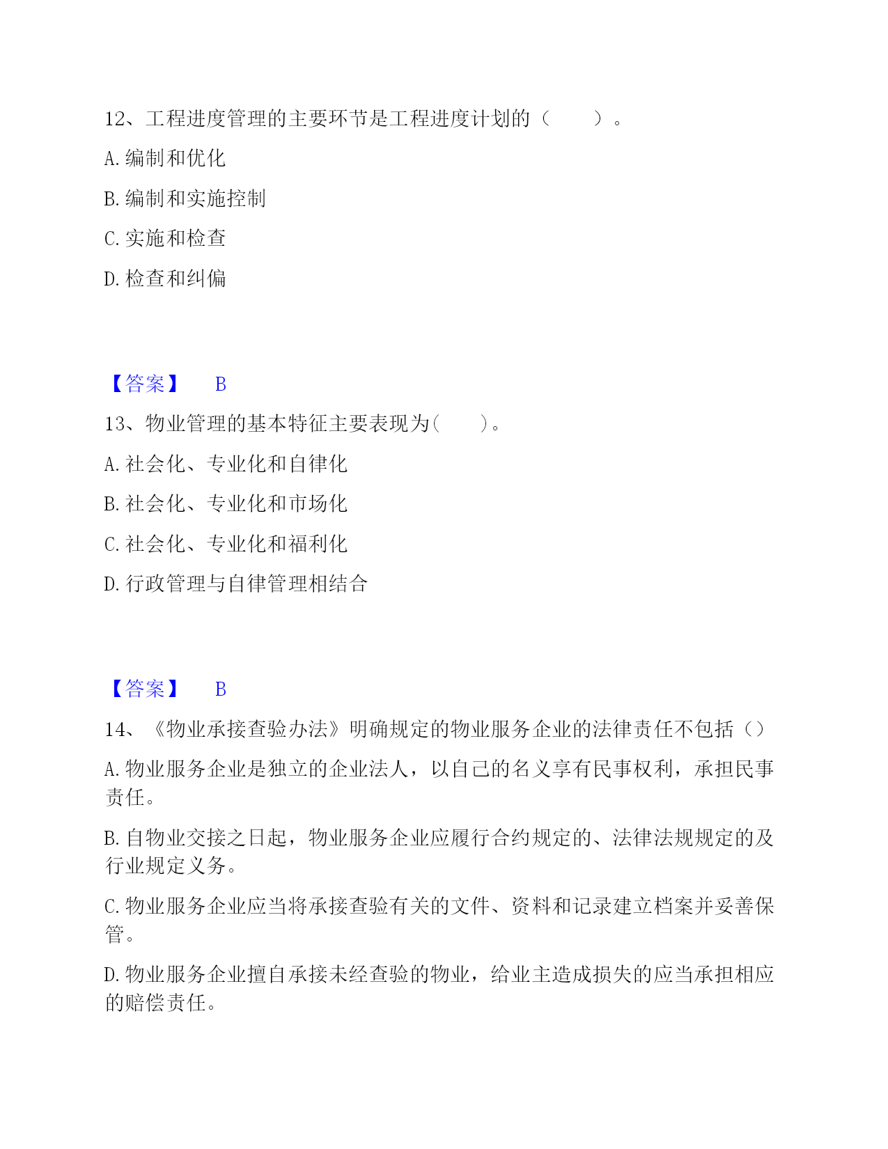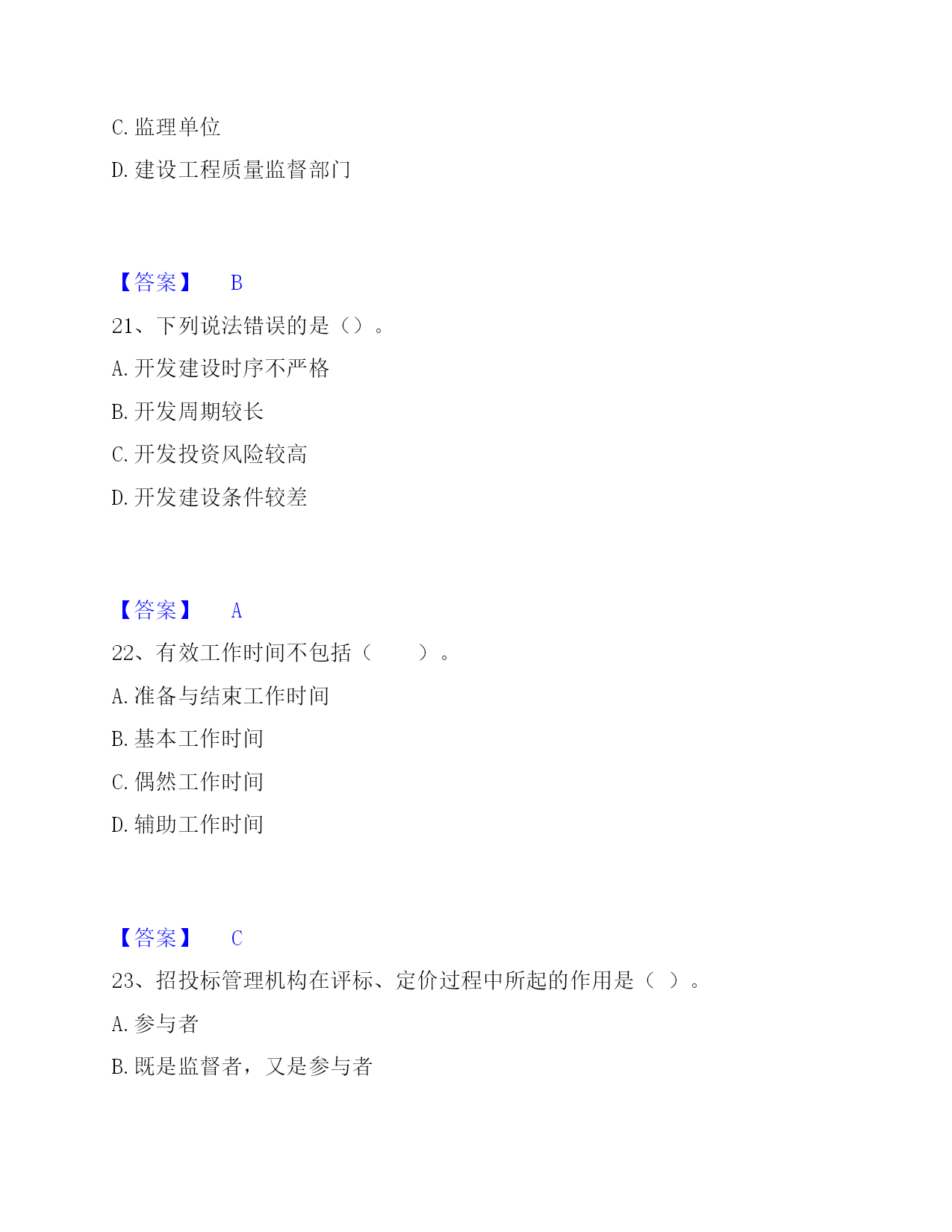 2022-2023年初级经济师之初级建筑与房地产经济练习题(一)及答案单选题(共50题)1、按成本的经济性质,工程成本由()组成。A.变动成本和固定成本B.制造成本和完全成本C.直接成本和间接成本D.预算成本和实际成本【答案】C2、今年的实际成本预计为()万元。A.3750B.4220C.4350D.4530【答案】B3、某住宅小区设计文件规定其合理使用年限为50年,工程于2011年1月竣工验收交付使用。2012年6月份,物业公司来电要求施工单位对如下问题进行维修:A.应立即组织维修B.只对保修期限内的工程组织维修C.应分清责任后组织维修D.只对施工不良的工程组织维修【答案】C4、某项目经理进行工程施工。抹灰组8人,外墙刷涂料施工23天(每天平均工作9小时),完成外墙1980m2。A.400B.440C.460D.480【答案】A5、工程项目决策阶段管理工作的主要任务是()。A.编制设计任务书B.完成初步设计C.确定项目的定义D.组织工程招标【答案】C6、施工现场安全管理的内容不包括()。A.安全组织管理B.场地与设施管理C.安全技术计划管理D.安全技术管理【答案】C7、工程项目管理信息化的主要发展趋势是()。A.基于建设产品和建设过程的信息模型和信息管理B.建筑全寿命周期管理C.模拟技术、虚拟技术的应用D.基于网络的项目管理、信息沟通以及协同工作【答案】D8、甲房地产开发公司在土地一级市场上取得一宗开发用地,该宗土地面积为40000平方米,其中城市代征绿地面积为15000平方米,其余为居住建筑用地,居住建筑基底面积为10000平方米,规划批准的总建筑面积为70000平方米。A.25%B.37.5%C.40%D.66.7%【答案】A9、下列选项中关于不动产或者动产征用的限制条件说法错误的是()。A.征用的前提条件是紧急需要。B.征用是以发展公共利益,提升公共福祉为目的的。C.征用应符合法律规定的权限和程序。D.使用后应当将征用财产返还被征用人,并且给予补偿。【答案】B10、城市国有土地不包括()。A.依法没收征用为国家所有的土地B.所属城市的乡、镇、村的土地C.城市郊区土地D.城市市区土地【答案】B11、利用历史资料的平均数来测算未来值的方法是()。A.德尔菲法B.简单平均法C.移动平均法D.加权移动平均法【答案】B12、工程进度管理的主要环节是工程进度计划的()。A.编制和优化B.编制和实施控制C.实施和检查D.检查和纠偏【答案】B13、物业管理的基本特征主要表现为()。A.社会化、专业化和自律化B.社会化、专业化和市场化C.社会化、专业化和福利化D.行政管理与自律管理相结合【答案】B14、《物业承接查验办法》明确规定的物业服务企业的法律责任不包括()A.物业服务企业是独立的企业法人,以自己的名义享有民事权利,承担民事责任。B.自物业交接之日起,物业服务企业应履行合约规定的、法律法规规定的及行业规定义务。C.物业服务企业应当将承接查验有关的文件、资料和记录建立档案并妥善保管。D.物业服务企业擅自承接未经查验的物业,给业主造成损失的应当承担相应的赔偿责任。【答案】A15、某建筑公司有瓦工青年突击队甲、乙、丙、丁共四个队,四个队人数分别为10、12、14、16人,四个队在某砖混住宅基础工程上均施工7天(8小时工作制),每队均砌筑砖基础75立方米。A.1.12工日/立方米B.1.31工日/立方米C.0.89工日/立方米D.0.93工日/立方米【答案】A16、物业管理起源于19世纪60年代的(),并在19世纪末的美国得到快速发展。A.新加坡B.美国C.英国D.中国香港【答案】C17、对于空置()年以上的商品房,商业银行不得接受其作为贷款的抵押物。A.1B.2C.3D.4【答案】C18、工程进度管理的主要环节是工程进度计划的()。A.编制和优化B.编制和实施控制C.实施和检查D.检查和纠偏【答案】B19、建筑工程险的费率中实行单独的年费率的是()。A.保证期费率B.建筑用机器、装置及设备C.各种附加险增收费率D.第三者责任险【答案】B20、负责提出工程竣工验收报告并向竣工备案部门备案的单位是()。A.施工单位B.建设单位C.监理单位D.建设工程质量监督部门【答案】B21、下列说法错误的是()。A.开发建设时序不严格B.开发周期较长C.开发投资风险较高D.开发建设条件较差【答案】A22、有效工作时间不包