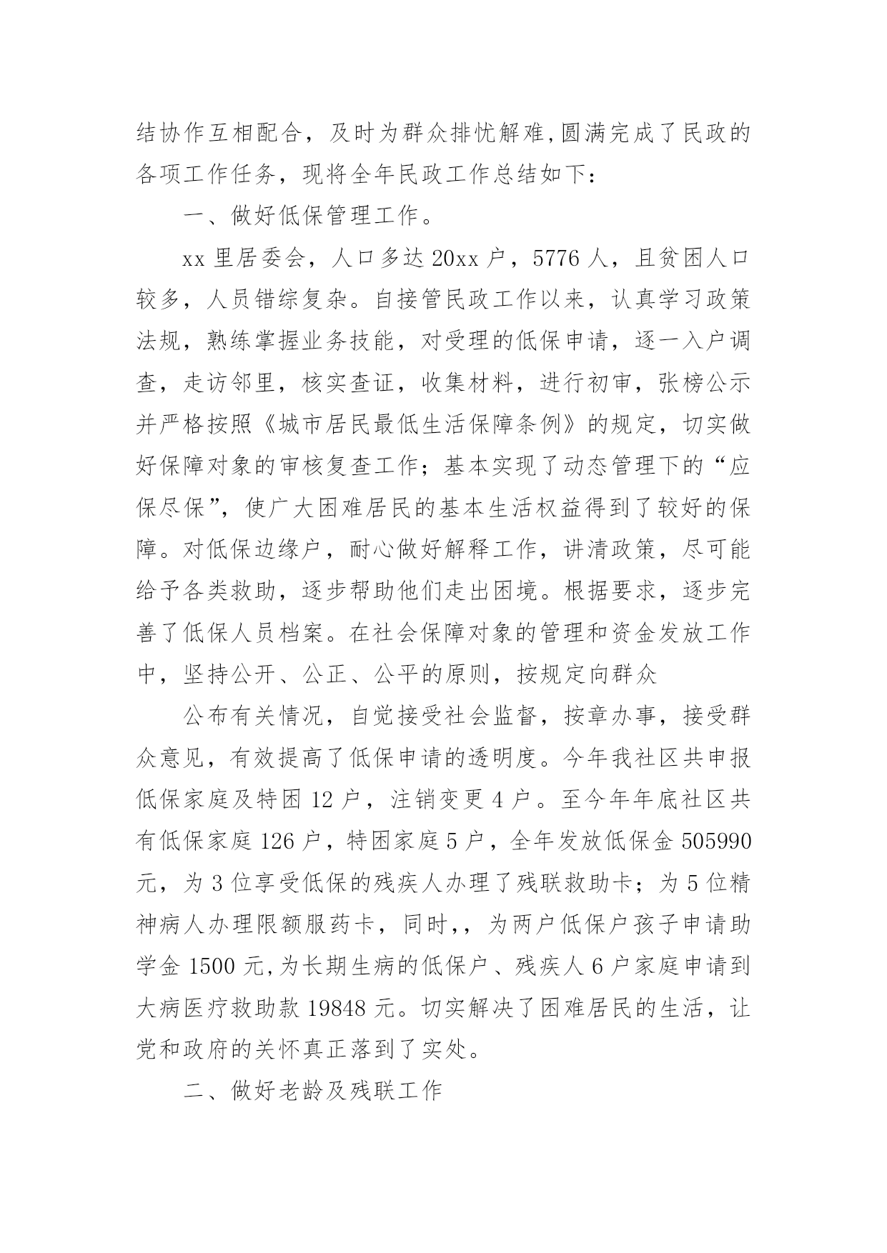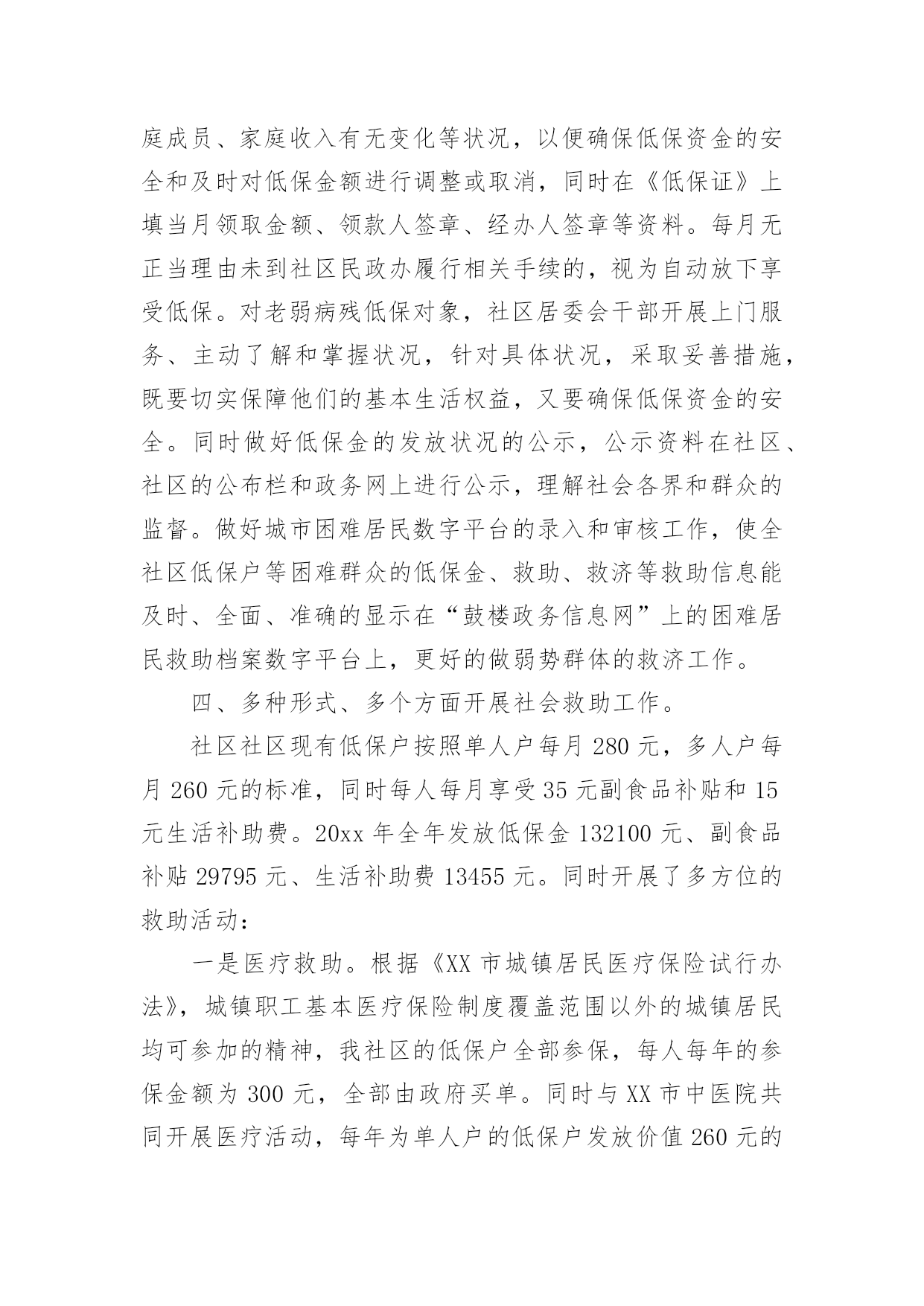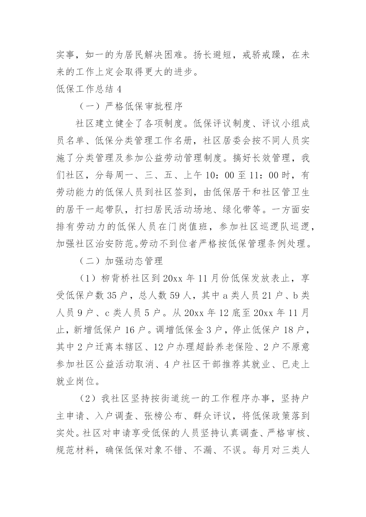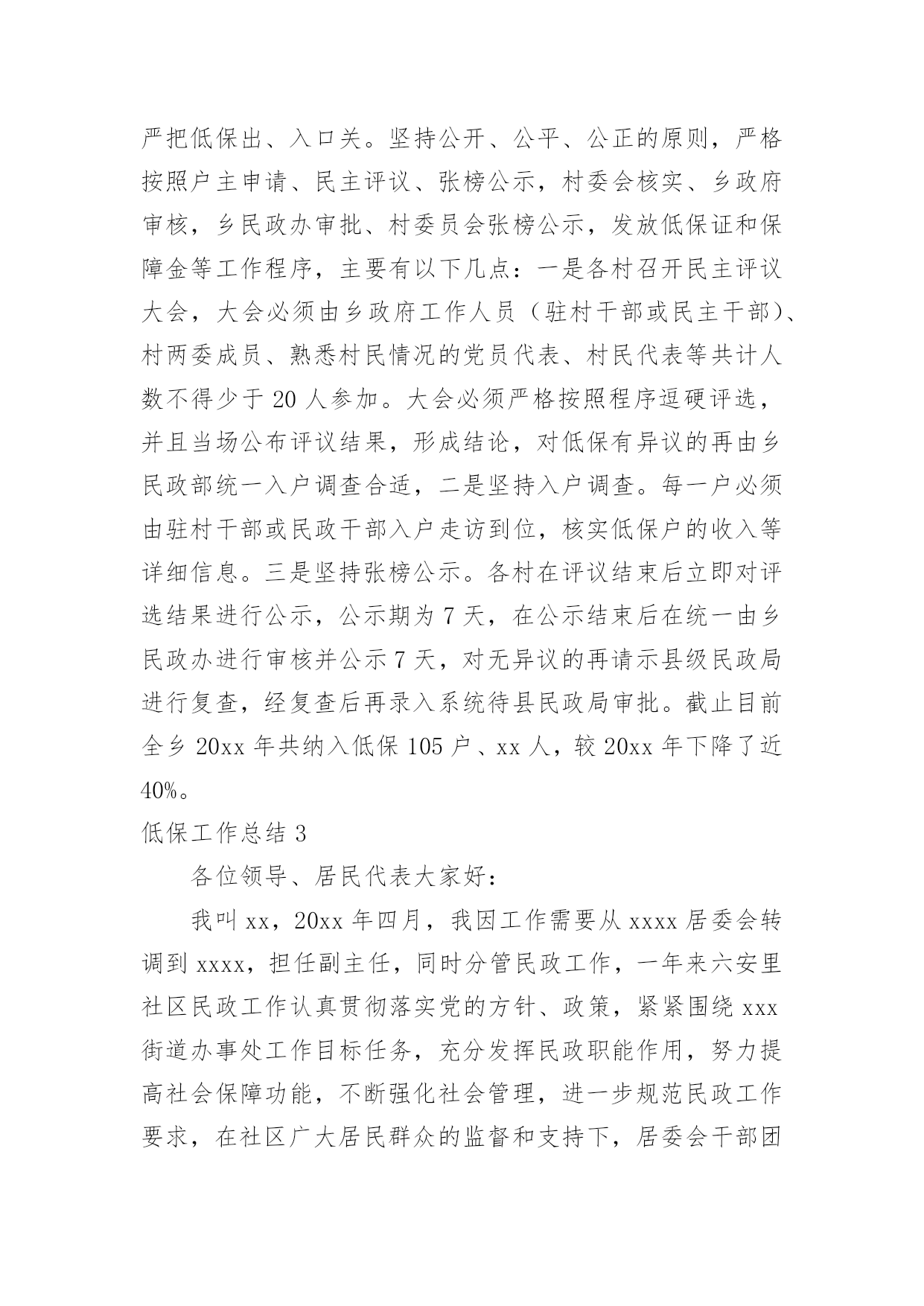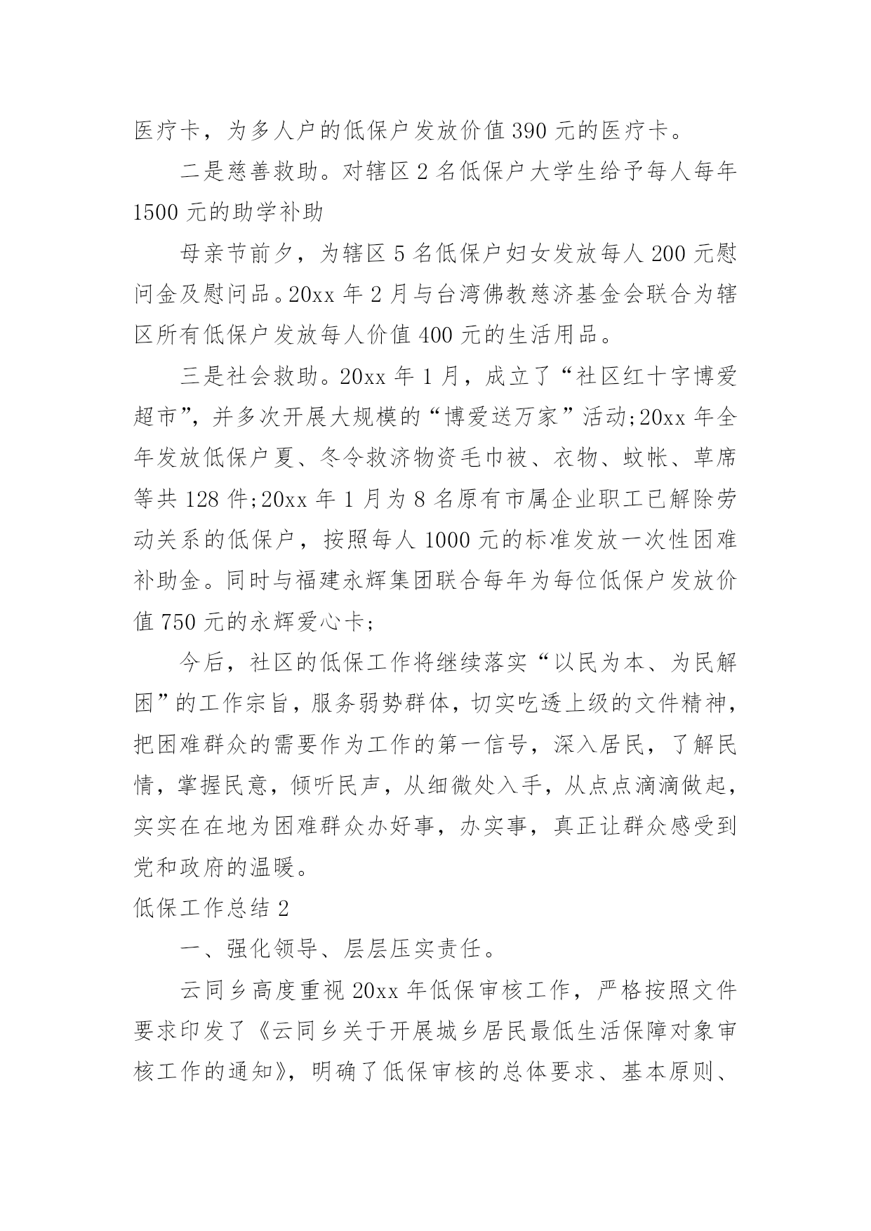 低保工作总结低保工作总结总结是对某一特定时间段内的学习和工作生活等表现情况加以回顾和分析的一种书面材料,它可以给我们下一阶段的学习和工作生活做指导,因此好好准备一份总结吧。那么总结有什么格式呢?下面是小编为大家收集的低保工作总结,希望对大家有所帮助。低保工作总结1近年来,社区的低保工作,在区民政局的业务指导下,认真贯彻有关低保工作的各项规定,严格政策,加强管理,规范操作,为维护辖区困难居民家庭基本生活权益,促进社会和谐稳定作出了用心贡献。同时社区党工委、办事处高度重视,社区领导经常过问、关心社区低保工作开展状况并经常深入基层,调查研究,帮忙分析和解决低保工作中的难点问题。现将我社区低保工作开展状况汇报如下:一、严格规范审批程序。申请人持书面报告到户口所在地的社区提出申请,由社区负责低保的工作人员(需二人)进行入户调查审查取证,贴合申请条件的由社区工作人员根据申请人带给的材料填写正式表格一式三份,并张榜公布一周由群众进行监督后报送社区审核复查,签注意见后,上报区民政局审核审批。区民政局审批后,根据审批金额由社区再张榜公布一周,群众无意见的才能发放。二、实行动态管理,做到应保尽保。社区目前共有低保户36户,61人。20xx年,本社区低保户脱贫3户,死亡1户,共减4户,新增2户。根据民政部城市最低保障制度基本原则:“保障生活、应保尽保、应退即退”,我们严格把关,对全社区贫困家庭实行动态管理,及时掌握保障对象的有关状况。凡是有群众举报和透过调查,生活比较富裕,超过最低生活保障线的,及时将其退出低保的行列。对新增低保对象,社区办事处、社区做到100%入户核查家庭状况和收入状况;对存在问题较多、群众意见大的社区组织人员进行专项检查,并对检查结果进行公开通报,确有问题的追究有关人员的职责。三、做好低保金社会化发放工作我社区于20xx年12月起低保金全部实现社会化发放。社区民政办在每月1日将本月低保社会化发放花名册(加盖社区公章、分管领导和民政干事签名)一式三份交区民政局财务科和救灾救济科,另将低保社会化发放花名册的电子文档发送到政务网区民政局单位用户邮箱。区民政局低保科和财务科在五个工作日内审核低保花名册人员和发放金额,并在低保花名册上加盖公章连同电子文档送交银行,各低保户凭农业银行的银行卡于每月10号后到银行领取低保金。低保对象每月25-28号务必带上《低保证》到户口所在地的社区民政办盖章,汇报是否及时足额领取到低保金,家庭成员、家庭收入有无变化等状况,以便确保低保资金的安全和及时对低保金额进行调整或取消,同时在《低保证》上填当月领取金额、领款人签章、经办人签章等资料。每月无正当理由未到社区民政办履行相关手续的,视为自动放下享受低保。对老弱病残低保对象,社区居委会干部开展上门服务、主动了解和掌握状况,针对具体状况,采取妥善措施,既要切实保障他们的基本生活权益,又要确保低保资金的安全。同时做好低保金的发放状况的公示,公示资料在社区、社区的公布栏和政务网上进行公示,理解社会各界和群众的监督。做好城市困难居民数字平台的录入和审核工作,使全社区低保户等困难群众的低保金、救助、救济等救助信息能及时、全面、准确的显示在“鼓楼政务信息网”上的困难居民救助档案数字平台上,更好的做弱势群体的救济工作。四、多种形式、多个方面开展社会救助工作。社区社区现有低保户按照单人户每月280元,多人户每月260元的标准,同时每人每月享受35元副食品补贴和15元生活补助费。20xx年全年发放低保金132100元、副食品补贴29795元、生活补助费13455元。同时开展了多方位的救助活动:一是医疗救助。根据《XX市城镇居民医疗保险试行办法》,城镇职工基本医疗保险制度覆盖范围以外的城镇居民均可参加的精神,我社区的低保户全部参保,每人每年的参保金额为300元,全部由政府买单。同时与XX市中医院共同开展医疗活动,每年为单人户的低保户发放价值260元的医疗卡,为多人户的低保户发放价值390元的医疗卡。二是慈善救助。对辖区2名低保户大学生给予每人每年1500元的助学补助母亲节前夕,为辖区5名低保户妇女发放每人200元慰问金及慰问品。20xx年2月与台湾佛教慈济基金会联合为辖区所有低保户发放每人价值400元的生活用品。三是社会救助。20xx年1月,成立了“社区红十字博爱超市”,并多次开展大规模的“博爱送万家”活动;20xx年全年发放低保户夏、冬令救济物资毛巾被、衣物、蚊帐、草席等共128件;20xx年1月为8名原有市属企业职工已解除劳动关系的低保户,按照每人1000元的标准发放一次性困难补助金。同时与福建永辉集团联合每年为每位低保户发放价值750元的永辉爱心卡;今后,社区的低保工作将继续落实“以民为本、为民解困”的工作宗旨,服务弱势群体,切实吃透上级的文件精神,把困难群众的需要作为