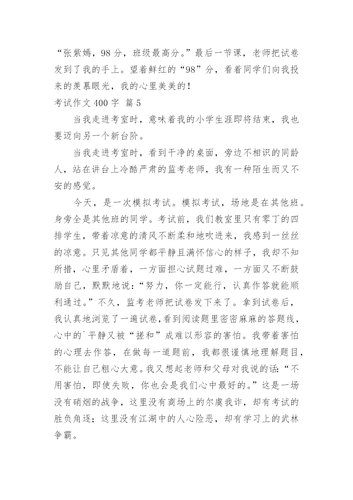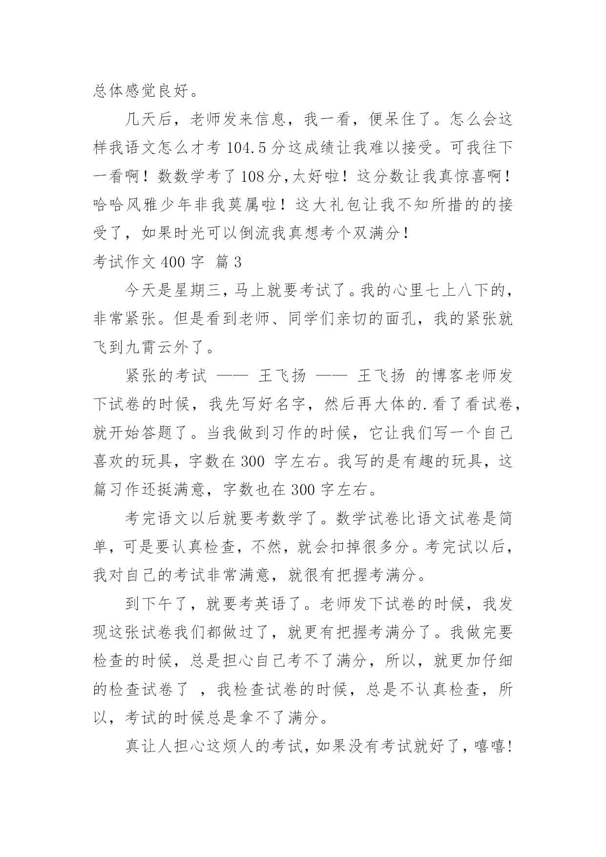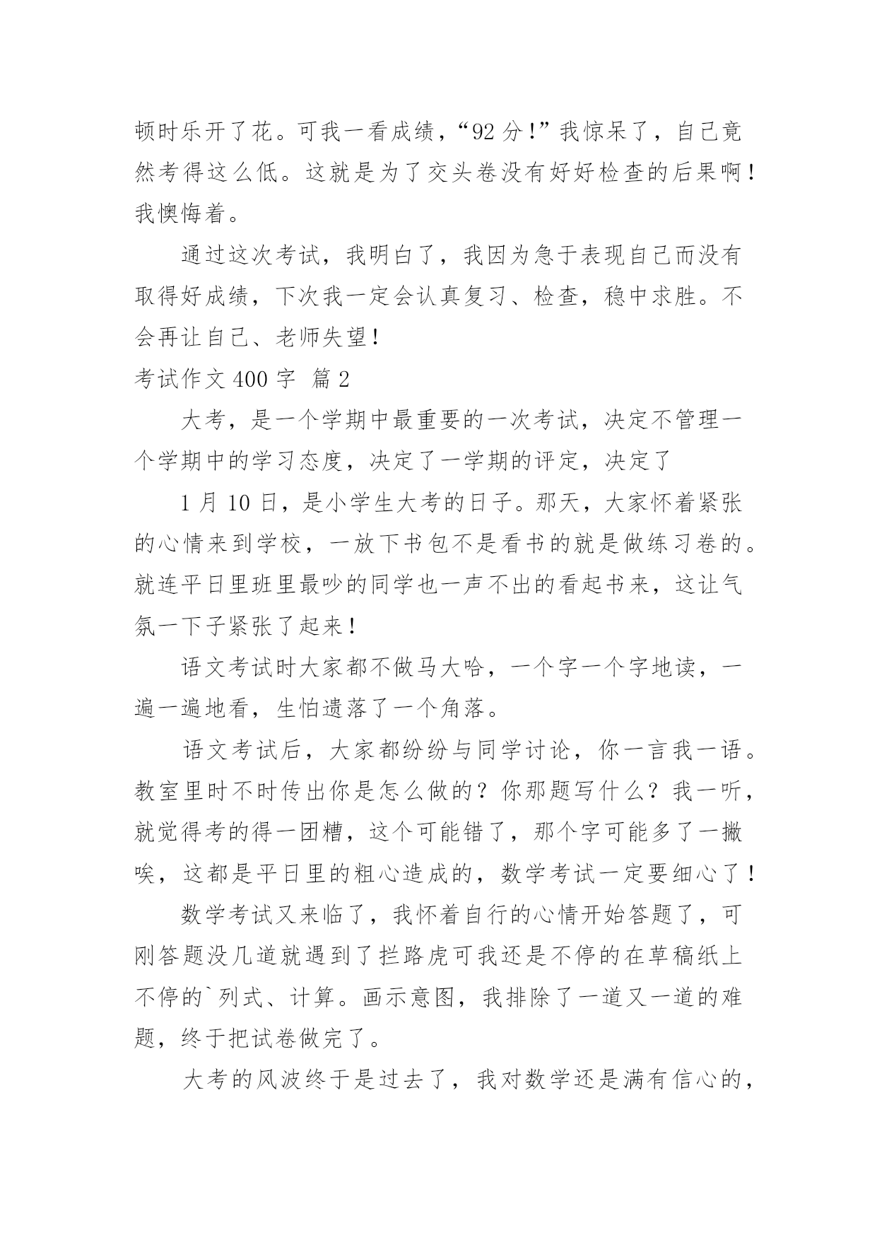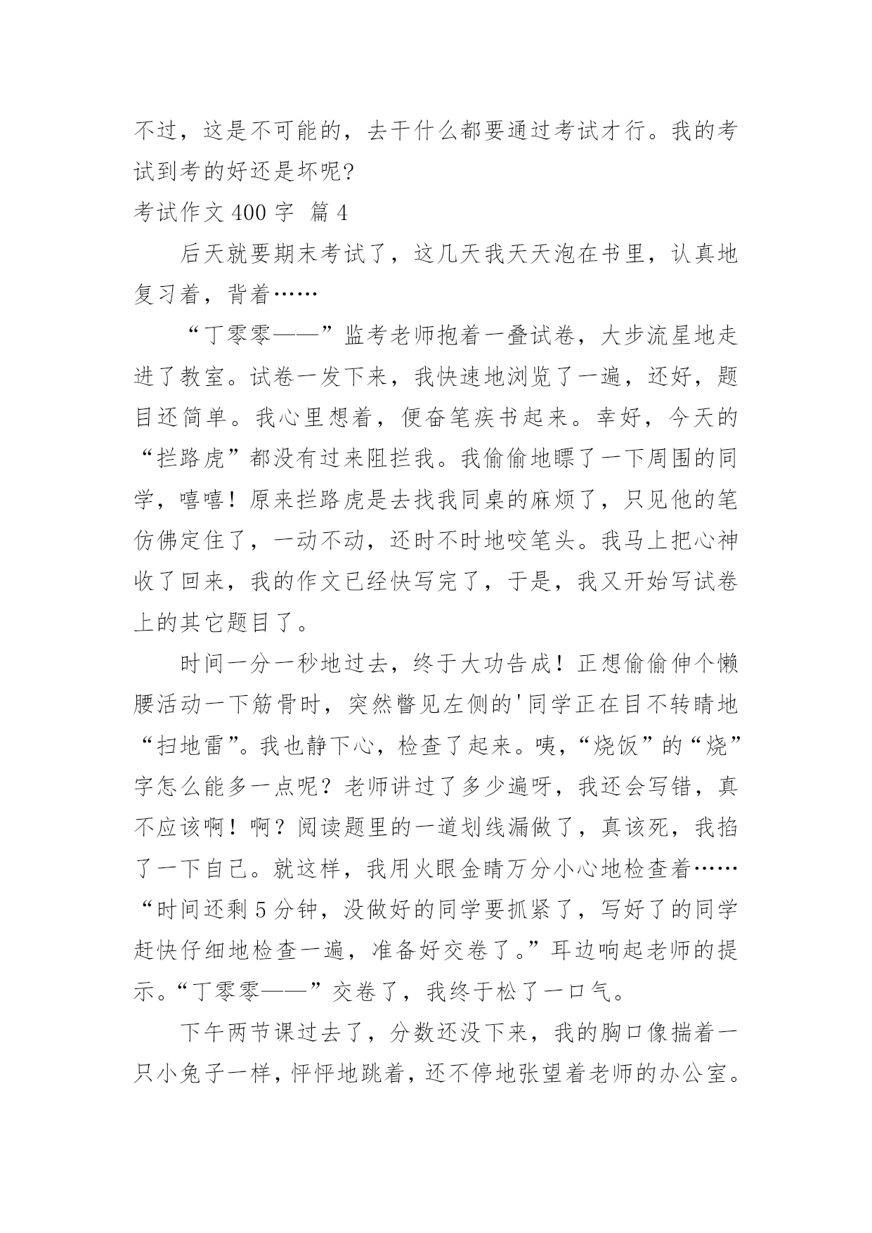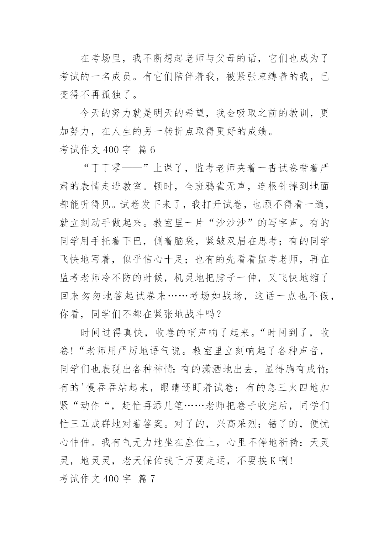 考试作文400字考试作文400字精选(7篇)在平凡的学习、工作、生活中,大家都写过作文,肯定对各类作文都很熟悉吧,作文一定要做到主题集中,围绕同一主题作深入阐述,切忌东拉西扯,主题涣散甚至无主题。那么问题来了,到底应如何写一篇优秀的作文呢?下面是小编收集整理的考试作文400字7篇,供大家参考借鉴,希望可以帮助到有需要的朋友。考试作文400字篇1记忆中,有许多令我难忘的事,它们就像一颗颗明珠,在我的心中闪烁着耀眼的光芒。但那一次考试让我记忆犹新。在考试的前一个星期,我每天都会认真地复习,为了保证自己不会考砸。考试前两个小时,我心不在焉地翻着书,心想,就算我不看书也会考个好成绩,这次我一定要交头卷!考卷发下来了,我走马观花地看了一下卷子,便埋头答卷。答到一半时,环顾四周,看见好多同学已经答完整张试卷了,我急忙加快答题的速度。眼看着我最后一题写完了,还没有人交卷。我欣喜万分,潦草地看了一次卷子,便急匆匆地交了试卷。考试成绩出来前,我的脑海里浮想联翩,想象着自己交头卷,还可以考满分,大家都对我投来羡慕的`目光,心里顿时乐开了花。可我一看成绩,“92分!”我惊呆了,自己竟然考得这么低。这就是为了交头卷没有好好检查的后果啊!我懊悔着。通过这次考试,我明白了,我因为急于表现自己而没有取得好成绩,下次我一定会认真复习、检查,稳中求胜。不会再让自己、老师失望!考试作文400字篇2大考,是一个学期中最重要的一次考试,决定不管理一个学期中的学习态度,决定了一学期的评定,决定了1月10日,是小学生大考的日子。那天,大家怀着紧张的心情来到学校,一放下书包不是看书的就是做练习卷的。就连平日里班里最吵的同学也一声不出的看起书来,这让气氛一下子紧张了起来!语文考试时大家都不做马大哈,一个字一个字地读,一遍一遍地看,生怕遗落了一个角落。语文考试后,大家都纷纷与同学讨论,你一言我一语。教室里时不时传出你是怎么做的?你那题写什么?我一听,就觉得考的得一团糟,这个可能错了,那个字可能多了一撇唉,这都是平日里的粗心造成的,数学考试一定要细心了!数学考试又来临了,我怀着自行的心情开始答题了,可刚答题没几道就遇到了拦路虎可我还是不停的在草稿纸上不停的`列式、计算。画示意图,我排除了一道又一道的难题,终于把试卷做完了。大考的风波终于是过去了,我对数学还是满有信心的,总体感觉良好。几天后,老师发来信息,我一看,便呆住了。怎么会这样我语文怎么才考104.5分这成绩让我难以接受。可我往下一看啊!数数学考了108分,太好啦!这分数让我真惊喜啊!哈哈风雅少年非我莫属啦!这大礼包让我不知所措的的接受了,如果时光可以倒流我真想考个双满分!考试作文400字篇3今天是星期三,马上就要考试了。我的心里七上八下的,非常紧张。但是看到老师、同学们亲切的面孔,我的紧张就飞到九霄云外了。紧张的考试——王飞扬——王飞扬的博客老师发下试卷的时候,我先写好名字,然后再大体的.看了看试卷,就开始答题了。当我做到习作的时候,它让我们写一个自己喜欢的玩具,字数在300字左右。我写的是有趣的玩具,这篇习作还挺满意,字数也在300字左右。考完语文以后就要考数学了。数学试卷比语文试卷是简单,可是要认真检查,不然,就会扣掉很多分。考完试以后,我对自己的考试非常满意,就很有把握考满分。到下午了,就要考英语了。老师发下试卷的时候,我发现这张试卷我们都做过了,就更有把握考满分了。我做完要检查的时候,总是担心自己考不了满分,所以,就更加仔细的检查试卷了,我检查试卷的时候,总是不认真检查,所以,考试的时候总是拿不了满分。真让人担心这烦人的考试,如果没有考试就好了,嘻嘻!不过,这是不可能的,去干什么都要通过考试才行。我的考试到考的好还是坏呢?考试作文400字篇4后天就要期末考试了,这几天我天天泡在书里,认真地复习着,背着……“丁零零——”监考老师抱着一叠试卷,大步流星地走进了教室。试卷一发下来,我快速地浏览了一遍,还好,题目还简单。我心里想着,便奋笔疾书起来。幸好,今天的“拦路虎”都没有过来阻拦我。我偷偷地瞟了一下周围的同学,嘻嘻!原来拦路虎是去找我同桌的麻烦了,只见他的笔仿佛定住了,一动不动,还时不时地咬笔头。我马上把心神收了回来,我的作文已经快写完了,于是,我又开始写试卷上的其它题目了。时间一分一秒地过去,终于大功告成!正想偷偷伸个懒腰活动一下筋骨时,突然瞥见左侧的'同学正在目不转睛地“扫地雷”。我也静下心,检查了起来。咦,“烧饭”的“烧”字怎么能多一点呢?老师讲过了多少遍呀,我还会写错,真不应该啊!啊?阅读题里的一道划线漏做了,真该死,我掐了一下自己。就这样,我用火眼金睛万分小心地检查着……“时间还剩5分钟,没做好的同学要抓紧了,写好了的同学赶快仔细地检查一遍,准备好交卷了。”耳边响起老师的提示。“丁零零——”交卷了,我终